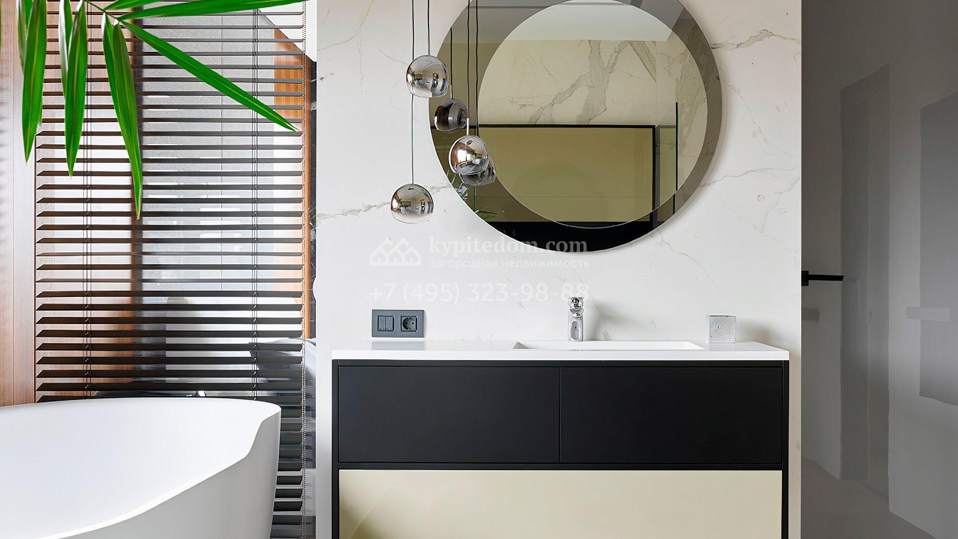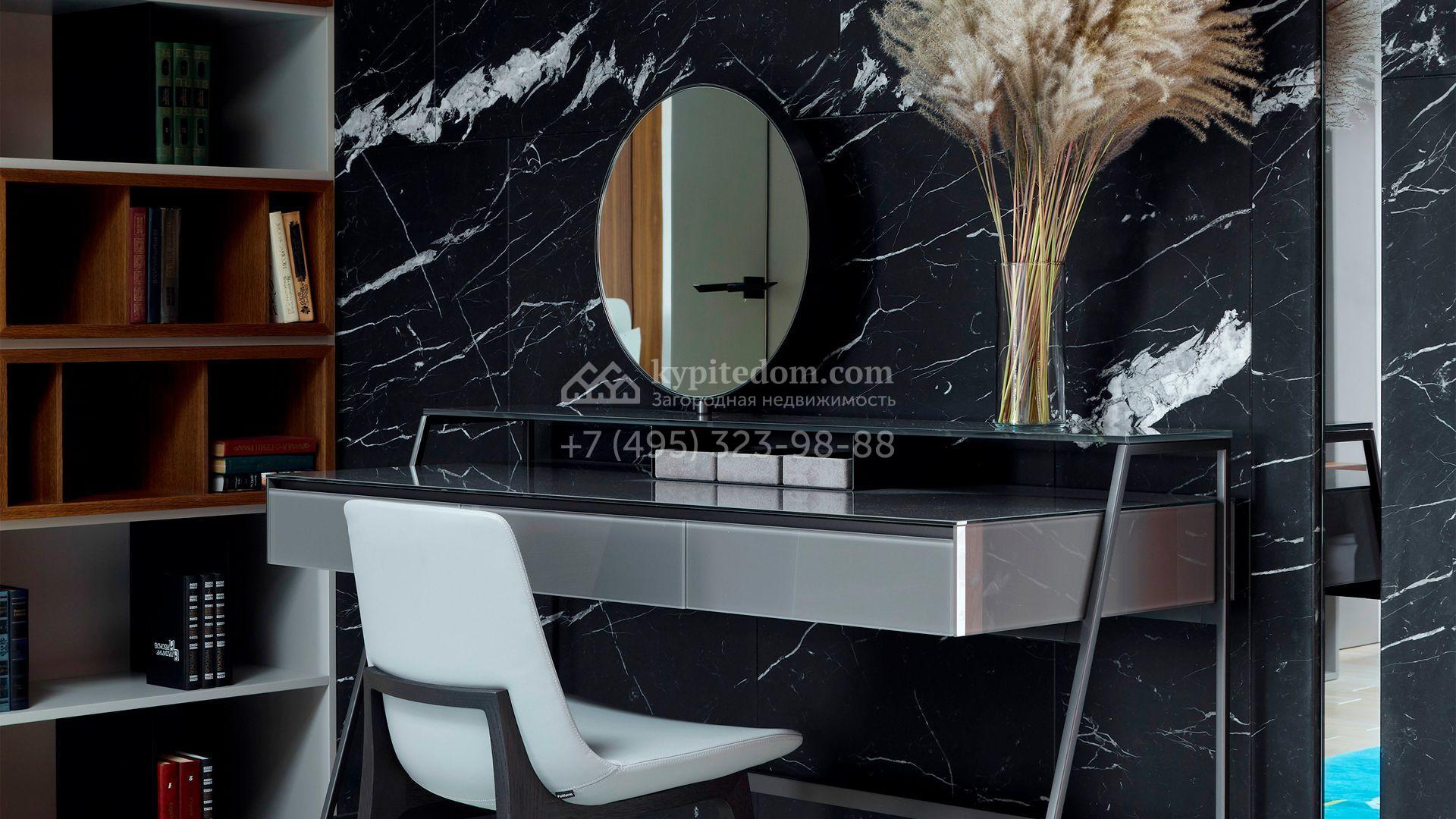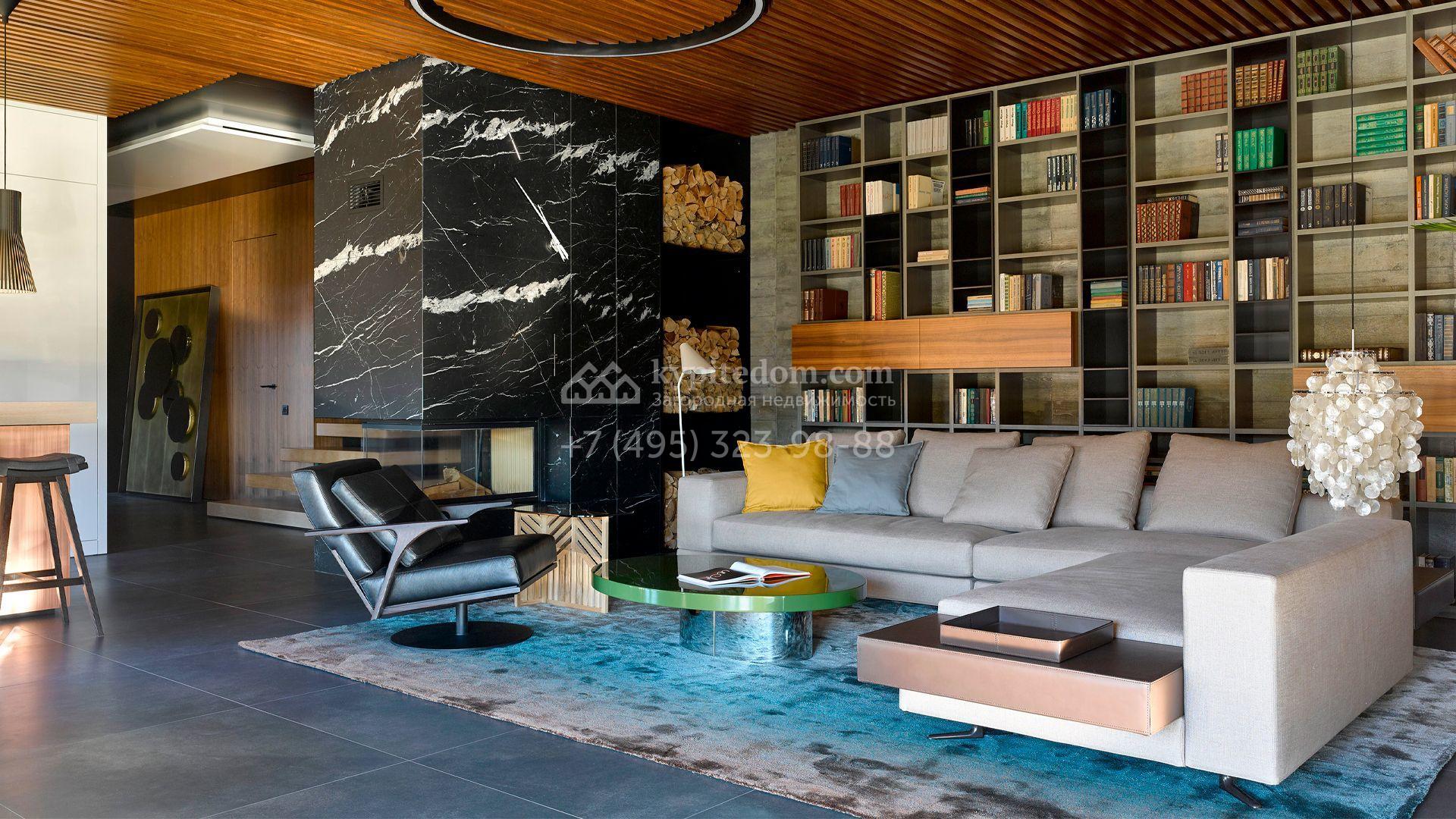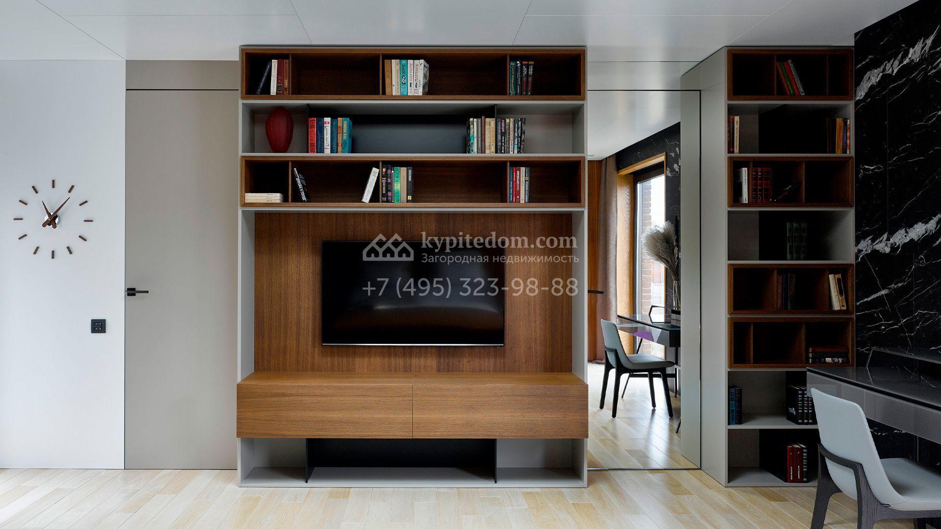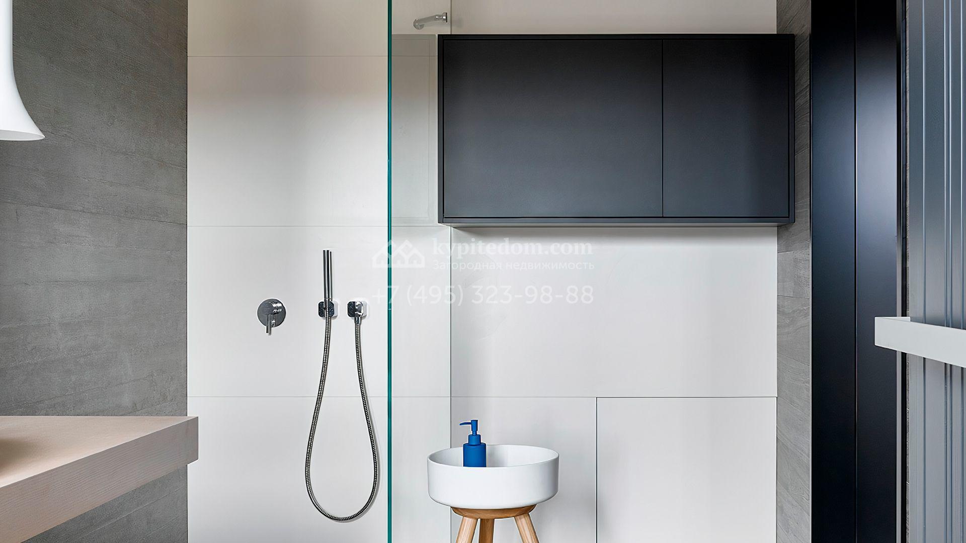 Загородная резиденция с системой «умный дом» площадью 300 м² расположена на участке 16 соток с выходом в лес и к Истринскому водохранилищу. Дом построен по датской технологии Danhaus. На панорамных окнах установлены рольставни. Интерьер выполнен по проекту дизайнера Макса Касимова в приглушенных оттенках в современном стиле. Коттедж полностью меблирован, декорирован коврами и аксессуарами Minotti, Okha, установлена итальянская сантехника. Внутри спланировали 4 спальни, кухню-гостиную с камином и террасу. На территории предусмотрены хозяйственный блок с гаражом, сауна с летней кухней и бассейн с подогревом. На участке вымощены дорожки из гранита, оборудована система полива.