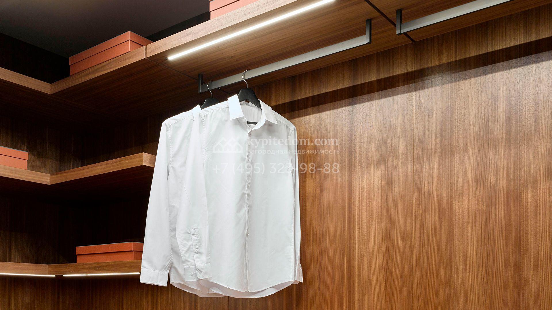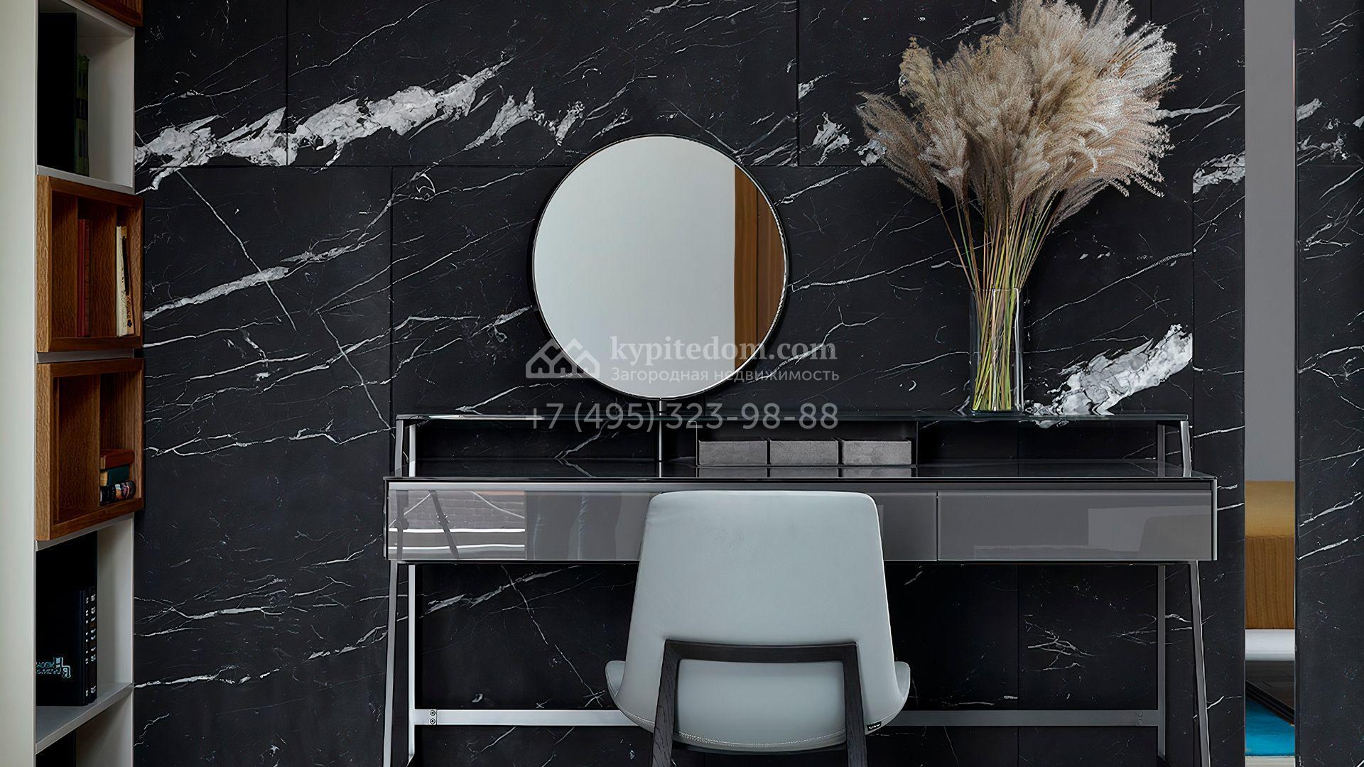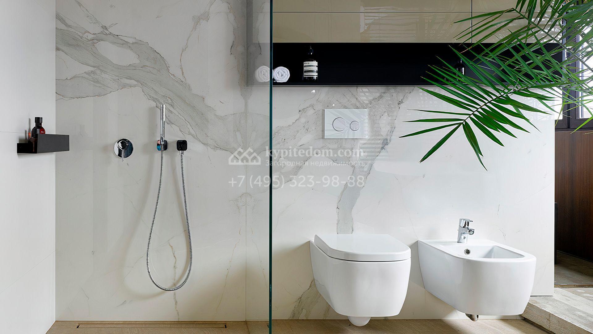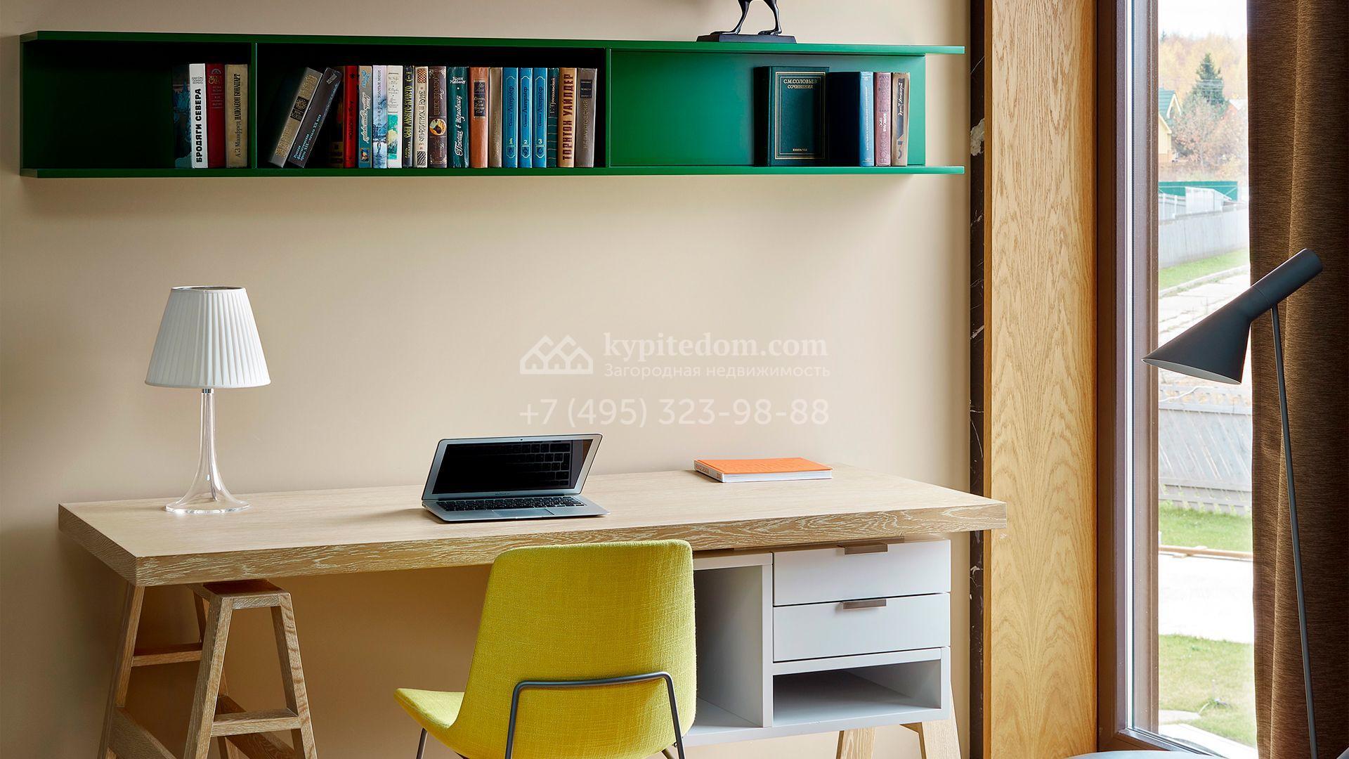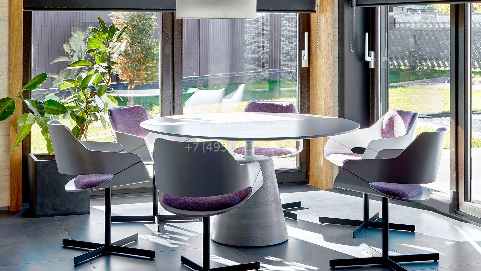 Загородная резиденция с системой «умный дом» площадью 300 м² расположена на участке 16 соток с выходом в лес и к Истринскому водохранилищу. Дом построен по датской технологии Danhaus. На панорамных окнах установлены рольставни. Интерьер выполнен по проекту дизайнера Макса Касимова в приглушенных оттенках в современном стиле. Коттедж полностью меблирован, декорирован коврами и аксессуарами Minotti, Okha, установлена итальянская сантехника. Внутри спланировали 4 спальни, кухню-гостиную с камином и террасу. На территории предусмотрены хозяйственный блок с гаражом, сауна с летней кухней и бассейн с подогревом. На участке вымощены дорожки из гранита, оборудована система полива.