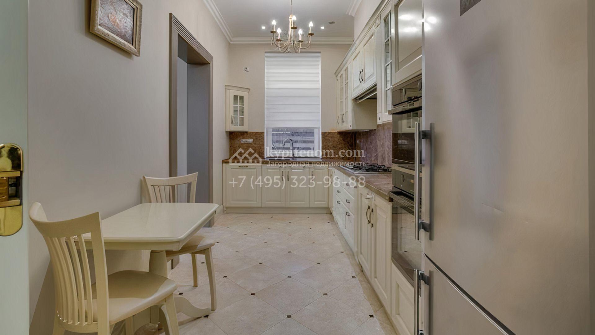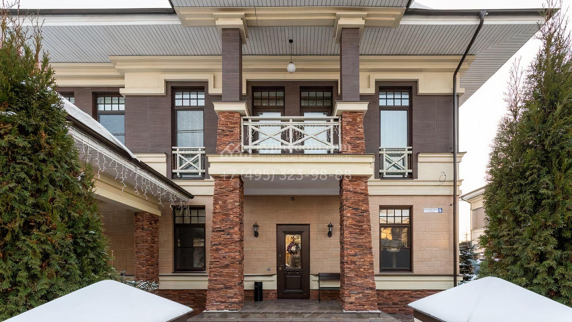 Уютная резиденция площадью 430 м² расположена на полевом участке 12 соток. Фасад в райтовском стиле облицован бежевым и коричневым камнем. Светлый интерьер с элементами классики оформлен в пастельных тонах. В доме разместили 4 спальни, просторную гостиную с панорамными окнами, камином и выходом на террасу, кухню, кабинет и тренажерный зал. Предусмотрен блок для персонала с кухней, санузлом и отдельным входом, к дому пристроен навес на 2 машины. На участке выполнен ландшафтный дизайн, вымощены дорожки и высажены туи.