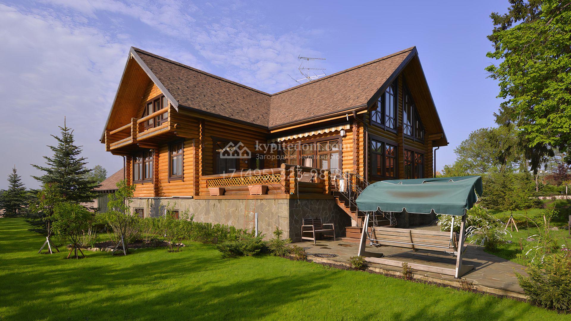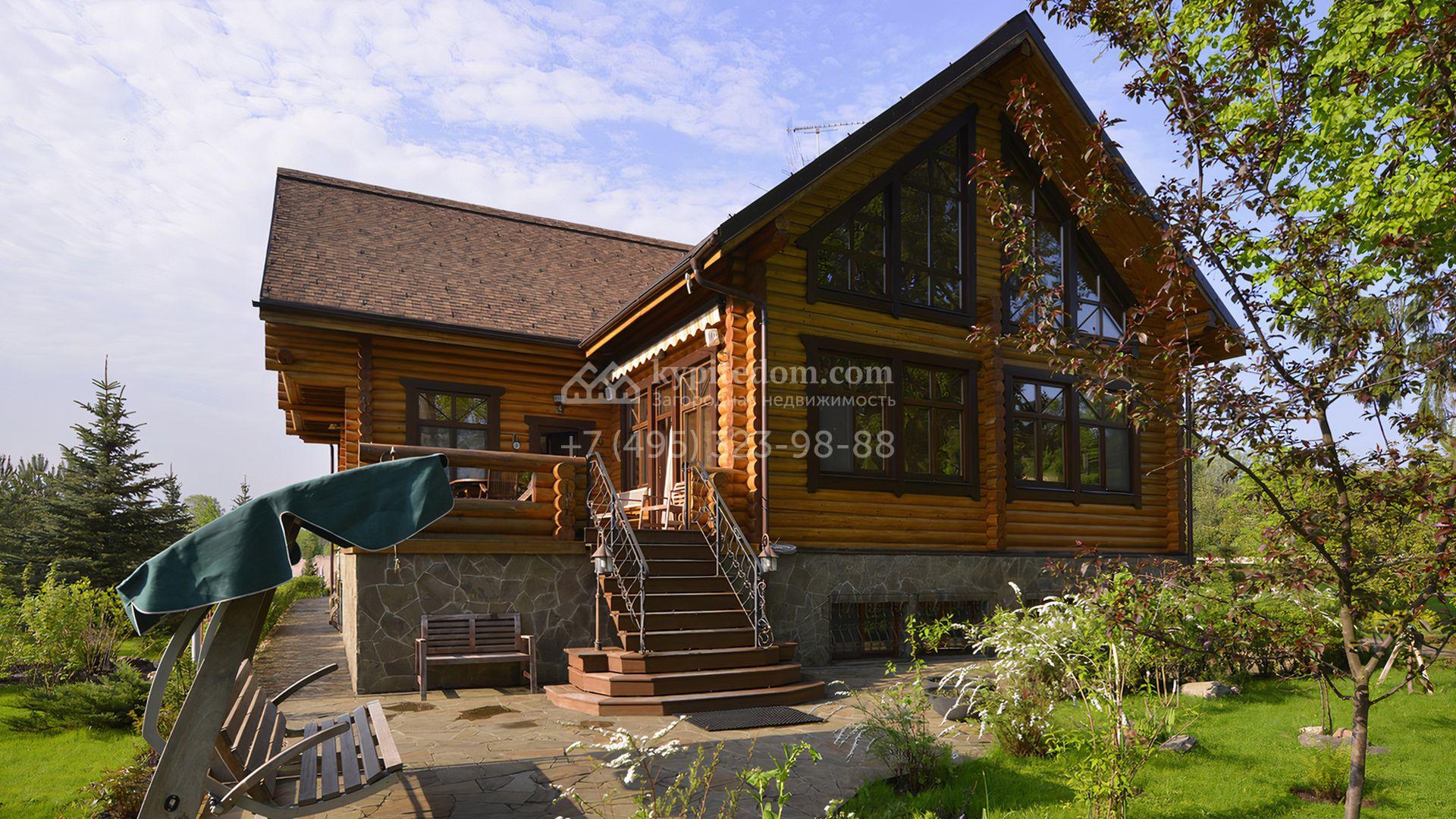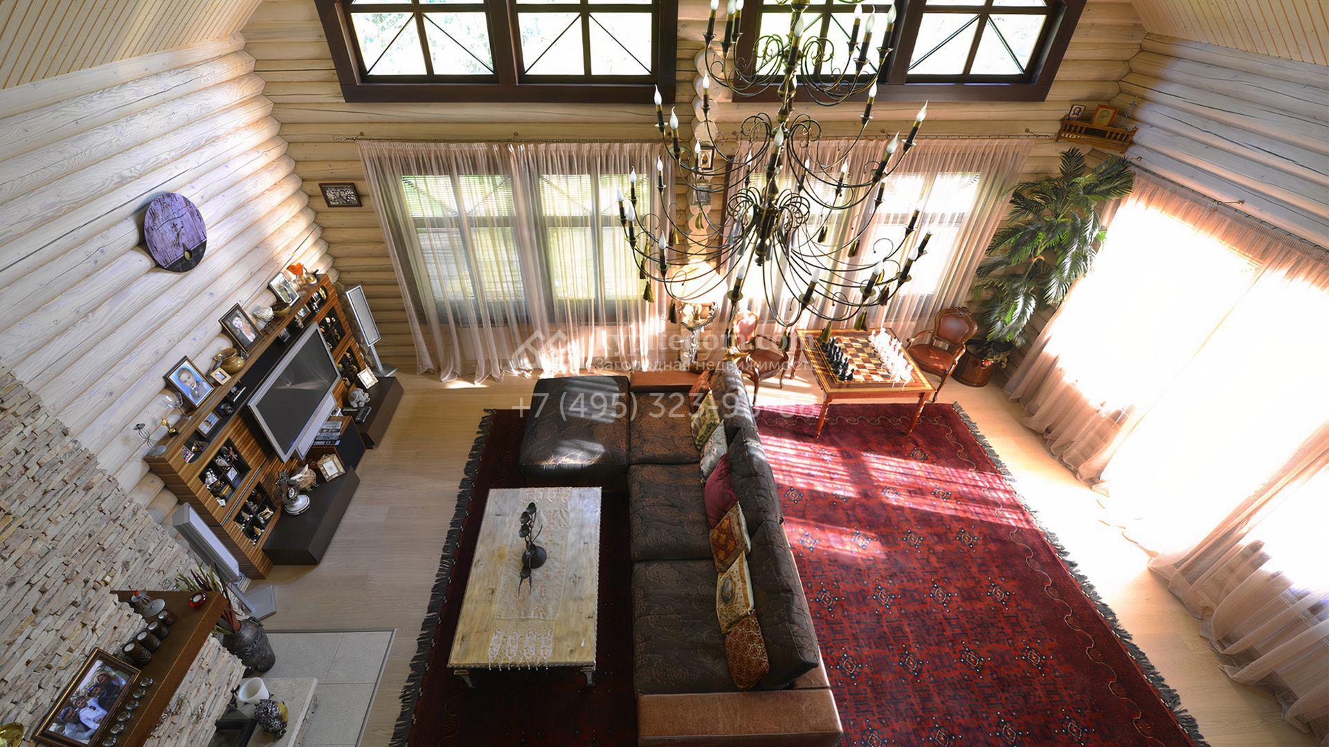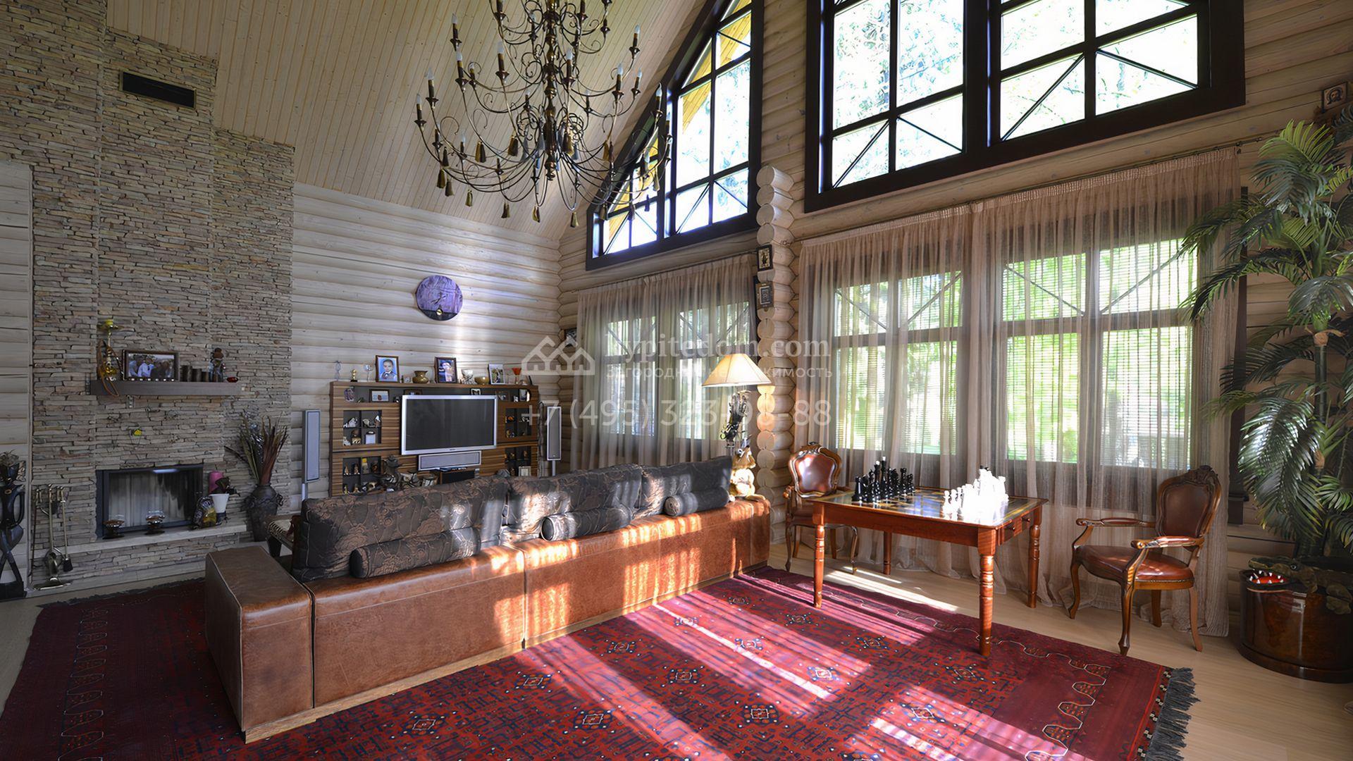 Загородный дом площадью 426 м² расположен на полевом участке 26 соток с лесными деревьями. Коттедж с большими окнами в стиле «шале» построен из оцилиндрованного бревна. В светлом интерьере сохранена фактура дерева, создающая атмосферу уюта и тепла. В резиденции разместили просторную каминную со вторым светом, 4 спальни, кухню-столовую, кабинет, бильярдную, домашний кинотеатр и SPA-зону с бассейном и сауной. На участке выполнены ландшафтный дизайн и дренажные работы, высажены плодовые деревья, кустарники и цветы, обустроены гостевой дом и беседка с зоной барбекю. В центре пруда поселка предусмотрен банный комплекс.