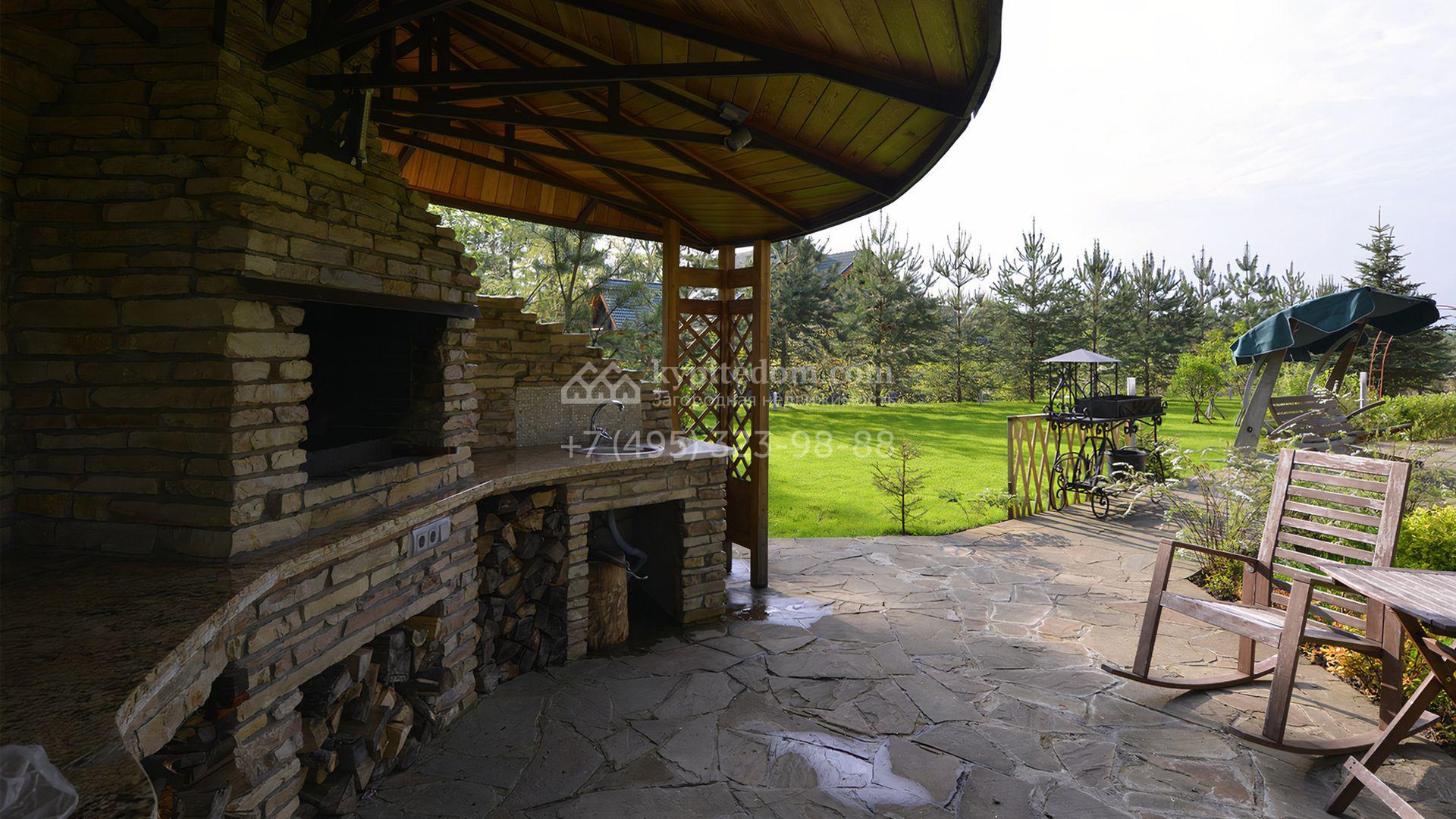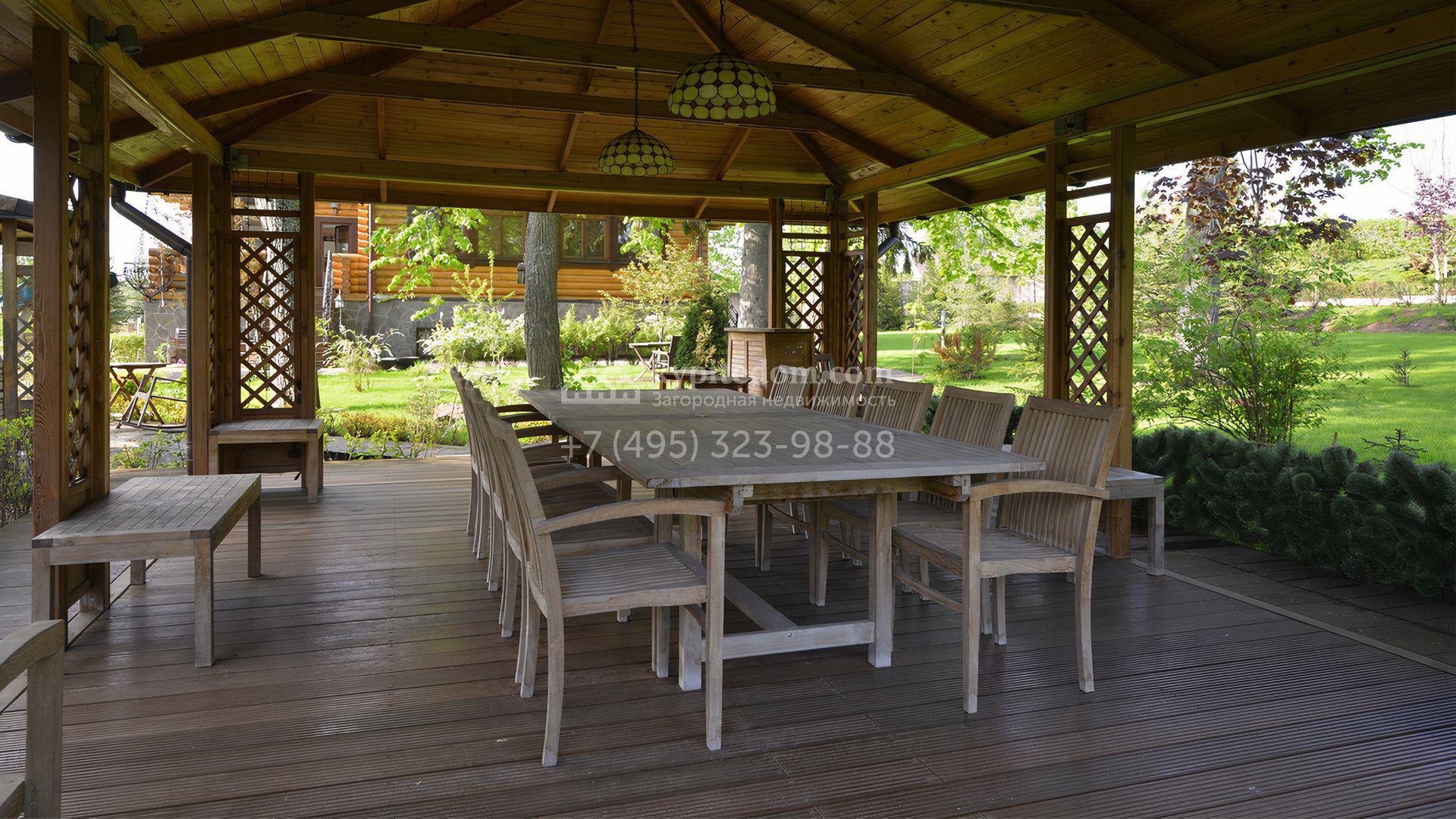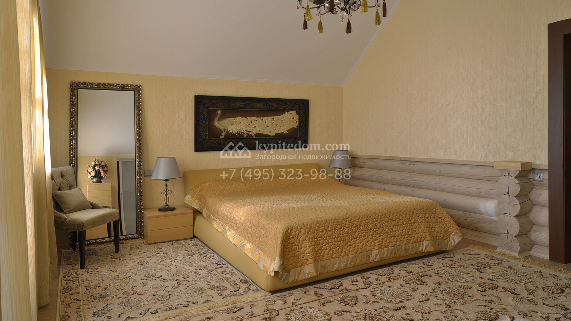 Загородный дом площадью 426 м² расположен на полевом участке 26 соток с лесными деревьями. Коттедж с большими окнами в стиле «шале» построен из оцилиндрованного бревна. В светлом интерьере сохранена фактура дерева, создающая атмосферу уюта и тепла. В резиденции разместили просторную каминную со вторым светом, 4 спальни, кухню-столовую, кабинет, бильярдную, домашний кинотеатр и SPA-зону с бассейном и сауной. На участке выполнены ландшафтный дизайн и дренажные работы, высажены плодовые деревья, кустарники и цветы, обустроены гостевой дом и беседка с зоной барбекю. В центре пруда поселка предусмотрен банный комплекс.