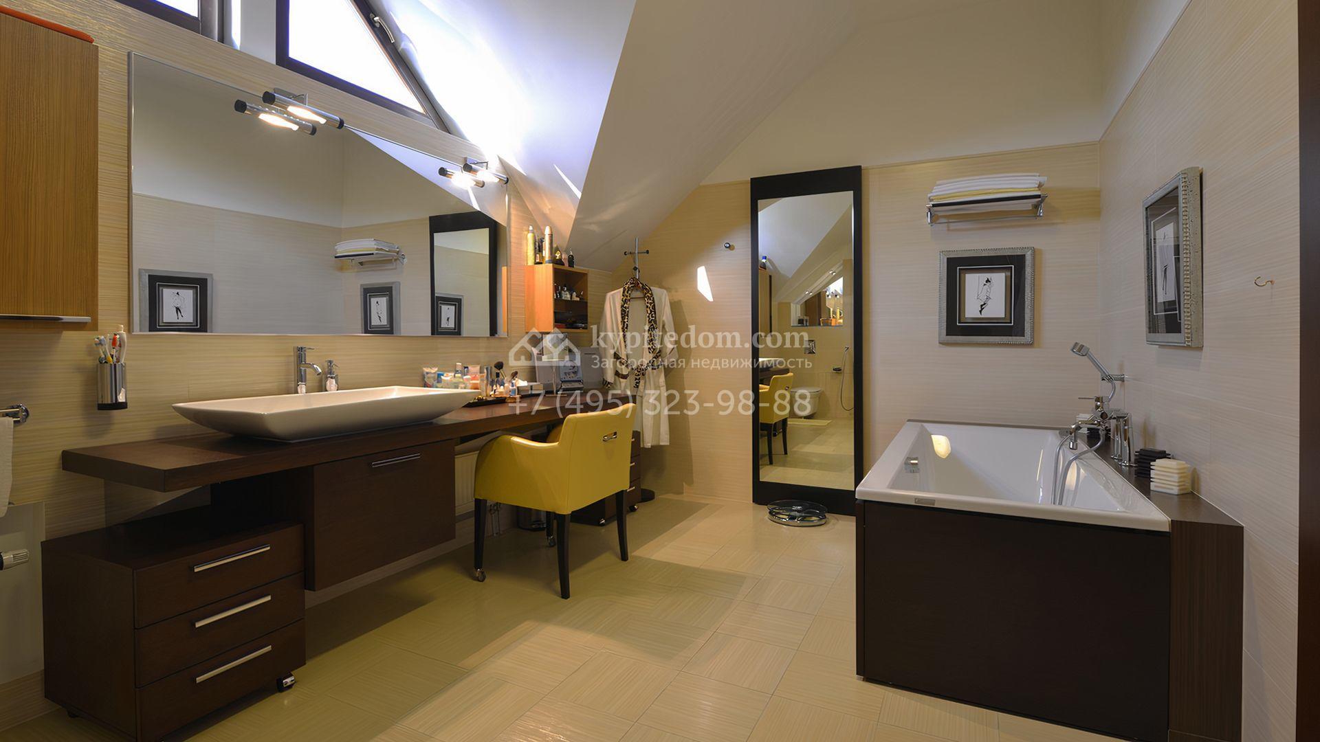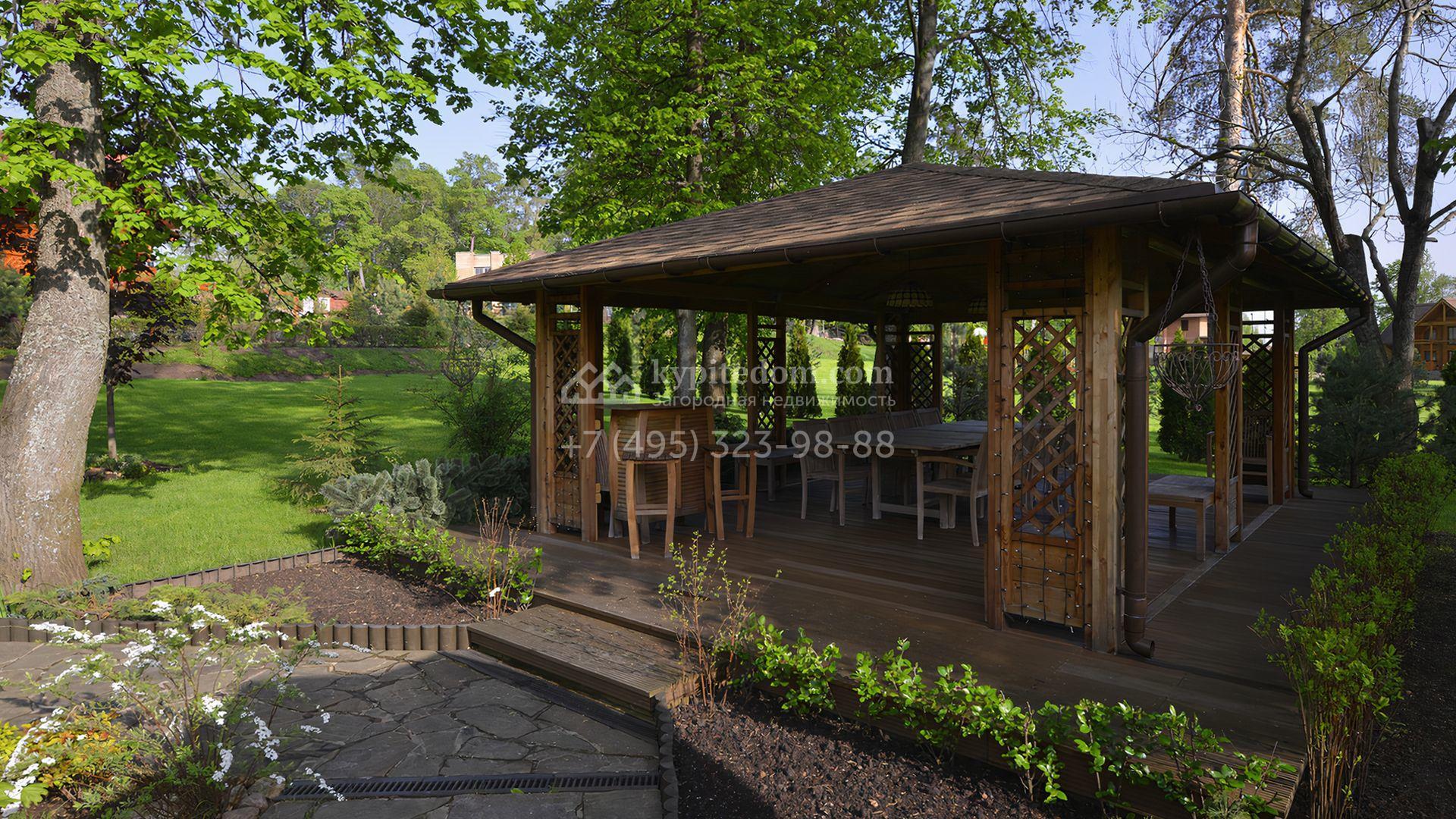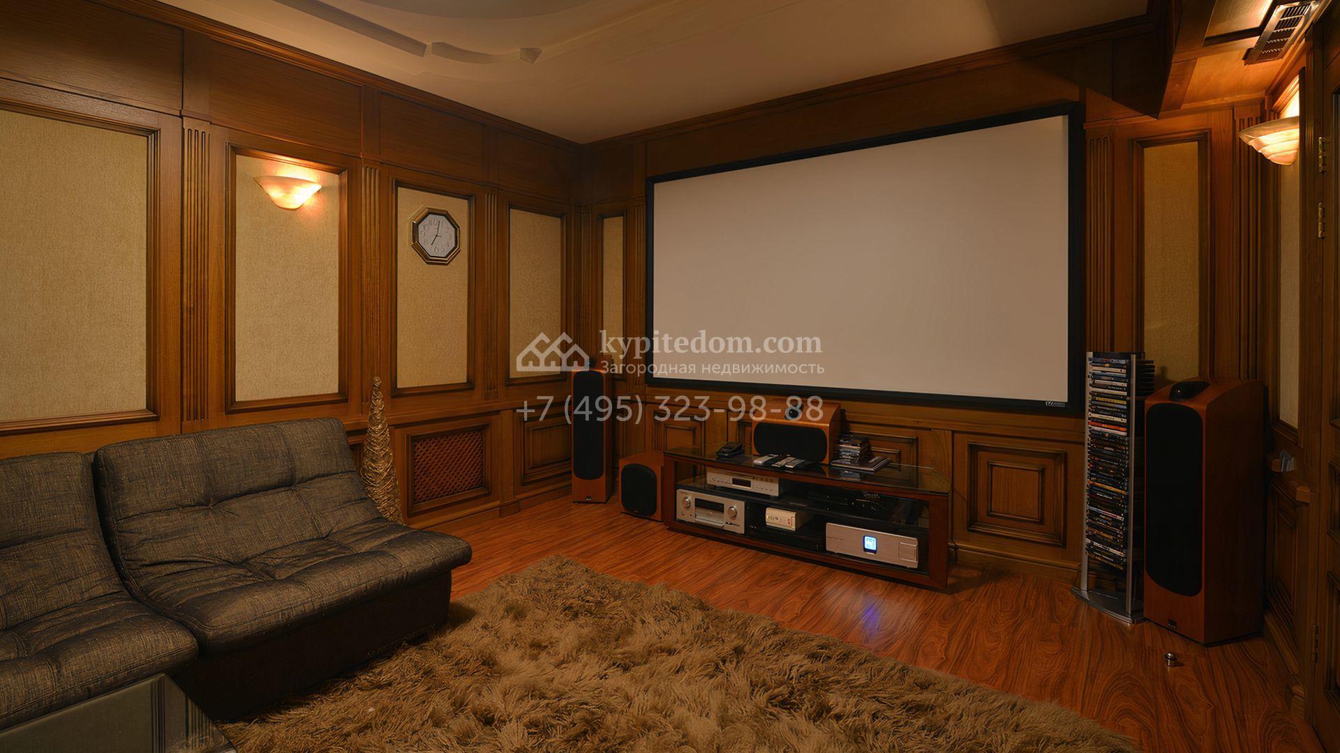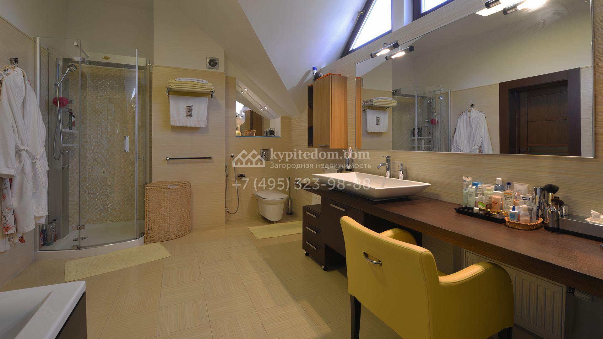 Загородный дом площадью 426 м² расположен на полевом участке 26 соток с лесными деревьями. Коттедж с большими окнами в стиле «шале» построен из оцилиндрованного бревна. В светлом интерьере сохранена фактура дерева, создающая атмосферу уюта и тепла. В резиденции разместили просторную каминную со вторым светом, 4 спальни, кухню-столовую, кабинет, бильярдную, домашний кинотеатр и SPA-зону с бассейном и сауной. На участке выполнены ландшафтный дизайн и дренажные работы, высажены плодовые деревья, кустарники и цветы, обустроены гостевой дом и беседка с зоной барбекю. В центре пруда поселка предусмотрен банный комплекс.