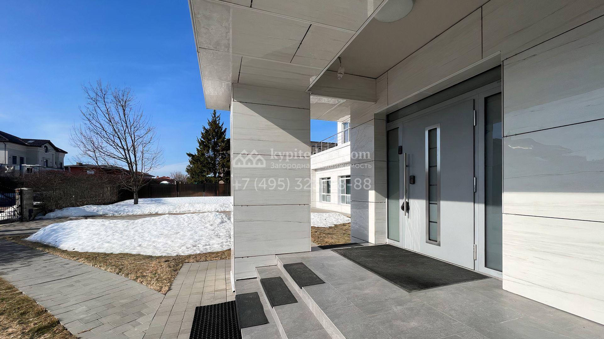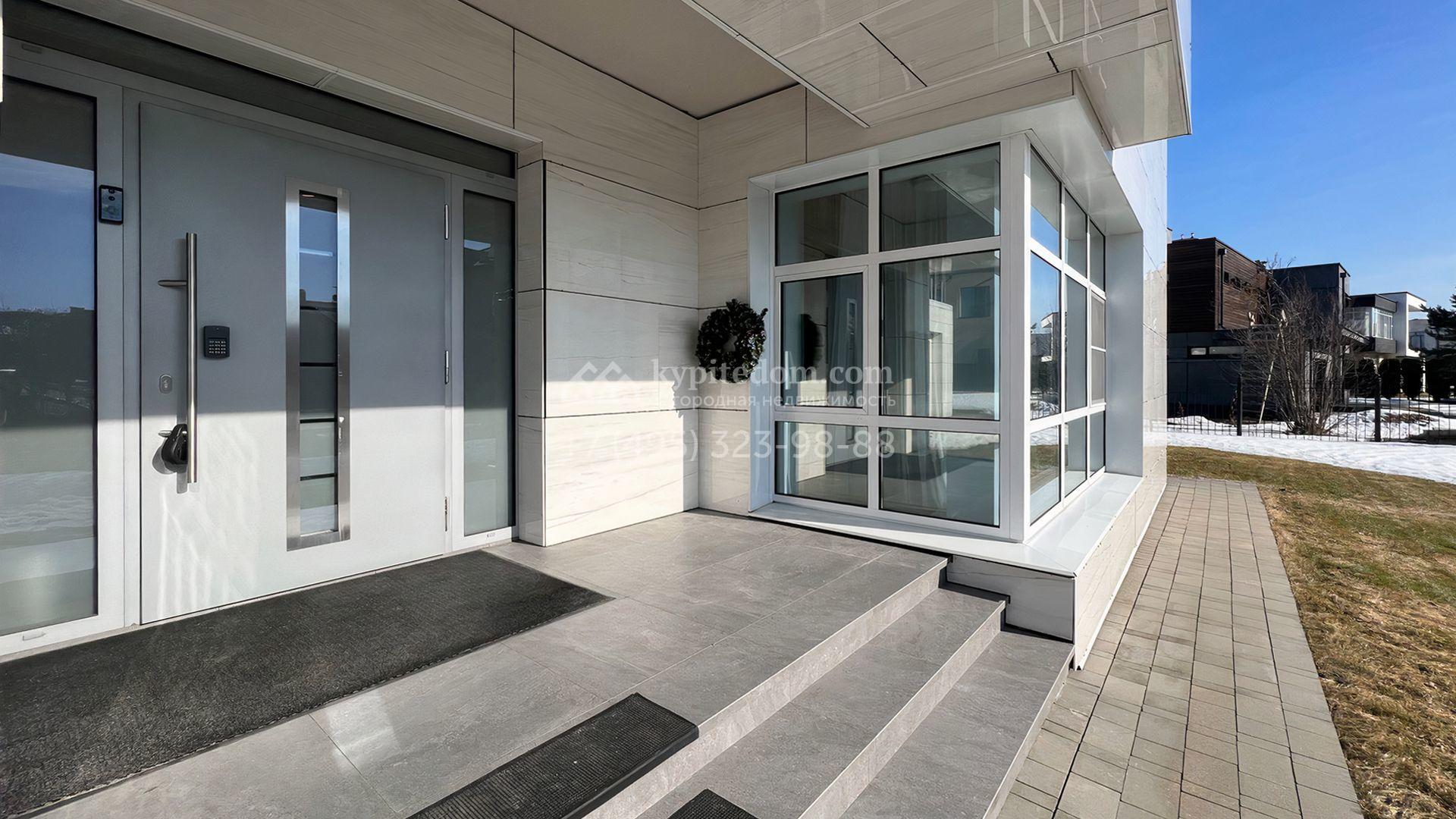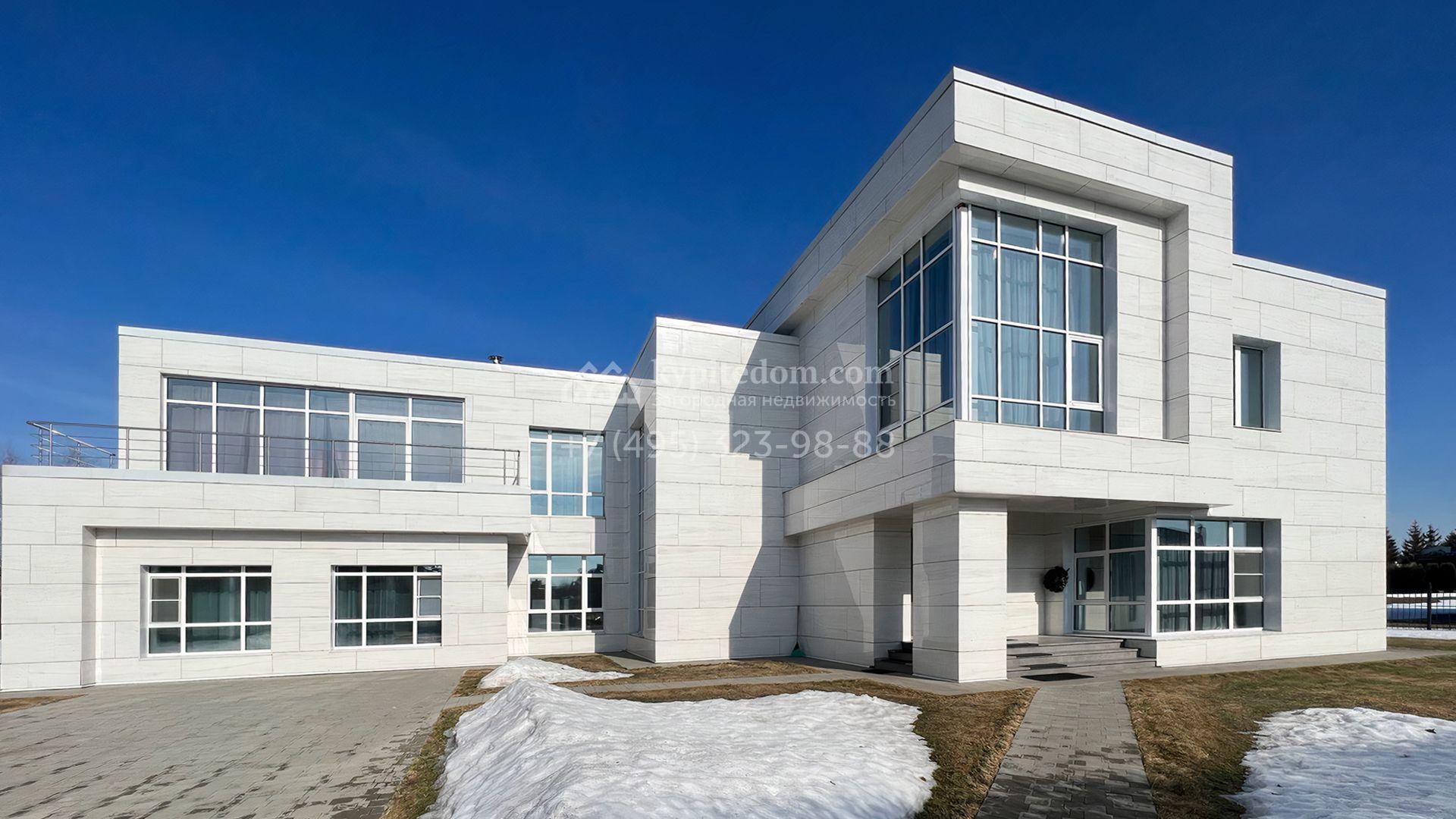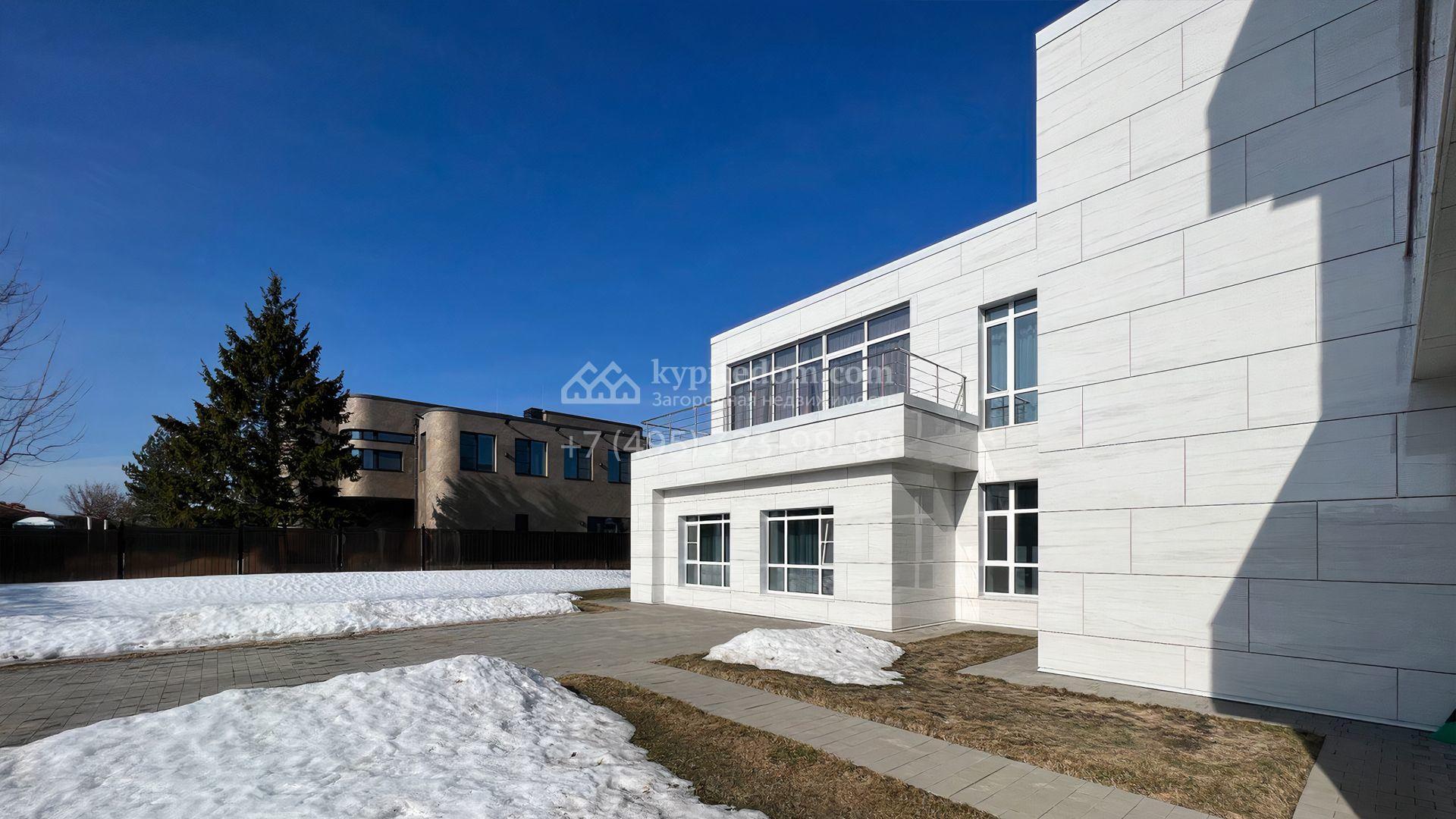 Загородная резиденция площадью 550 м² построена на полевом участке 25 соток с газоном и вымощенными дорожками. Светлый фасад здания с большими окнами облицован панелями молочного цвета. Интерьер оформлен в современном стиле с использованием приглушенных оттенков в отделке. В доме разместили 4 спальни, уютную гостиную с камином, кухню-столовую и спортзал. На участке можно расположить беседку с зоной барбекю и обустроить сад.
