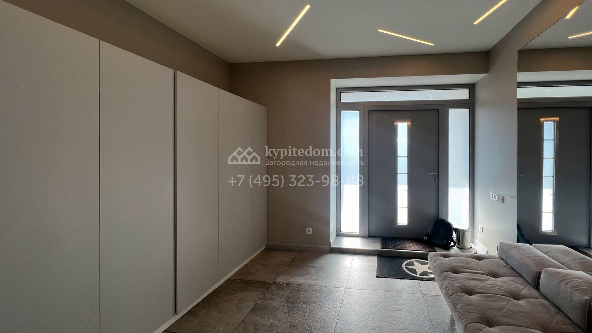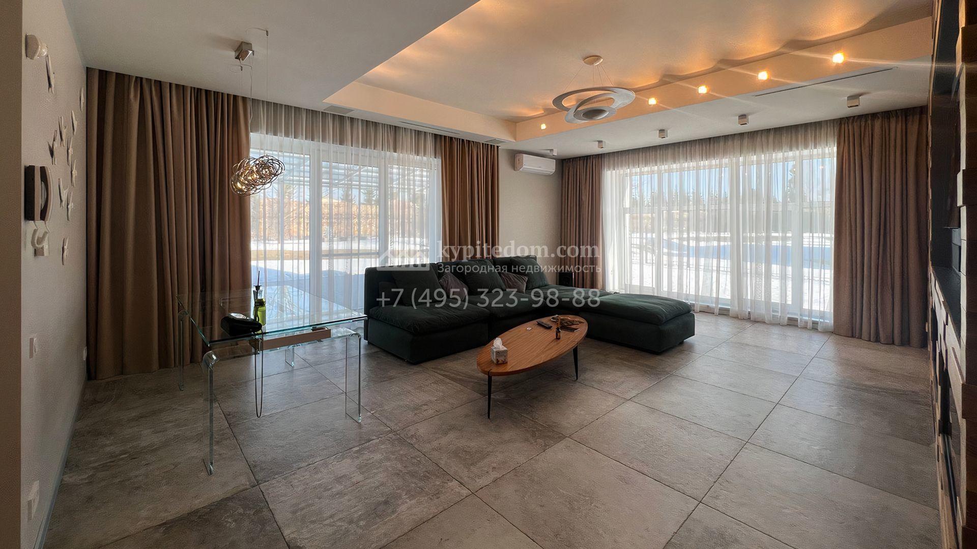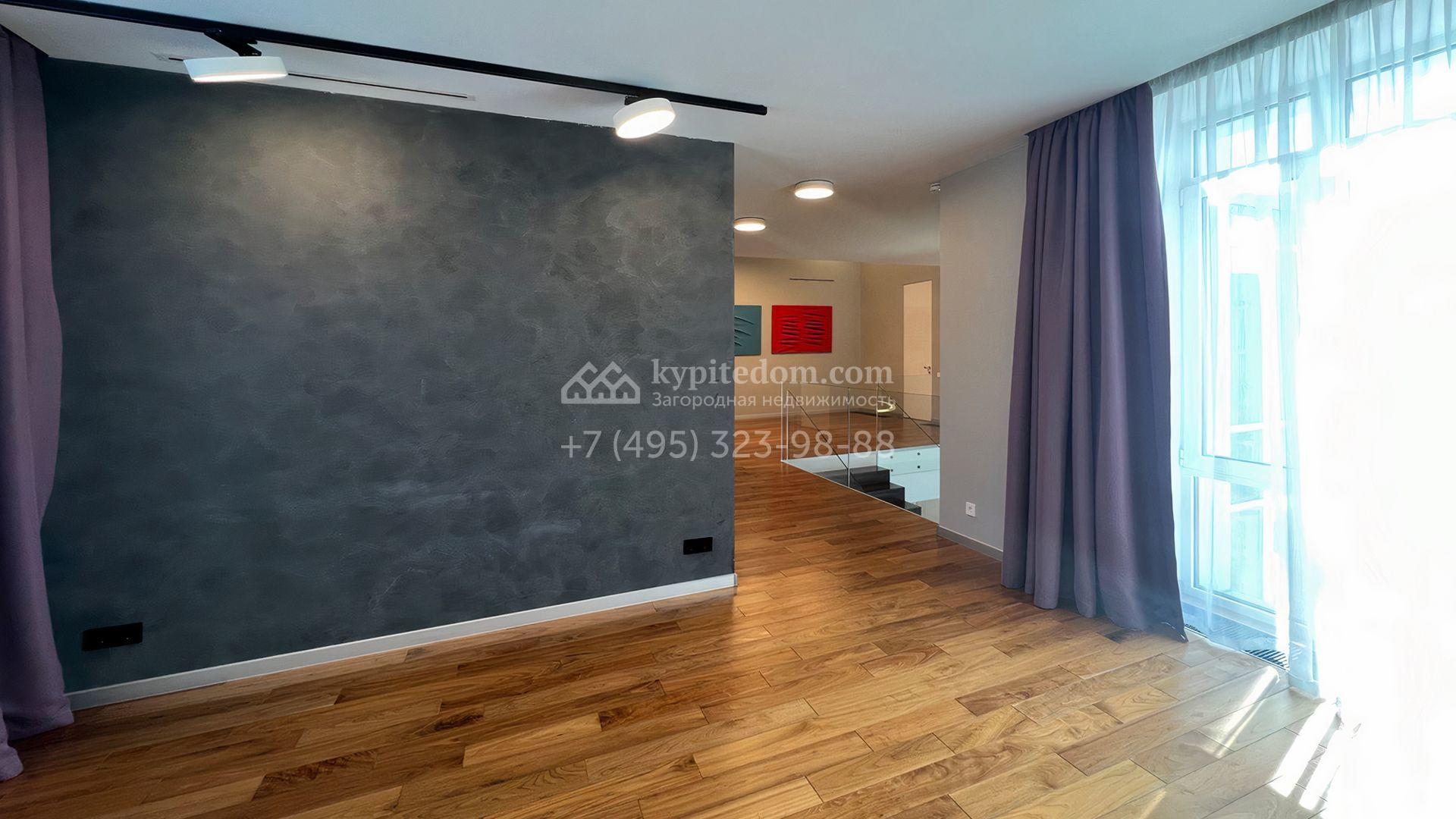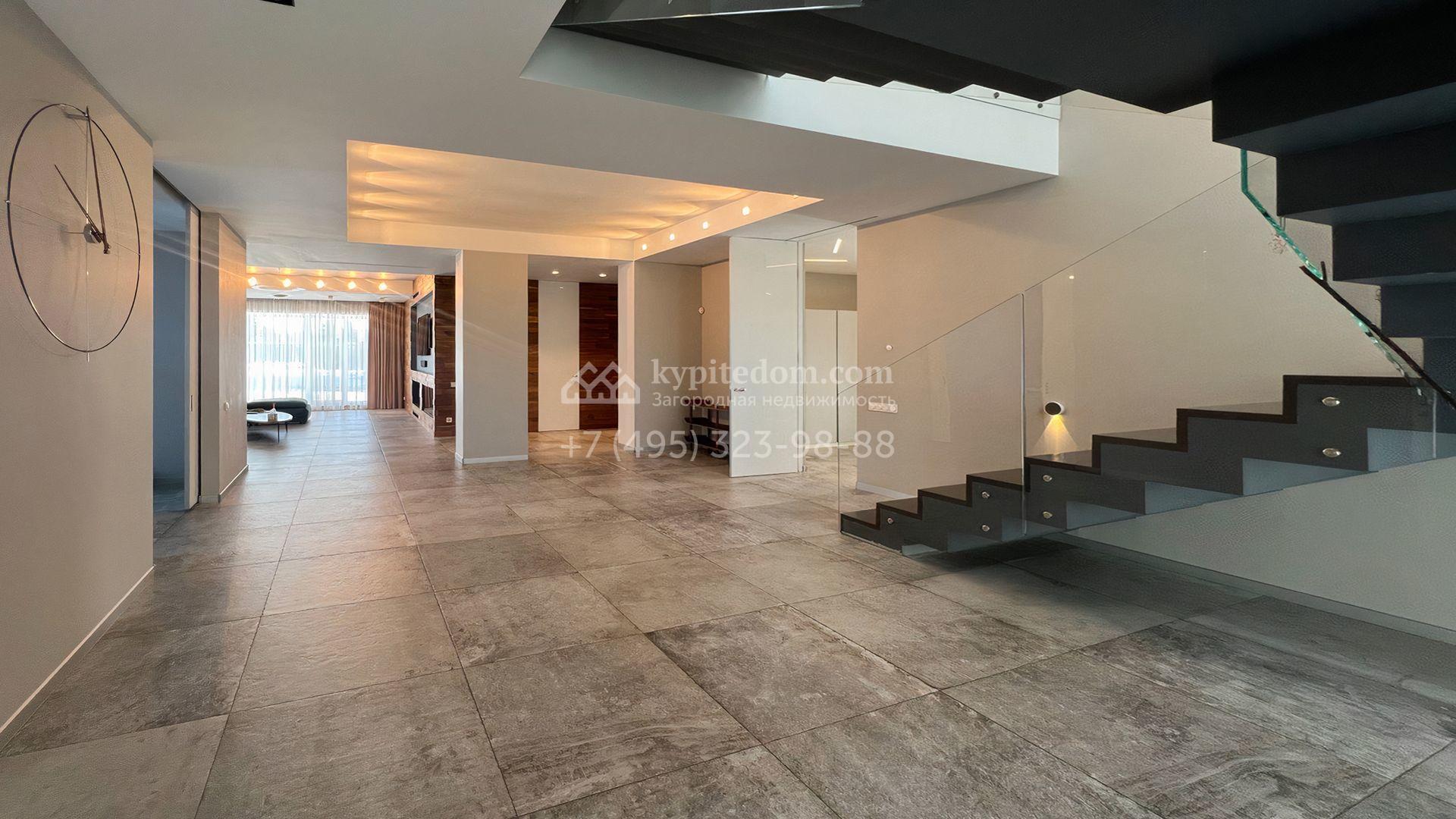 Загородная резиденция площадью 550 м² построена на полевом участке 25 соток с газоном и вымощенными дорожками. Светлый фасад здания с большими окнами облицован панелями молочного цвета. Интерьер оформлен в современном стиле с использованием приглушенных оттенков в отделке. В доме разместили 4 спальни, уютную гостиную с камином, кухню-столовую и спортзал. На участке можно расположить беседку с зоной барбекю и обустроить сад.