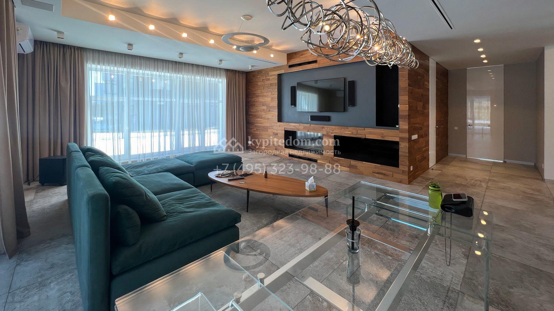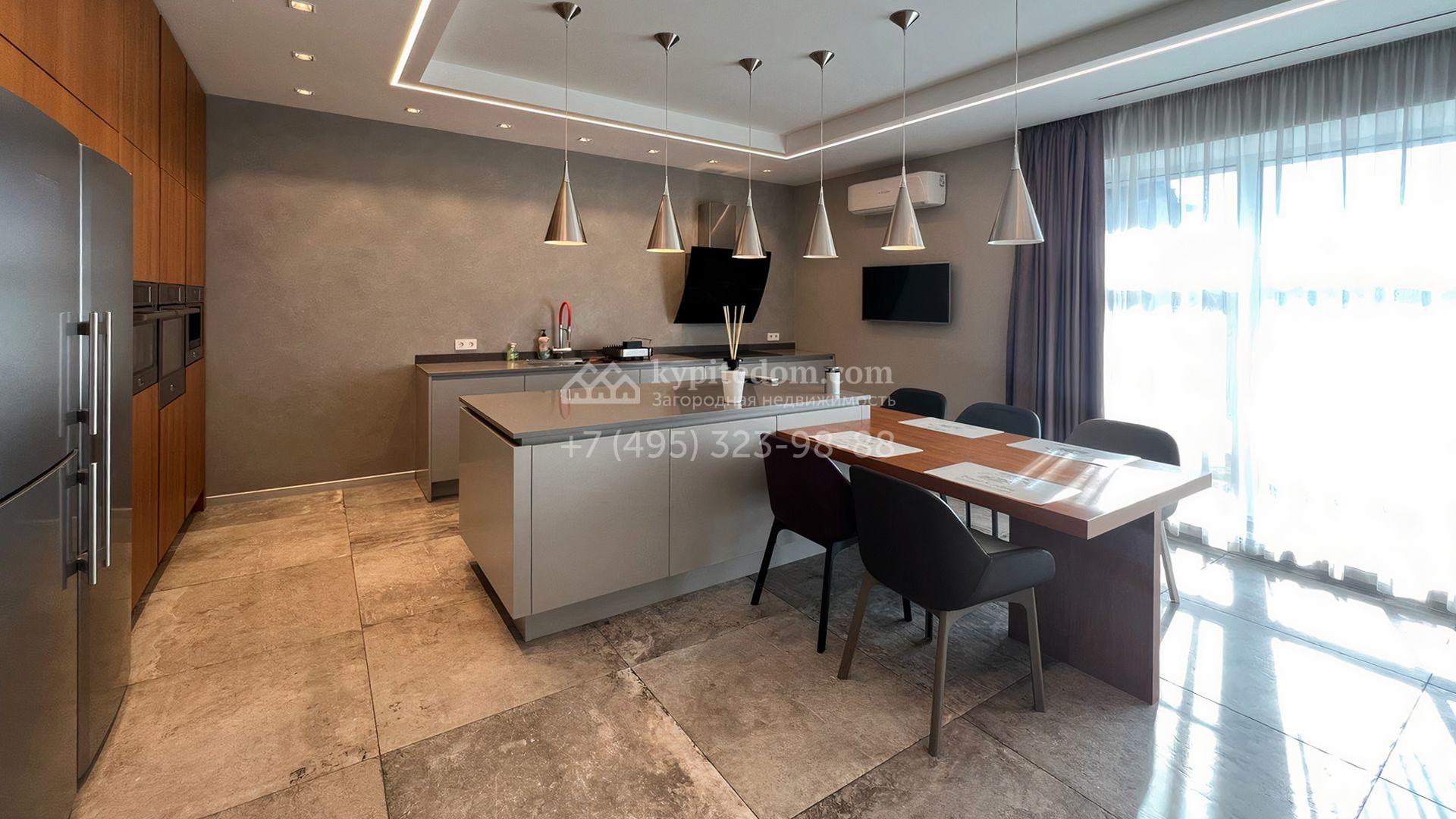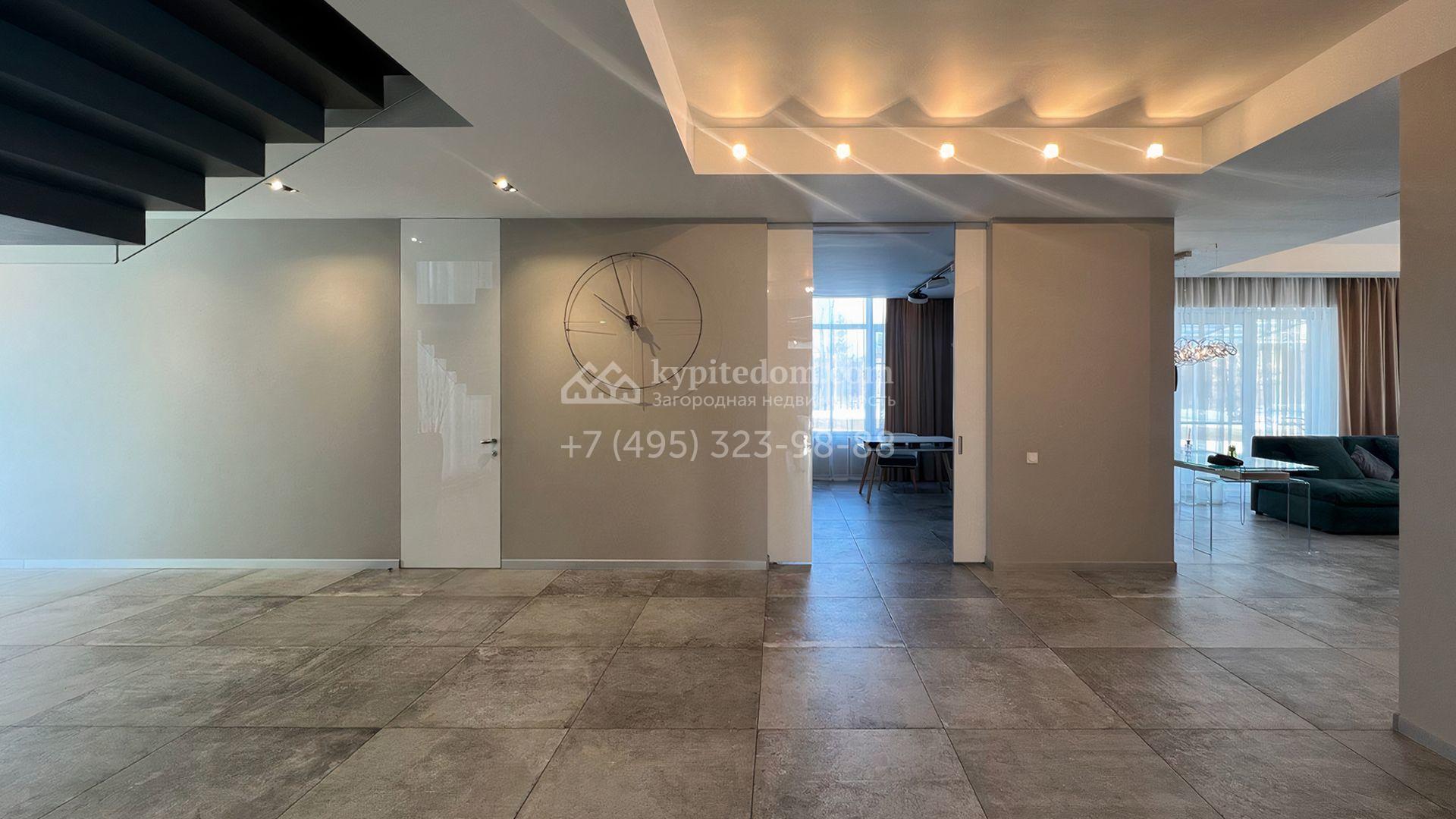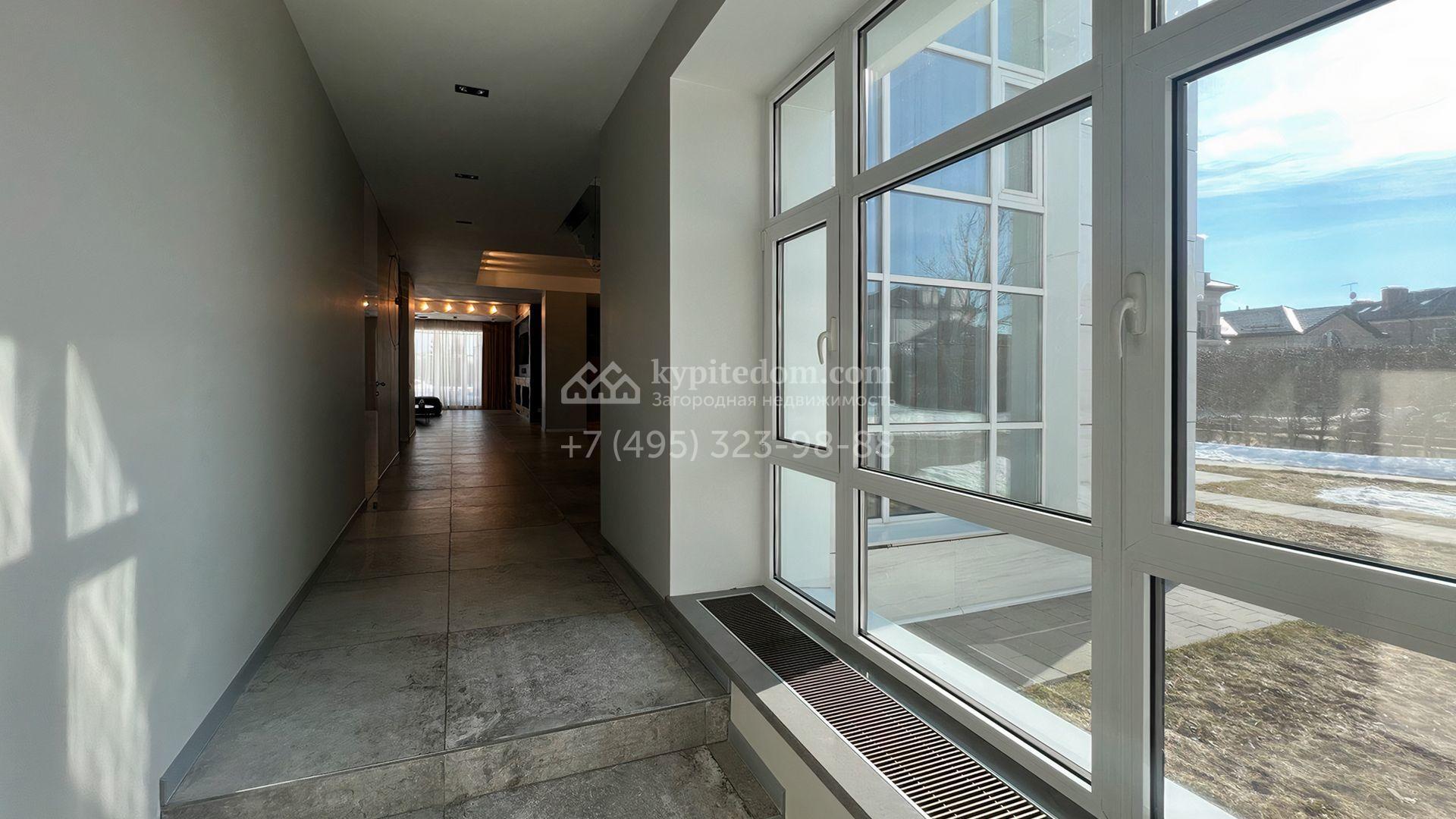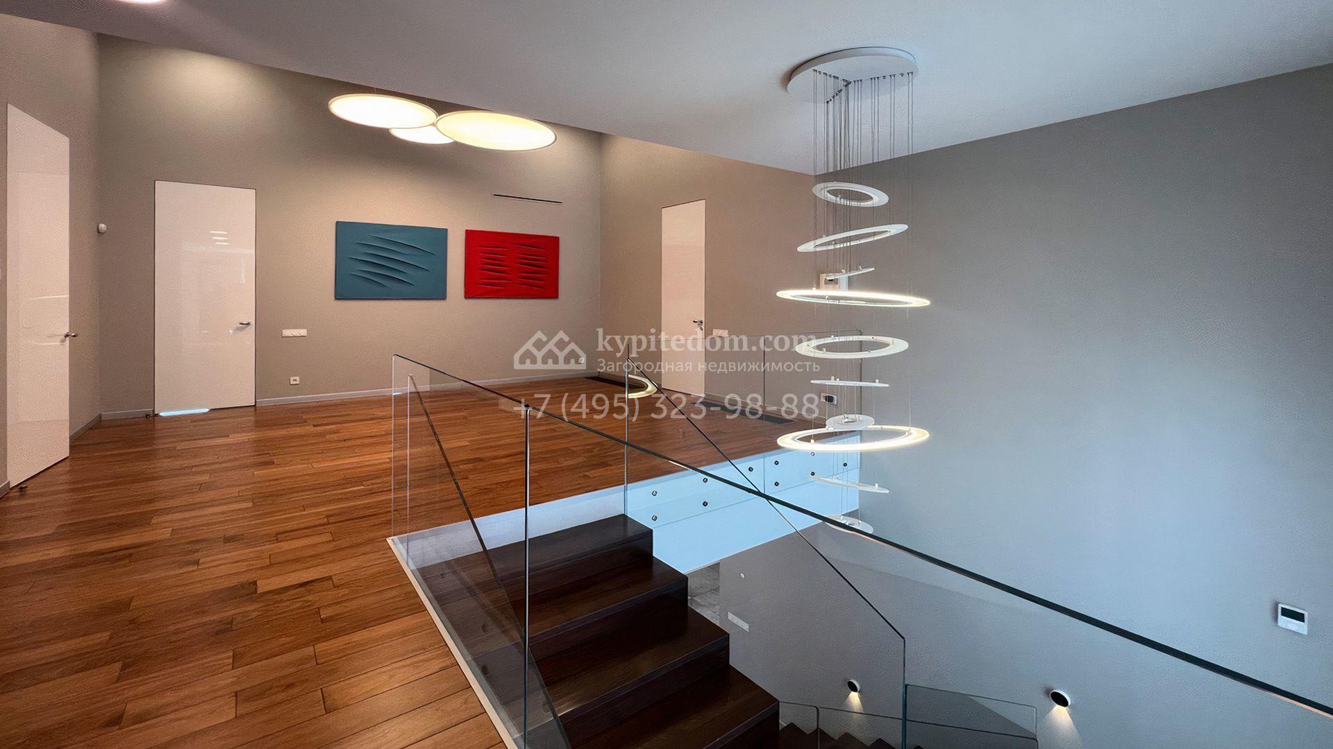 Загородная резиденция площадью 550 м² построена на полевом участке 25 соток с газоном и вымощенными дорожками. Светлый фасад здания с большими окнами облицован панелями молочного цвета. Интерьер оформлен в современном стиле с использованием приглушенных оттенков в отделке. В доме разместили 4 спальни, уютную гостиную с камином, кухню-столовую и спортзал. На участке можно расположить беседку с зоной барбекю и обустроить сад.