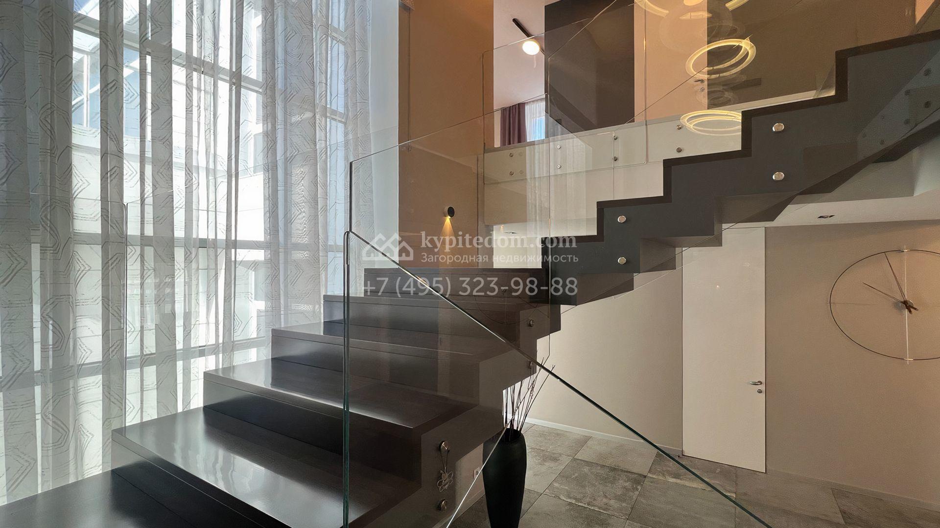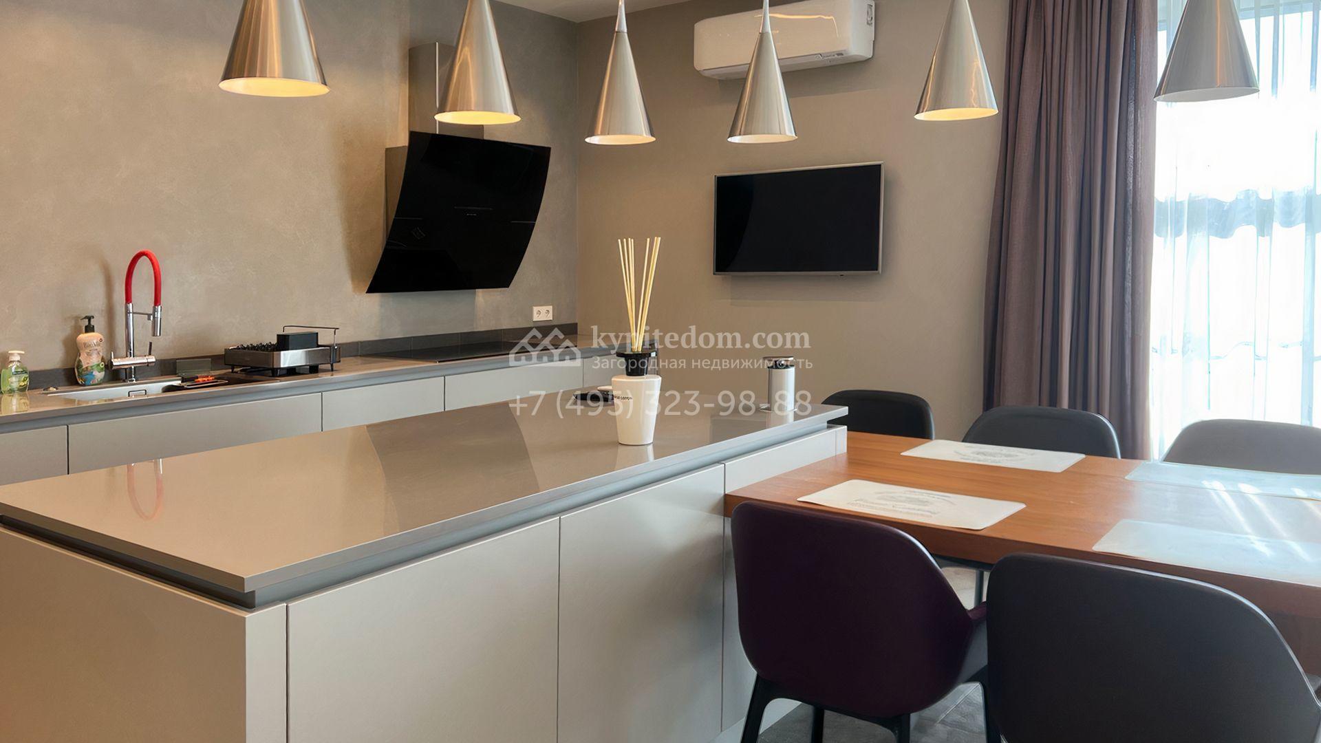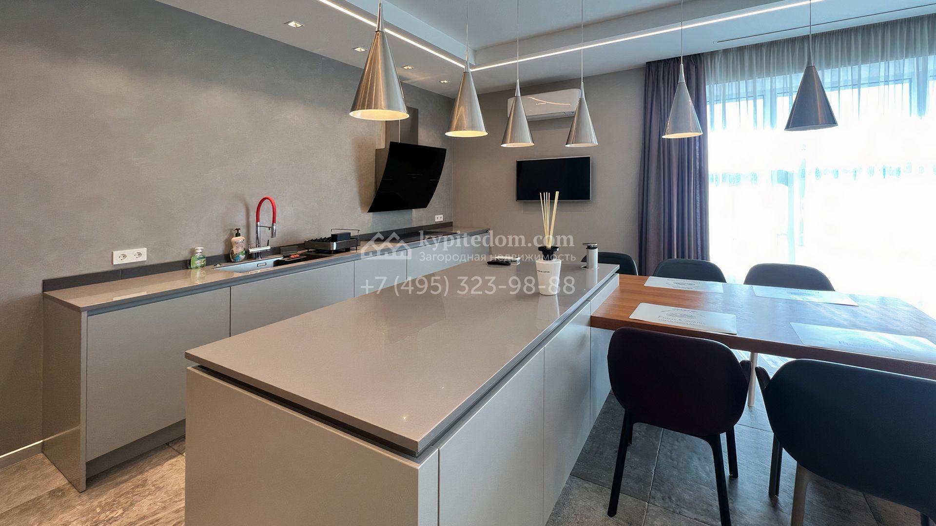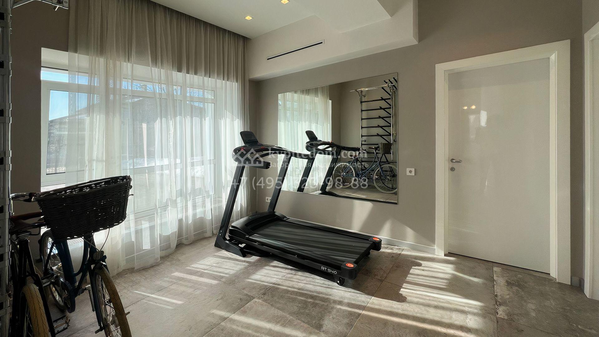 Загородная резиденция площадью 550 м² построена на полевом участке 25 соток с газоном и вымощенными дорожками. Светлый фасад здания с большими окнами облицован панелями молочного цвета. Интерьер оформлен в современном стиле с использованием приглушенных оттенков в отделке. В доме разместили 4 спальни, уютную гостиную с камином, кухню-столовую и спортзал. На участке можно расположить беседку с зоной барбекю и обустроить сад.