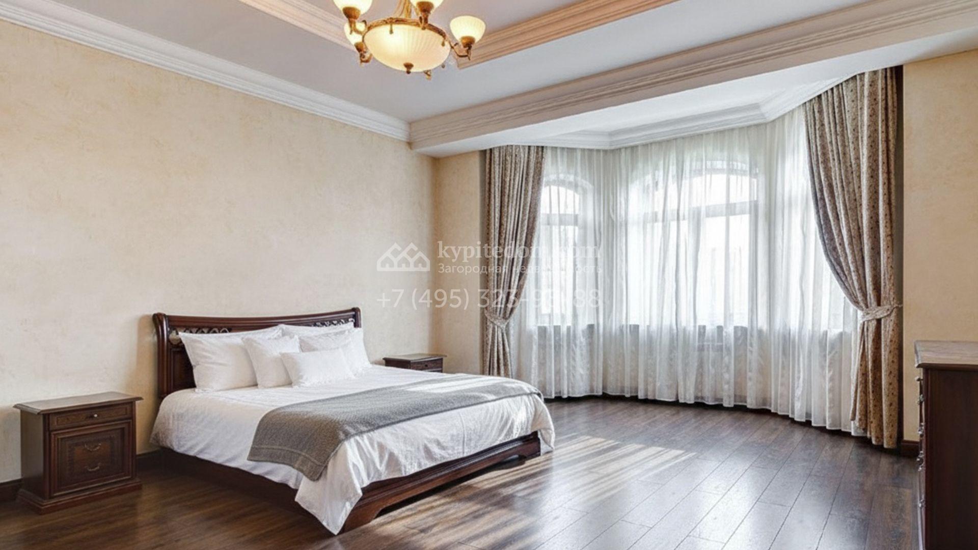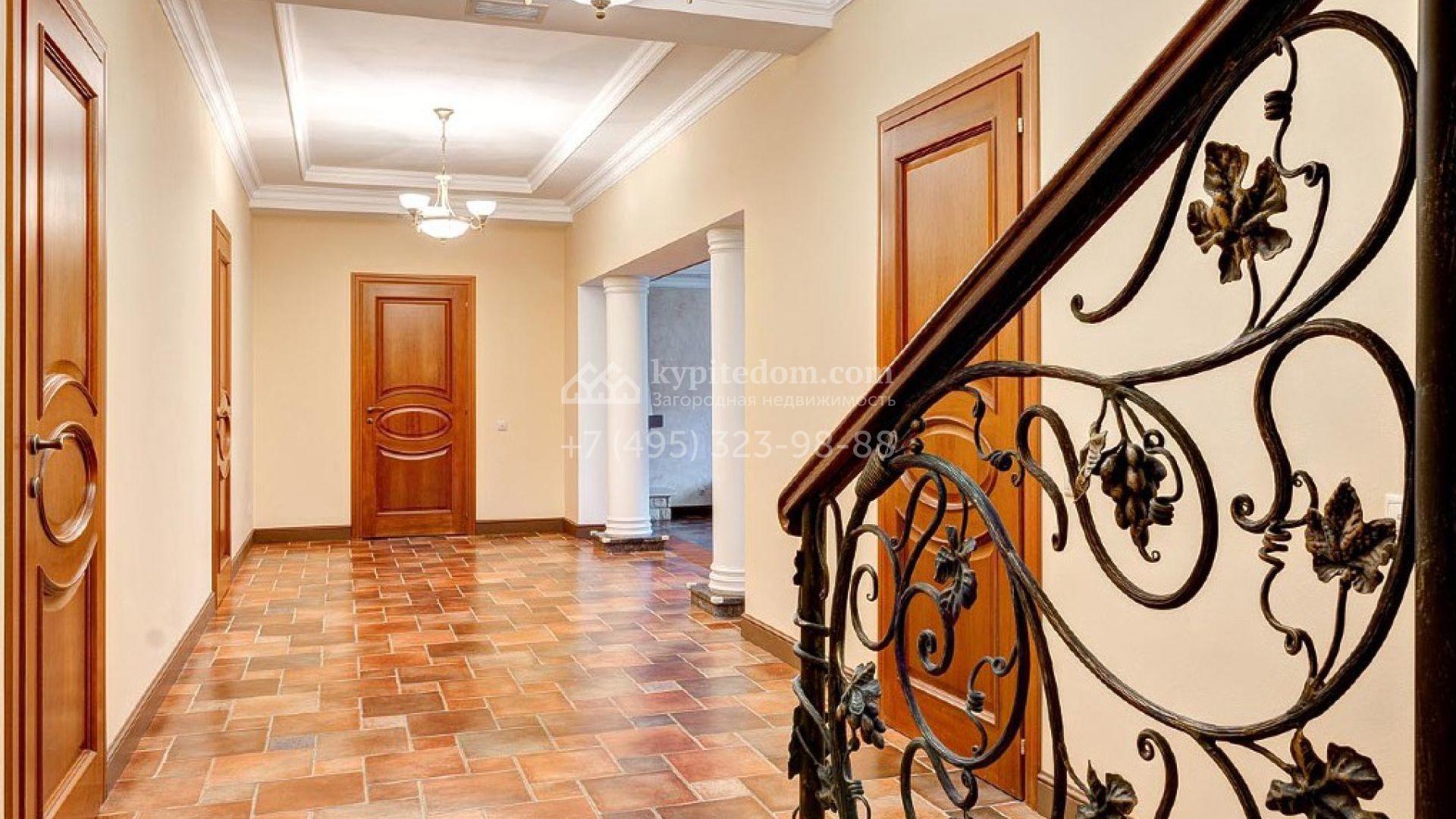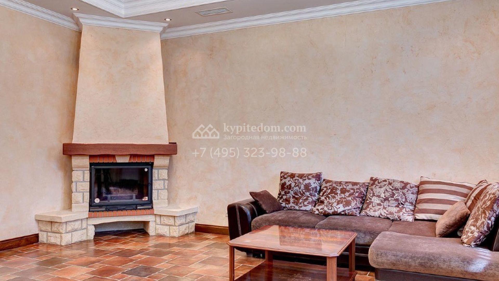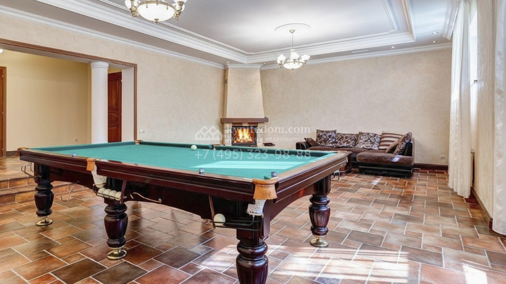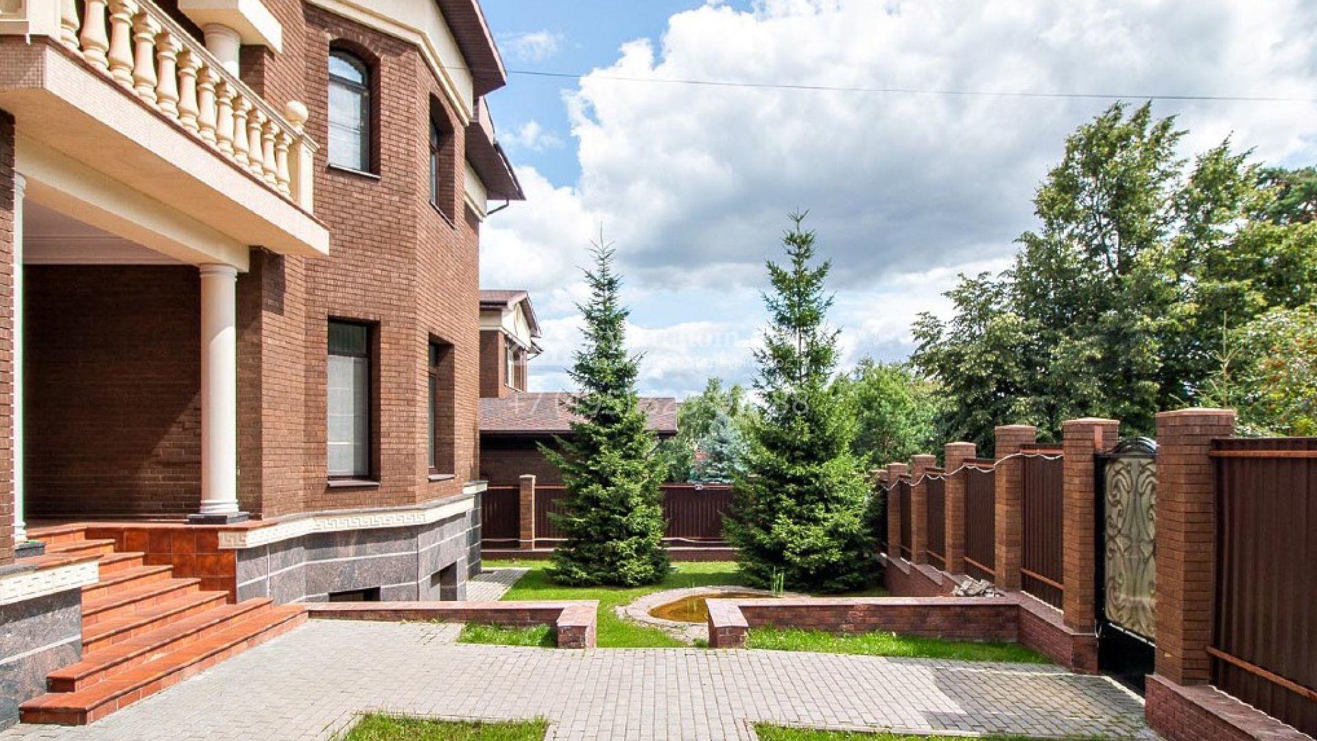 Загородный коттедж площадью 700 м² построен на полевом участке 10 соток. Фасад в европейском стиле облицован коричневым клинкерным кирпичом и декорирован кремовыми колоннами и балясинами. В отделке интерьера использованы теплые оттенки и фактура дерева, создающие в доме уют. Планировкой резиденции предусмотрены 4 спальни, гостиная с камином, кухня-столовая с выходом на террасу, а также на цокольном этаже бильярдная с баром и камином, сауна и бассейн. На участке выполнен ландшафтный дизайн, вымощены дорожки, установлено уличное освещение и обустроен небольшой пруд.