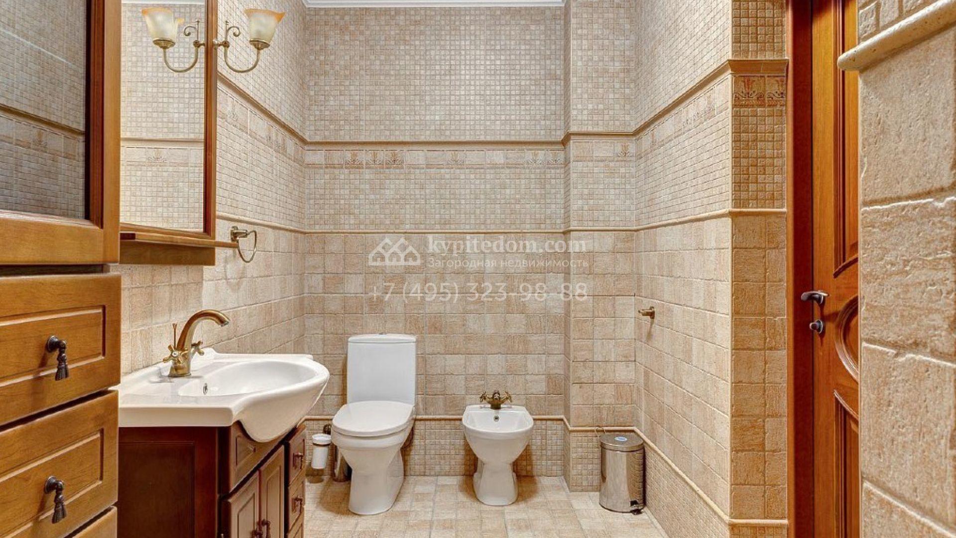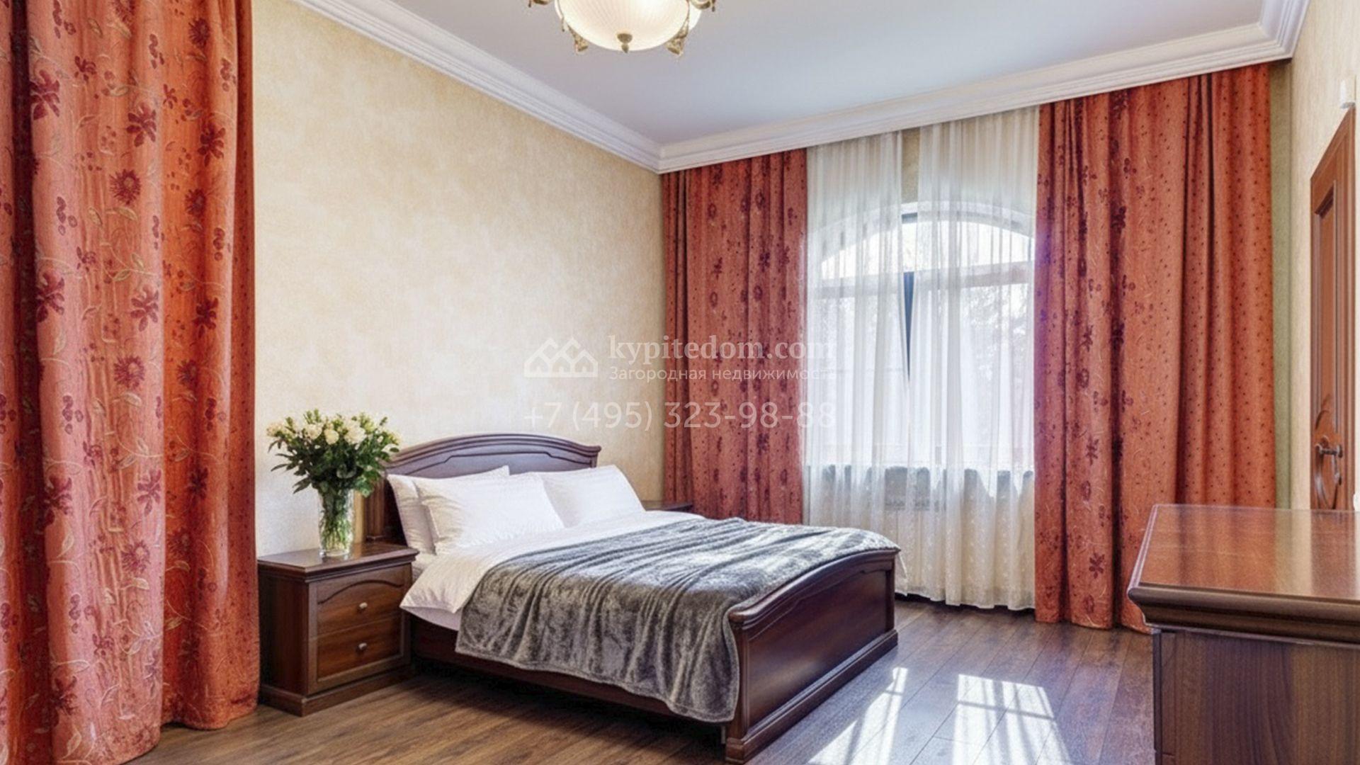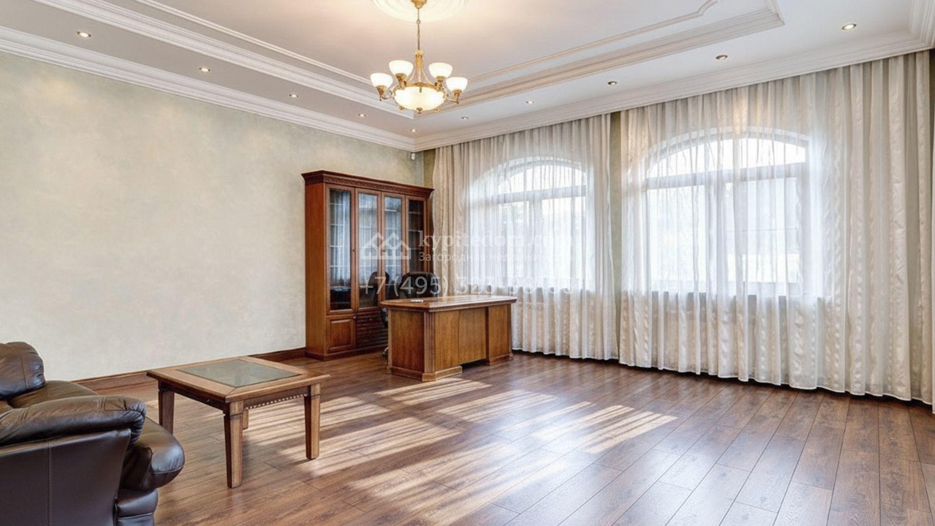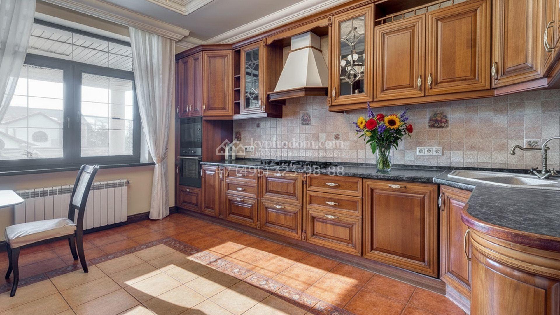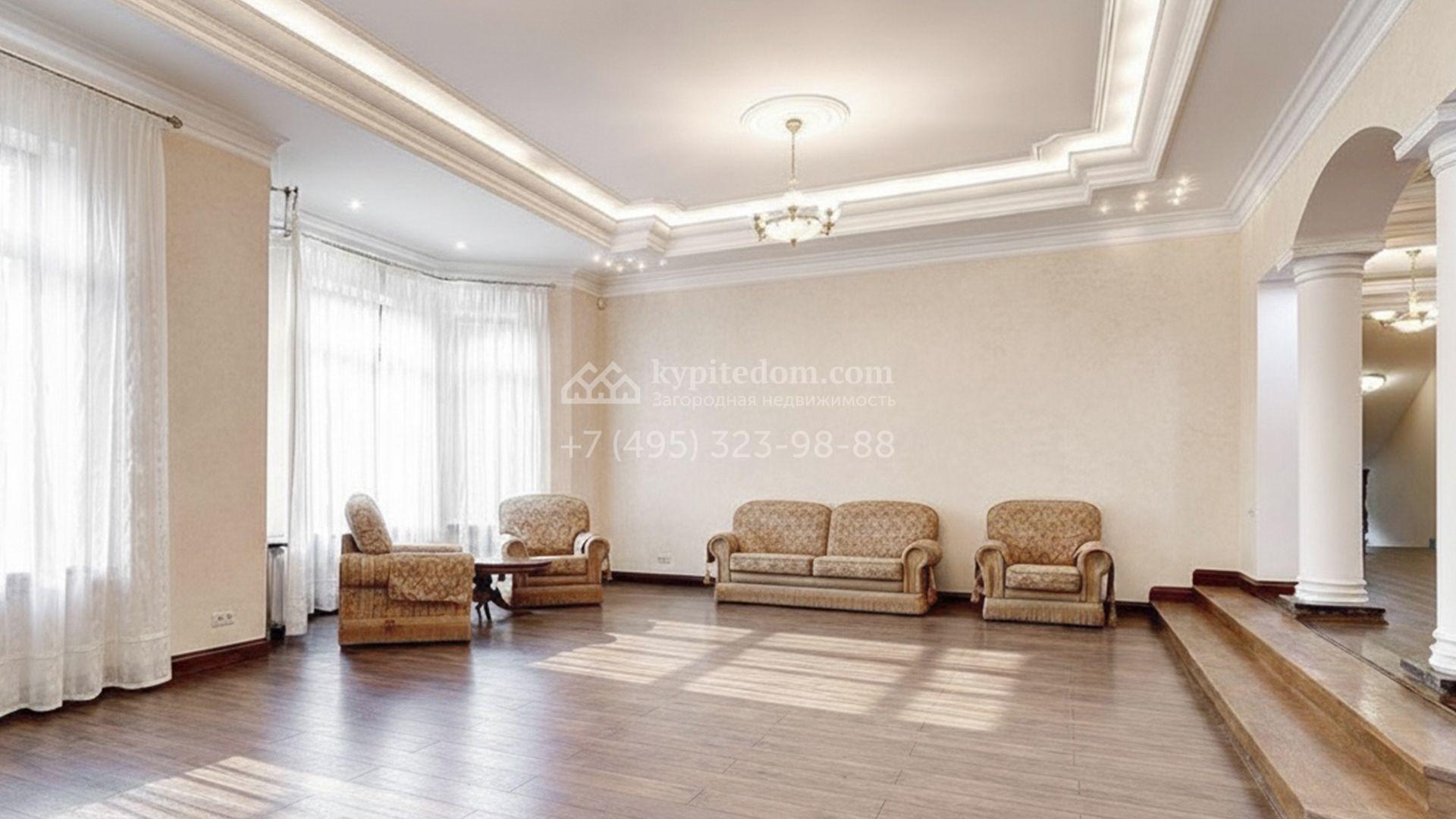 Загородный коттедж площадью 700 м² построен на полевом участке 10 соток. Фасад в европейском стиле облицован коричневым клинкерным кирпичом и декорирован кремовыми колоннами и балясинами. В отделке интерьера использованы теплые оттенки и фактура дерева, создающие в доме уют. Планировкой резиденции предусмотрены 4 спальни, гостиная с камином, кухня-столовая с выходом на террасу, а также на цокольном этаже бильярдная с баром и камином, сауна и бассейн. На участке выполнен ландшафтный дизайн, вымощены дорожки, установлено уличное освещение и обустроен небольшой пруд.
