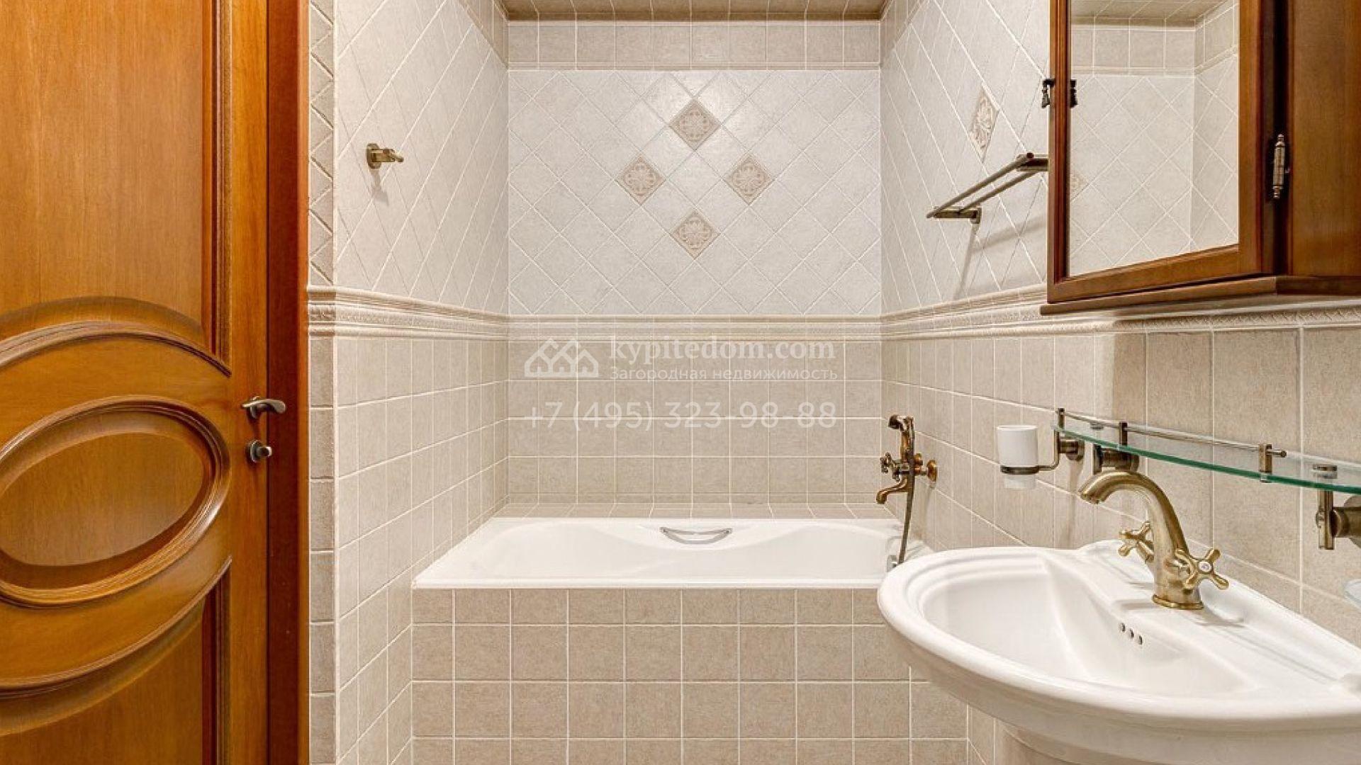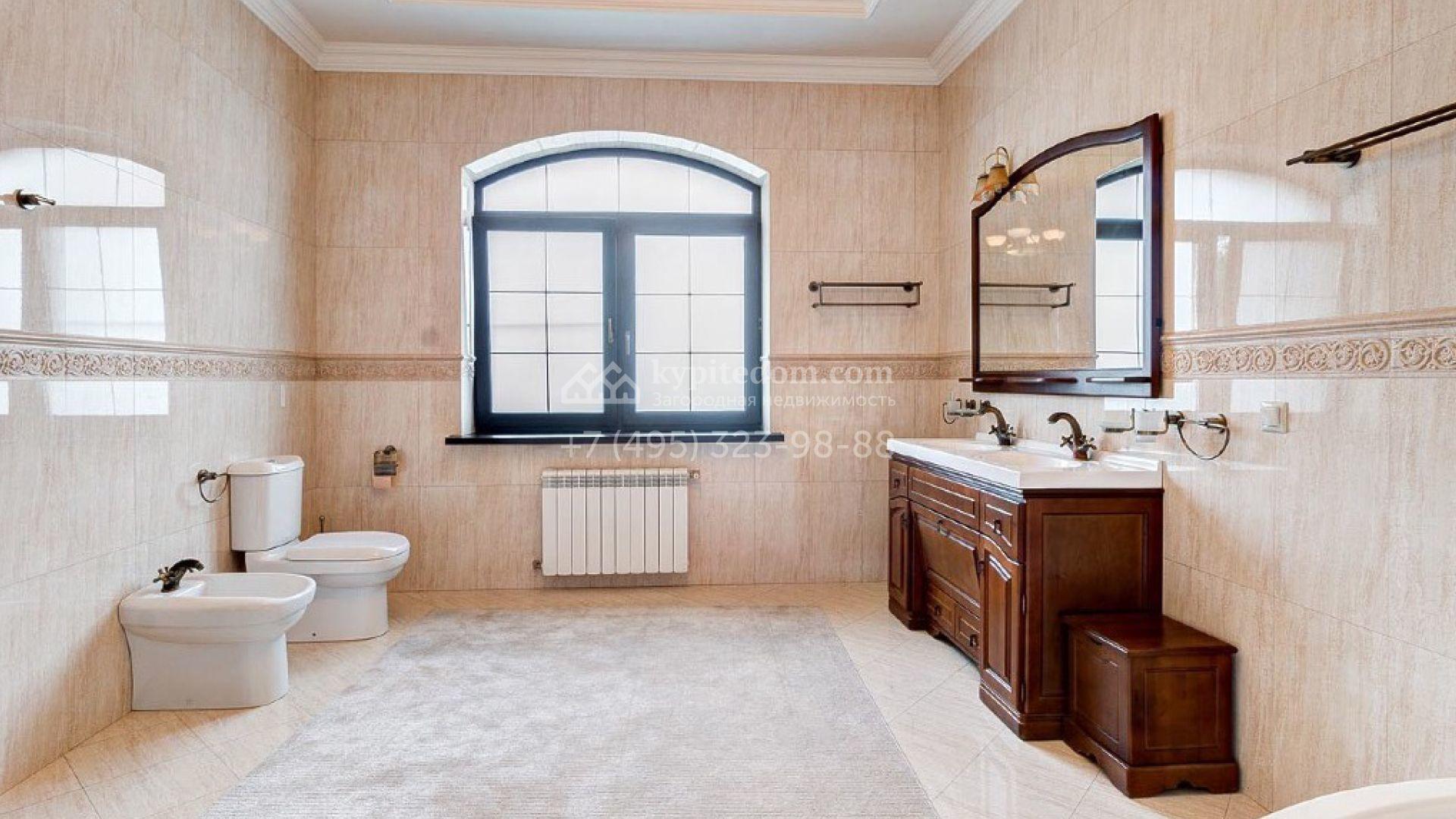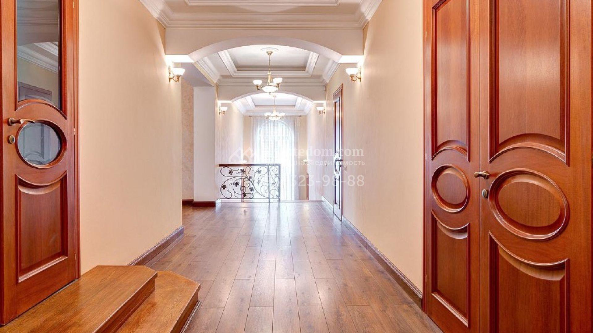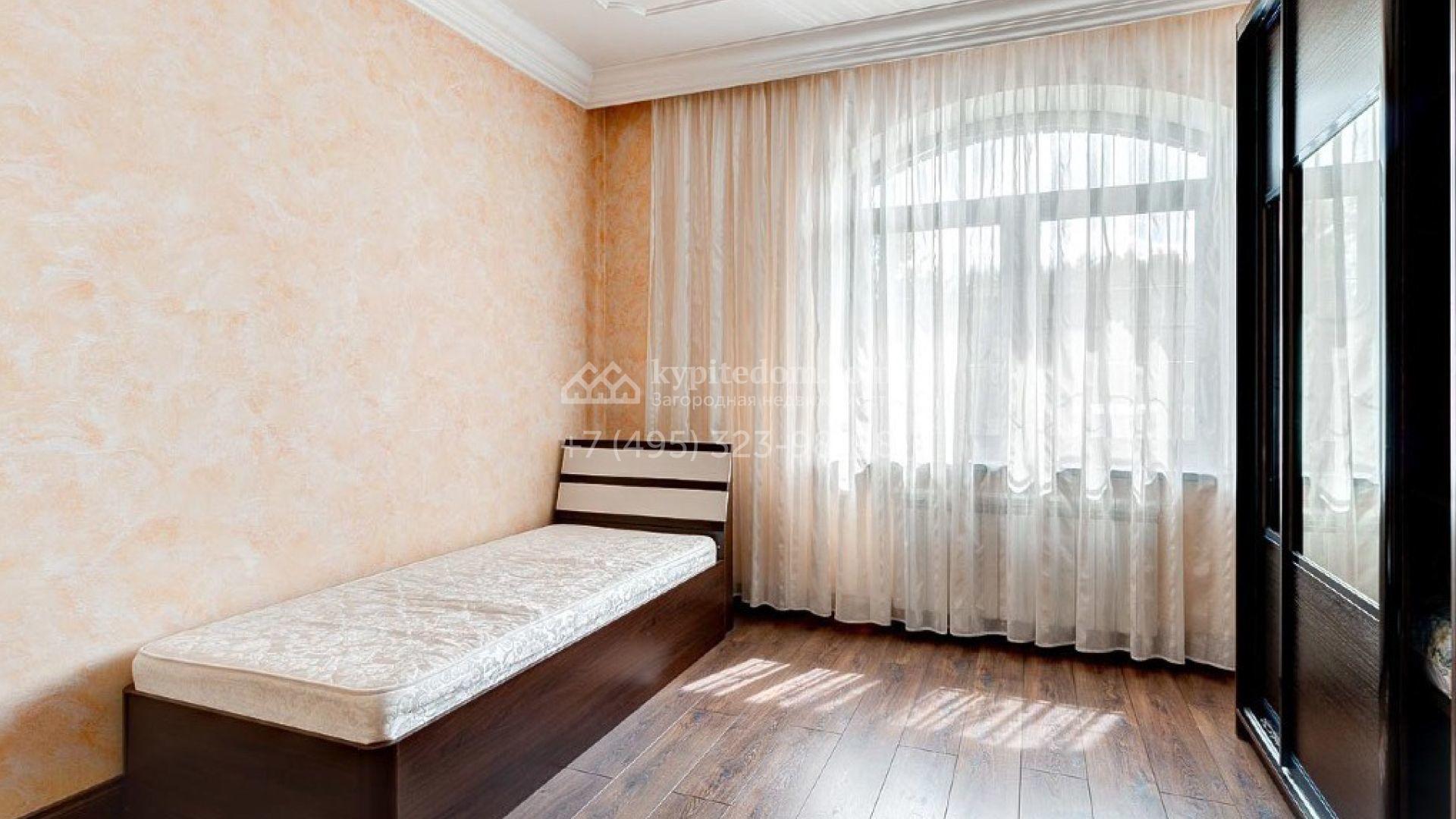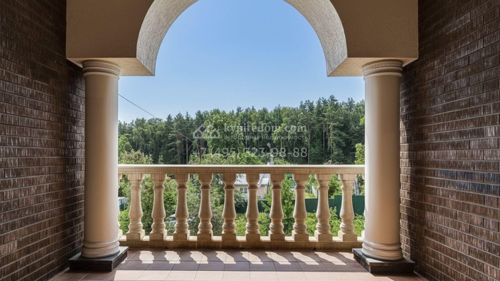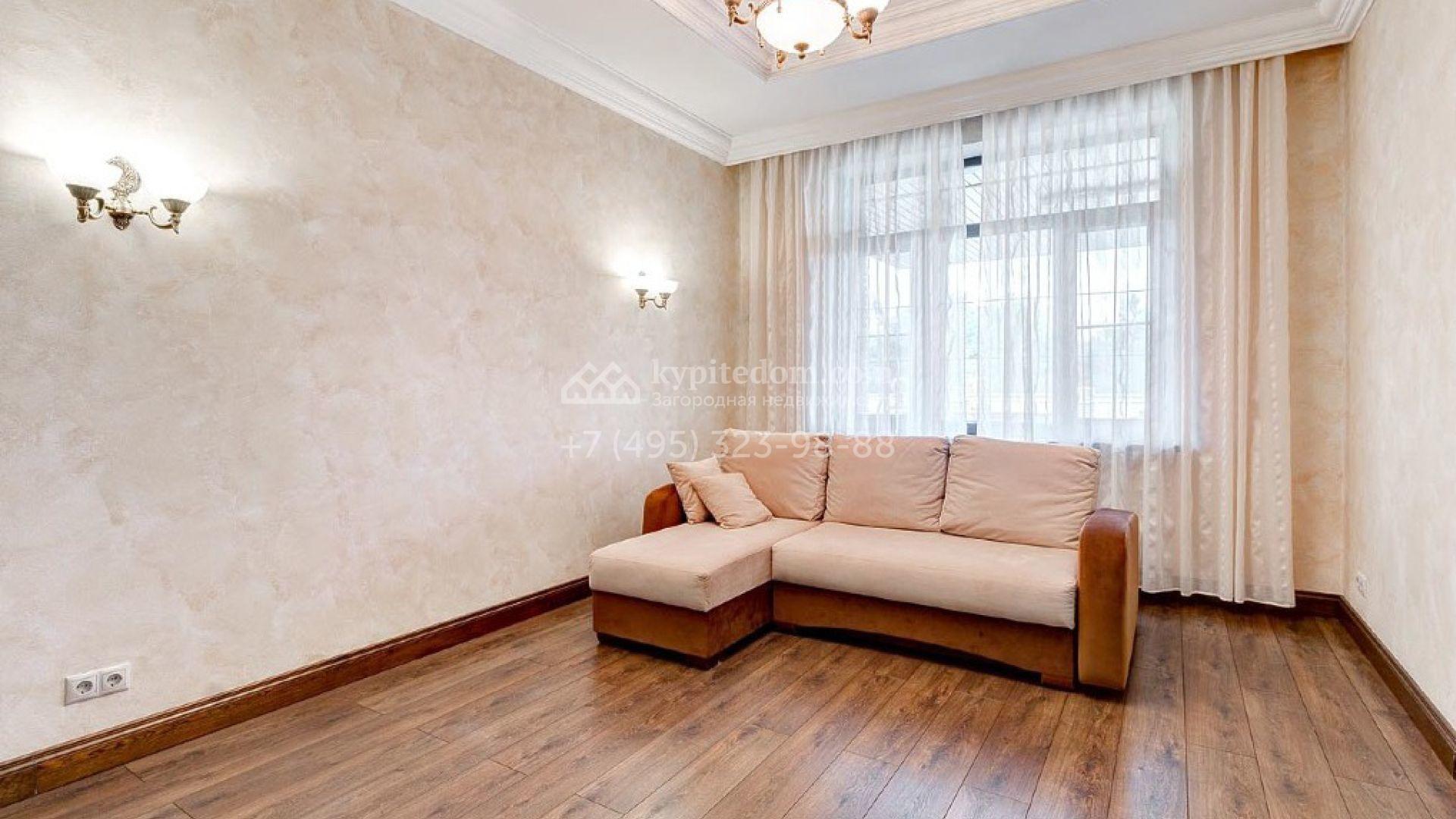 Загородный коттедж площадью 700 м² построен на полевом участке 10 соток. Фасад в европейском стиле облицован коричневым клинкерным кирпичом и декорирован кремовыми колоннами и балясинами. В отделке интерьера использованы теплые оттенки и фактура дерева, создающие в доме уют. Планировкой резиденции предусмотрены 4 спальни, гостиная с камином, кухня-столовая с выходом на террасу, а также на цокольном этаже бильярдная с баром и камином, сауна и бассейн. На участке выполнен ландшафтный дизайн, вымощены дорожки, установлено уличное освещение и обустроен небольшой пруд.