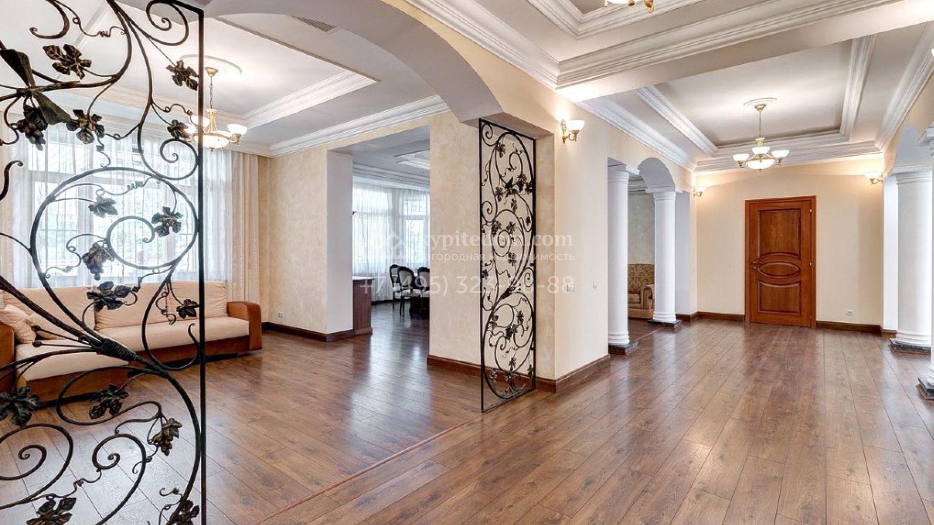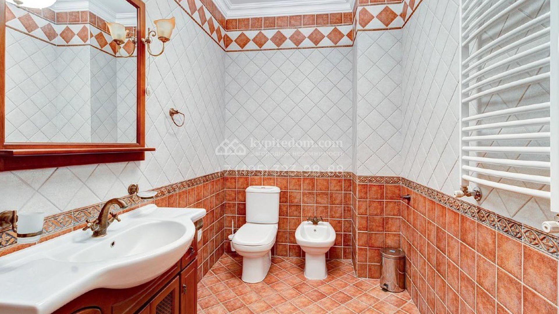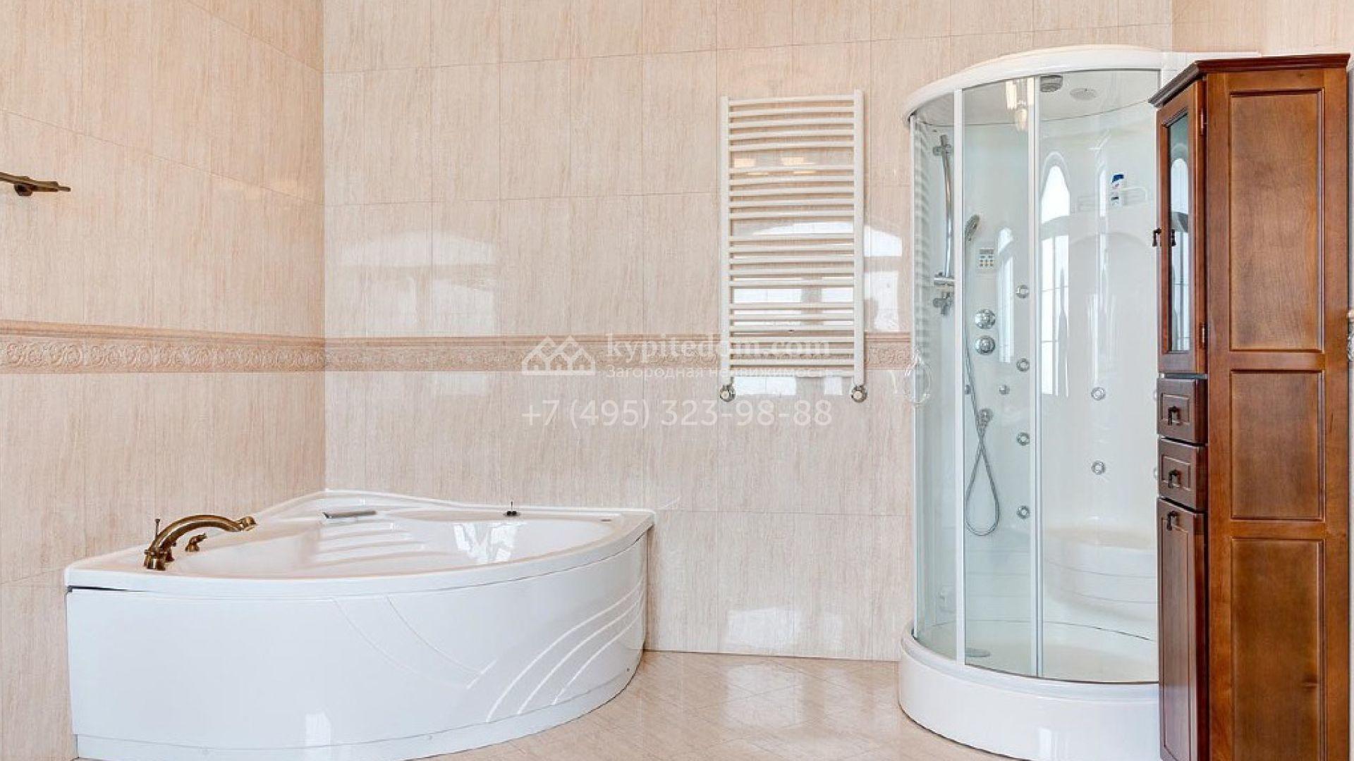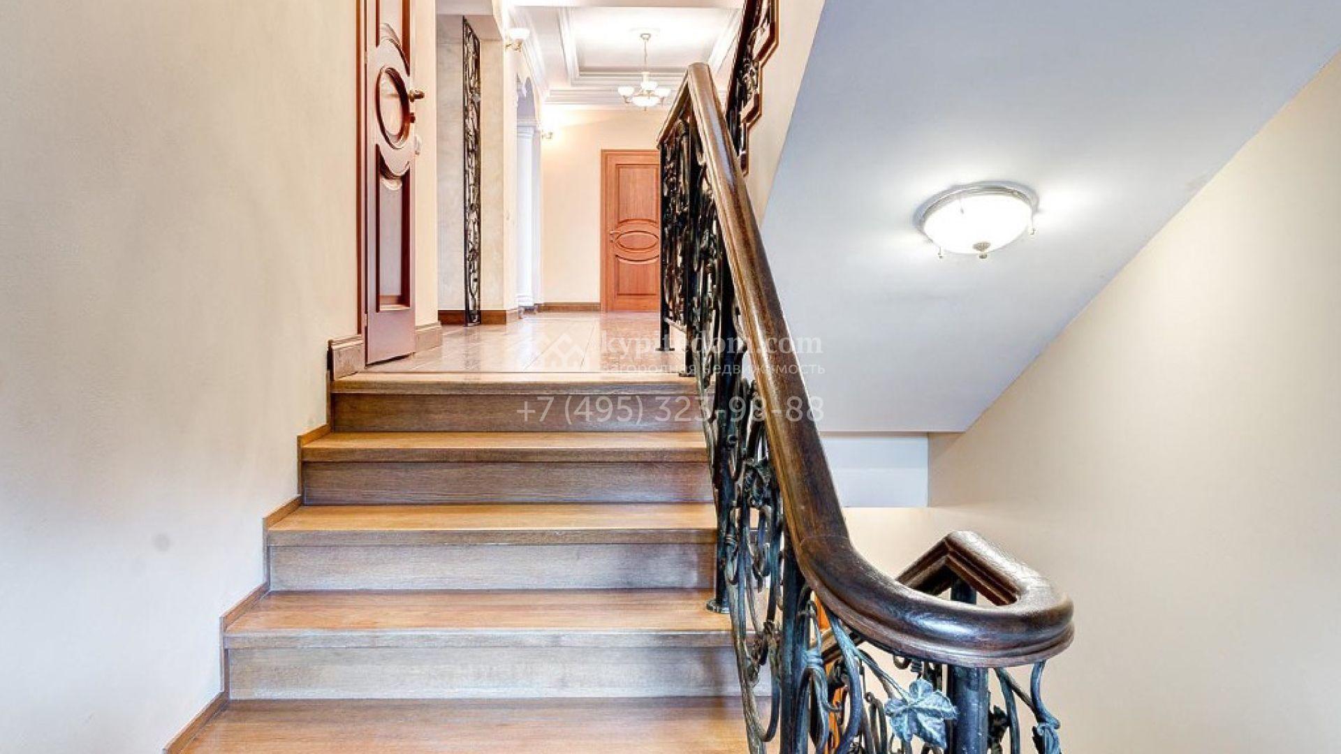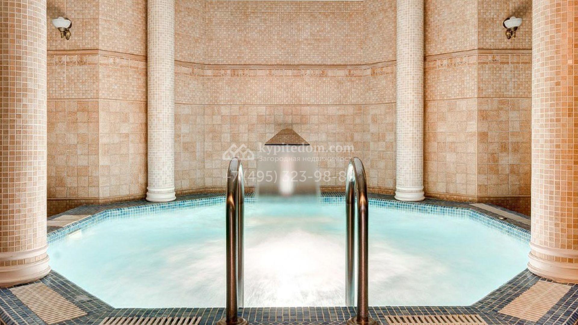 Загородный коттедж площадью 700 м² построен на полевом участке 10 соток. Фасад в европейском стиле облицован коричневым клинкерным кирпичом и декорирован кремовыми колоннами и балясинами. В отделке интерьера использованы теплые оттенки и фактура дерева, создающие в доме уют. Планировкой резиденции предусмотрены 4 спальни, гостиная с камином, кухня-столовая с выходом на террасу, а также на цокольном этаже бильярдная с баром и камином, сауна и бассейн. На участке выполнен ландшафтный дизайн, вымощены дорожки, установлено уличное освещение и обустроен небольшой пруд.
