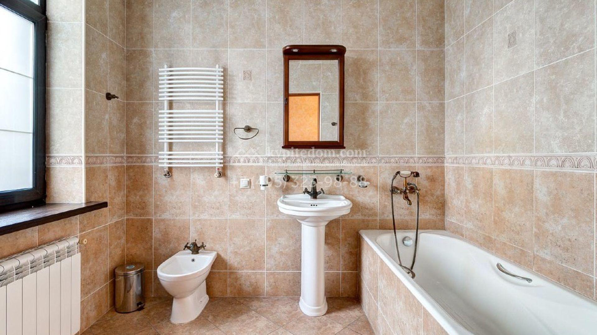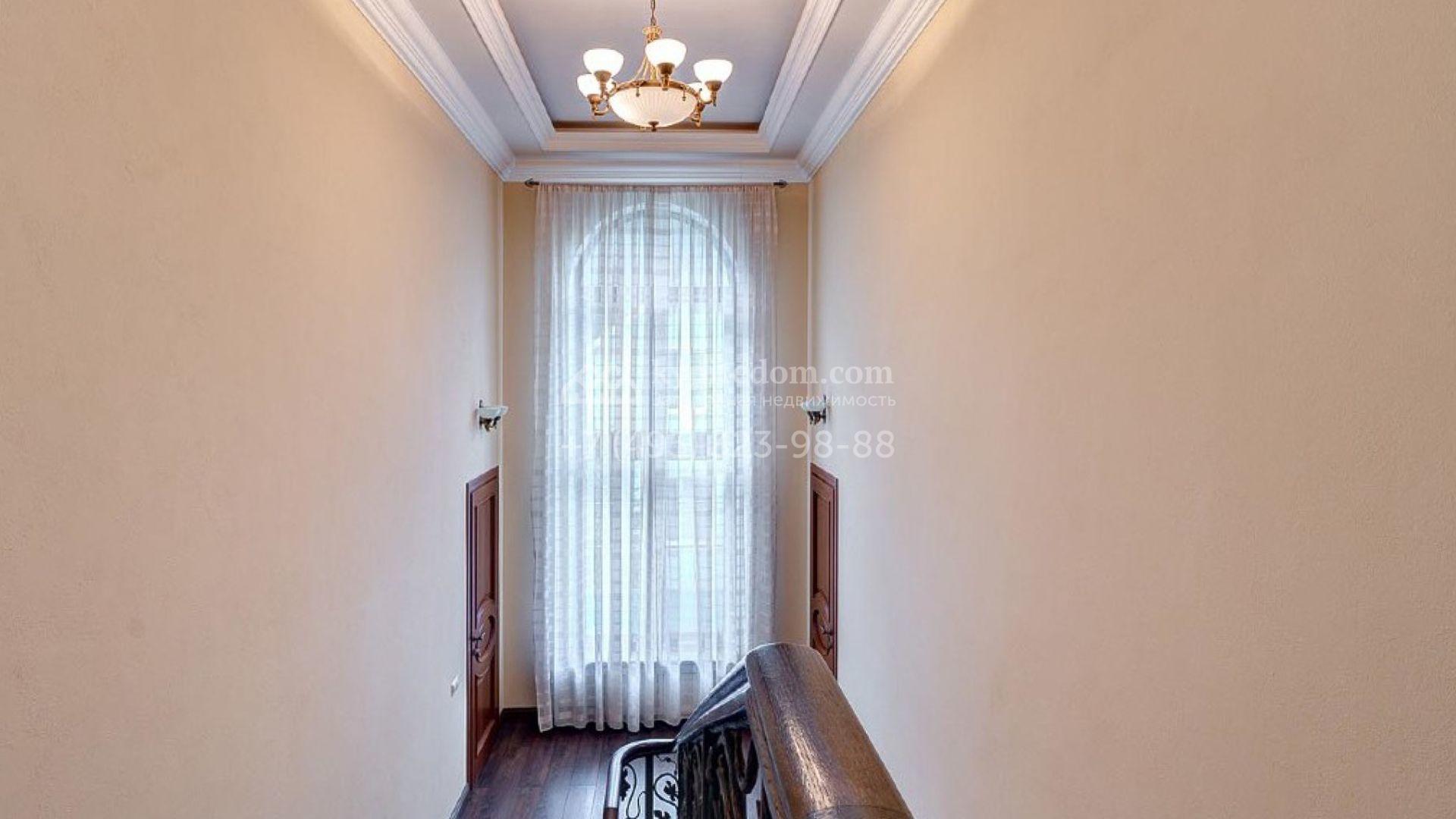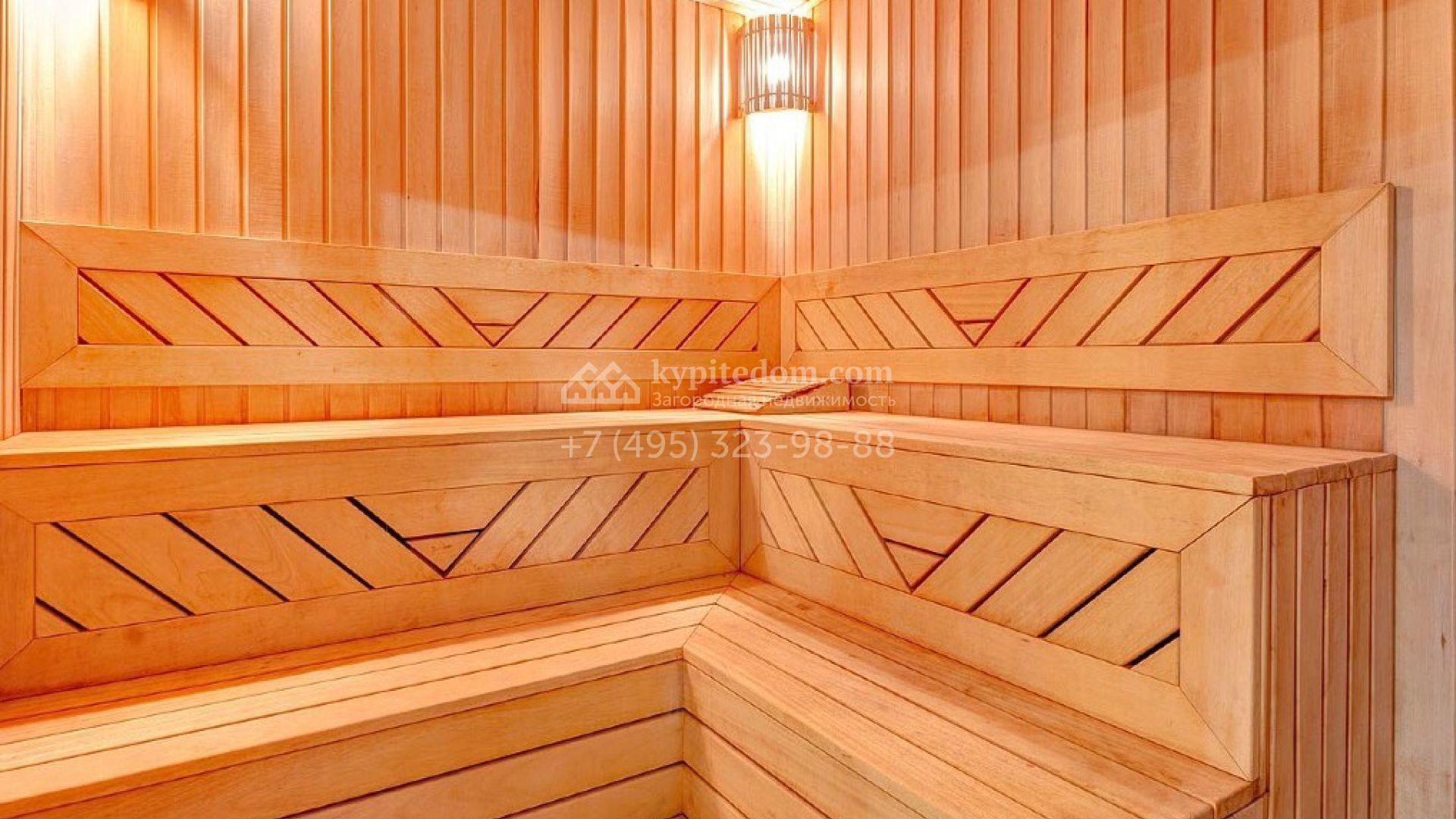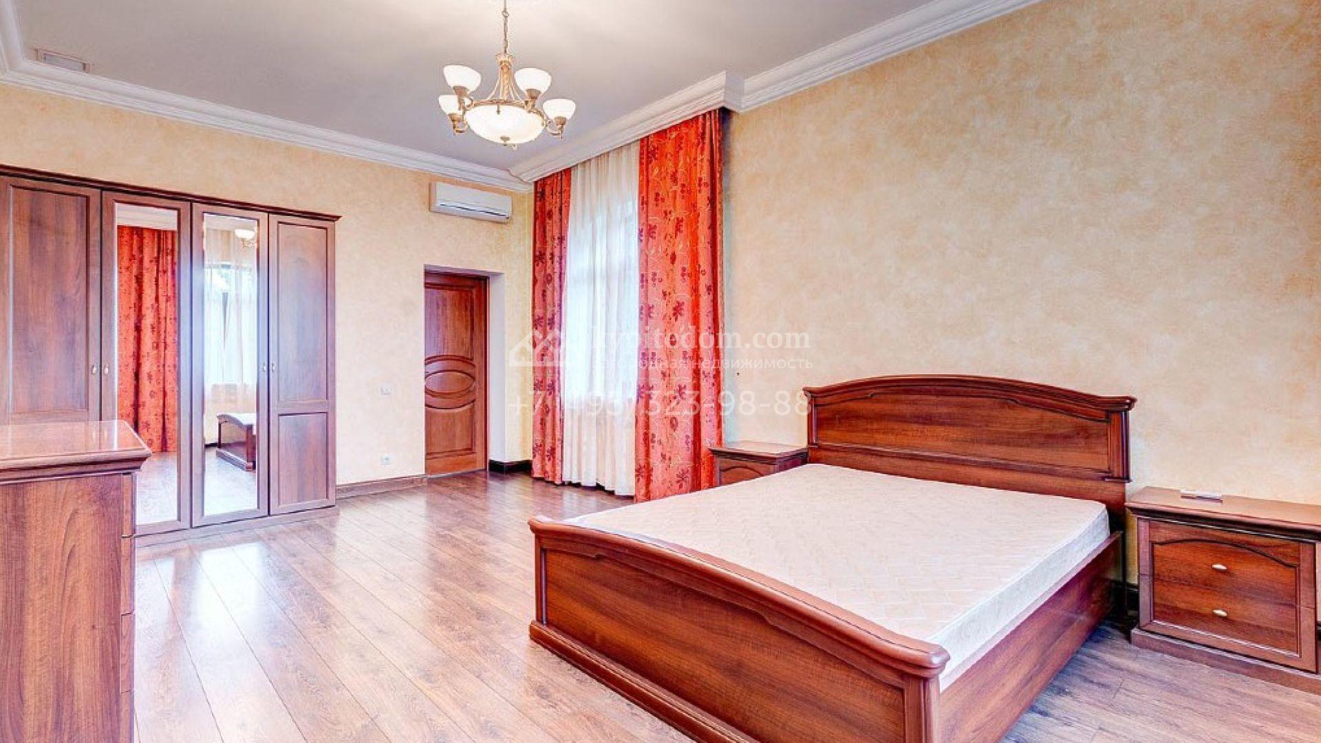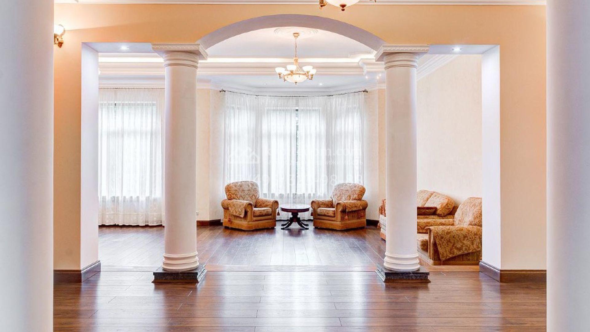 Загородный коттедж площадью 700 м² построен на полевом участке 10 соток. Фасад в европейском стиле облицован коричневым клинкерным кирпичом и декорирован кремовыми колоннами и балясинами. В отделке интерьера использованы теплые оттенки и фактура дерева, создающие в доме уют. Планировкой резиденции предусмотрены 4 спальни, гостиная с камином, кухня-столовая с выходом на террасу, а также на цокольном этаже бильярдная с баром и камином, сауна и бассейн. На участке выполнен ландшафтный дизайн, вымощены дорожки, установлено уличное освещение и обустроен небольшой пруд.