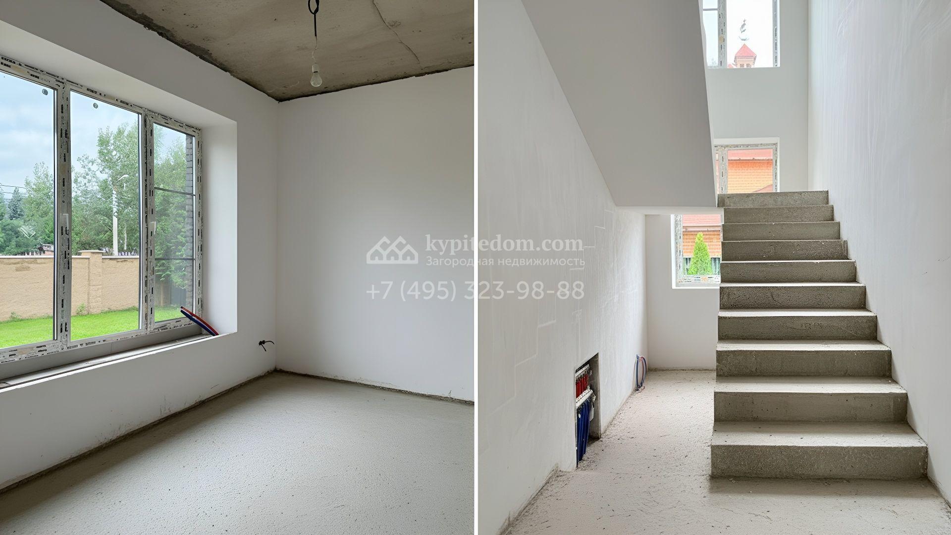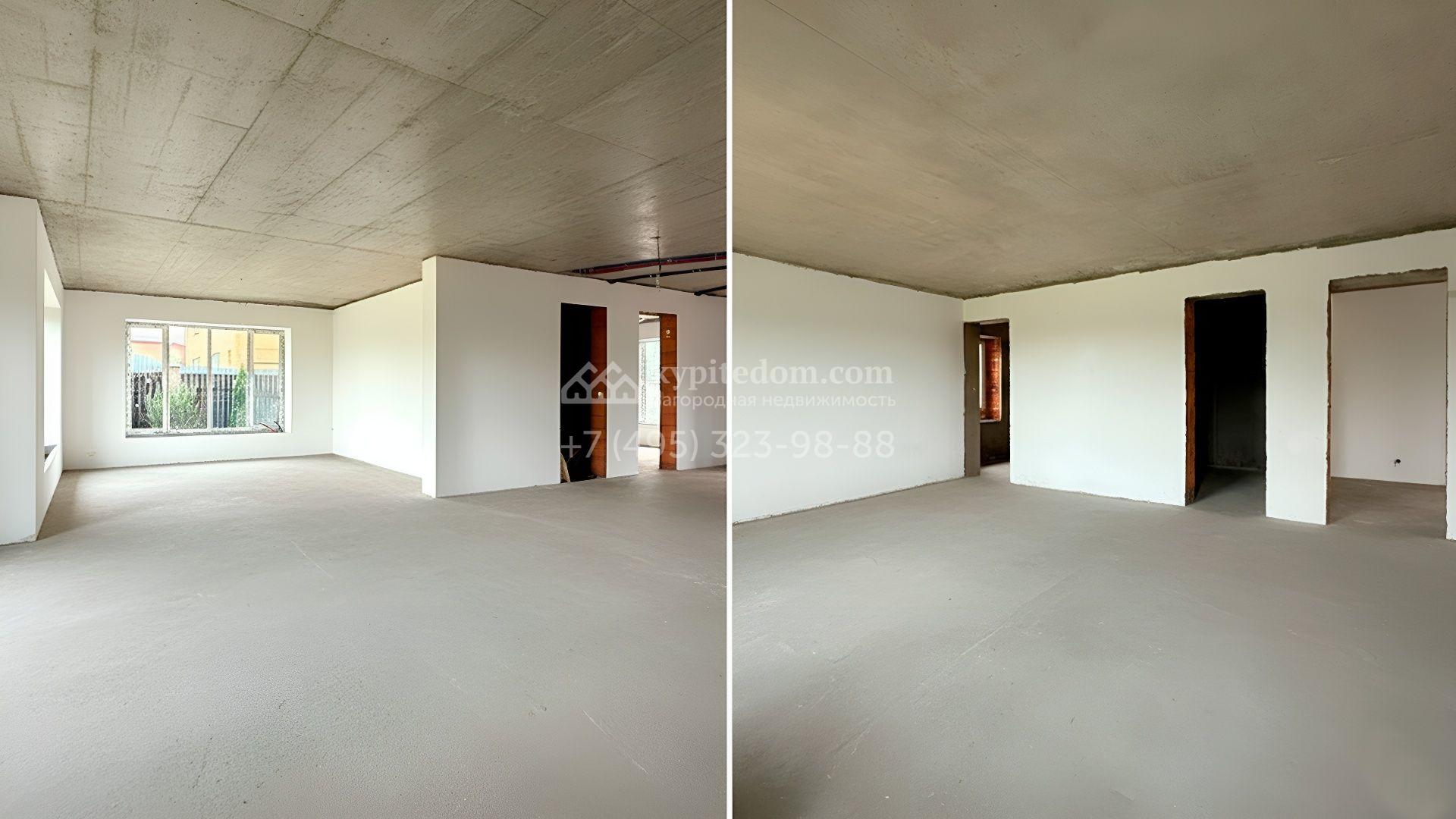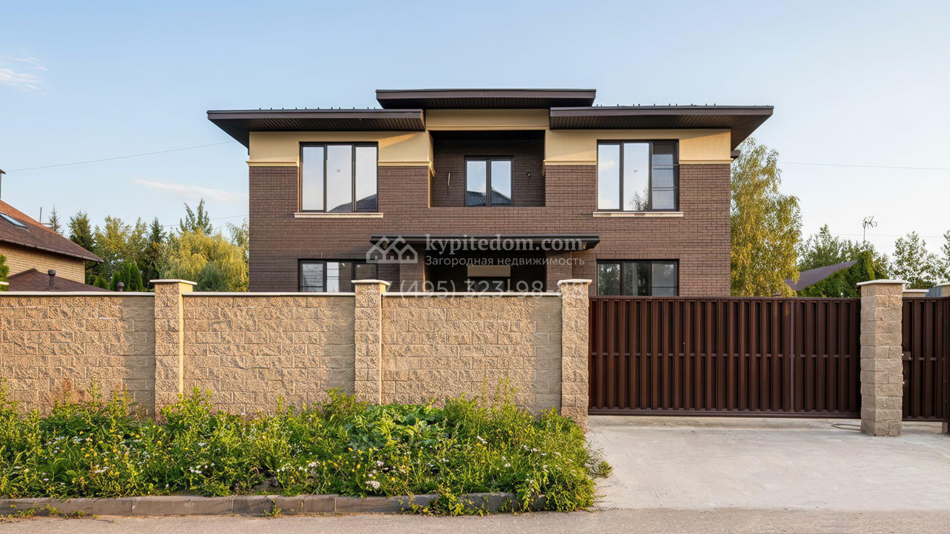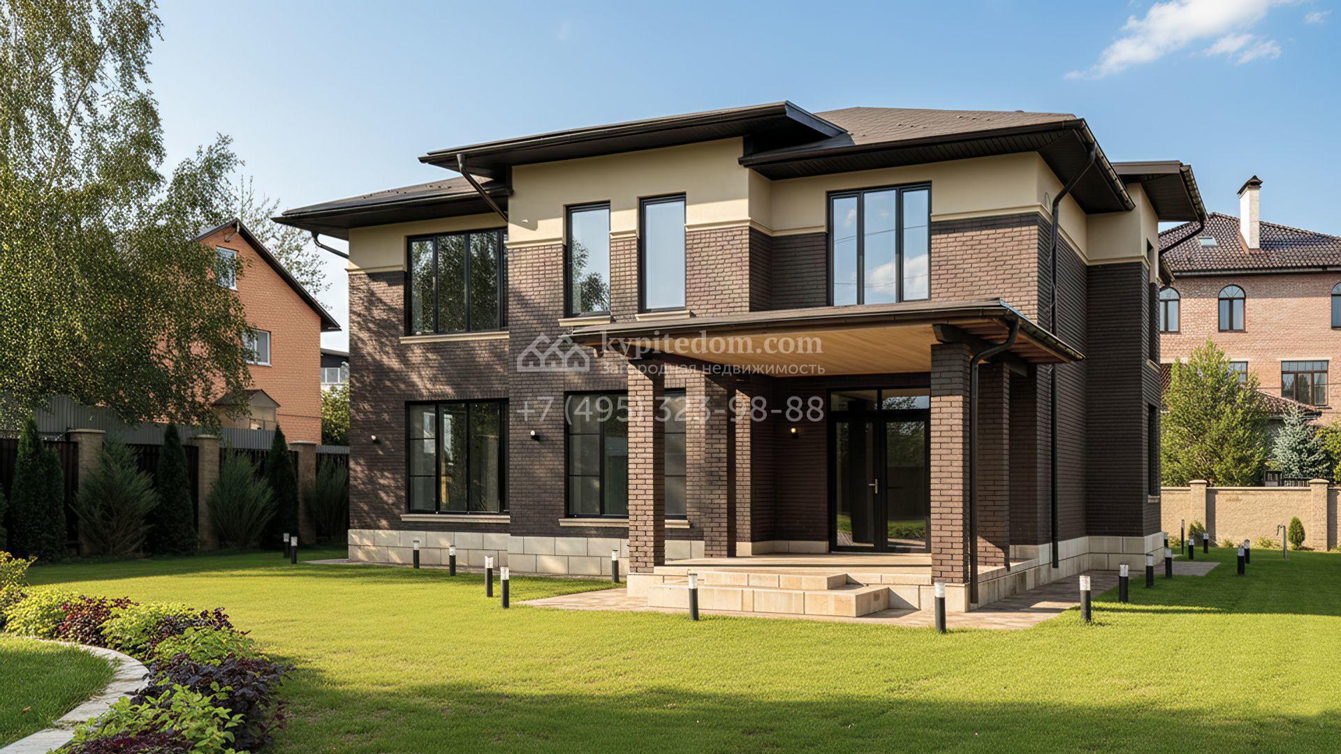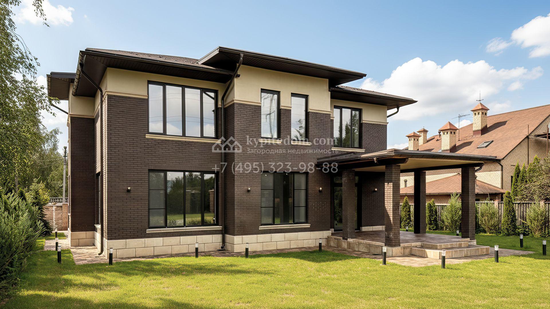 Загородный дом площадью 324 м² построен на полевом участке 10 соток. Фасад здания облицован коричневым клинкерным кирпичом. Резиденция с отделкой whitebox подходит для реализации индивидуального дизайн-проекта. Планировка коттеджа включает 4 спальни, гостиную, кухню и столовую. На участке можно выполнить ландшафтный дизайн, обустроить беседку с зоной барбекю.