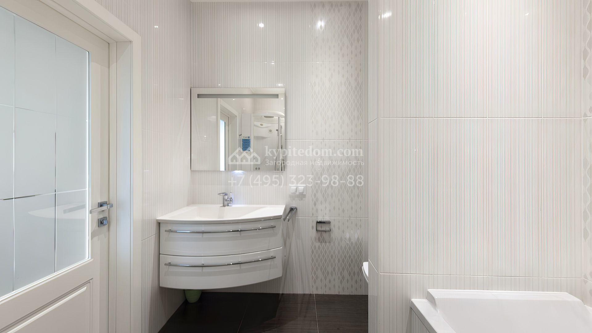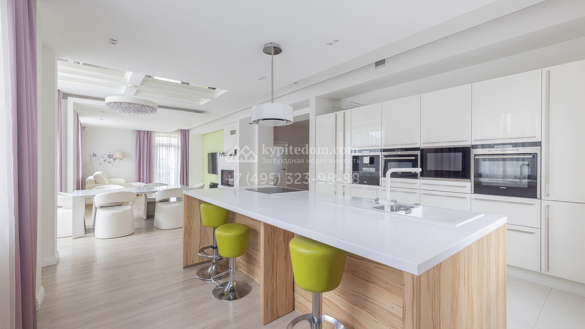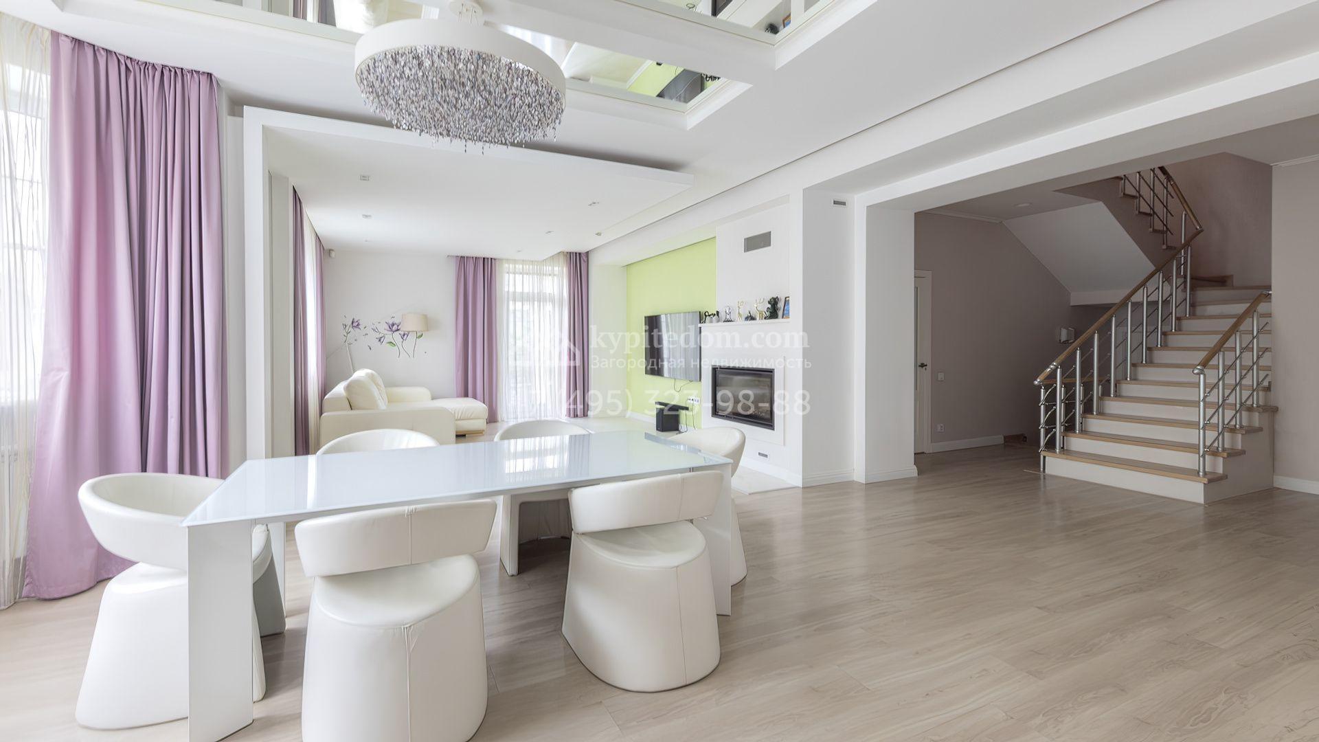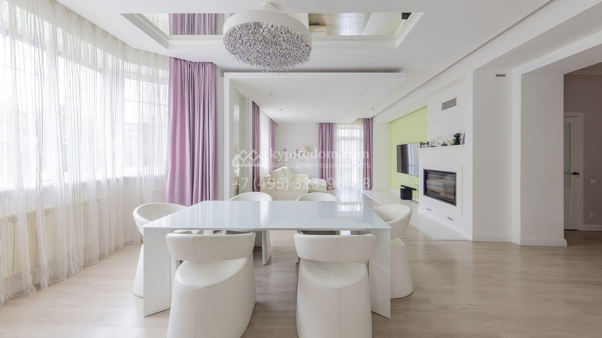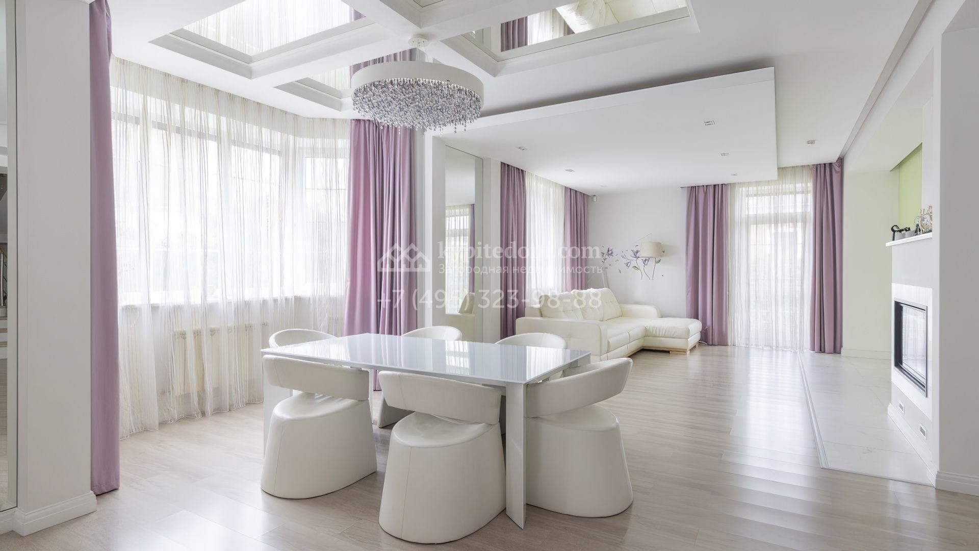 Загородный дом площадью 447 м² построен на участке 12,1 сотки. Интерьер в современном стиле оформлен в светлых оттенках, визуально создающих ощущение простора. В резиденции разместили 4 спальни, гостиную с камином, переходящую в столовую и кухню, кабинет, комнату отдыха, домашний кинотеатр и бильярдную. На цокольном этаже расположена SPA-зона с бассейном и сауной. В контуре дома предусмотрен гараж.