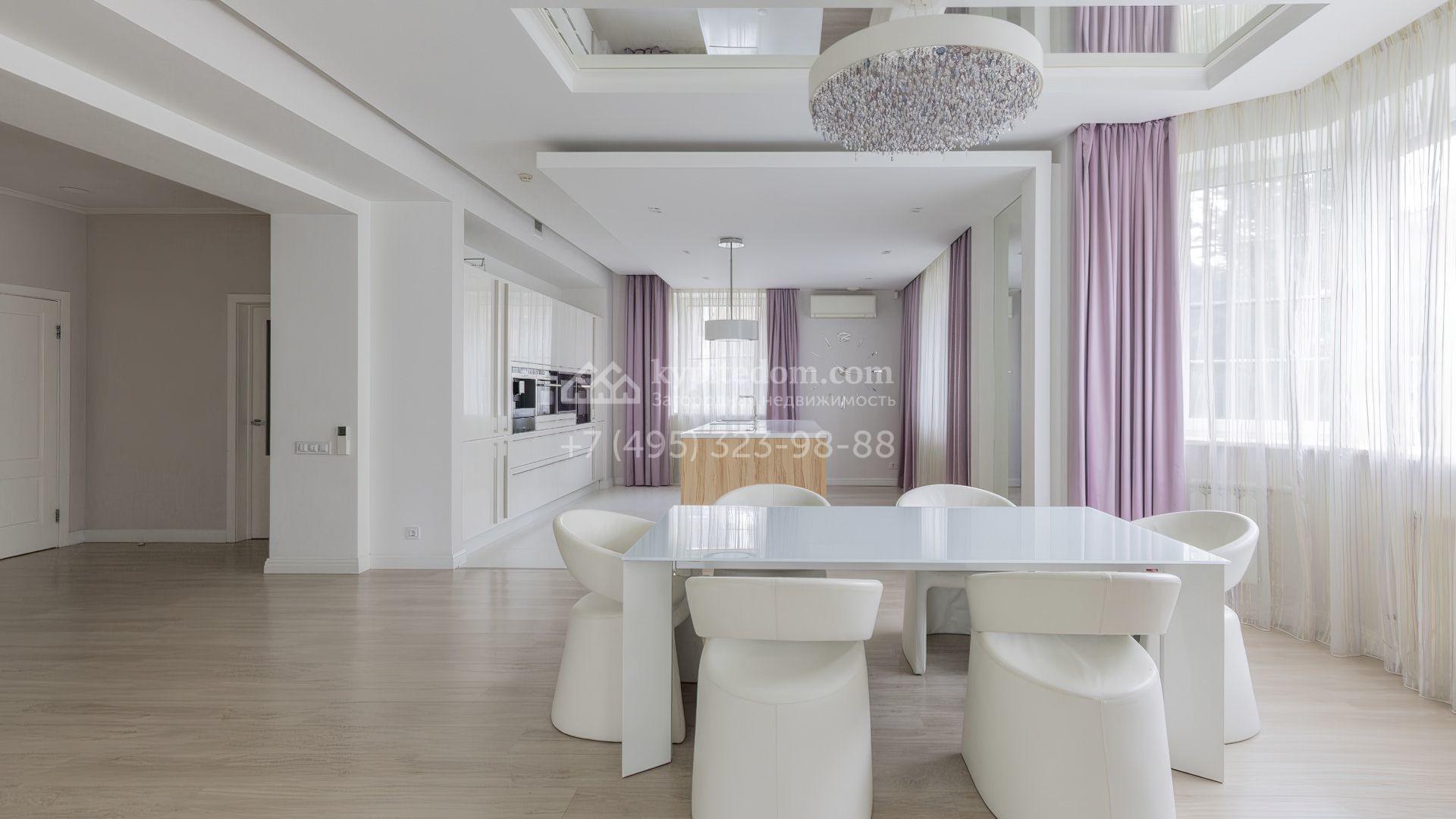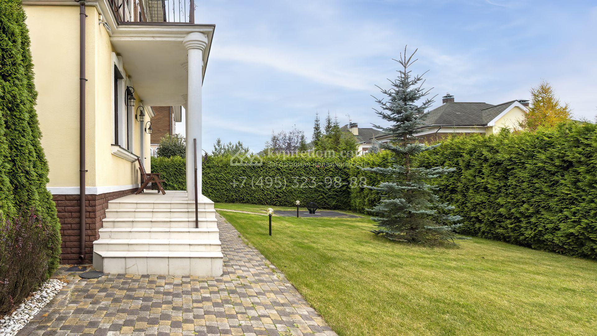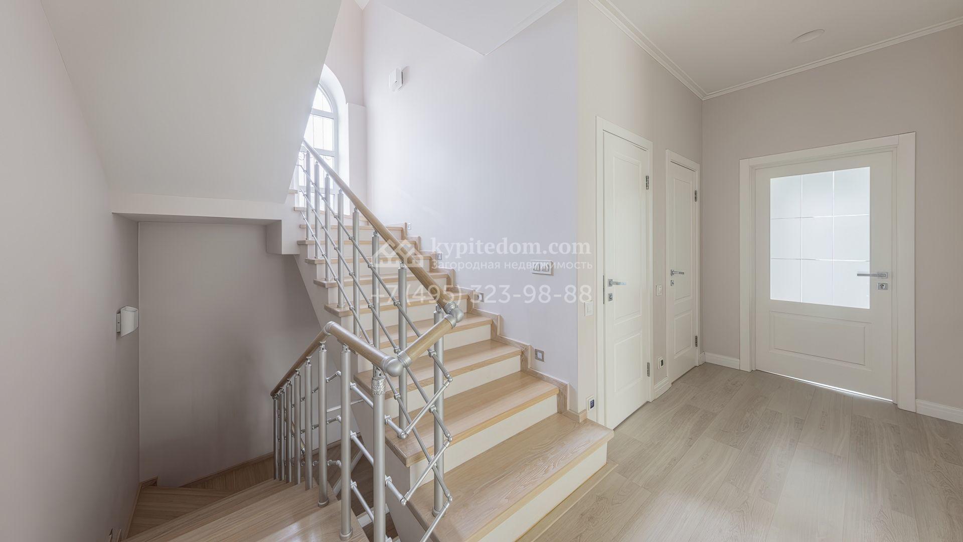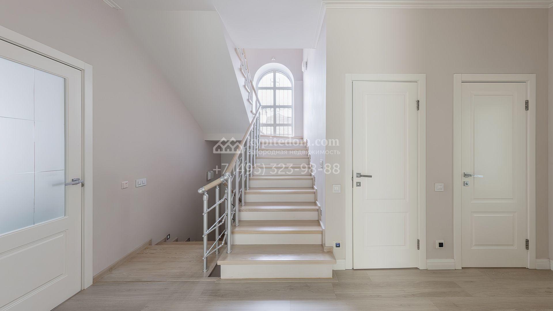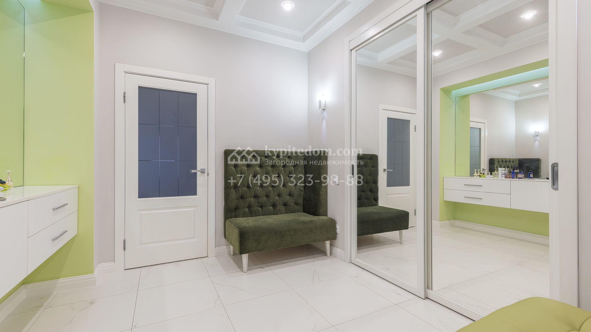 Загородный дом площадью 447 м² построен на участке 12,1 сотки. Интерьер в современном стиле оформлен в светлых оттенках, визуально создающих ощущение простора. В резиденции разместили 4 спальни, гостиную с камином, переходящую в столовую и кухню, кабинет, комнату отдыха, домашний кинотеатр и бильярдную. На цокольном этаже расположена SPA-зона с бассейном и сауной. В контуре дома предусмотрен гараж.