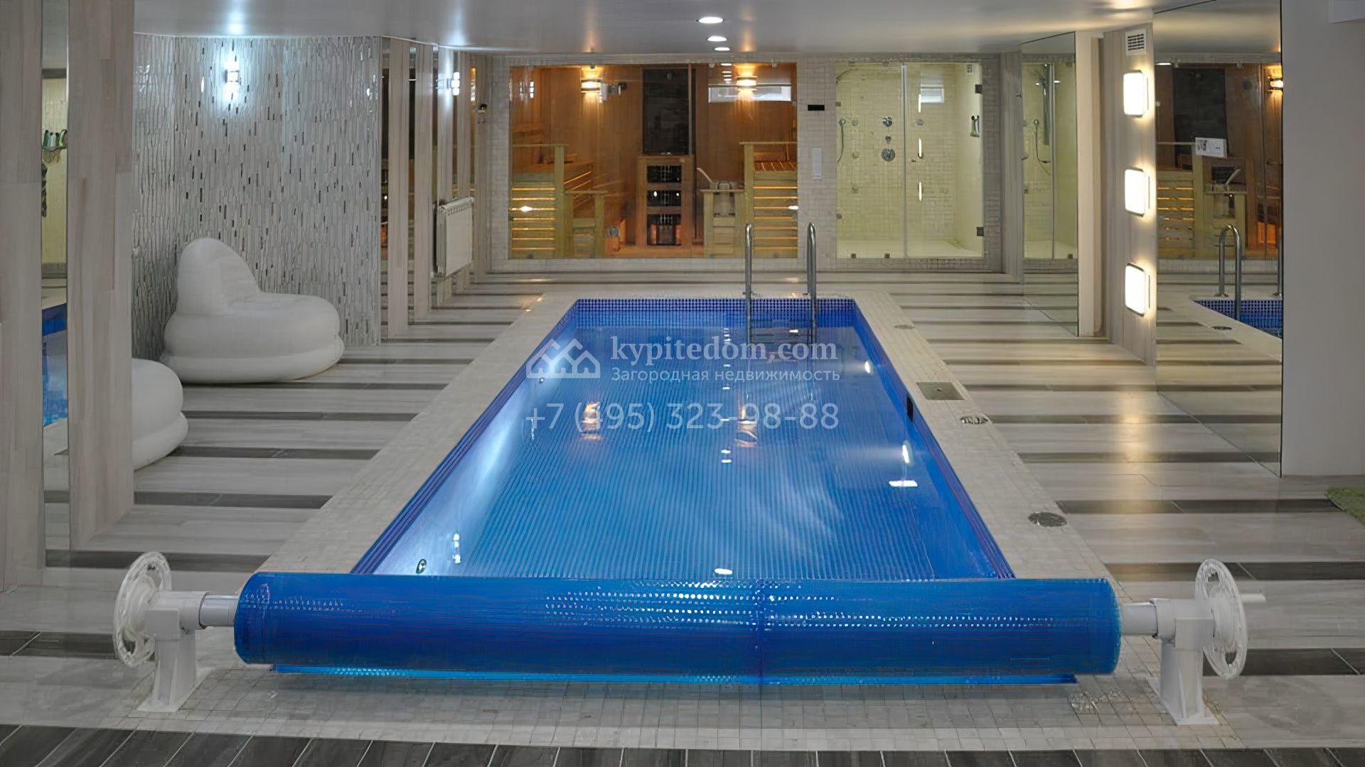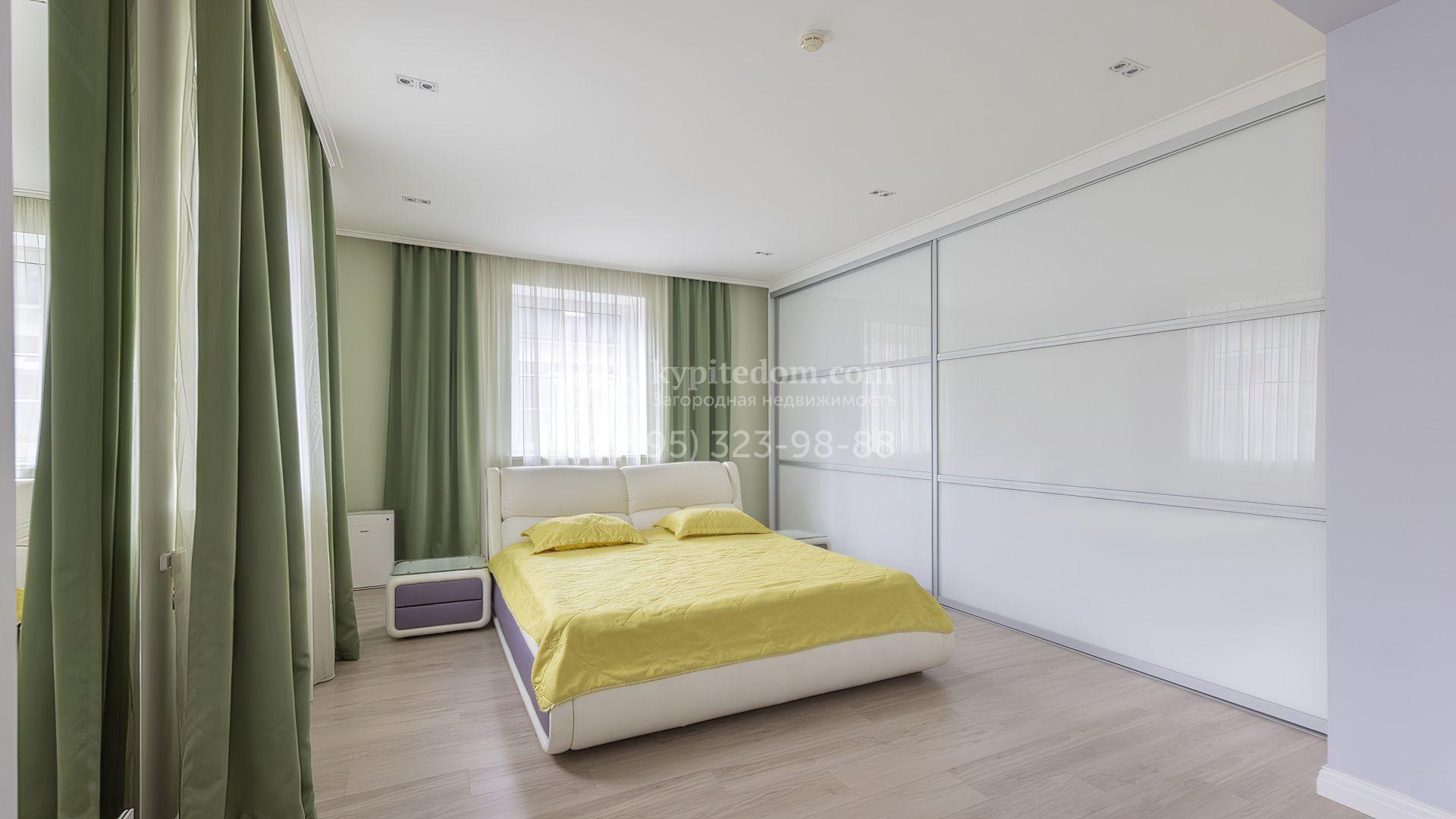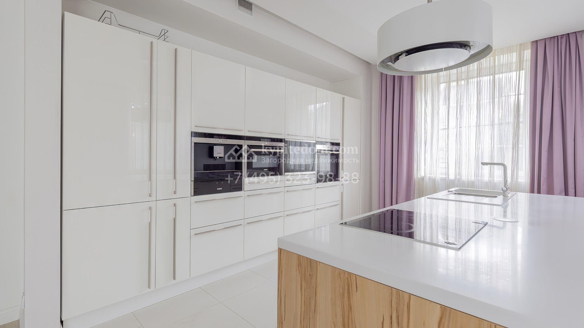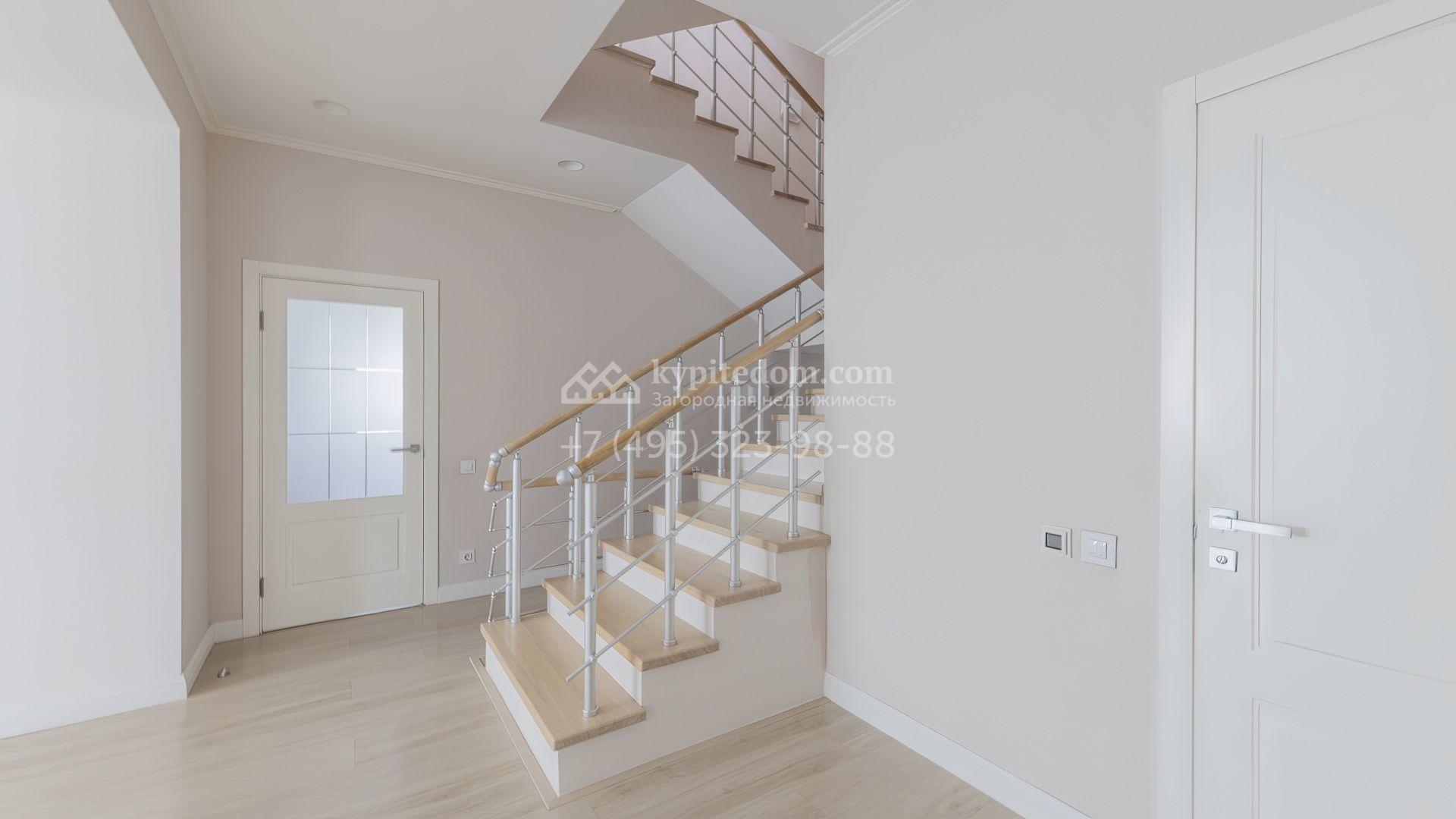 Загородный дом площадью 447 м² построен на участке 12,1 сотки. Интерьер в современном стиле оформлен в светлых оттенках, визуально создающих ощущение простора. В резиденции разместили 4 спальни, гостиную с камином, переходящую в столовую и кухню, кабинет, комнату отдыха, домашний кинотеатр и бильярдную. На цокольном этаже расположена SPA-зона с бассейном и сауной. В контуре дома предусмотрен гараж.
