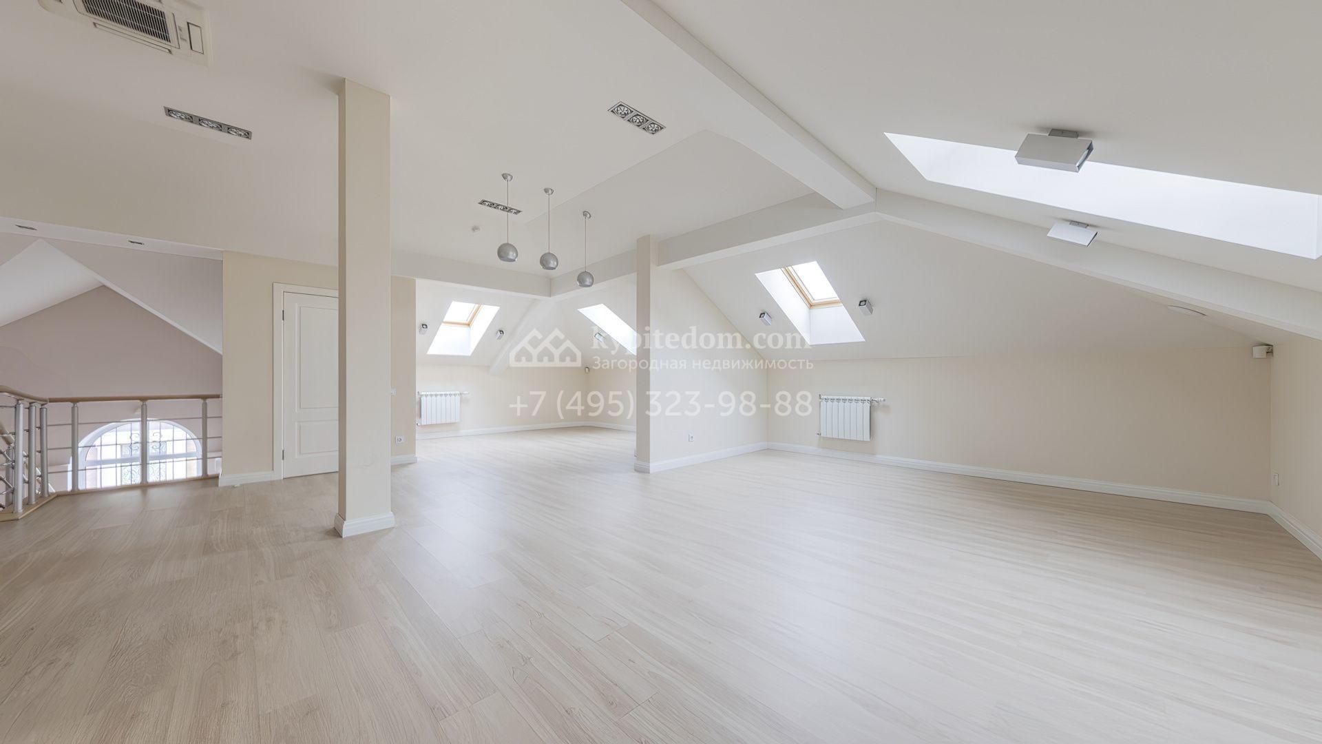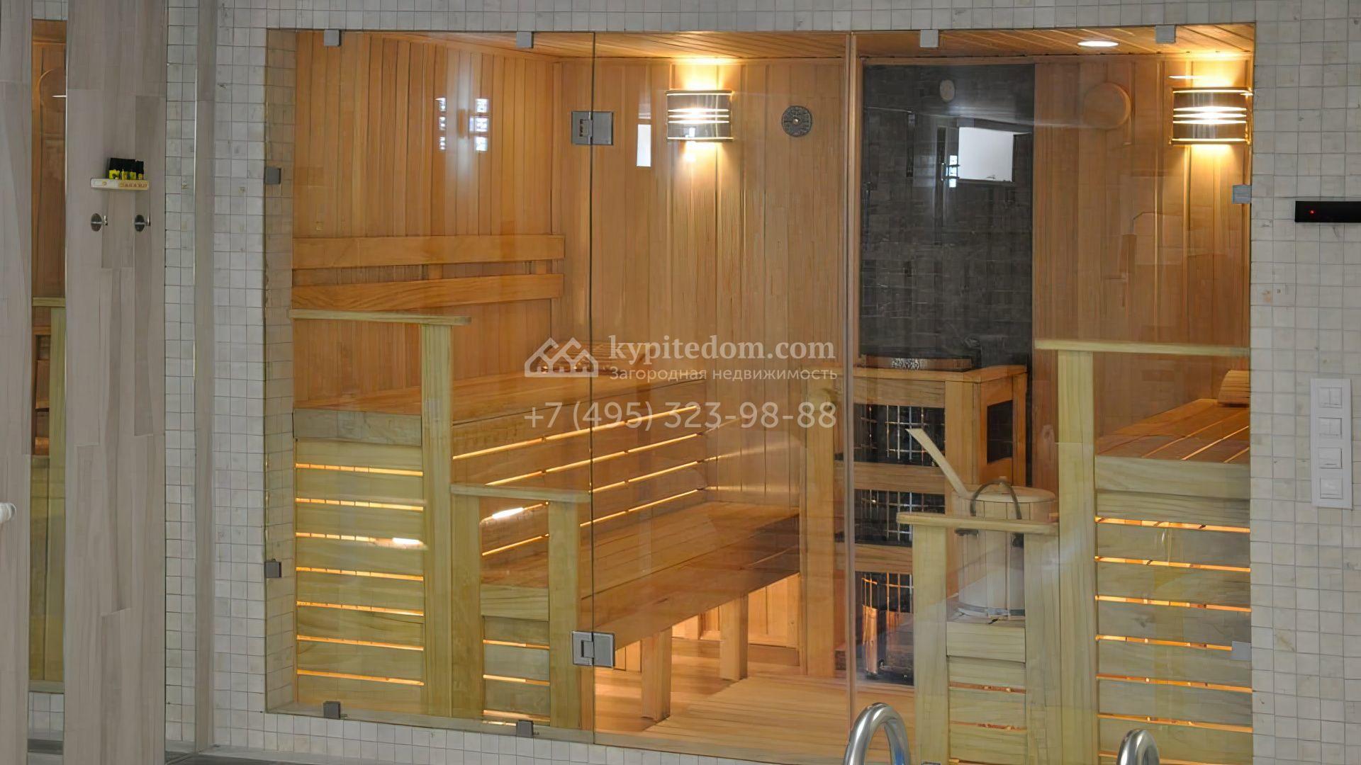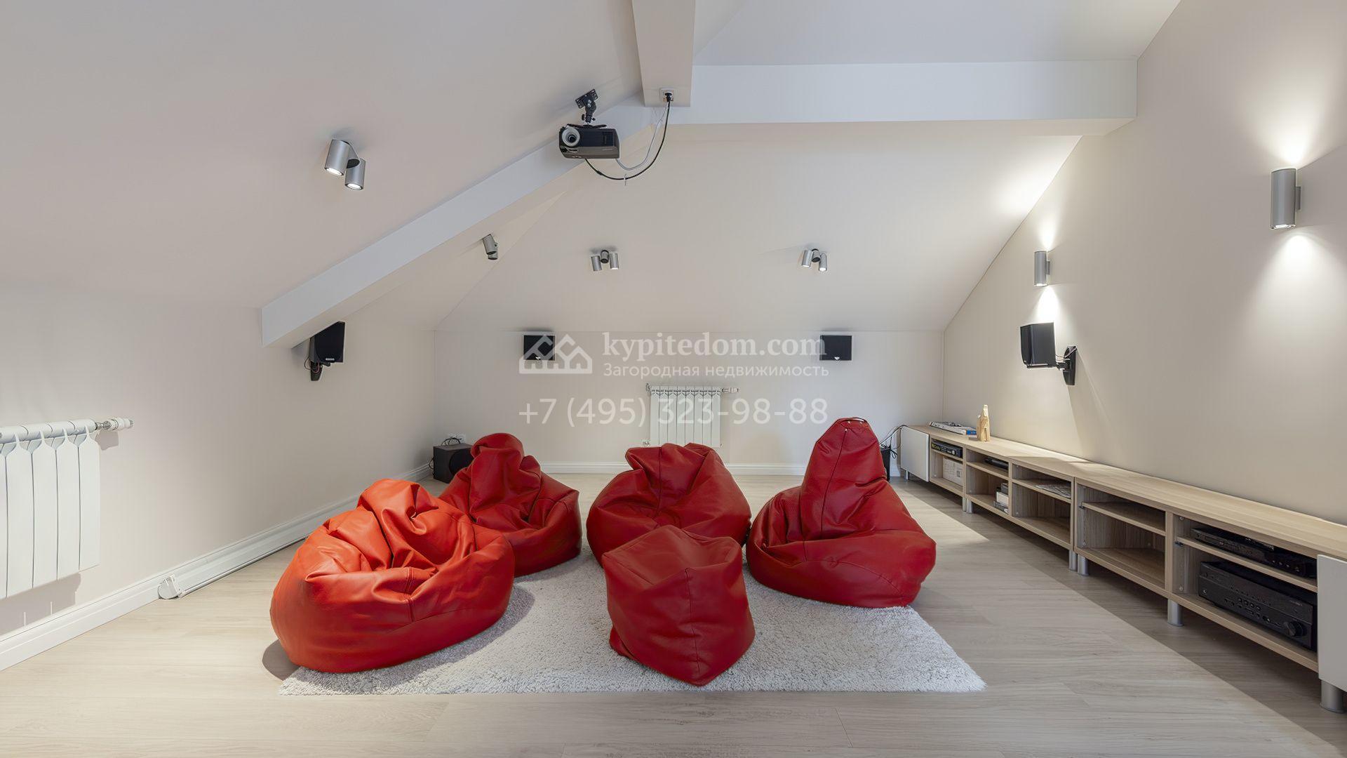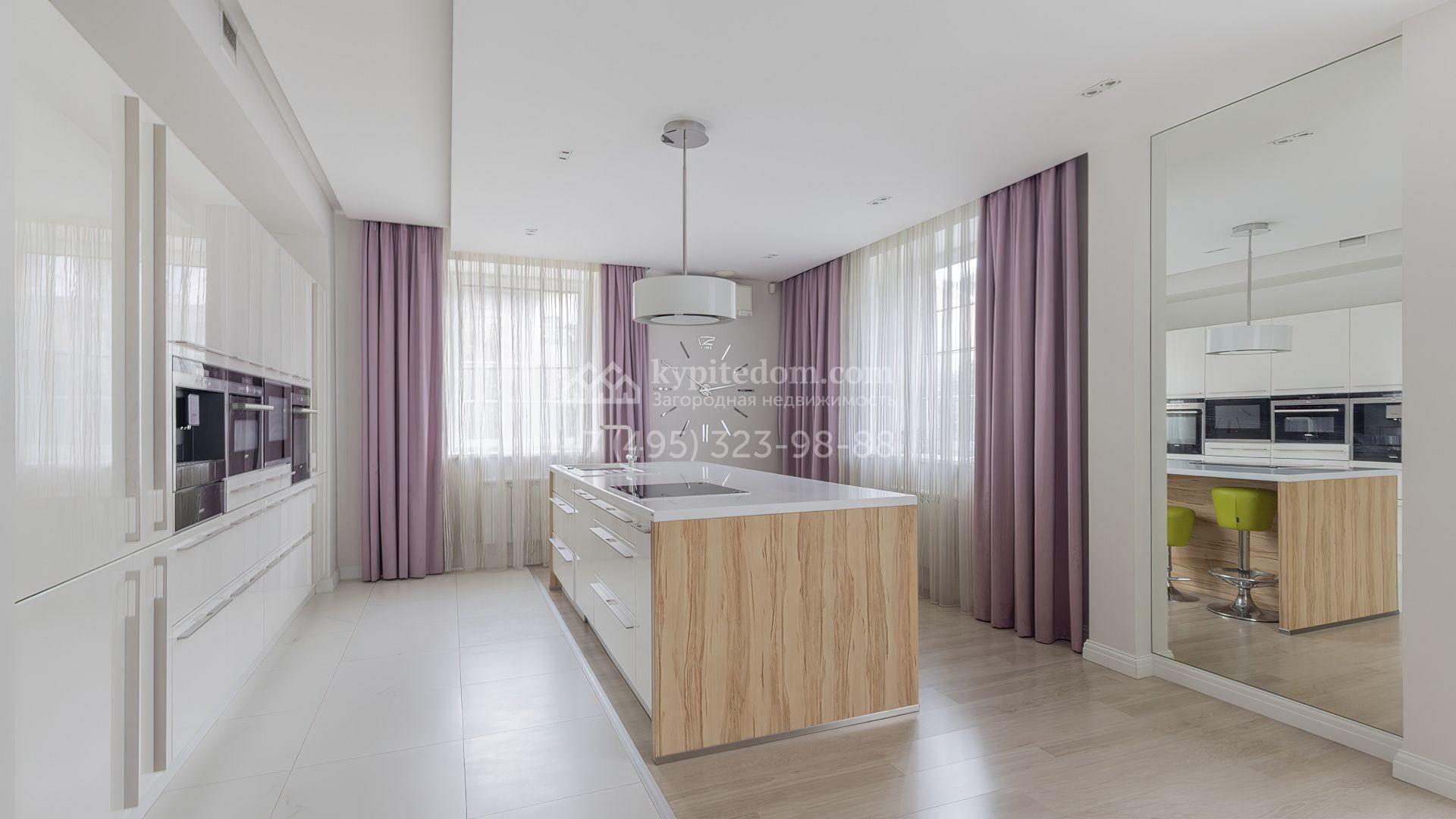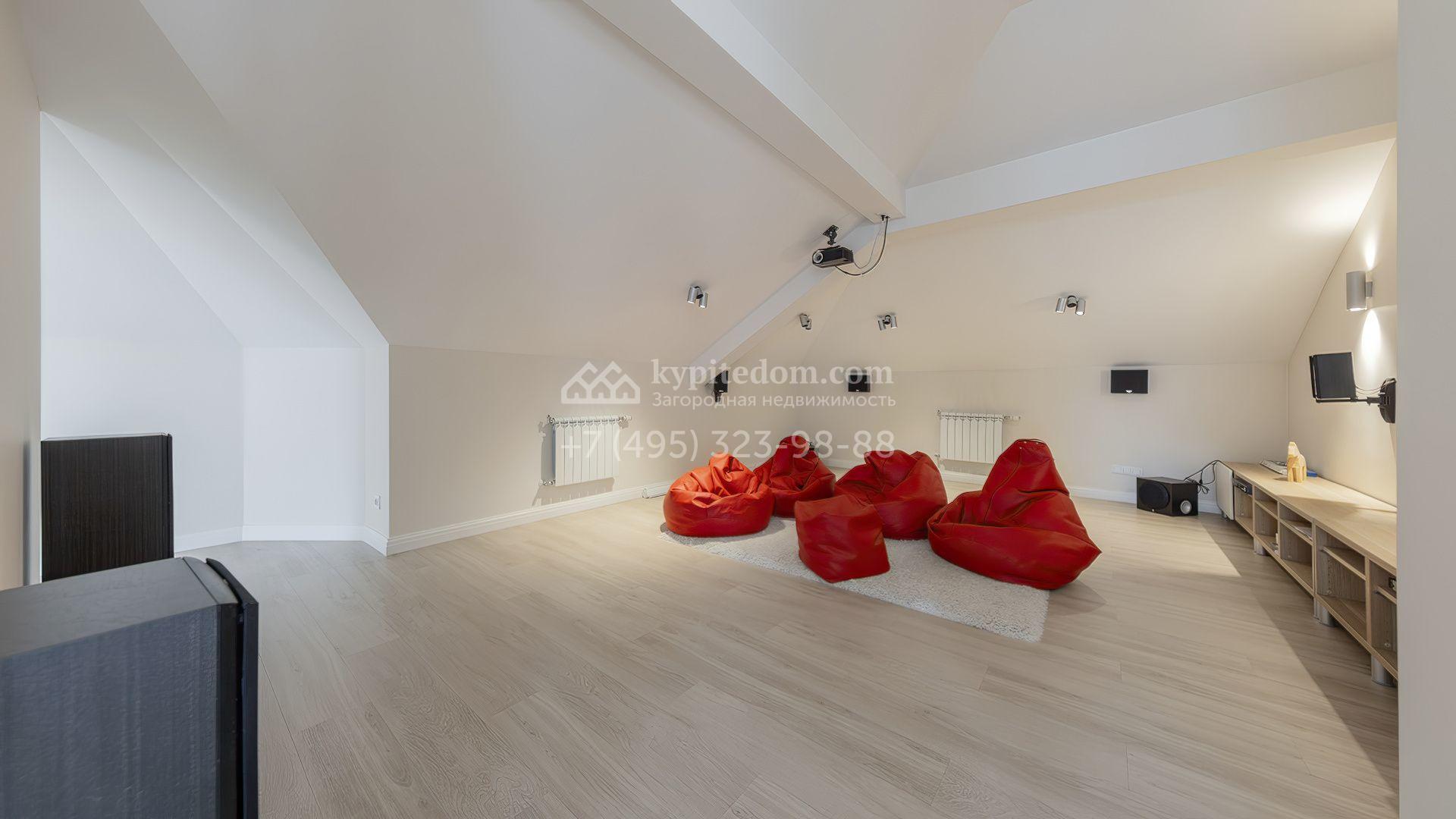Загородный дом площадью 447 м² построен на участке 12,1 сотки. Интерьер в современном стиле оформлен в светлых оттенках, визуально создающих ощущение простора. В резиденции разместили 4 спальни, гостиную с камином, переходящую в столовую и кухню, кабинет, комнату отдыха, домашний кинотеатр и бильярдную. На цокольном этаже расположена SPA-зона с бассейном и сауной. В контуре дома предусмотрен гараж.