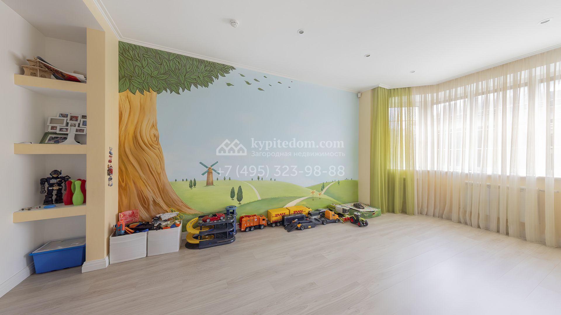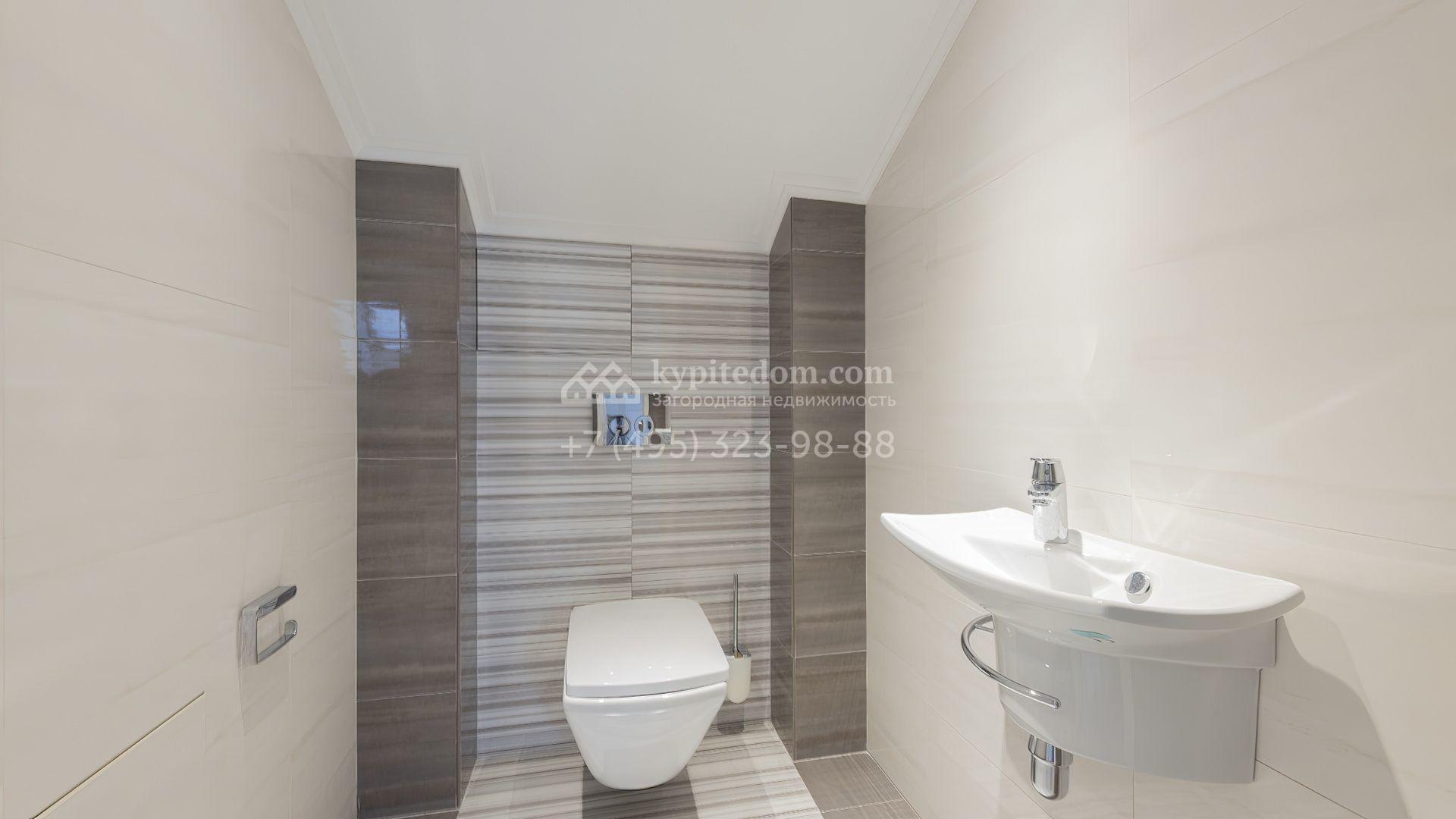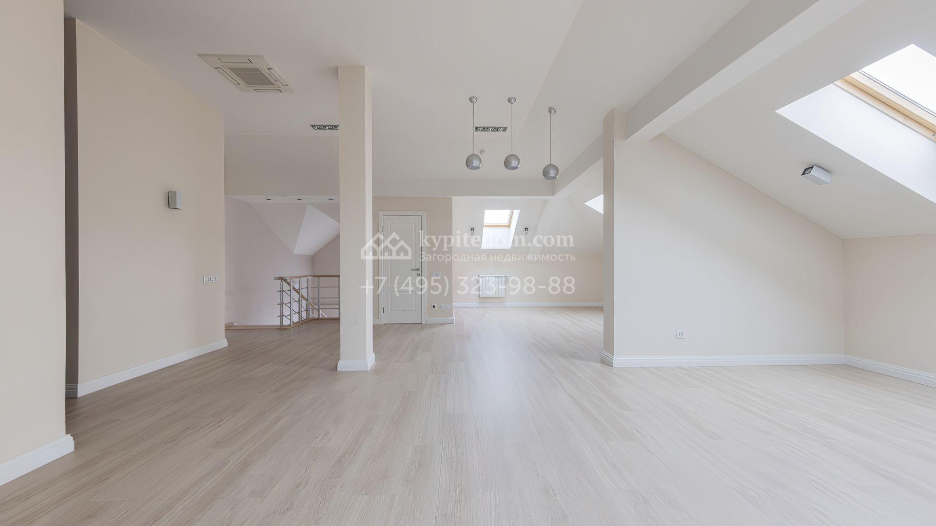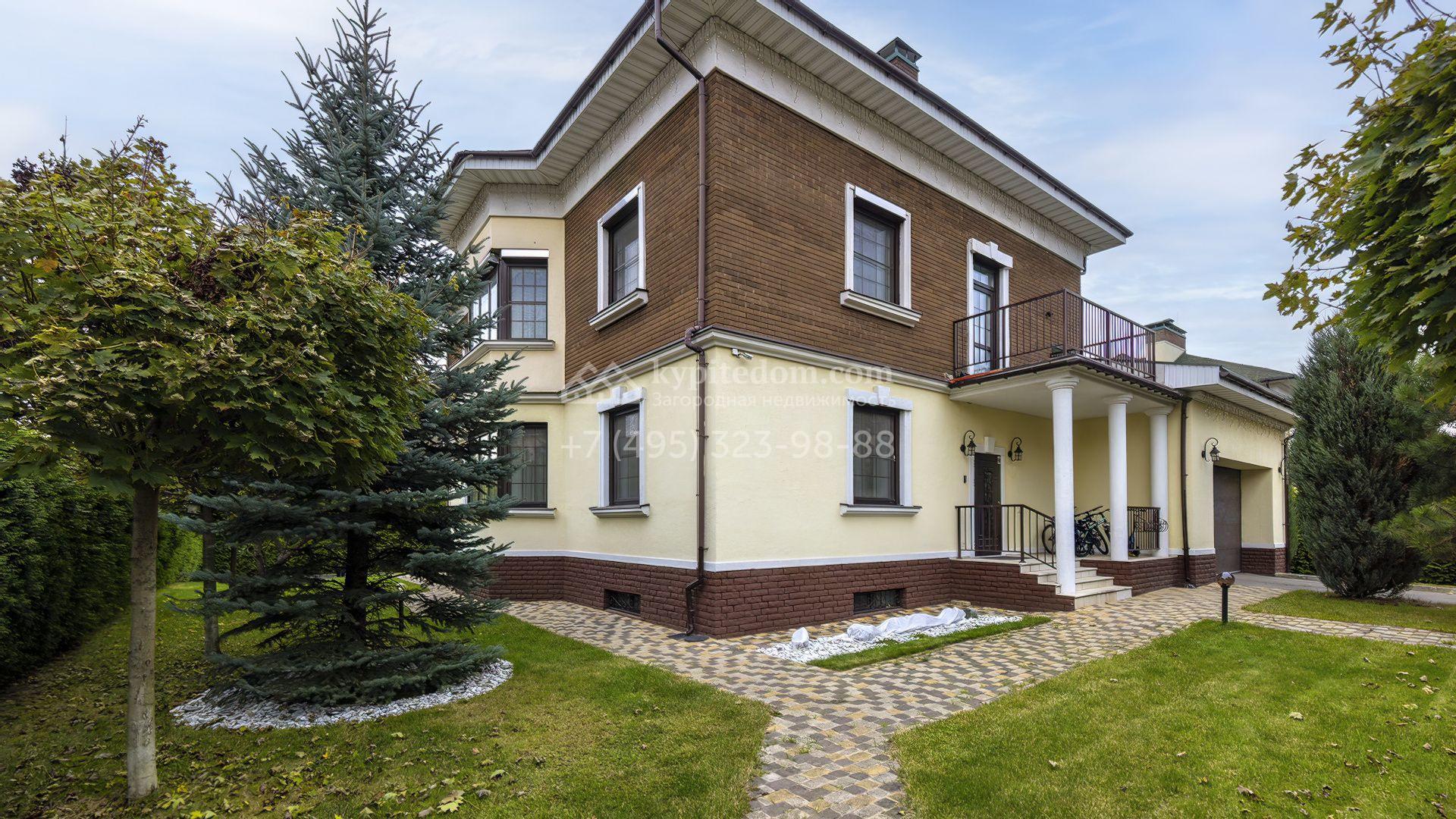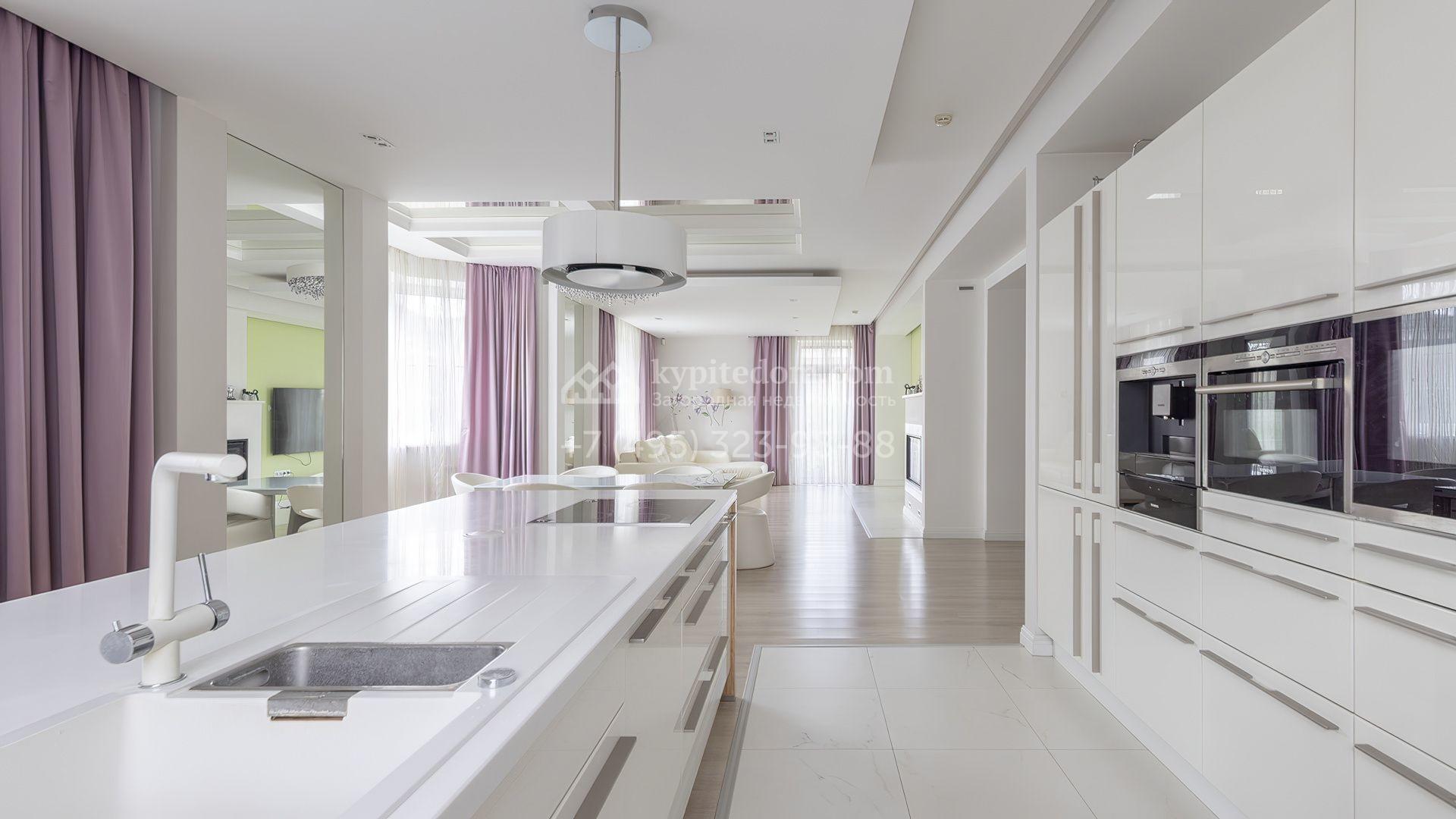 Загородный дом площадью 447 м² построен на участке 12,1 сотки. Интерьер в современном стиле оформлен в светлых оттенках, визуально создающих ощущение простора. В резиденции разместили 4 спальни, гостиную с камином, переходящую в столовую и кухню, кабинет, комнату отдыха, домашний кинотеатр и бильярдную. На цокольном этаже расположена SPA-зона с бассейном и сауной. В контуре дома предусмотрен гараж.