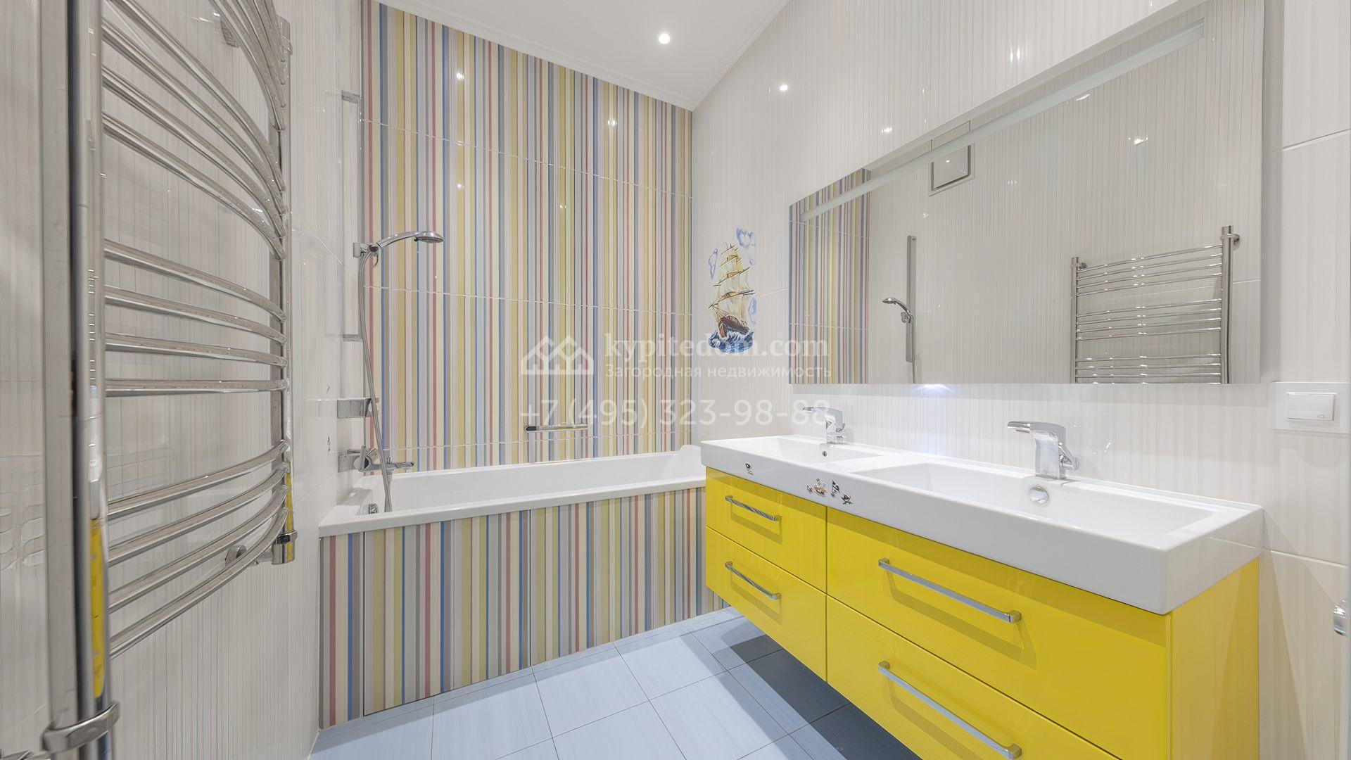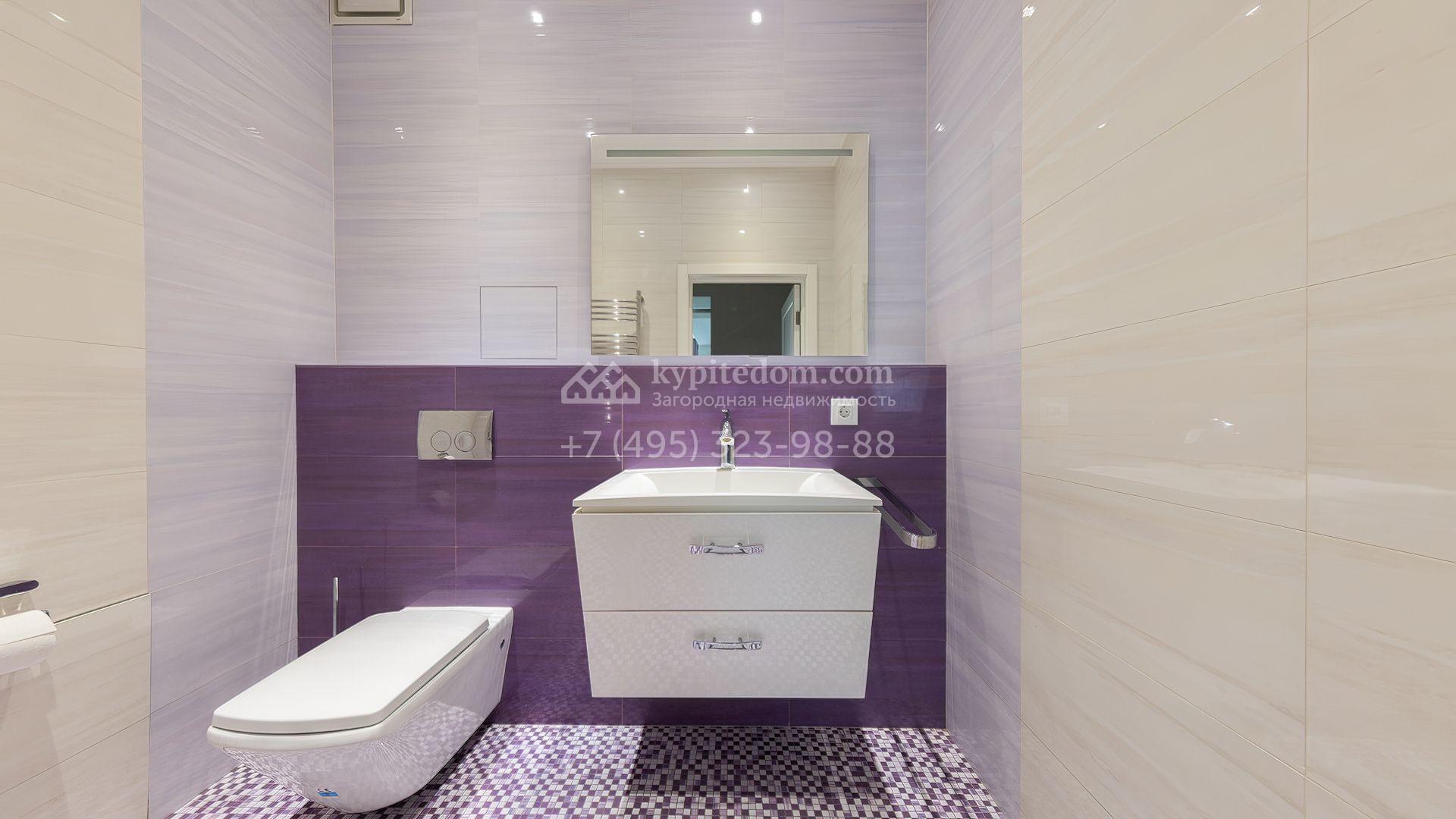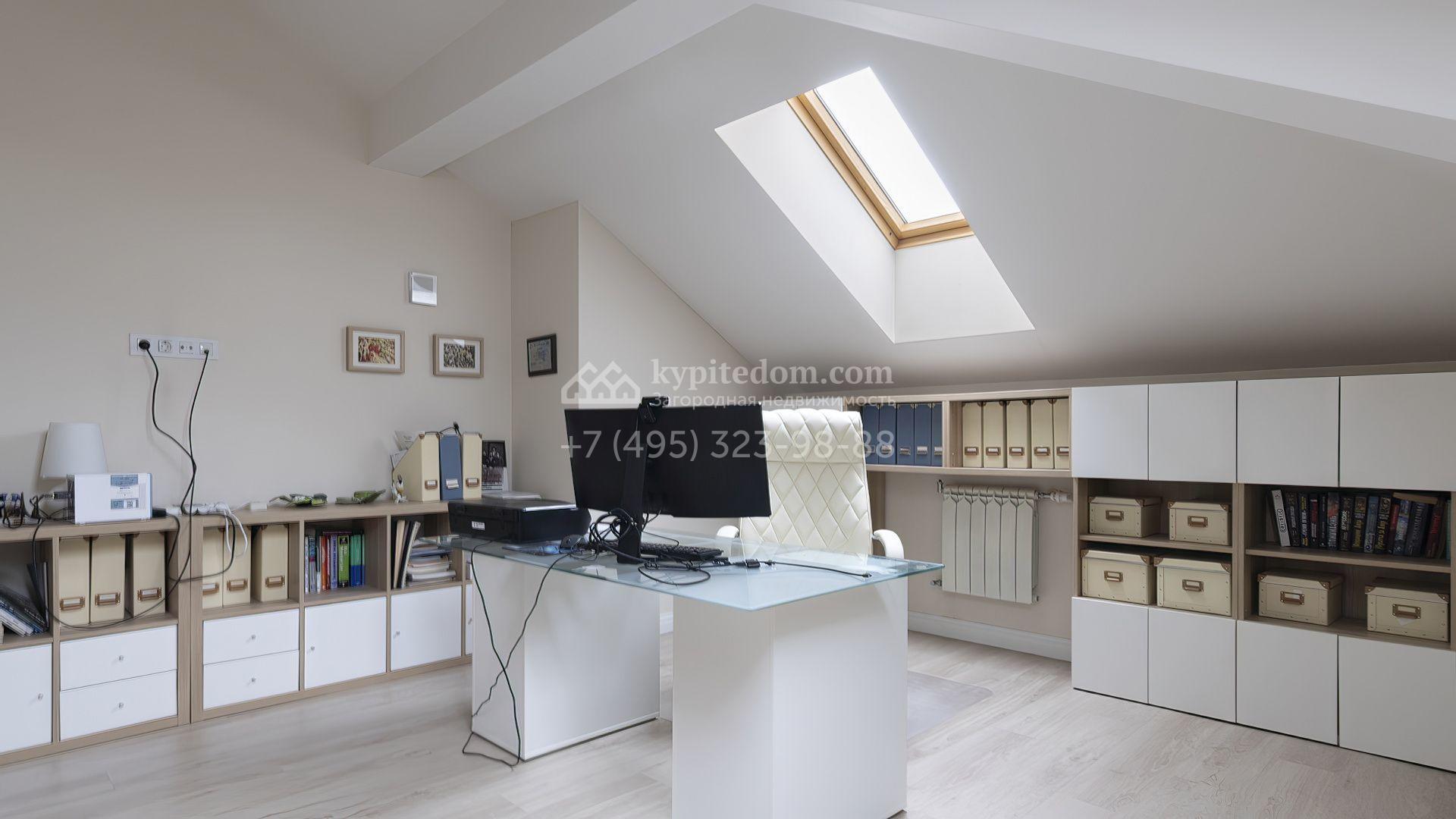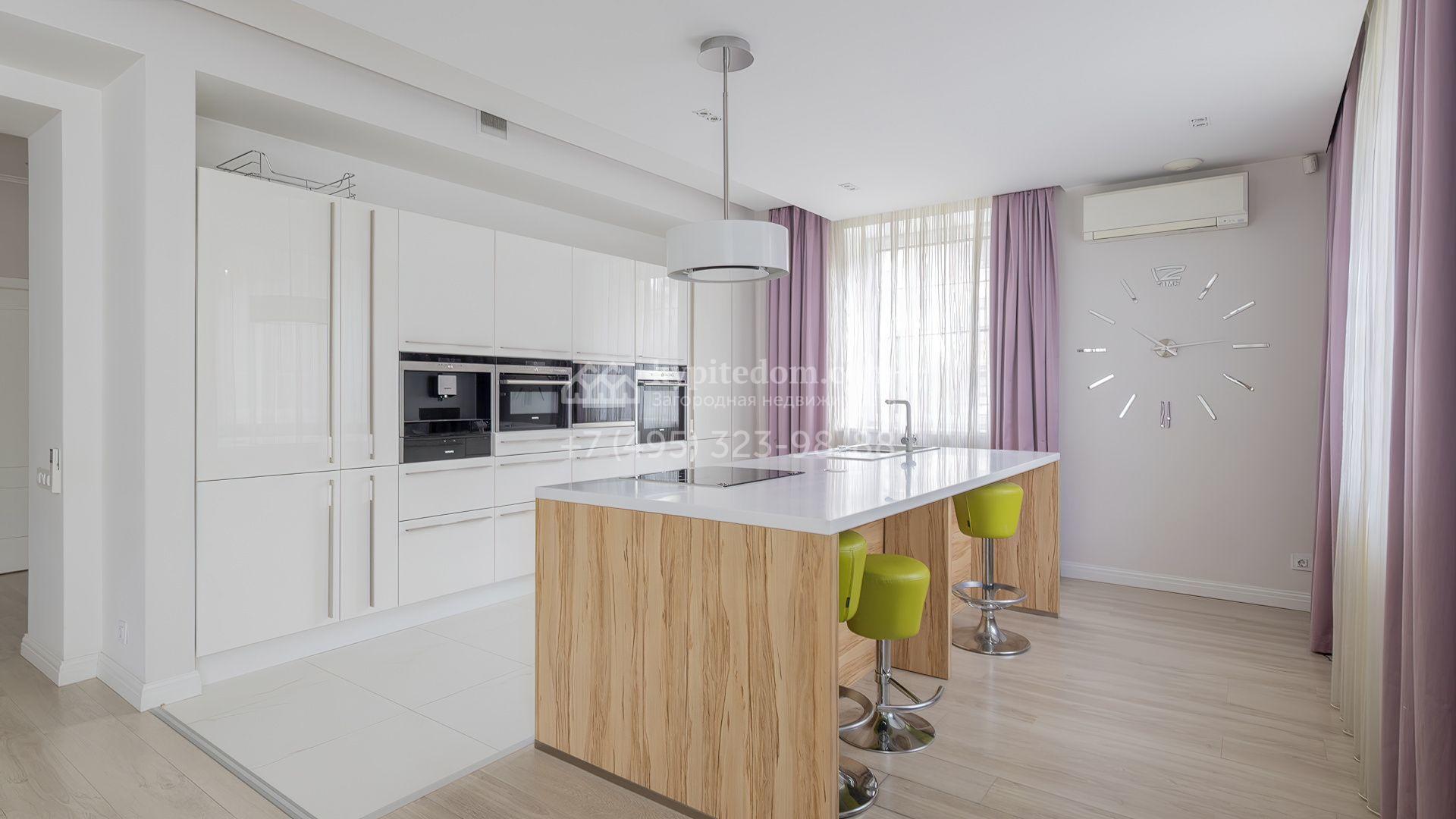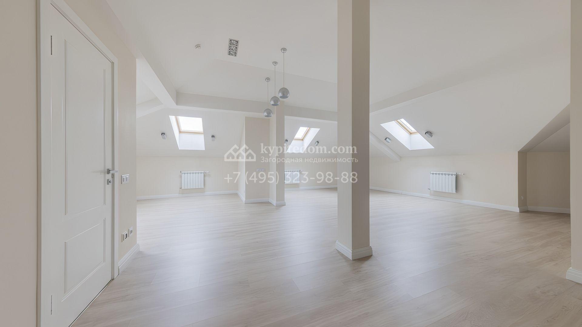 Загородный дом площадью 447 м² построен на участке 12,1 сотки. Интерьер в современном стиле оформлен в светлых оттенках, визуально создающих ощущение простора. В резиденции разместили 4 спальни, гостиную с камином, переходящую в столовую и кухню, кабинет, комнату отдыха, домашний кинотеатр и бильярдную. На цокольном этаже расположена SPA-зона с бассейном и сауной. В контуре дома предусмотрен гараж.