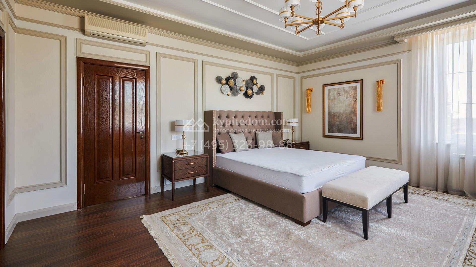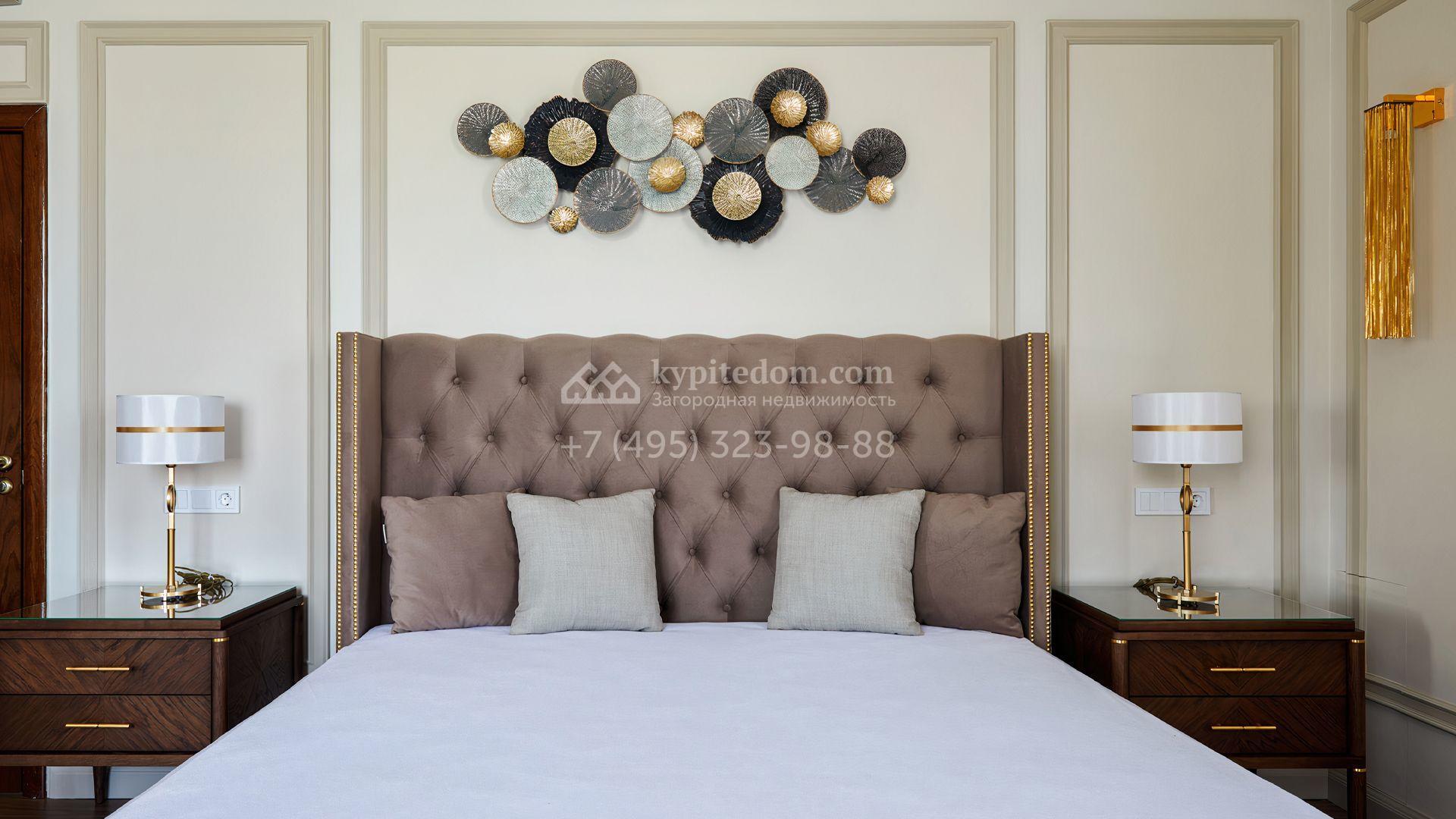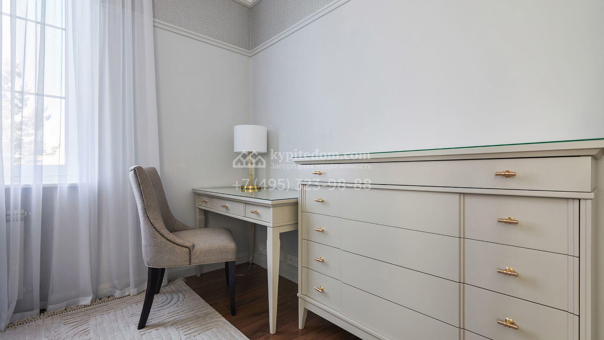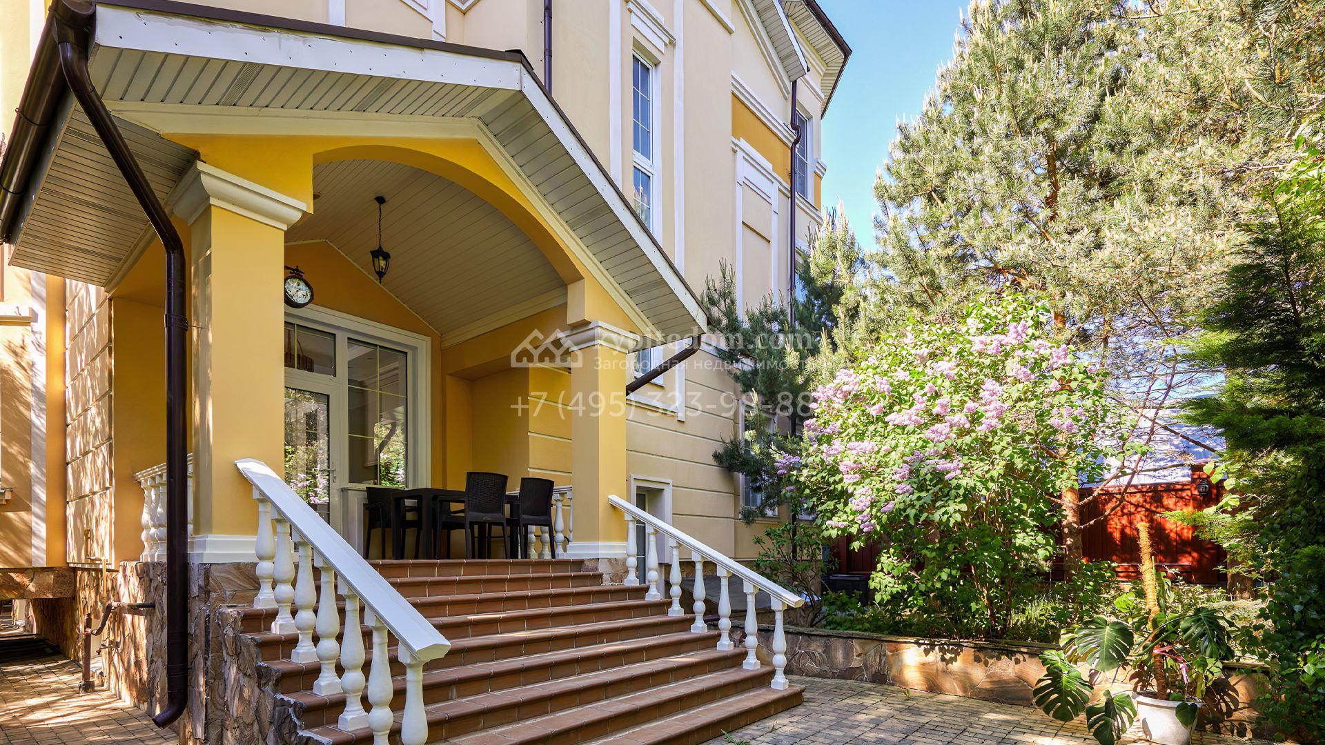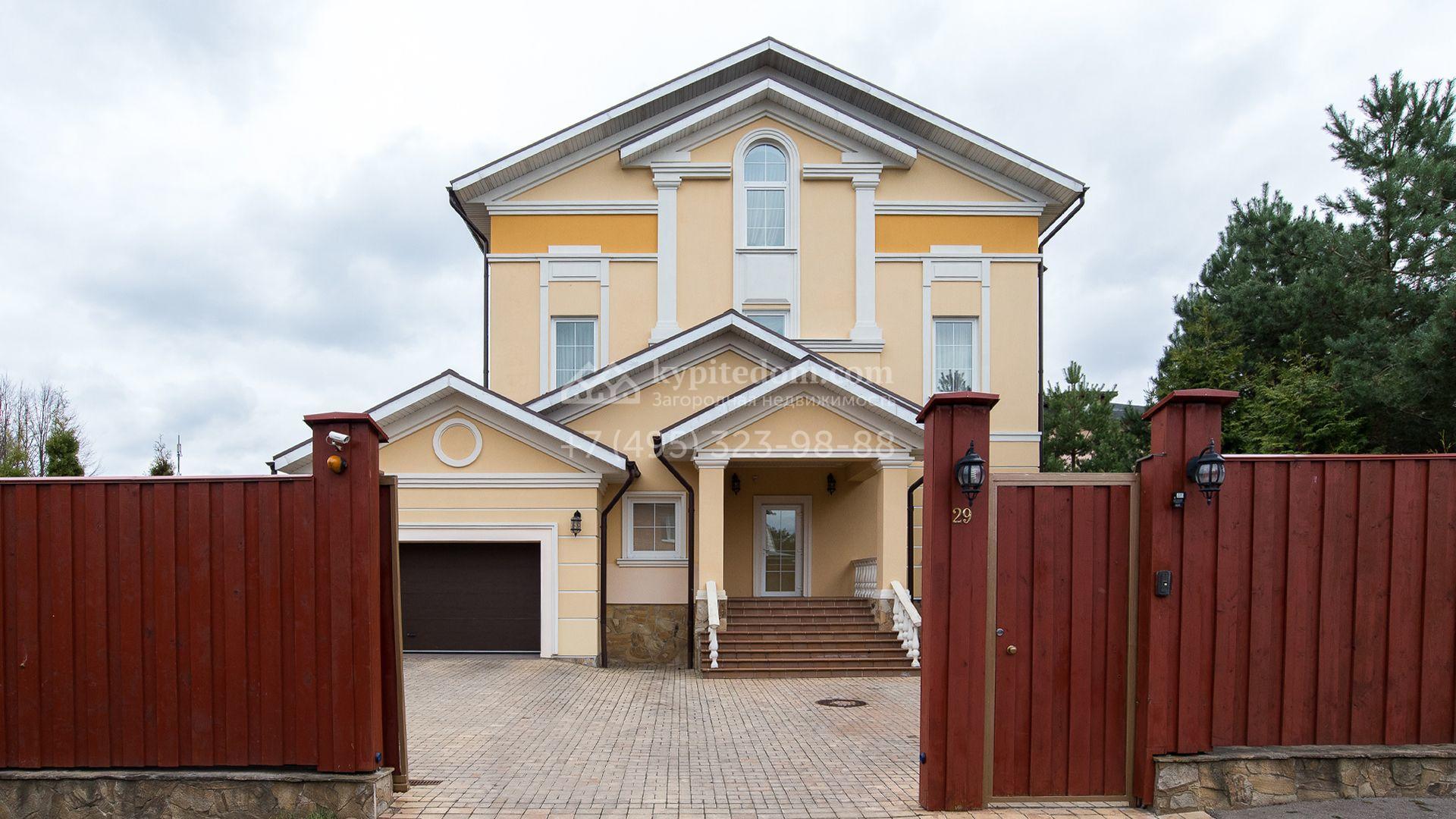 Загородная резиденция площадью 418 м² построена на полевом участке 12 соток. Фасад здания выполнен в неоклассическом стиле и облицован желто-бежевой штукатуркой, декорирован белыми наличниками, карнизами и полуколоннами. В отделке светлого интерьера преобладают теплые оттенки в сочетании с фактурой дерева и камня. Планировка дома включает 4 спальни, уютную гостиную с камином, кухню-столовую, кабинет, спортзал, кинотеатр и спа-зону с бассейном и сауной. В контуре коттеджа предусмотрен гараж на 1 машину. На участке выполнен ландшафтный дизайн, вымощены площадки и обустроена зона барбекю.