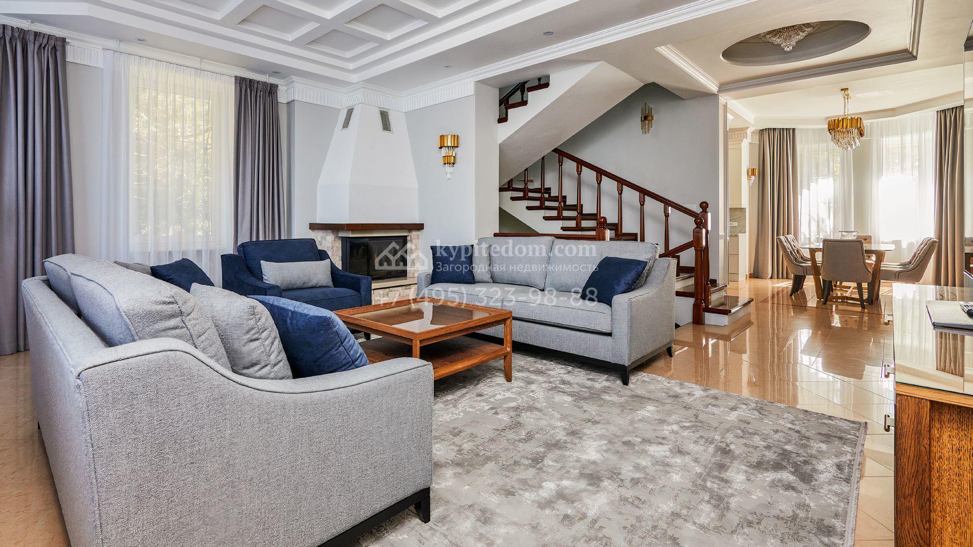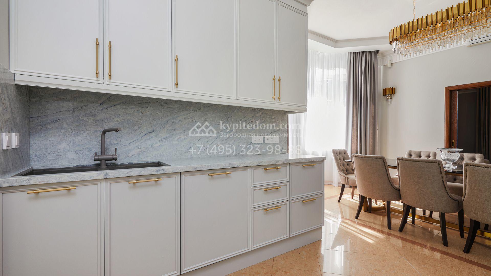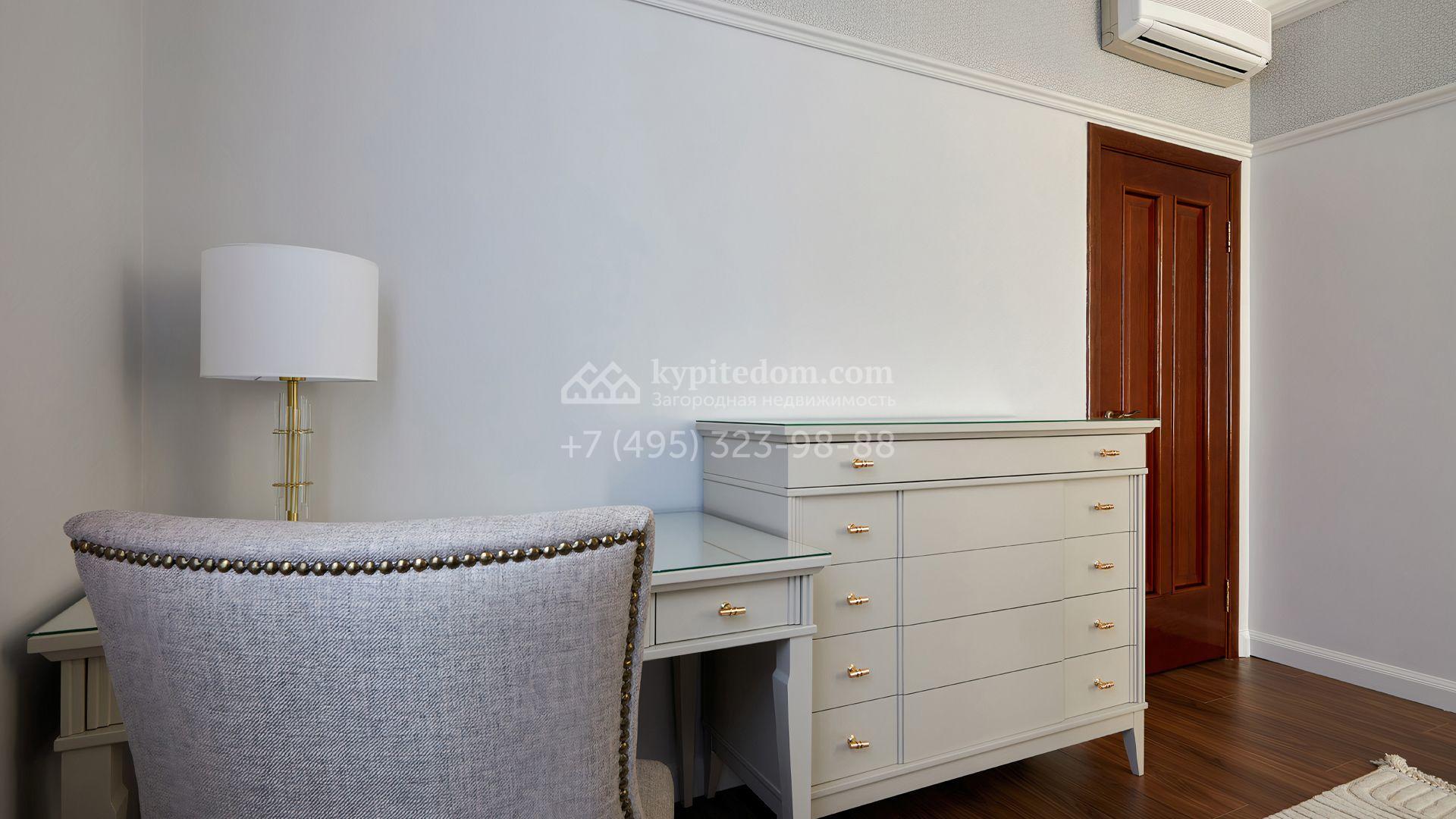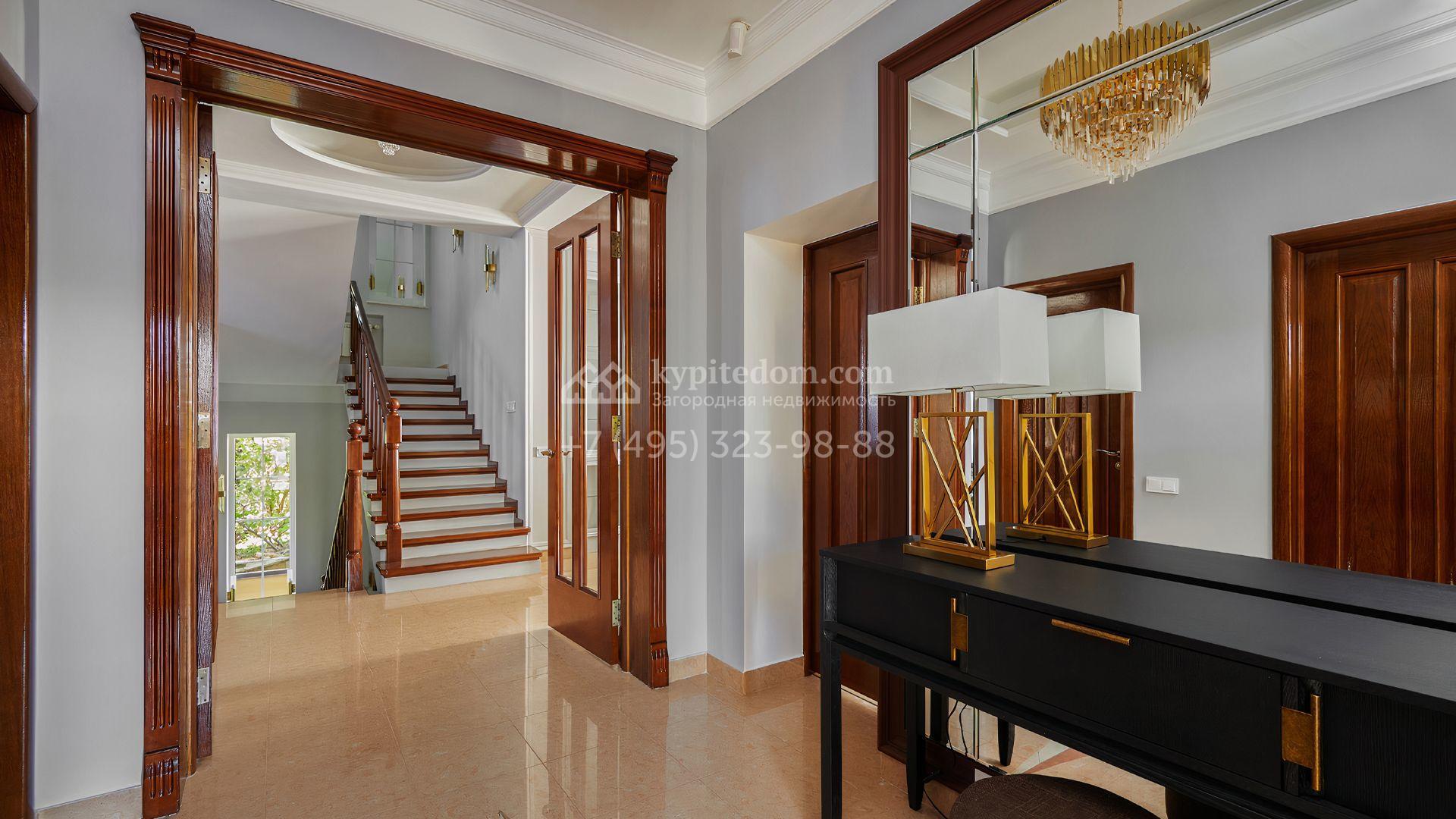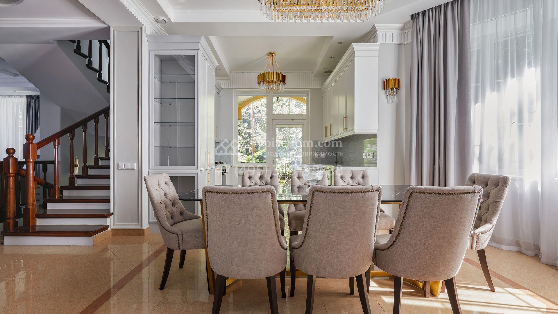 Загородная резиденция площадью 418 м² построена на полевом участке 12 соток. Фасад здания выполнен в неоклассическом стиле и облицован желто-бежевой штукатуркой, декорирован белыми наличниками, карнизами и полуколоннами. В отделке светлого интерьера преобладают теплые оттенки в сочетании с фактурой дерева и камня. Планировка дома включает 4 спальни, уютную гостиную с камином, кухню-столовую, кабинет, спортзал, кинотеатр и спа-зону с бассейном и сауной. В контуре коттеджа предусмотрен гараж на 1 машину. На участке выполнен ландшафтный дизайн, вымощены площадки и обустроена зона барбекю.
