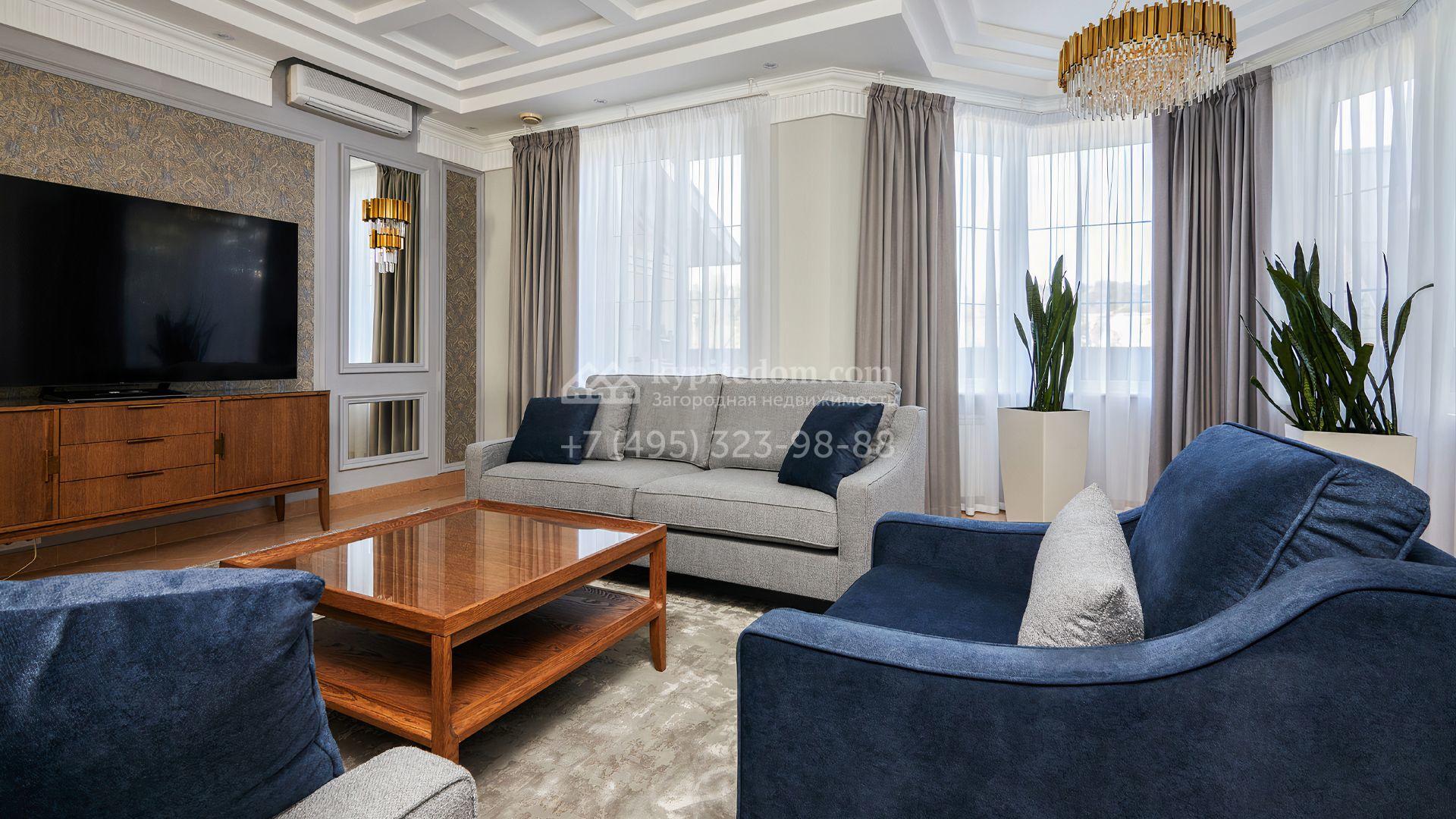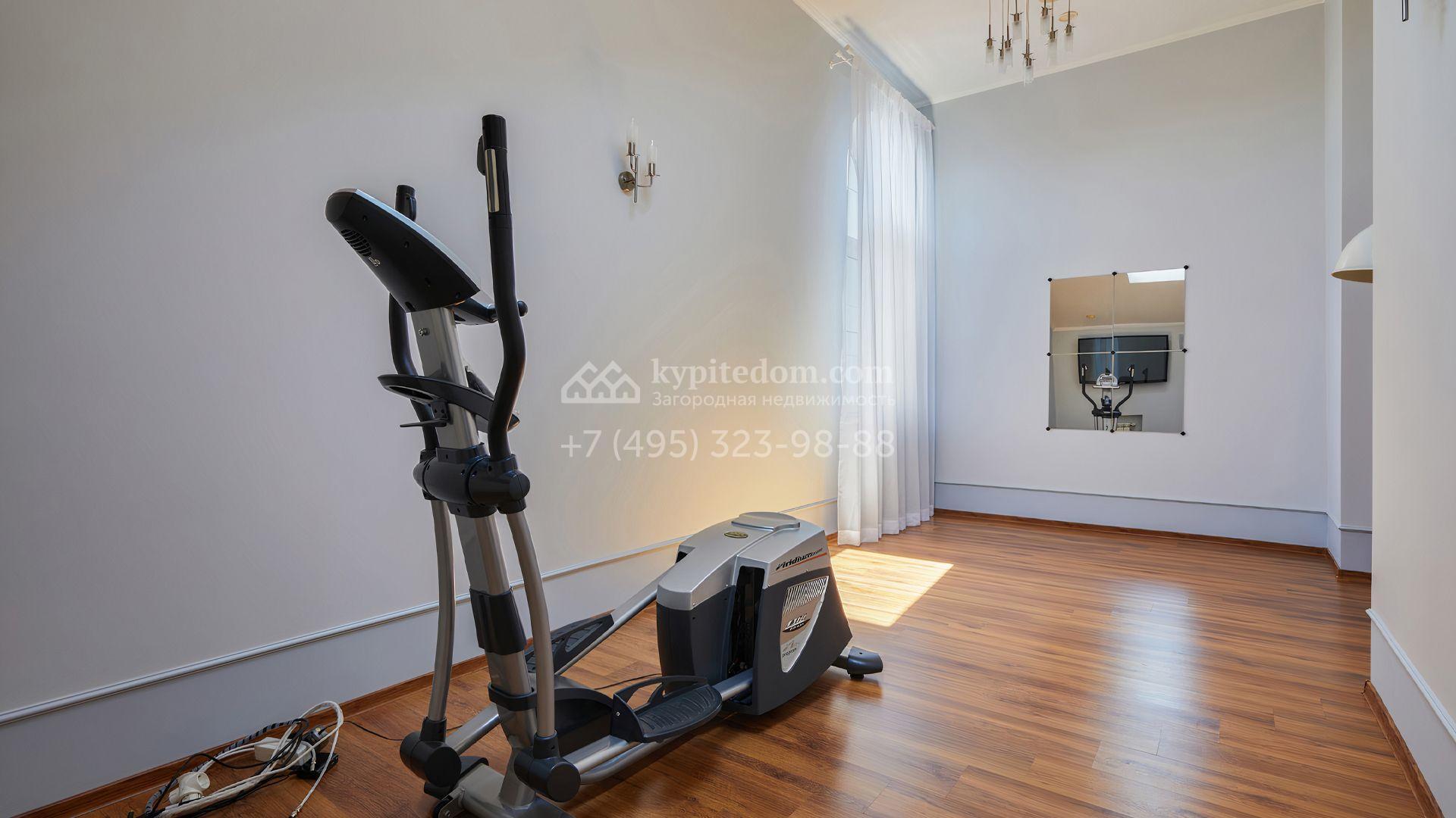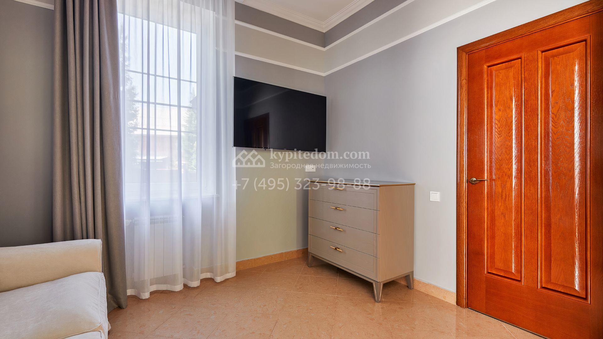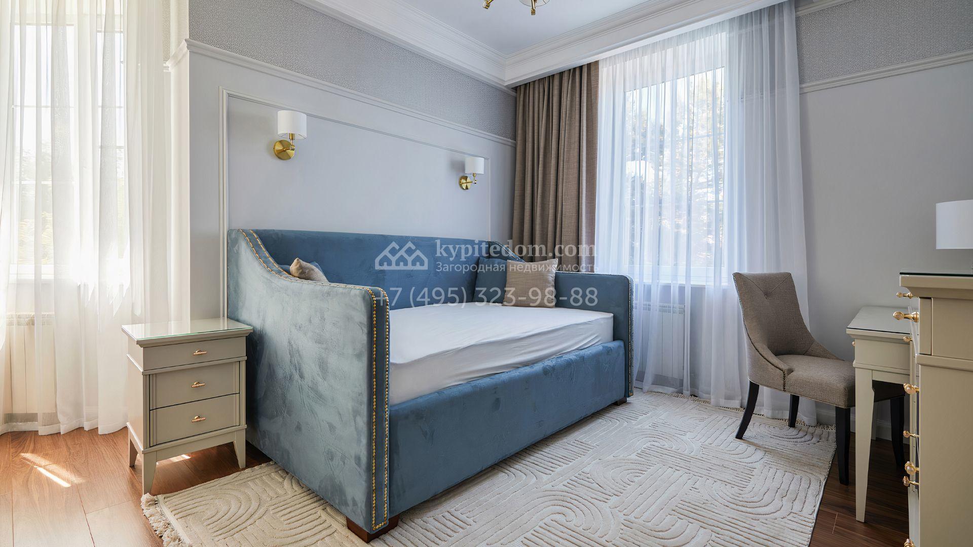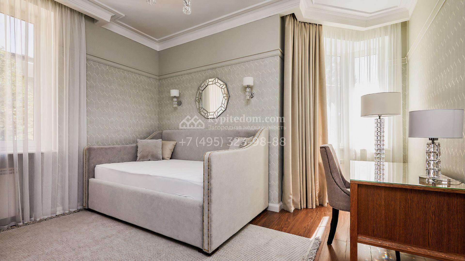 Загородная резиденция площадью 418 м² построена на полевом участке 12 соток. Фасад здания выполнен в неоклассическом стиле и облицован желто-бежевой штукатуркой, декорирован белыми наличниками, карнизами и полуколоннами. В отделке светлого интерьера преобладают теплые оттенки в сочетании с фактурой дерева и камня. Планировка дома включает 4 спальни, уютную гостиную с камином, кухню-столовую, кабинет, спортзал, кинотеатр и спа-зону с бассейном и сауной. В контуре коттеджа предусмотрен гараж на 1 машину. На участке выполнен ландшафтный дизайн, вымощены площадки и обустроена зона барбекю.