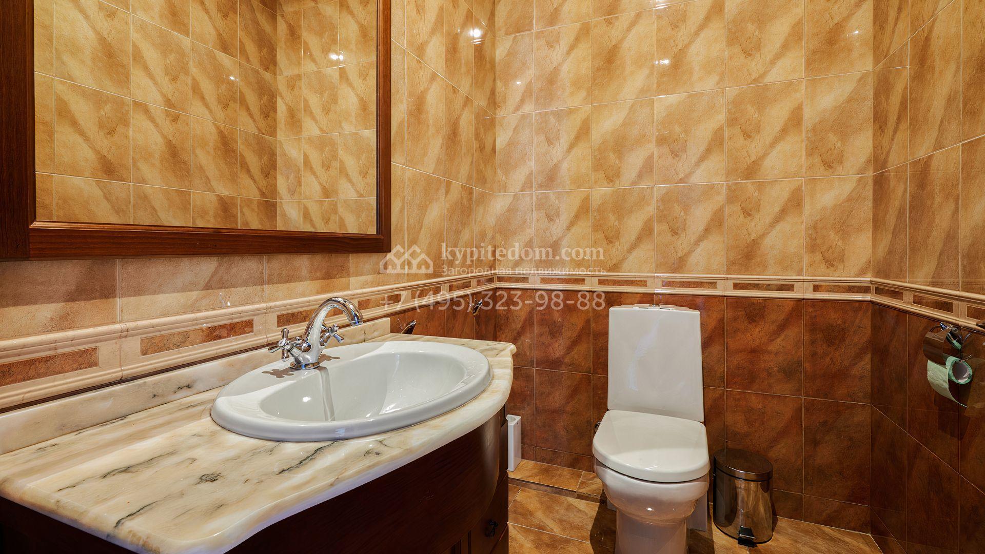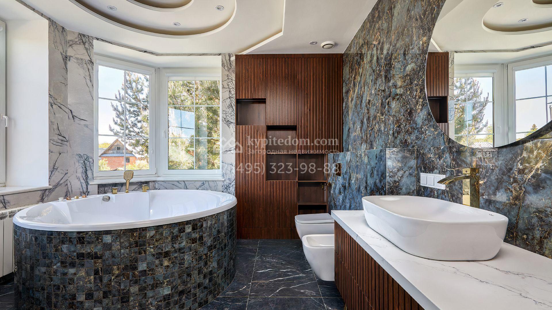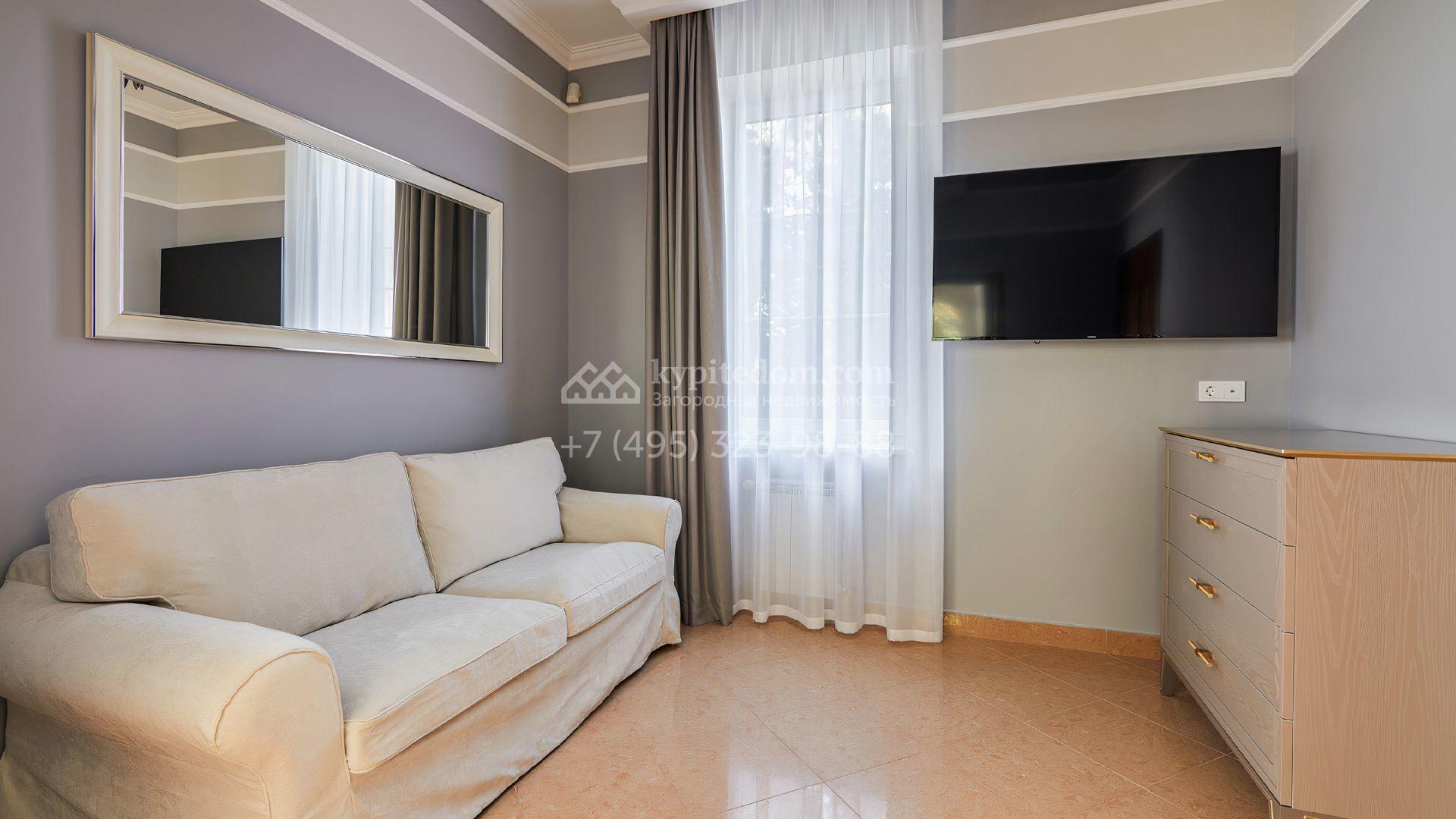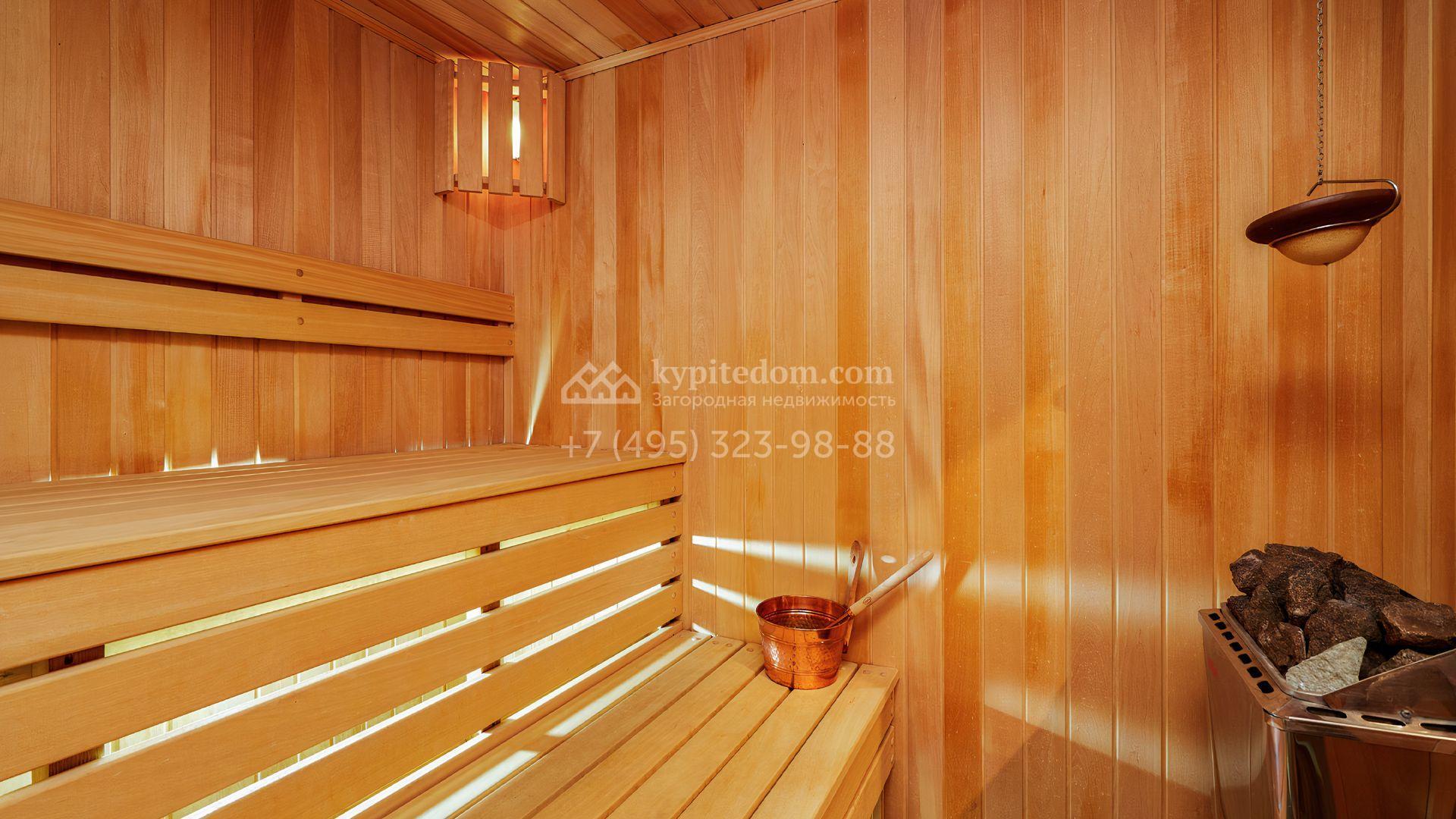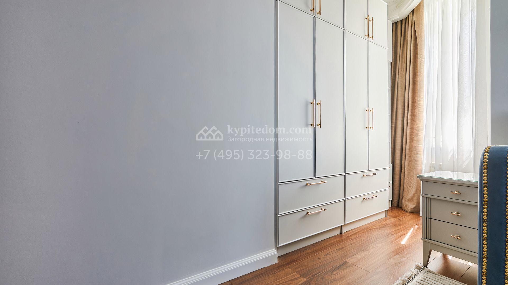 Загородная резиденция площадью 418 м² построена на полевом участке 12 соток. Фасад здания выполнен в неоклассическом стиле и облицован желто-бежевой штукатуркой, декорирован белыми наличниками, карнизами и полуколоннами. В отделке светлого интерьера преобладают теплые оттенки в сочетании с фактурой дерева и камня. Планировка дома включает 4 спальни, уютную гостиную с камином, кухню-столовую, кабинет, спортзал, кинотеатр и спа-зону с бассейном и сауной. В контуре коттеджа предусмотрен гараж на 1 машину. На участке выполнен ландшафтный дизайн, вымощены площадки и обустроена зона барбекю.