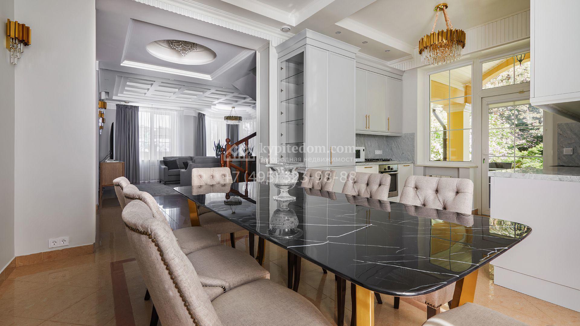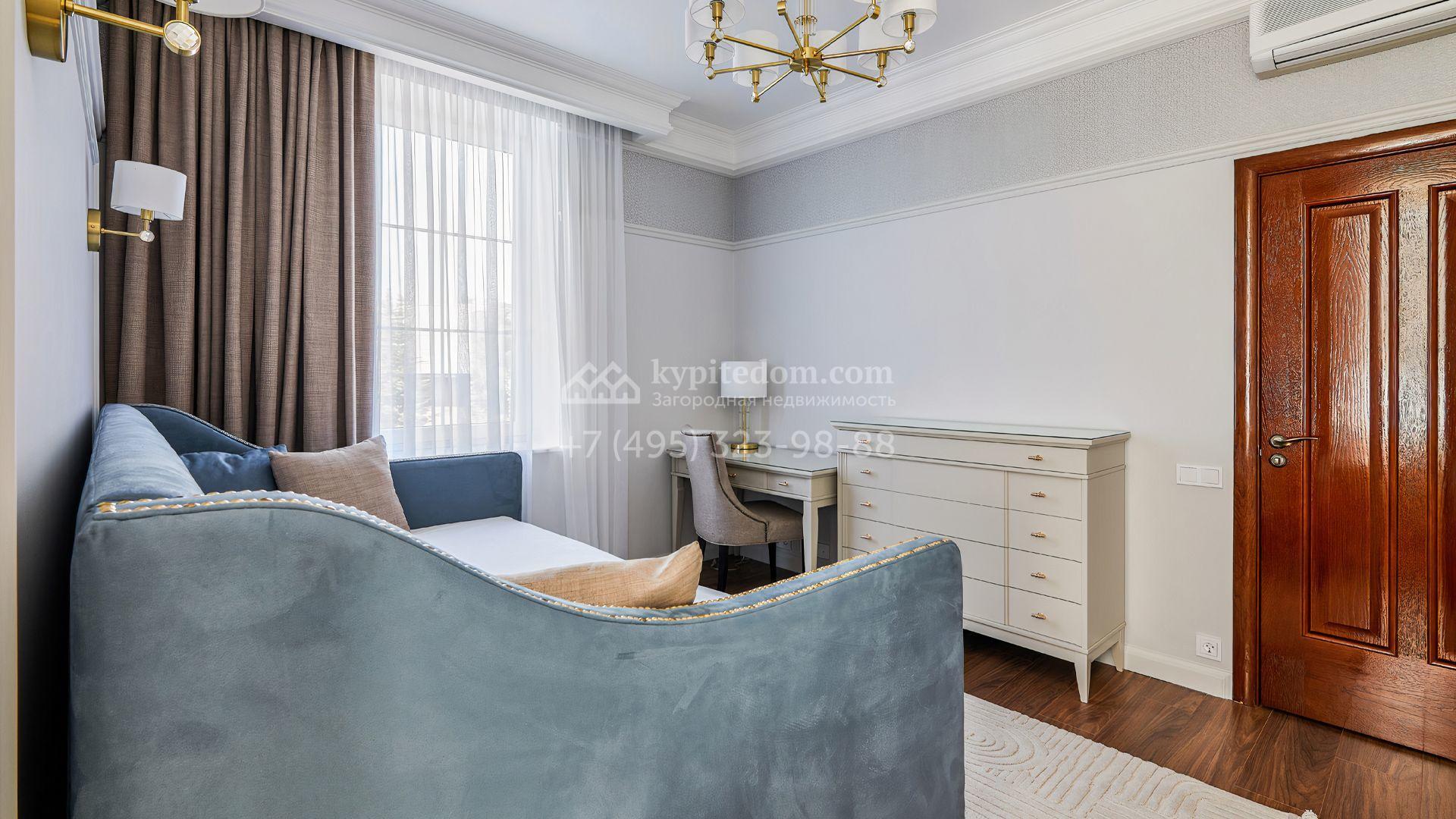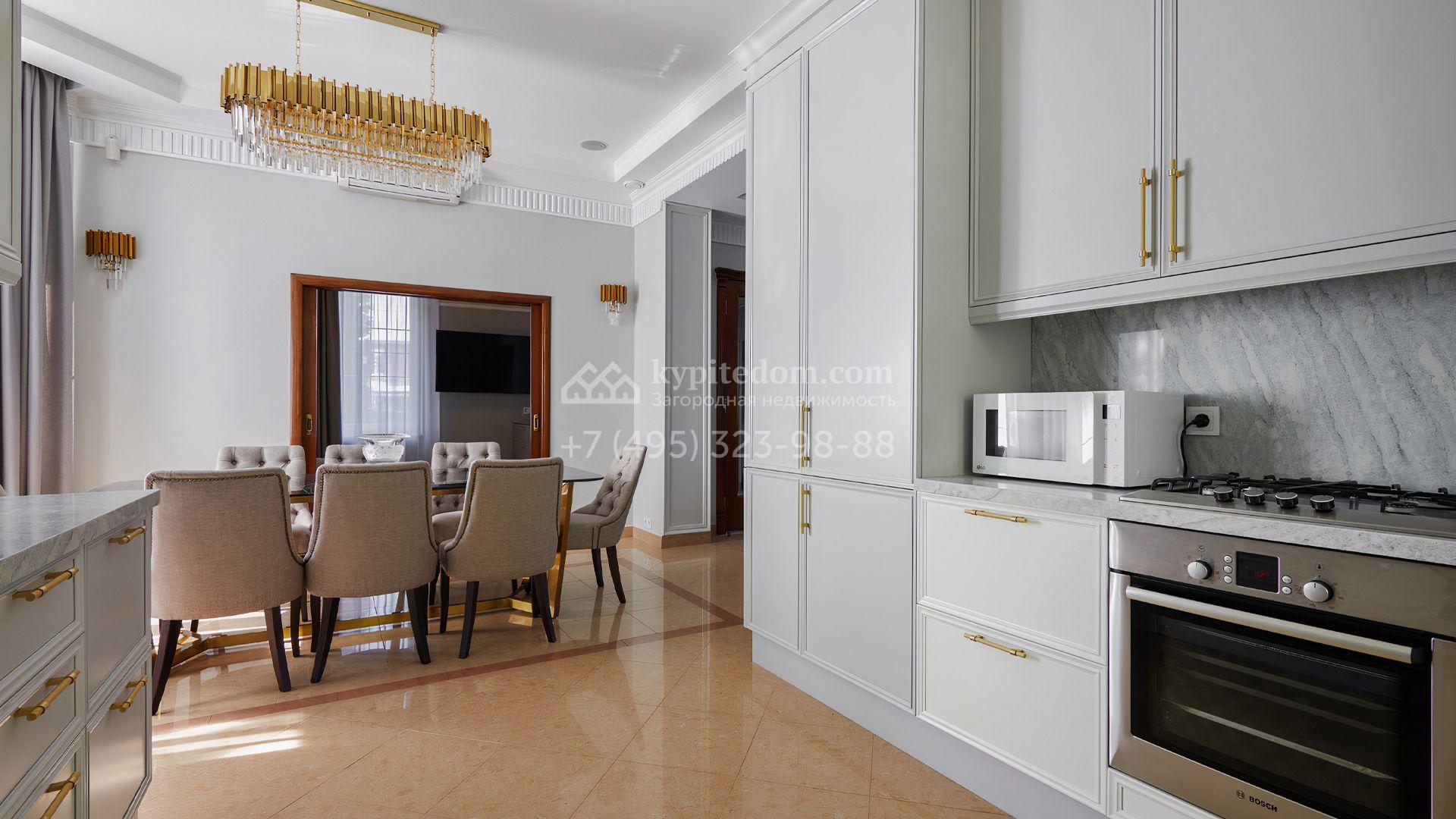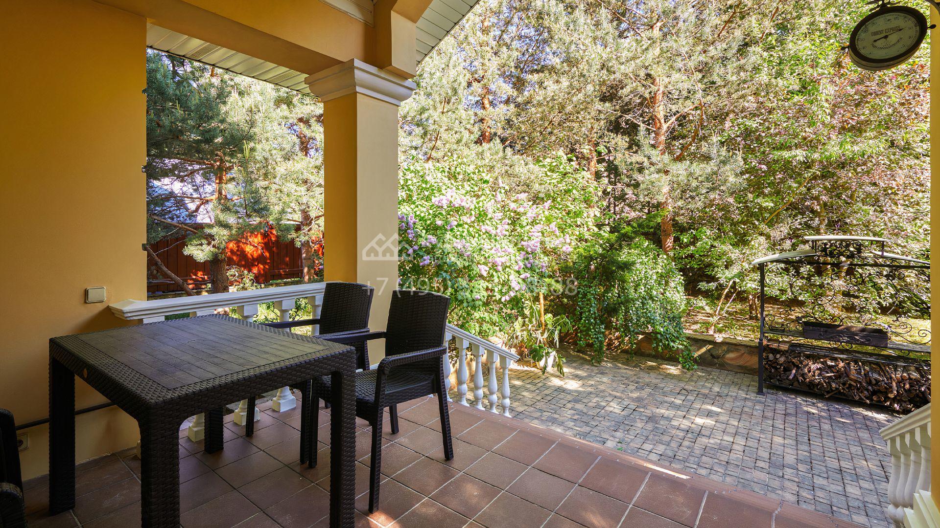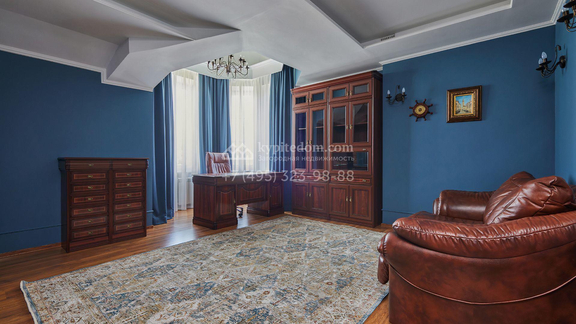 Загородная резиденция площадью 418 м² построена на полевом участке 12 соток. Фасад здания выполнен в неоклассическом стиле и облицован желто-бежевой штукатуркой, декорирован белыми наличниками, карнизами и полуколоннами. В отделке светлого интерьера преобладают теплые оттенки в сочетании с фактурой дерева и камня. Планировка дома включает 4 спальни, уютную гостиную с камином, кухню-столовую, кабинет, спортзал, кинотеатр и спа-зону с бассейном и сауной. В контуре коттеджа предусмотрен гараж на 1 машину. На участке выполнен ландшафтный дизайн, вымощены площадки и обустроена зона барбекю.