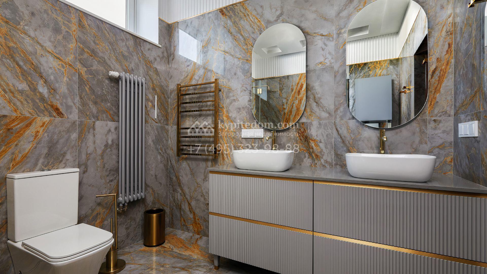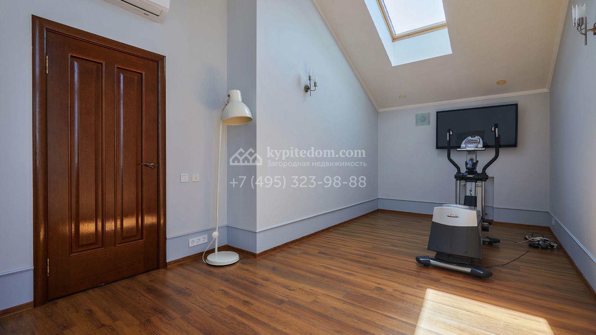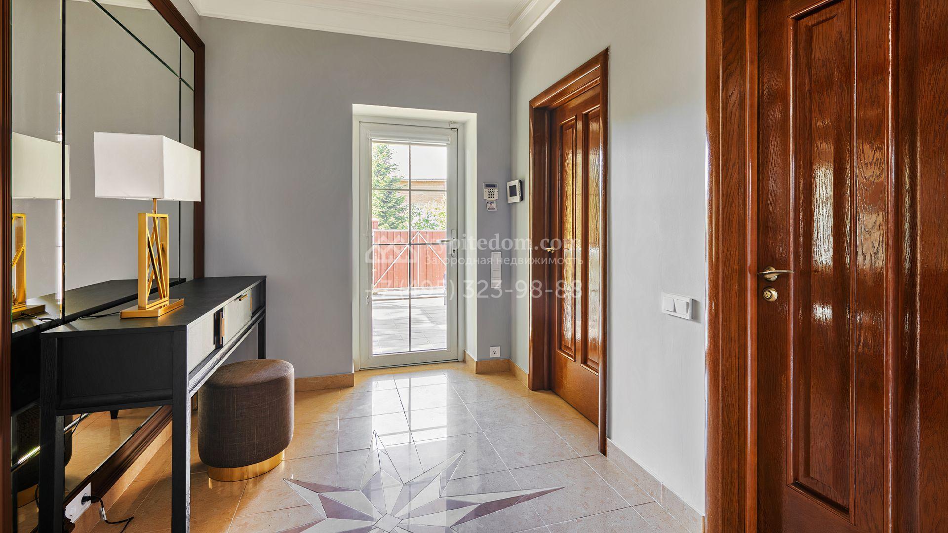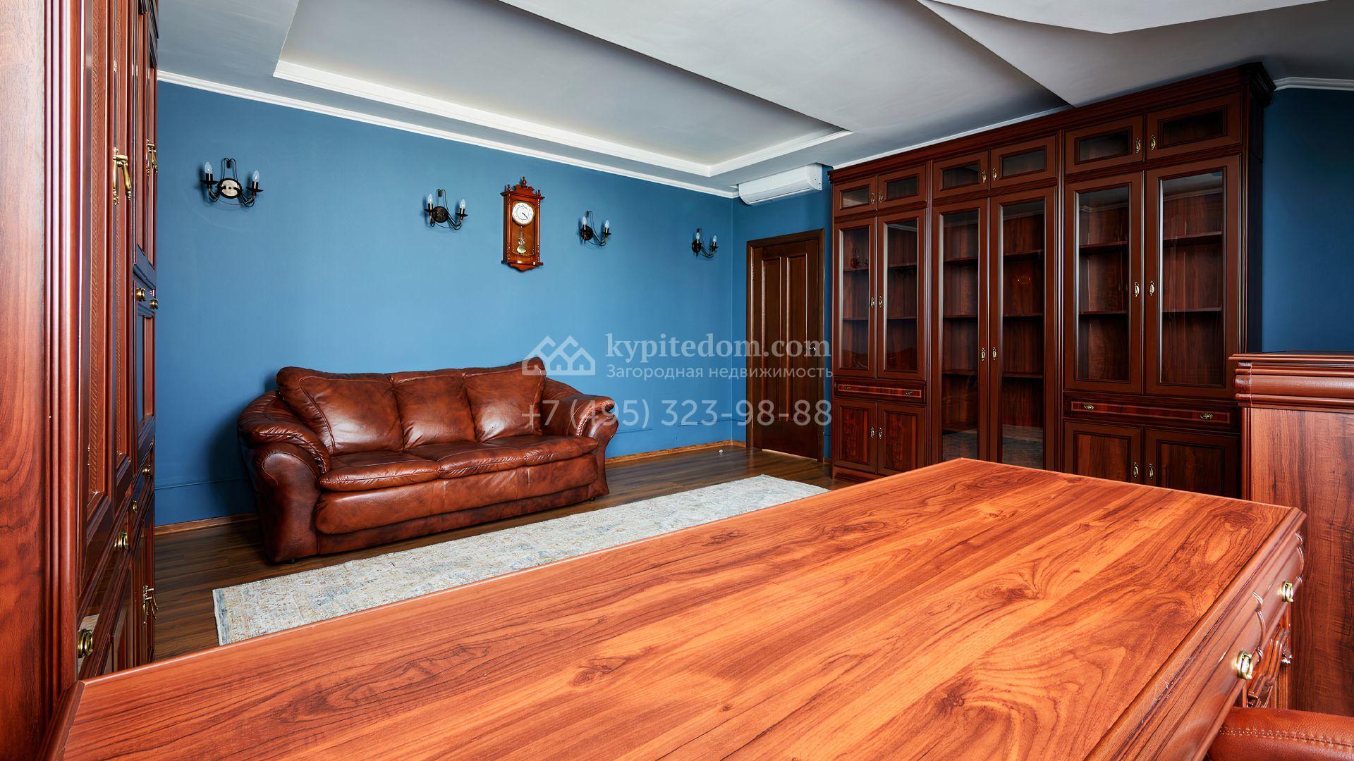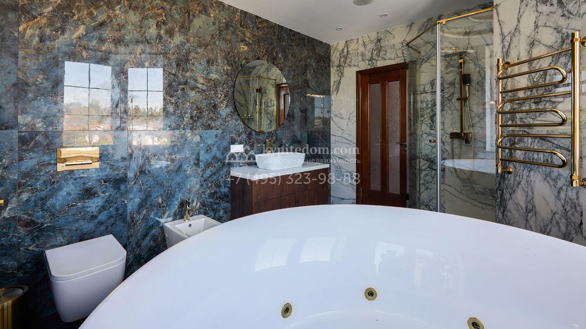Загородная резиденция площадью 418 м² построена на полевом участке 12 соток. Фасад здания выполнен в неоклассическом стиле и облицован желто-бежевой штукатуркой, декорирован белыми наличниками, карнизами и полуколоннами. В отделке светлого интерьера преобладают теплые оттенки в сочетании с фактурой дерева и камня. Планировка дома включает 4 спальни, уютную гостиную с камином, кухню-столовую, кабинет, спортзал, кинотеатр и спа-зону с бассейном и сауной. В контуре коттеджа предусмотрен гараж на 1 машину. На участке выполнен ландшафтный дизайн, вымощены площадки и обустроена зона барбекю.