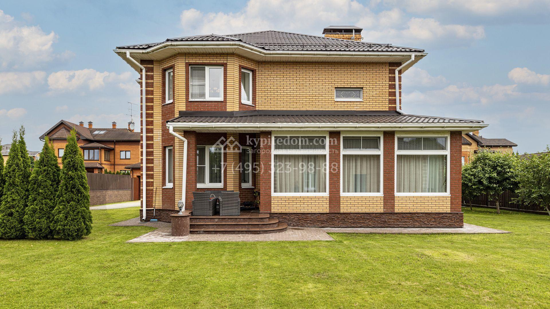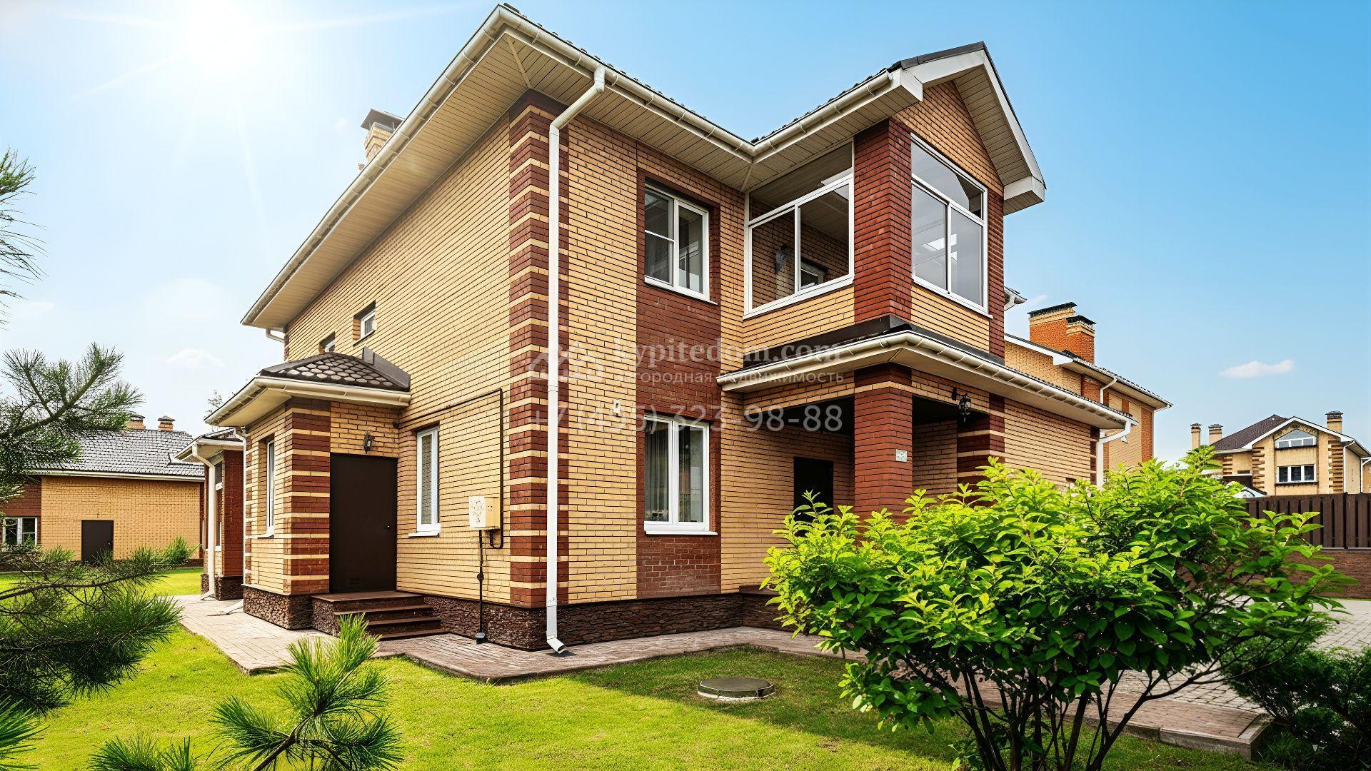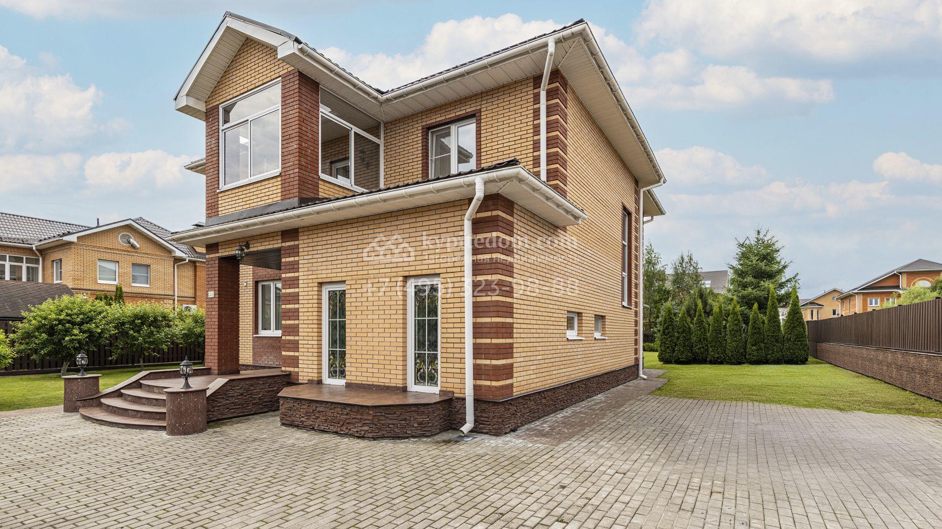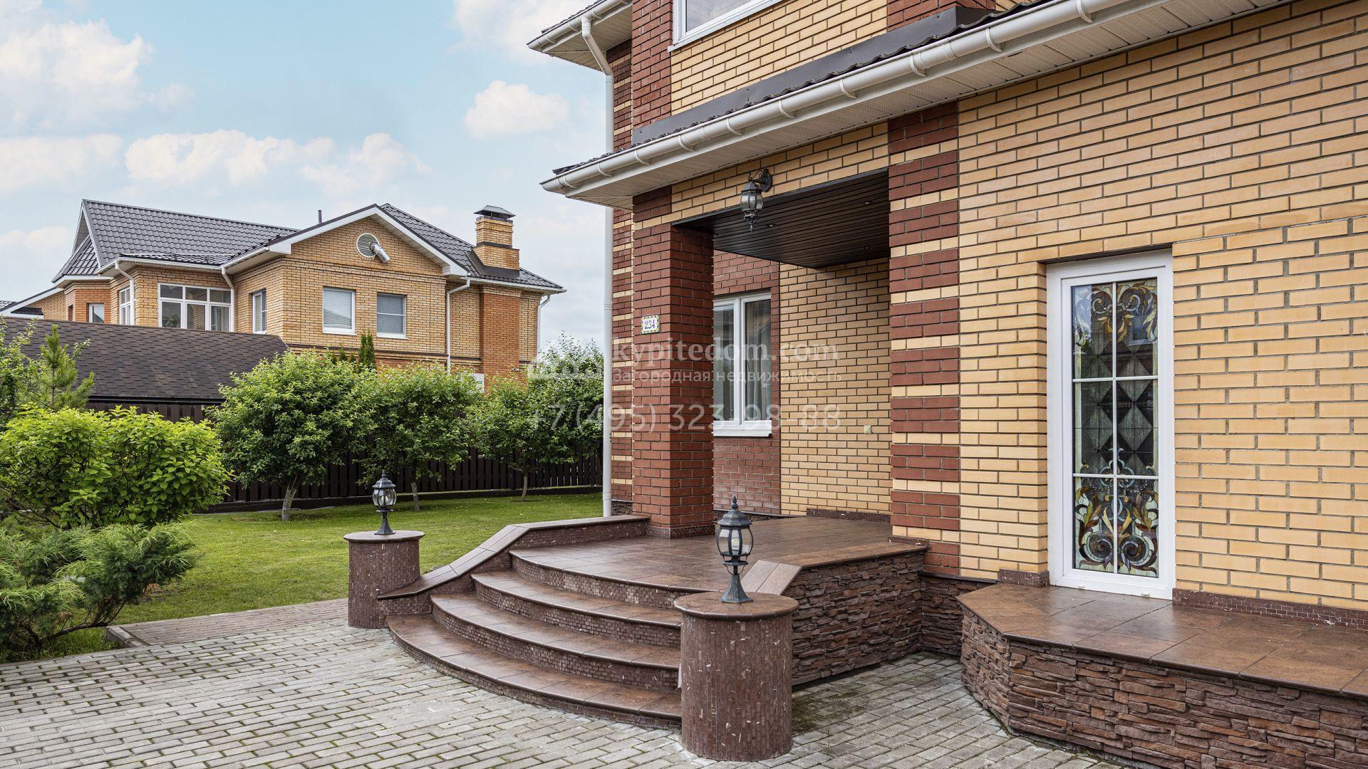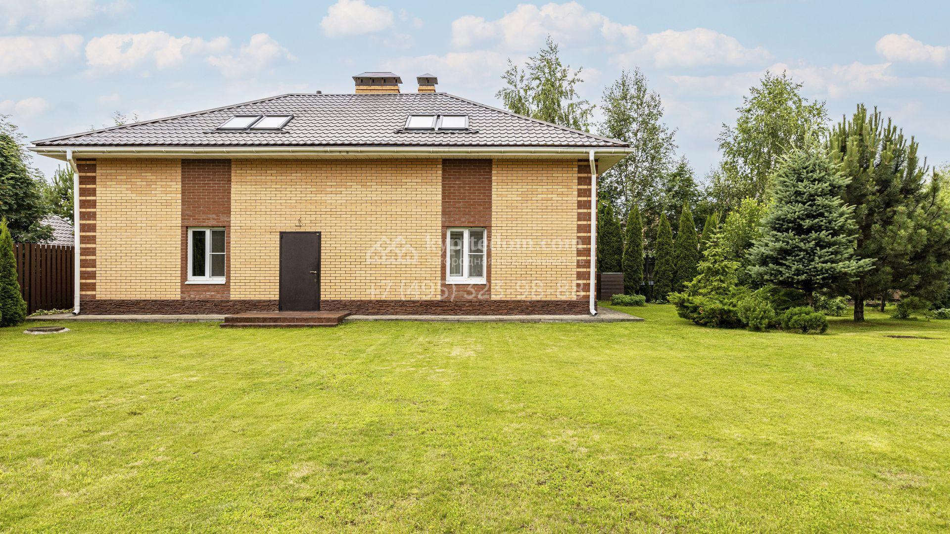 Загородный дом площадью 420 м² расположен на полевом участке 15 соток. Фасад здания облицован бежевым и красным клинкерным кирпичом. В резиденции с отделкой «под ключ» спланировали 4 спальни, кухню-столовую-гостиную, кабинет, зимний сад и террасу, на которой можно обустроить зону барбекю. Рядом расположен гостевой дом с 2-мя спальнями и финской сауной. На участке засеян газон и высажены хвойные деревья.