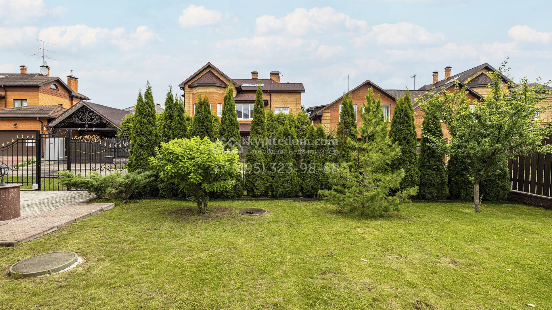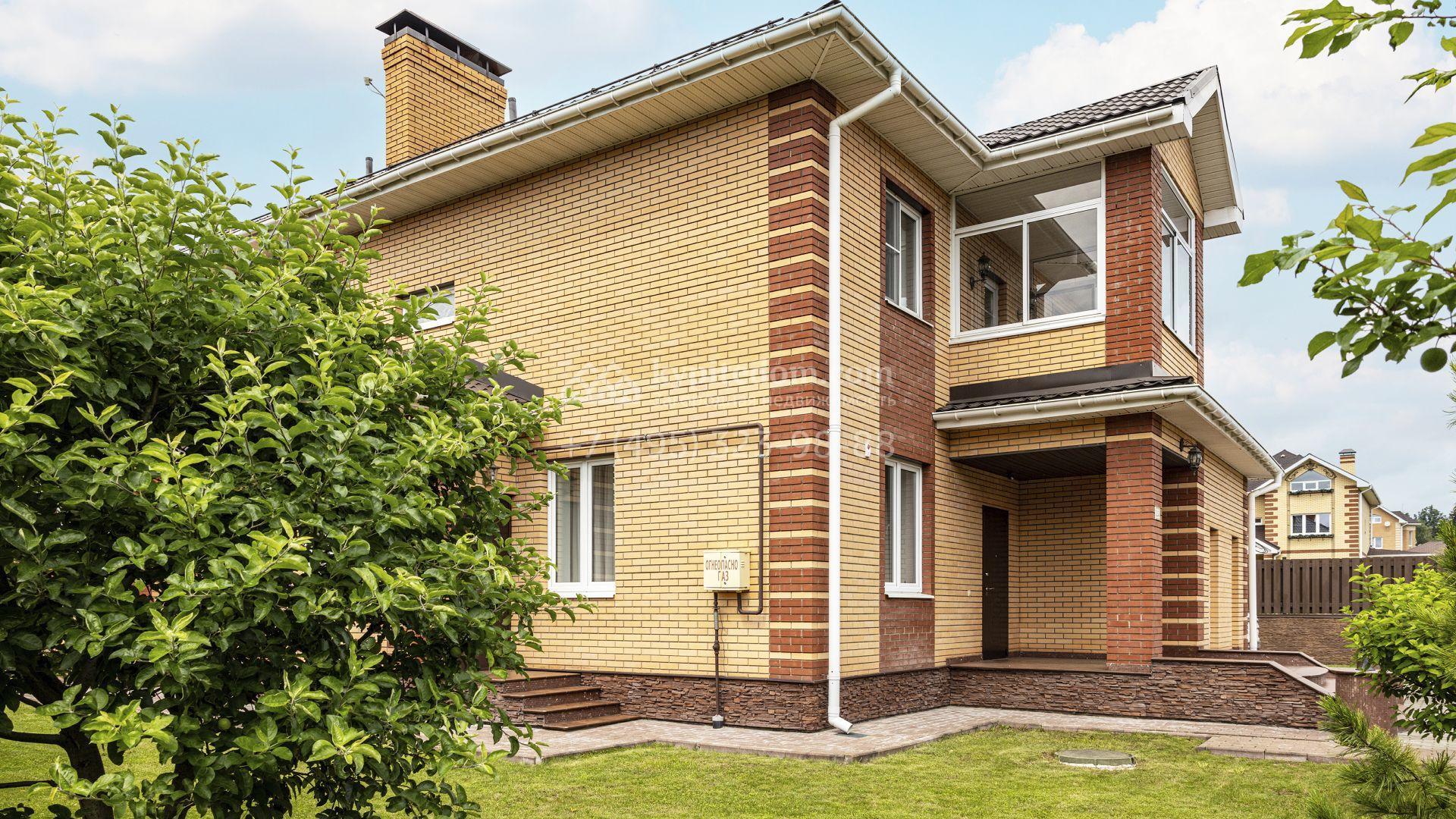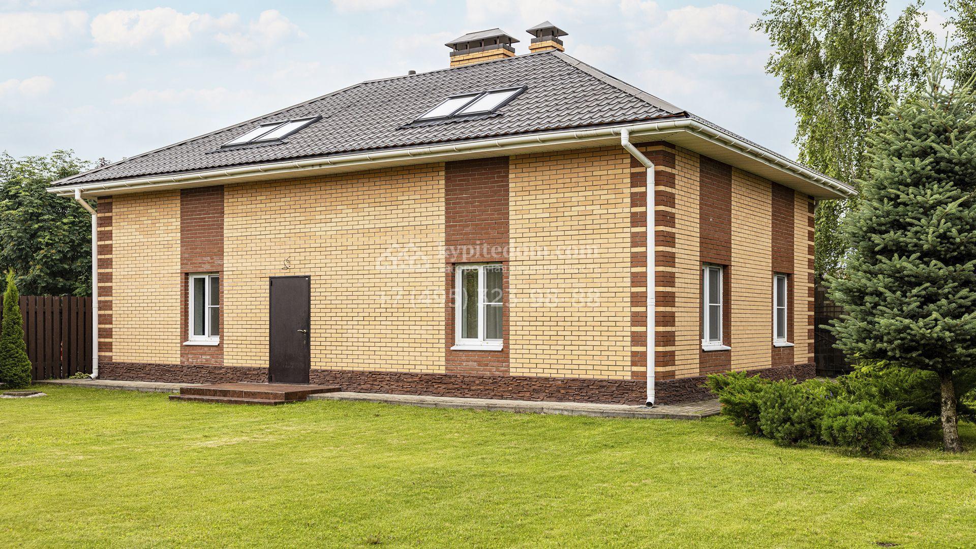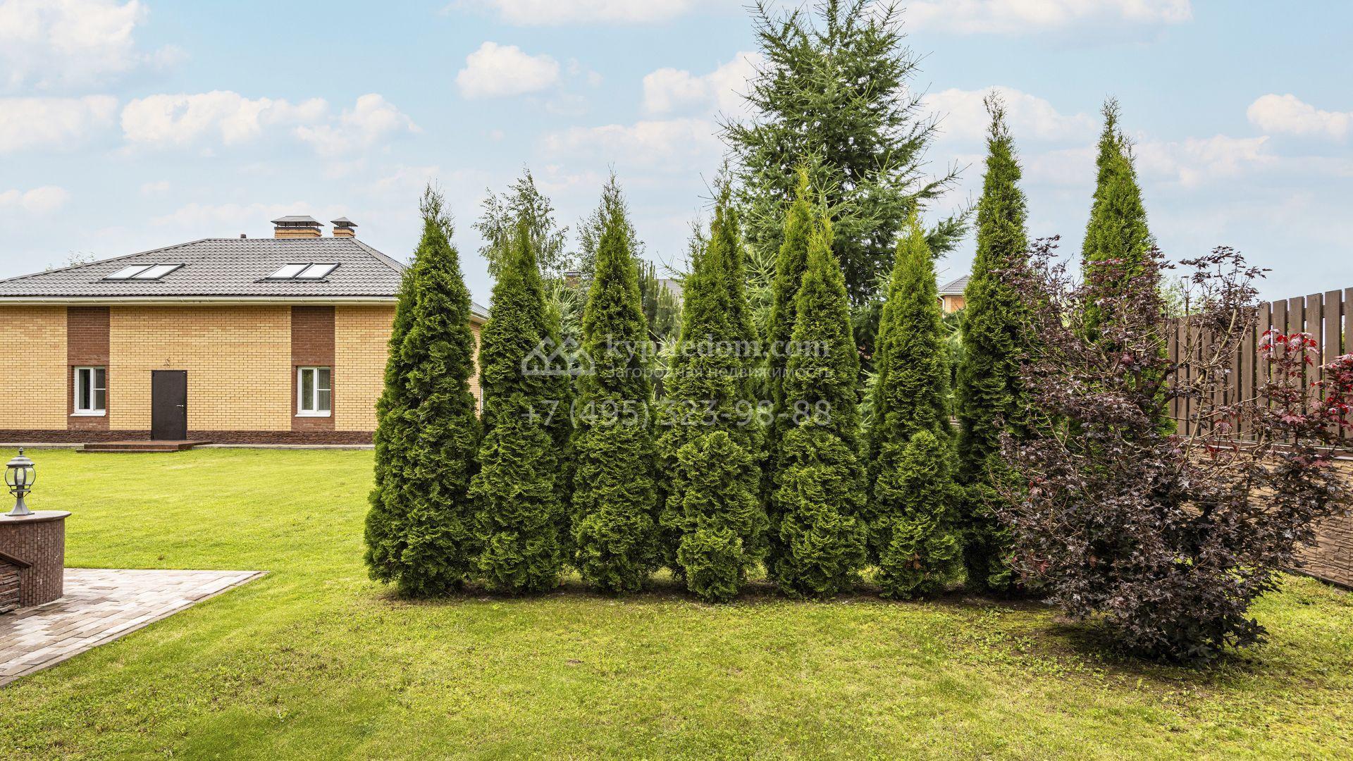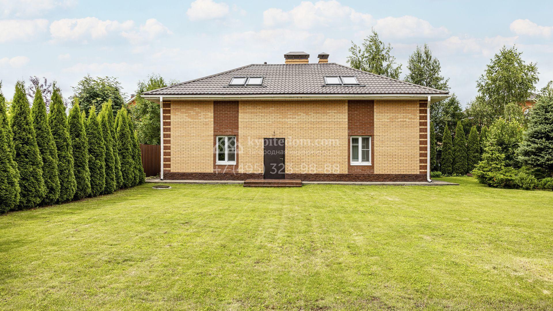 Загородный дом площадью 420 м² расположен на полевом участке 15 соток. Фасад здания облицован бежевым и красным клинкерным кирпичом. В резиденции с отделкой «под ключ» спланировали 4 спальни, кухню-столовую-гостиную, кабинет, зимний сад и террасу, на которой можно обустроить зону барбекю. Рядом расположен гостевой дом с 2-мя спальнями и финской сауной. На участке засеян газон и высажены хвойные деревья.