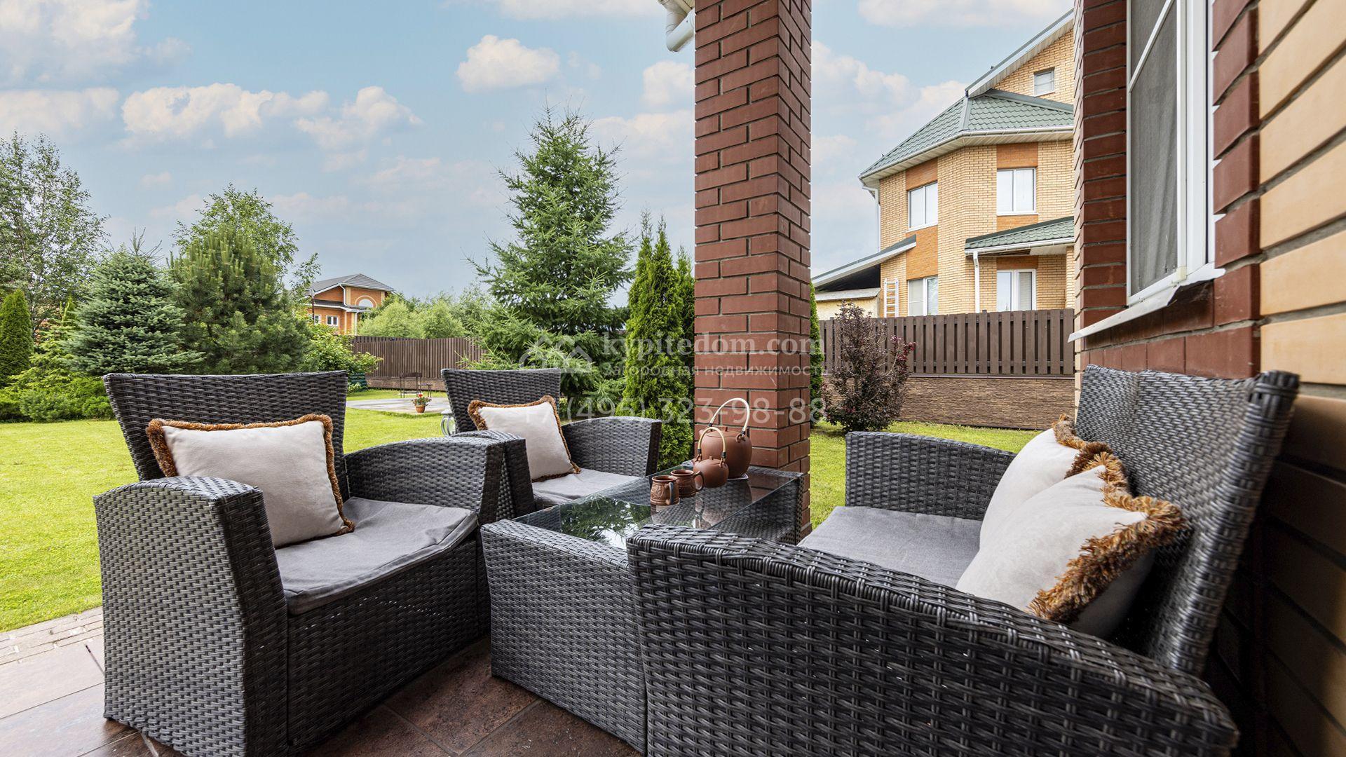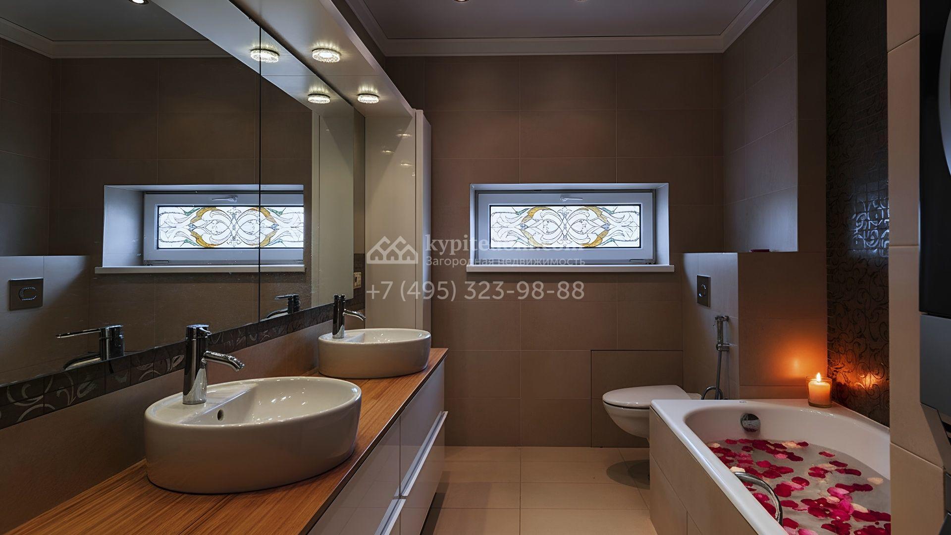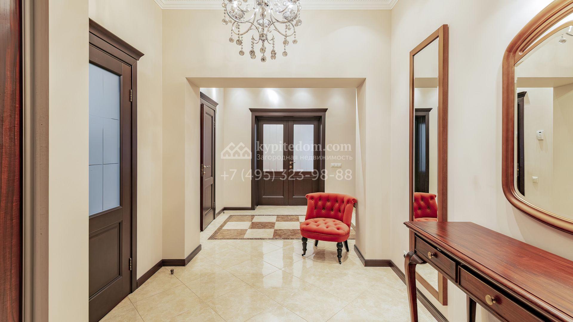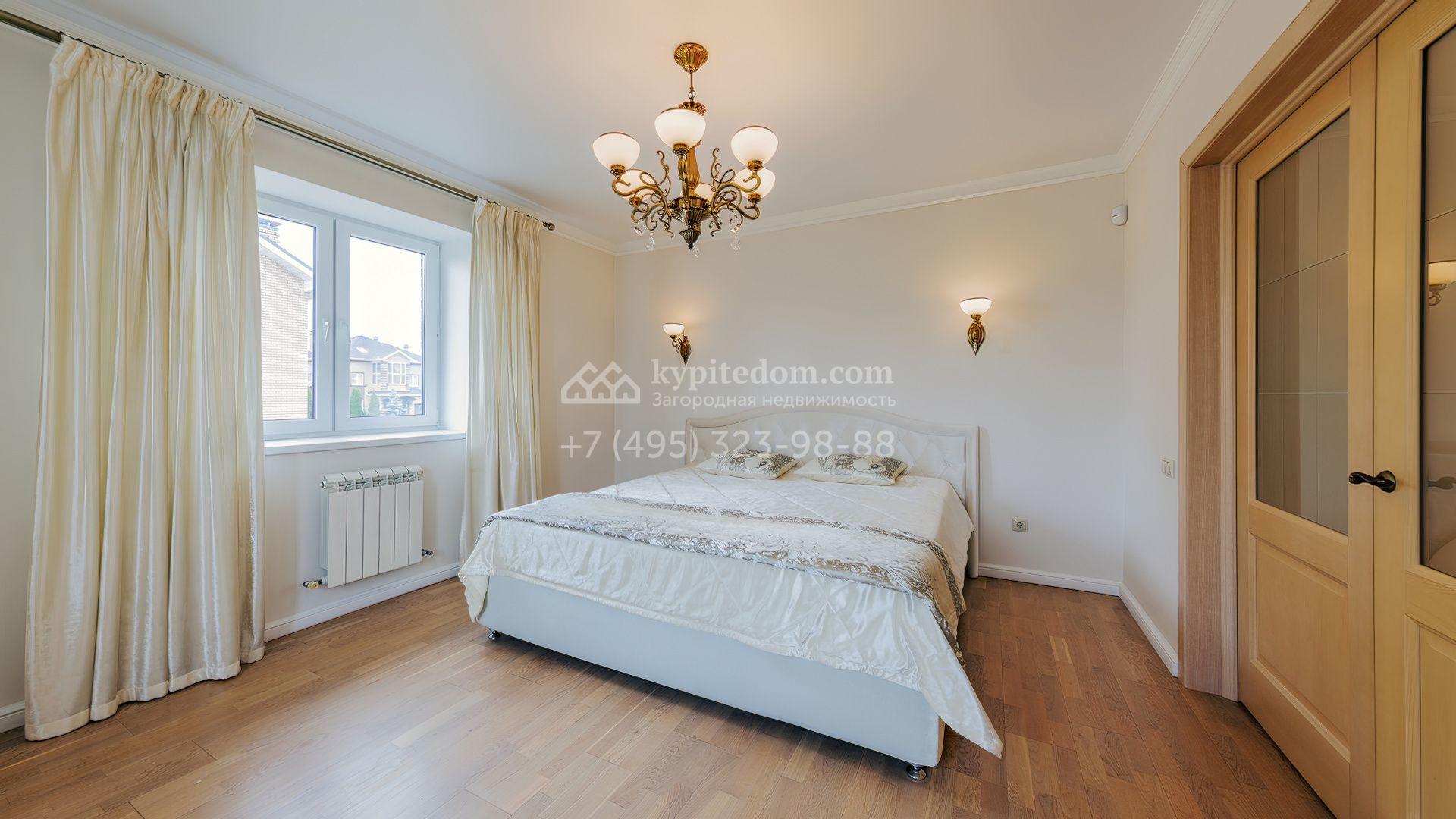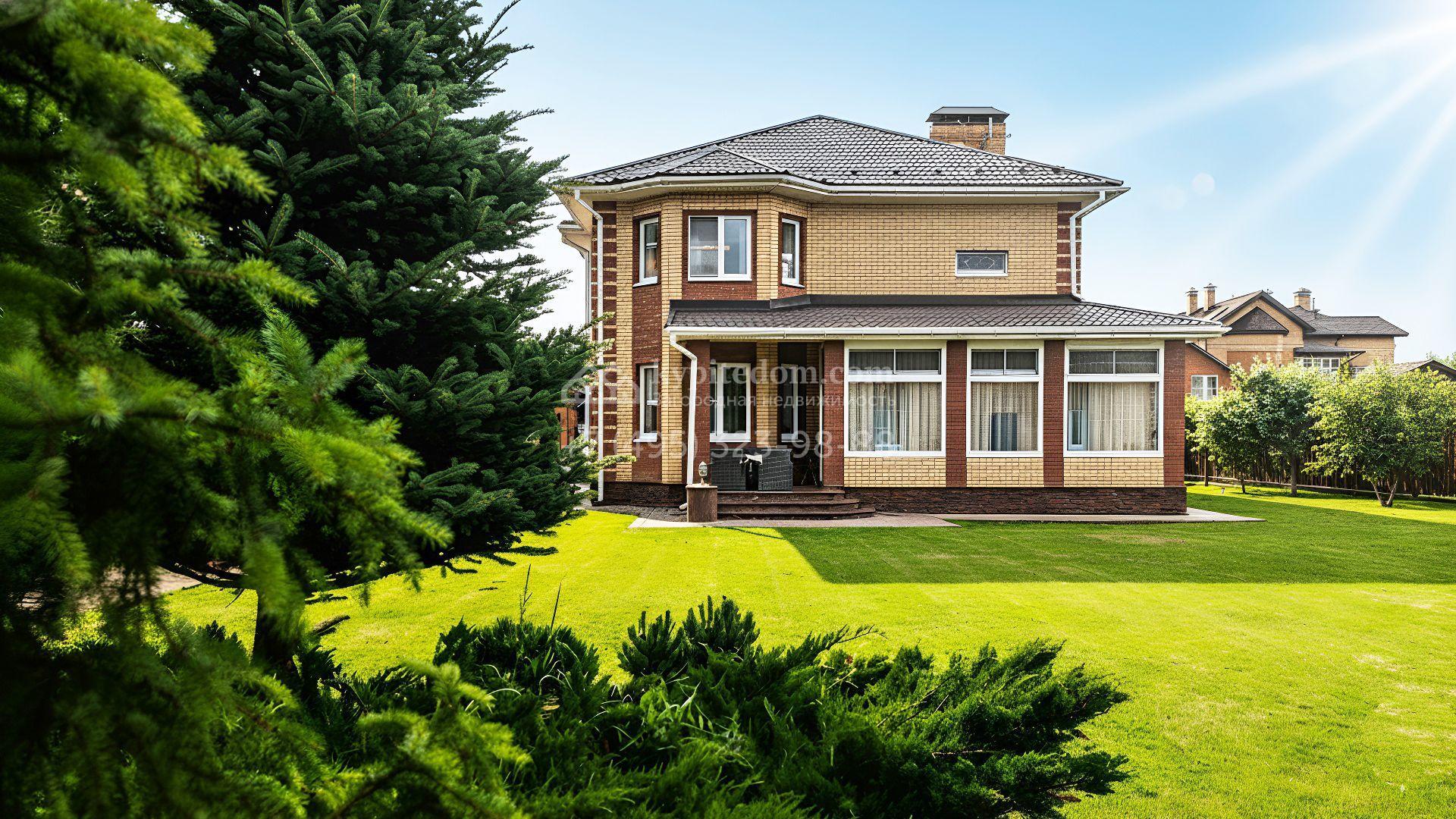 Загородный дом площадью 420 м² расположен на полевом участке 15 соток. Фасад здания облицован бежевым и красным клинкерным кирпичом. В резиденции с отделкой «под ключ» спланировали 4 спальни, кухню-столовую-гостиную, кабинет, зимний сад и террасу, на которой можно обустроить зону барбекю. Рядом расположен гостевой дом с 2-мя спальнями и финской сауной. На участке засеян газон и высажены хвойные деревья.