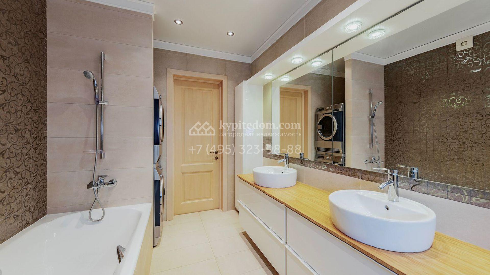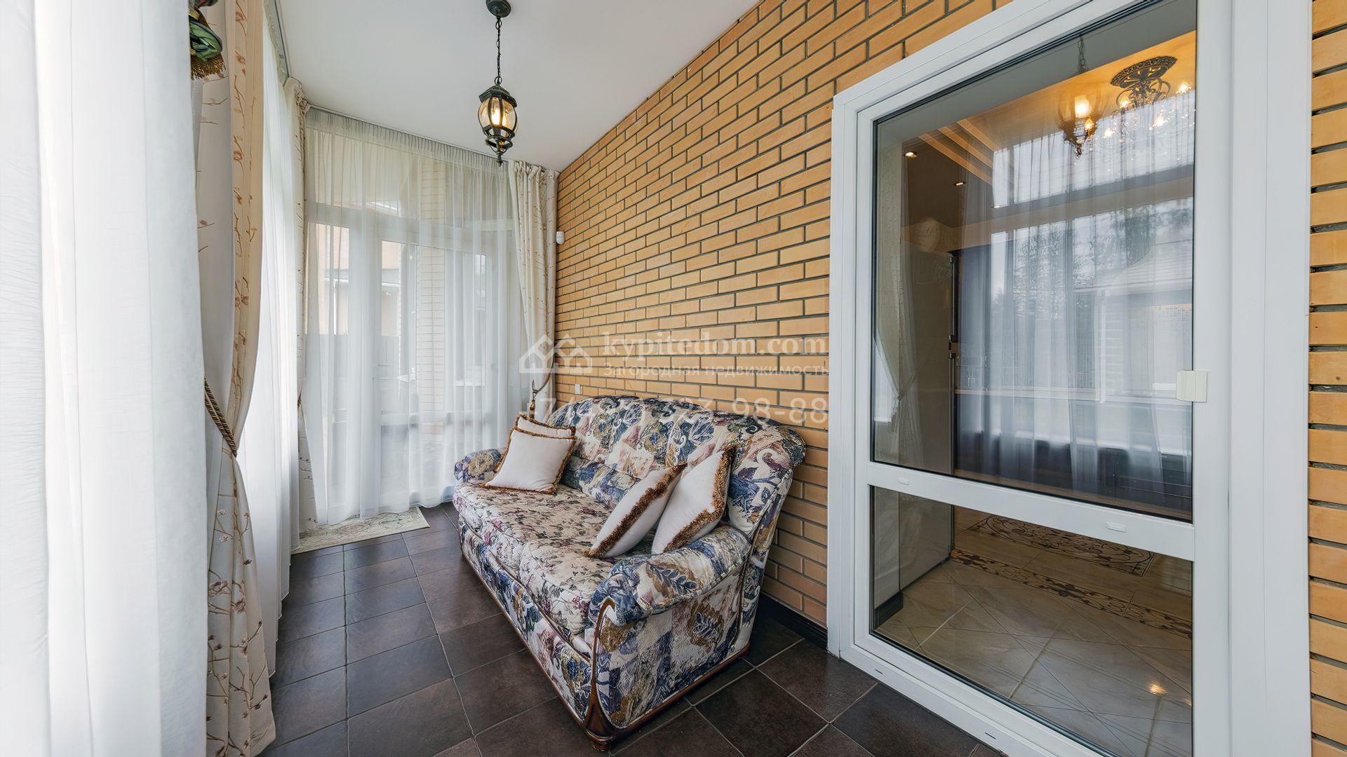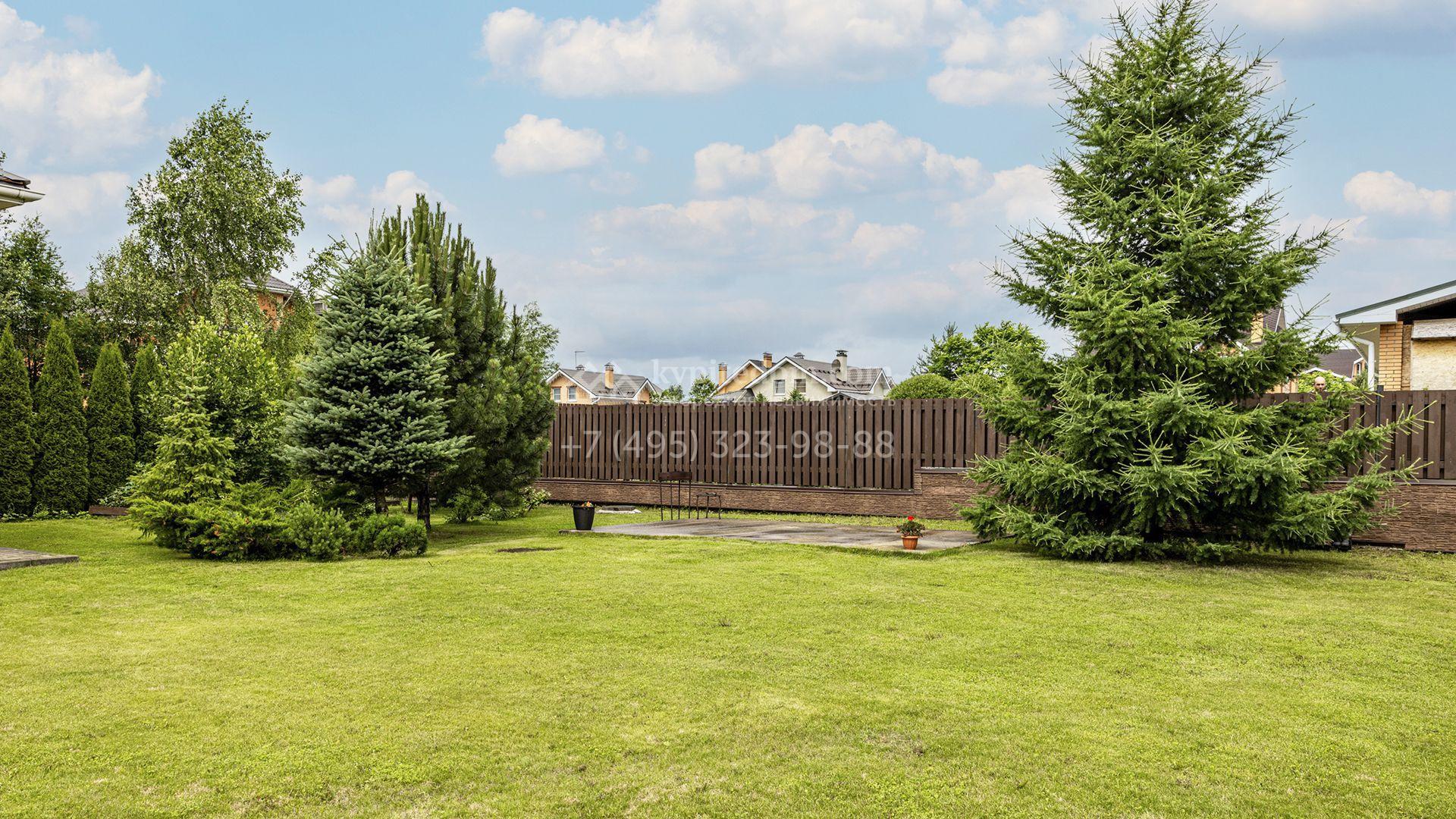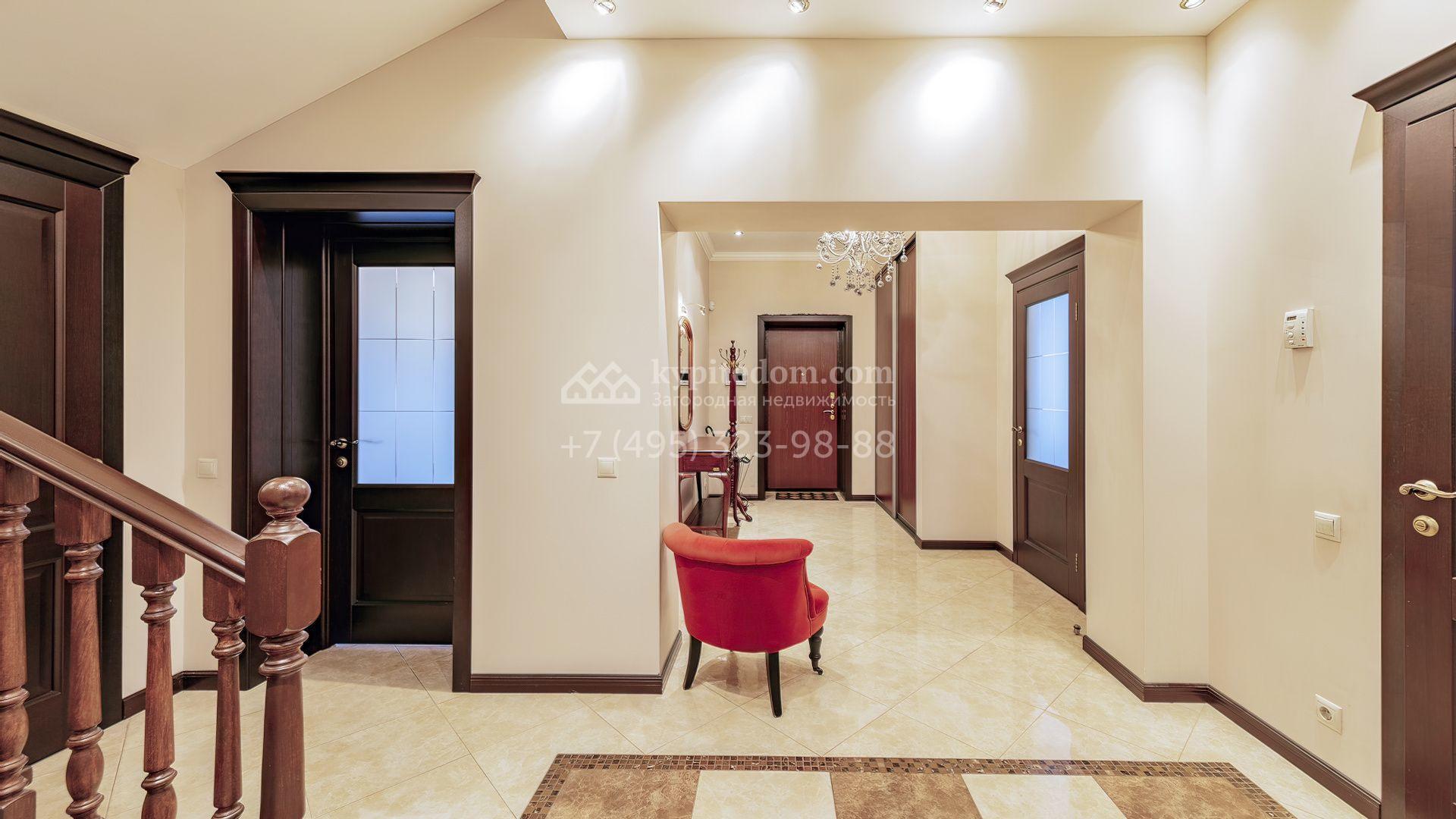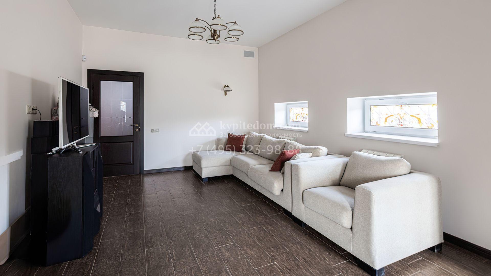 Загородный дом площадью 420 м² расположен на полевом участке 15 соток. Фасад здания облицован бежевым и красным клинкерным кирпичом. В резиденции с отделкой «под ключ» спланировали 4 спальни, кухню-столовую-гостиную, кабинет, зимний сад и террасу, на которой можно обустроить зону барбекю. Рядом расположен гостевой дом с 2-мя спальнями и финской сауной. На участке засеян газон и высажены хвойные деревья.