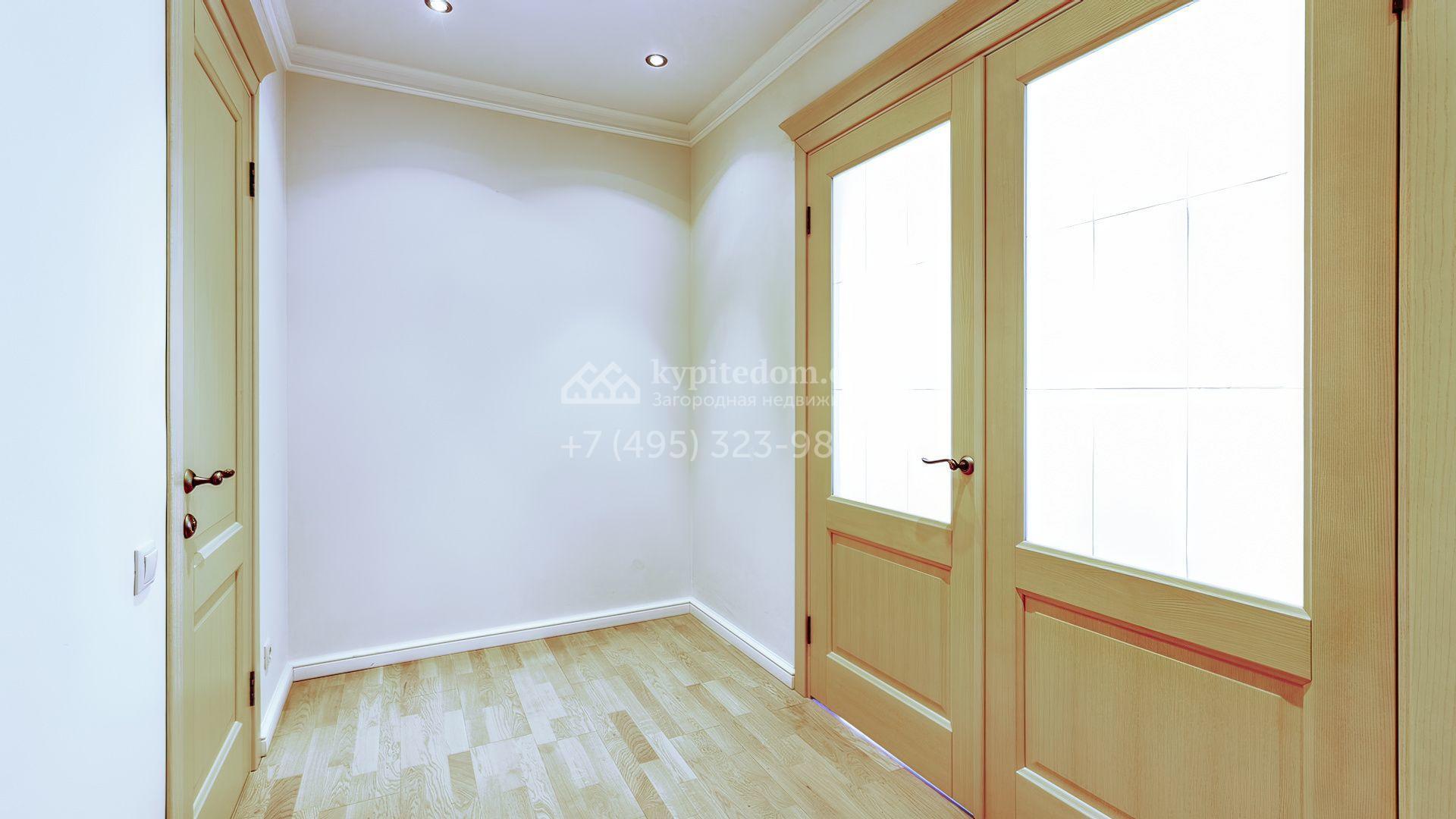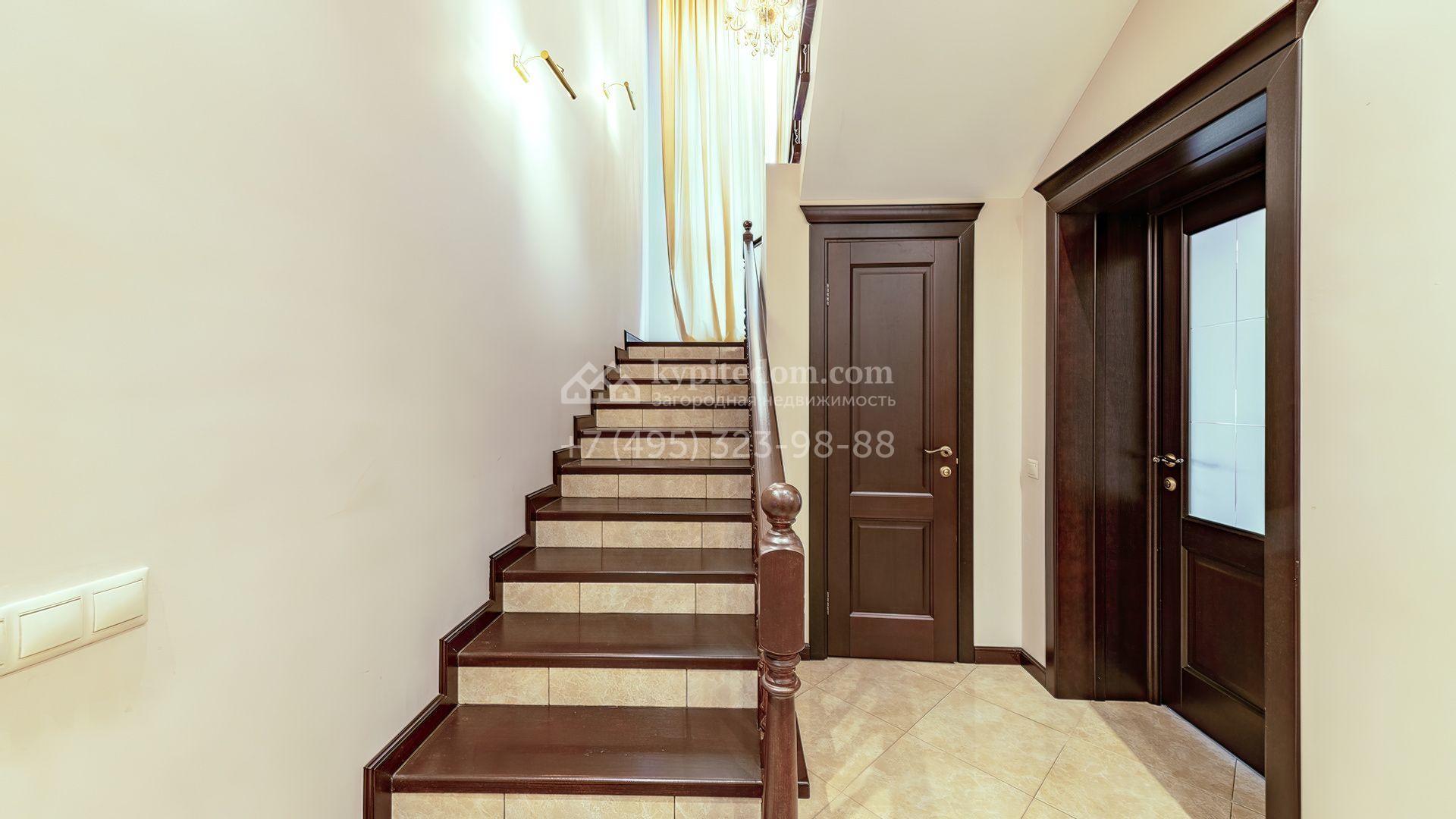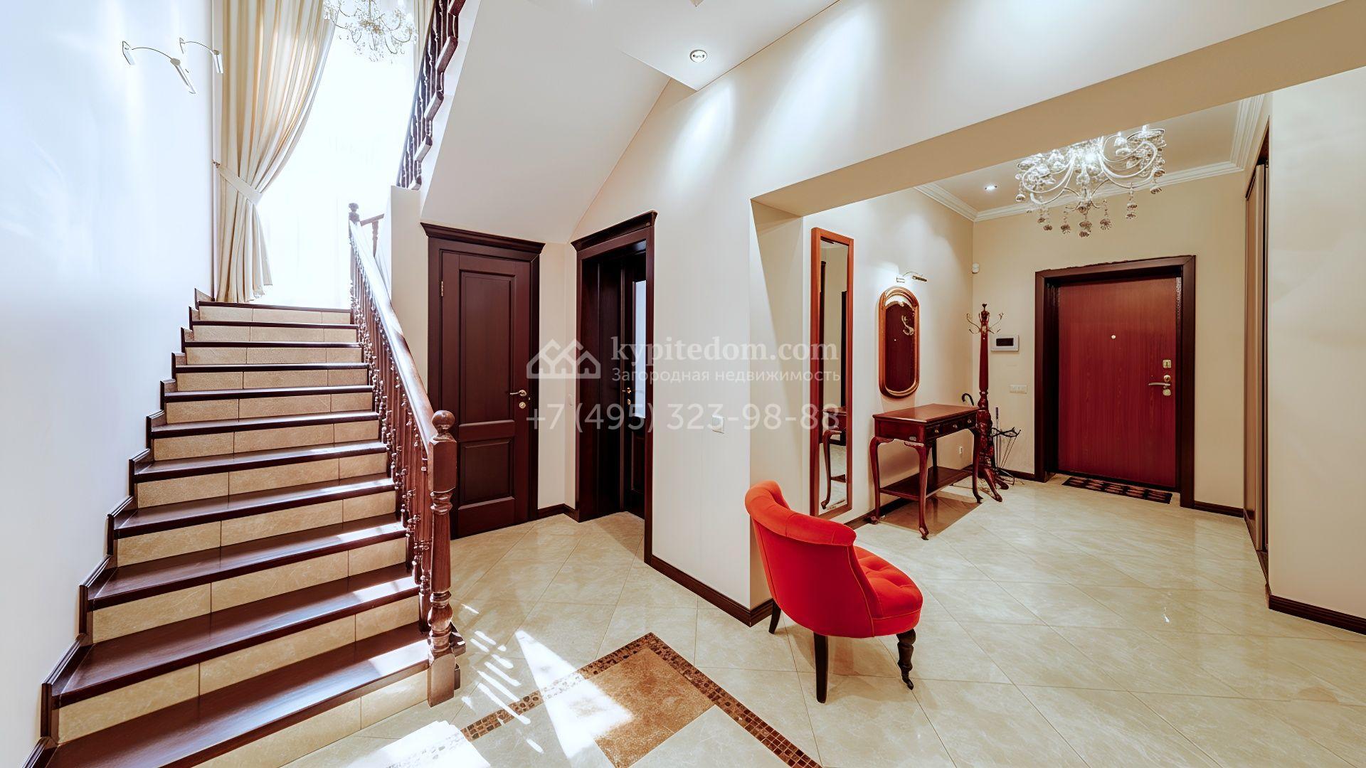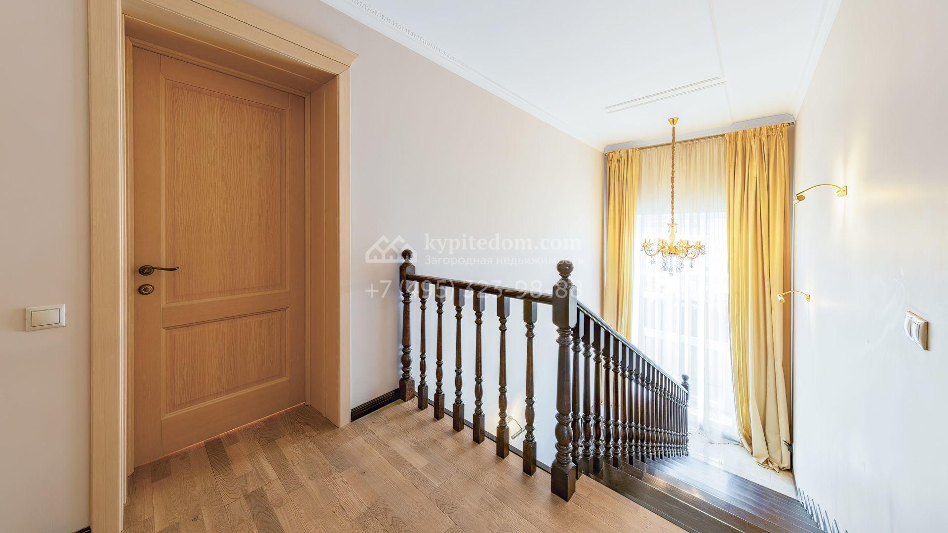Загородный дом площадью 420 м² расположен на полевом участке 15 соток. Фасад здания облицован бежевым и красным клинкерным кирпичом. В резиденции с отделкой «под ключ» спланировали 4 спальни, кухню-столовую-гостиную, кабинет, зимний сад и террасу, на которой можно обустроить зону барбекю. Рядом расположен гостевой дом с 2-мя спальнями и финской сауной. На участке засеян газон и высажены хвойные деревья.