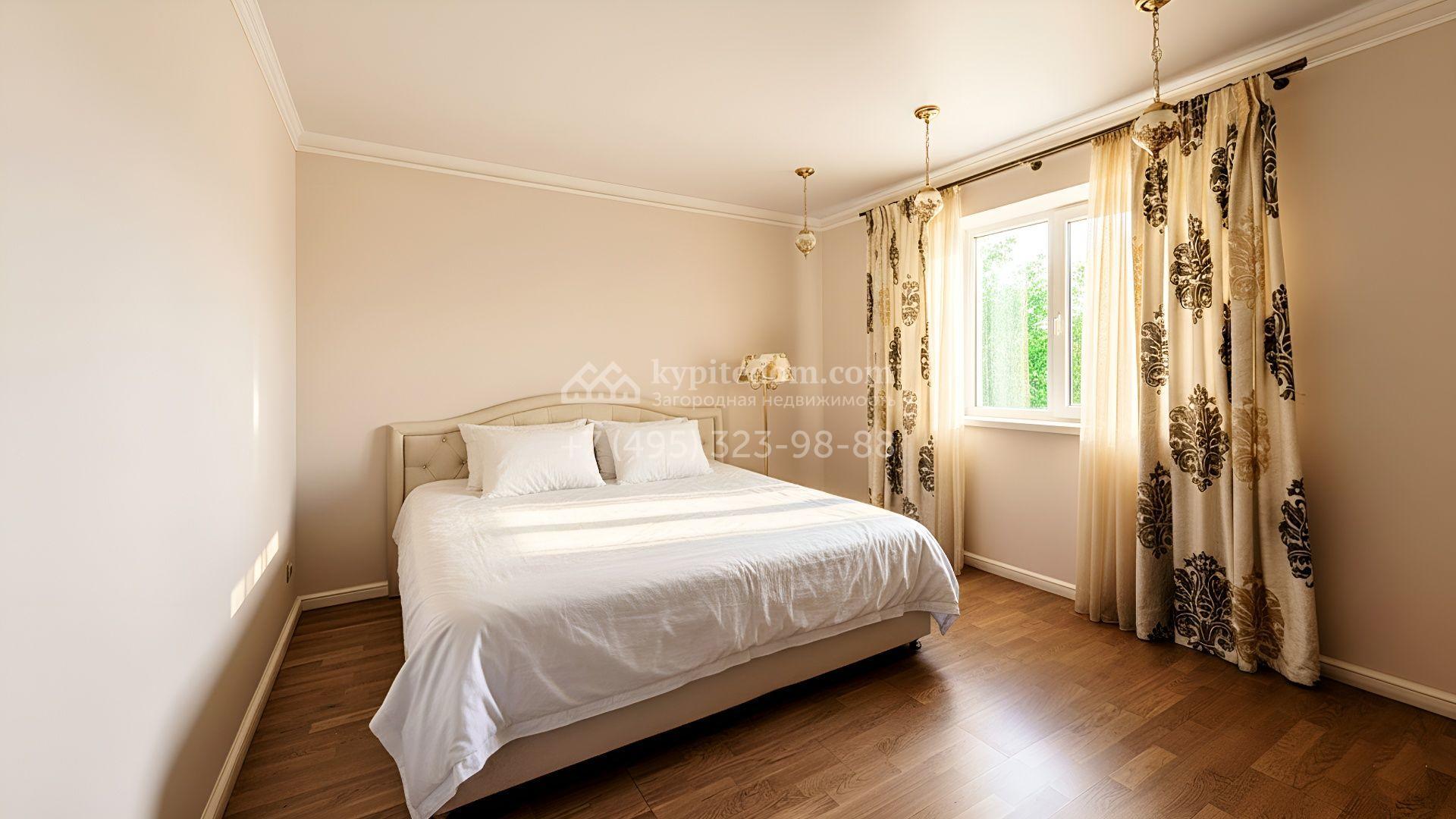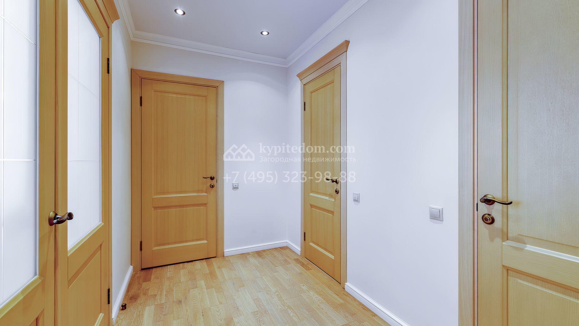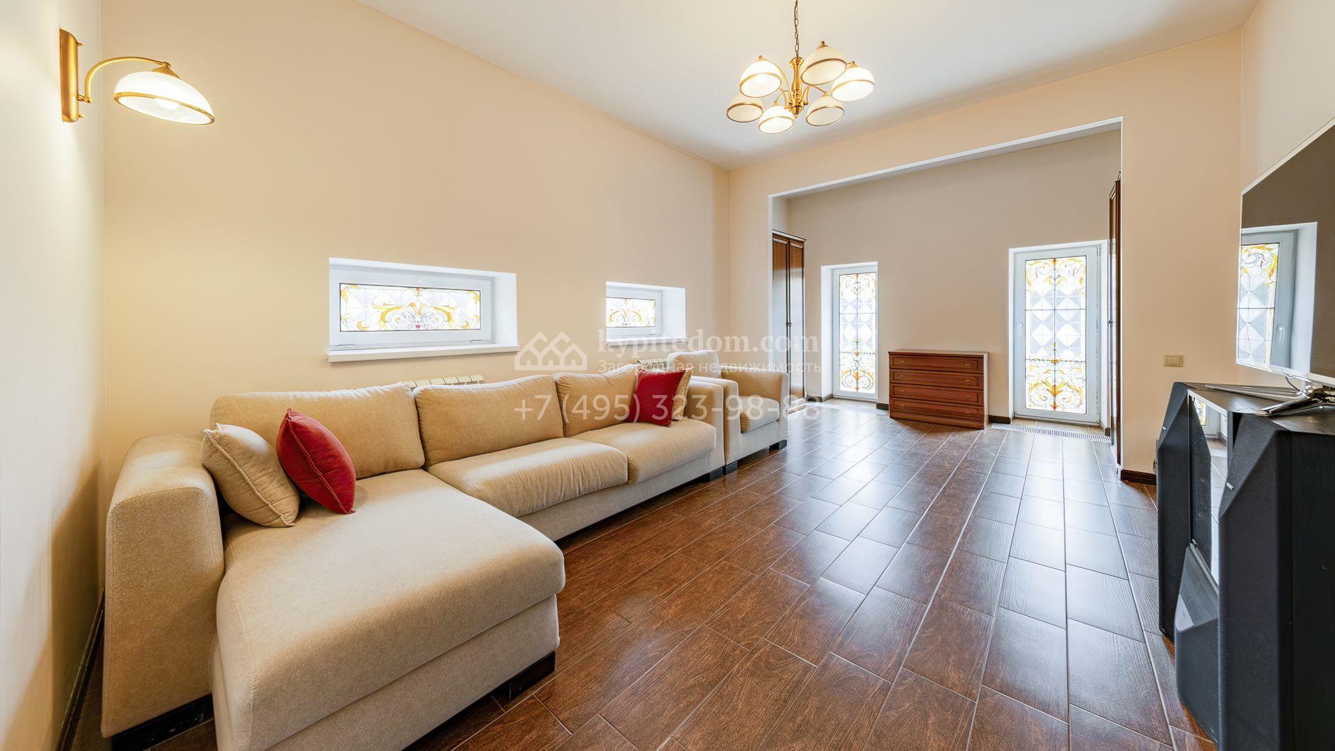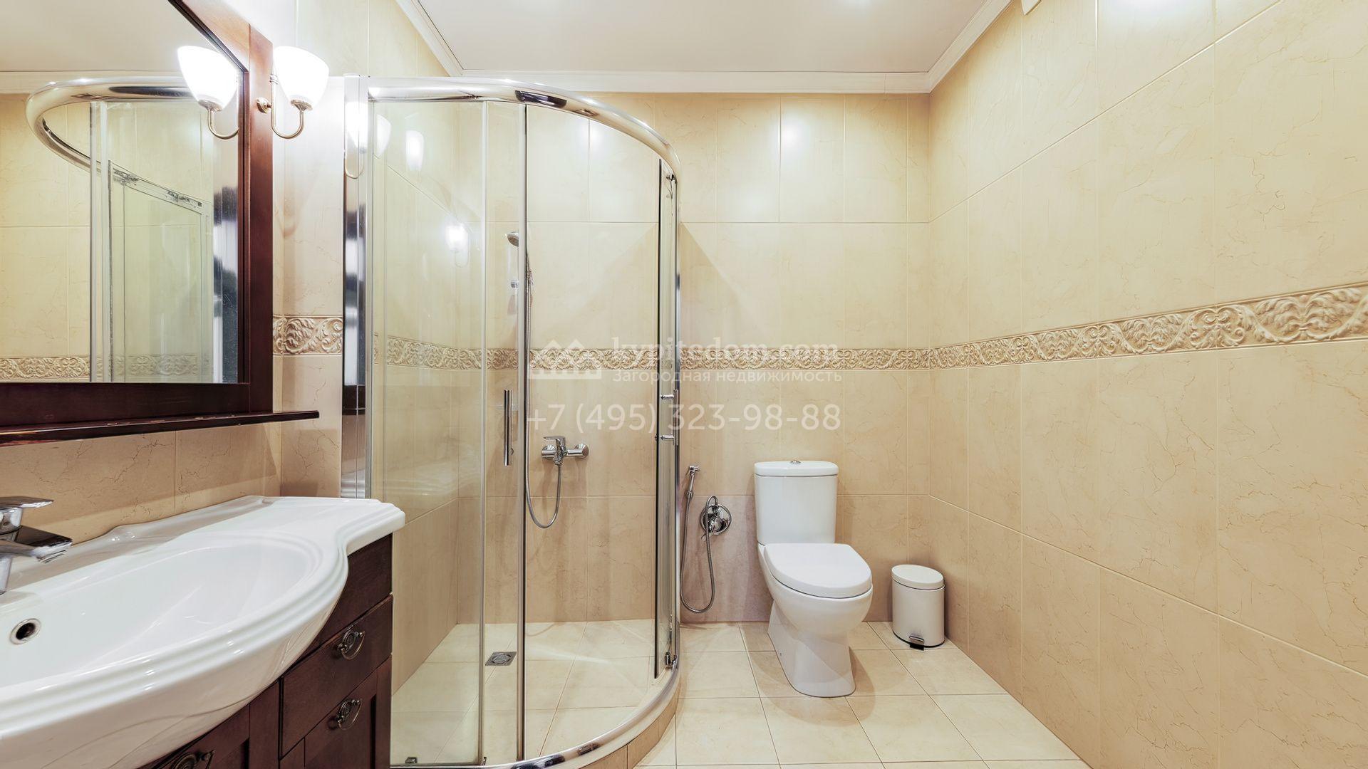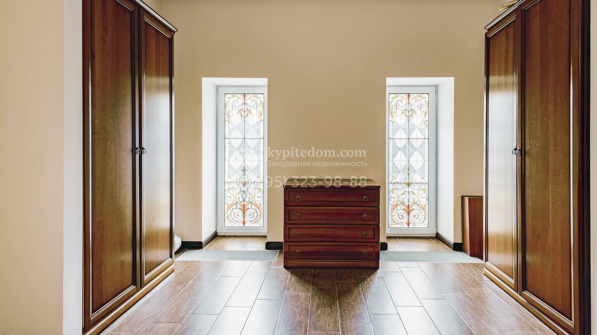 Загородный дом площадью 420 м² расположен на полевом участке 15 соток. Фасад здания облицован бежевым и красным клинкерным кирпичом. В резиденции с отделкой «под ключ» спланировали 4 спальни, кухню-столовую-гостиную, кабинет, зимний сад и террасу, на которой можно обустроить зону барбекю. Рядом расположен гостевой дом с 2-мя спальнями и финской сауной. На участке засеян газон и высажены хвойные деревья.