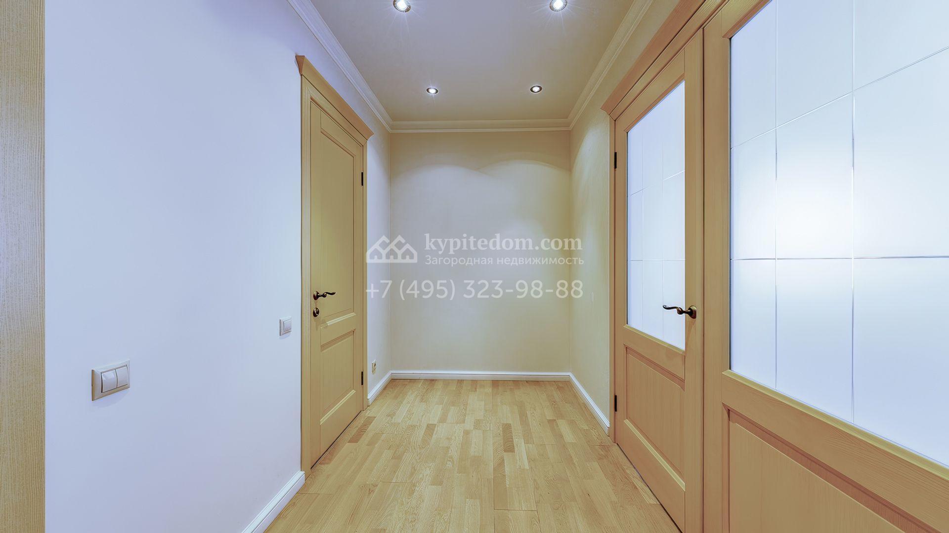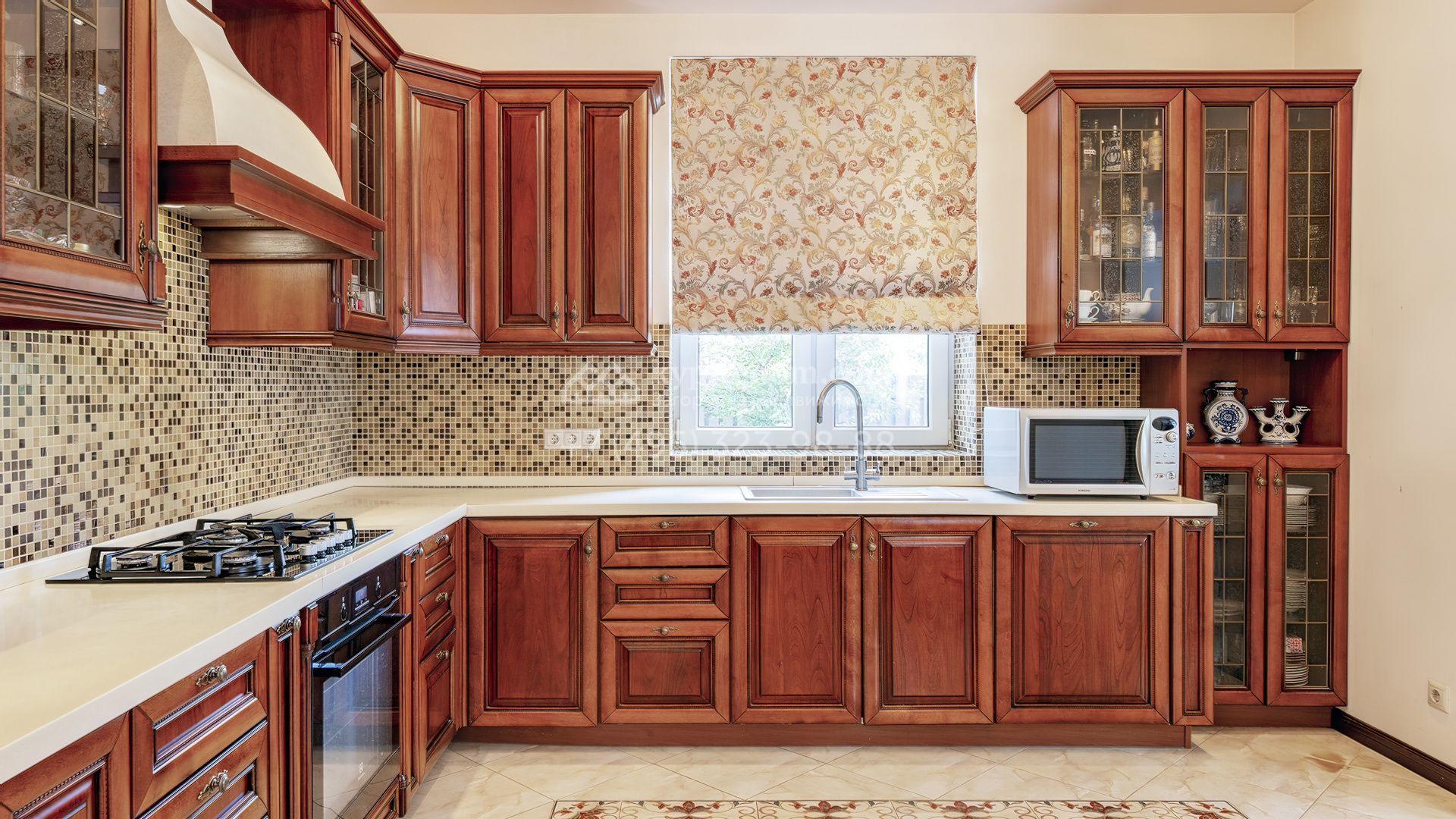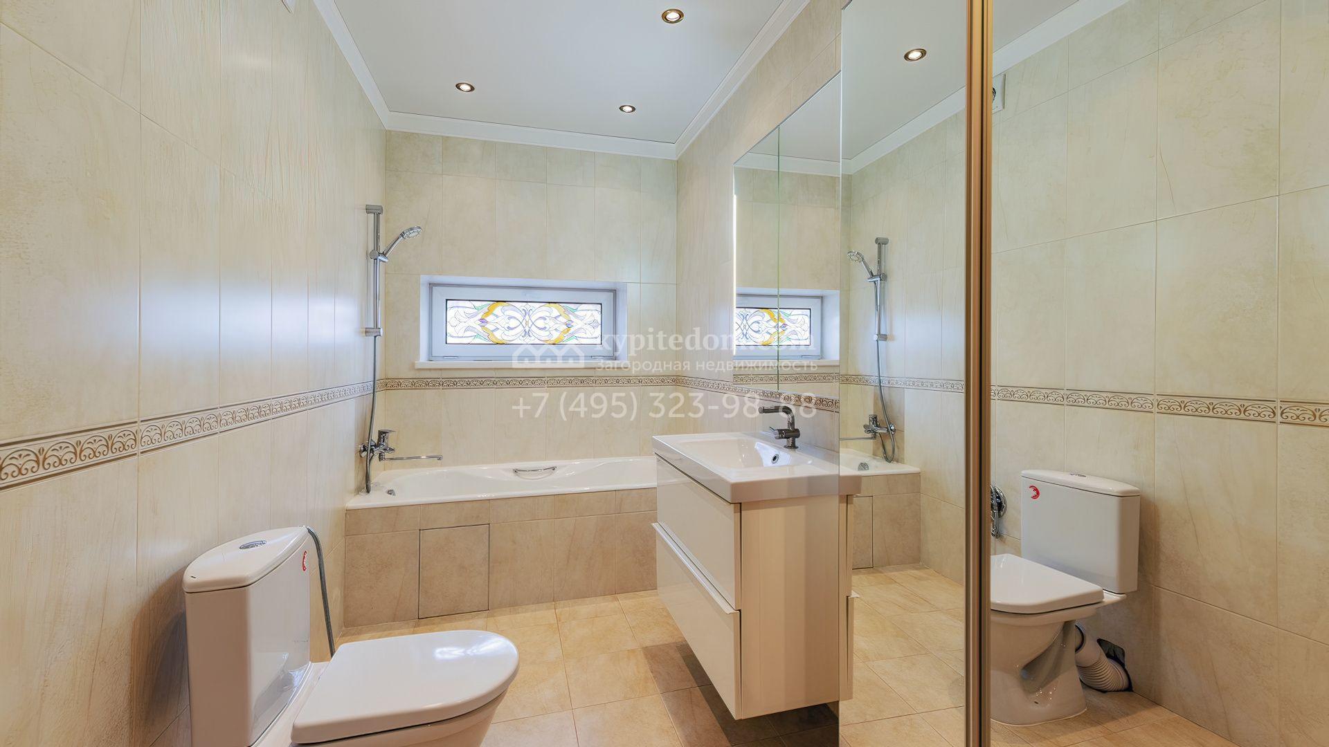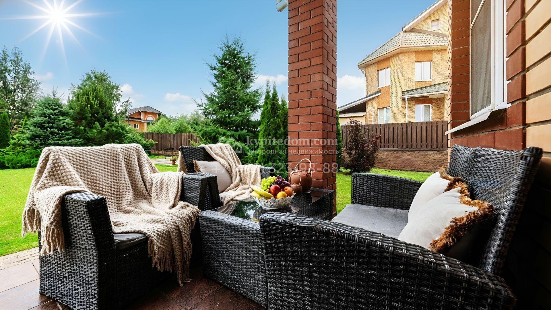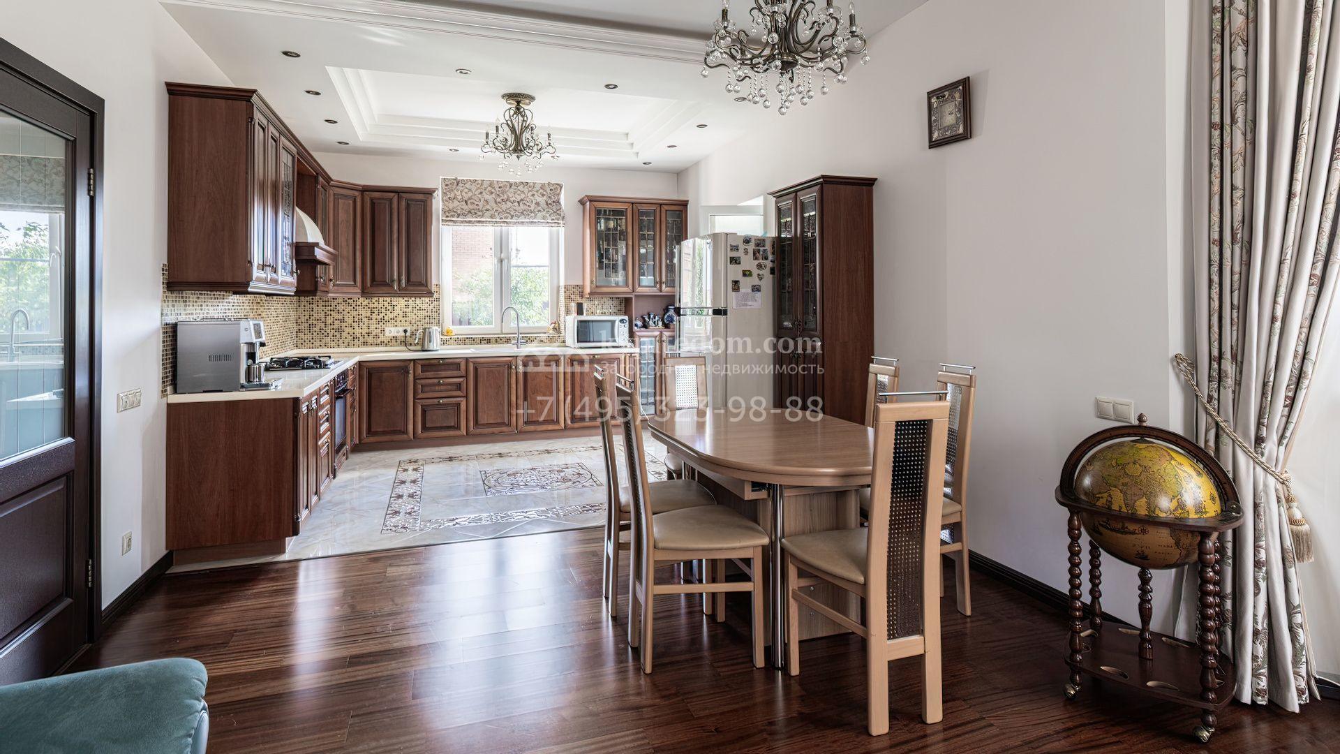 Загородный дом площадью 420 м² расположен на полевом участке 15 соток. Фасад здания облицован бежевым и красным клинкерным кирпичом. В резиденции с отделкой «под ключ» спланировали 4 спальни, кухню-столовую-гостиную, кабинет, зимний сад и террасу, на которой можно обустроить зону барбекю. Рядом расположен гостевой дом с 2-мя спальнями и финской сауной. На участке засеян газон и высажены хвойные деревья.