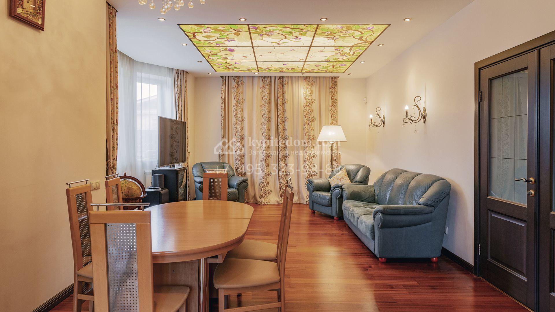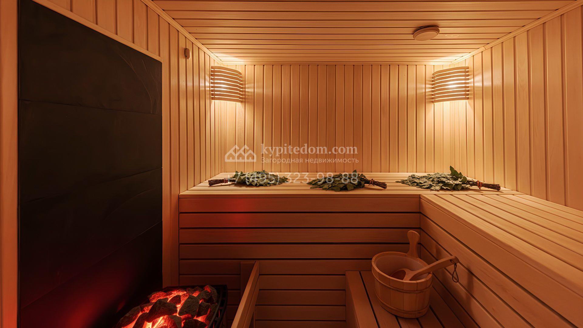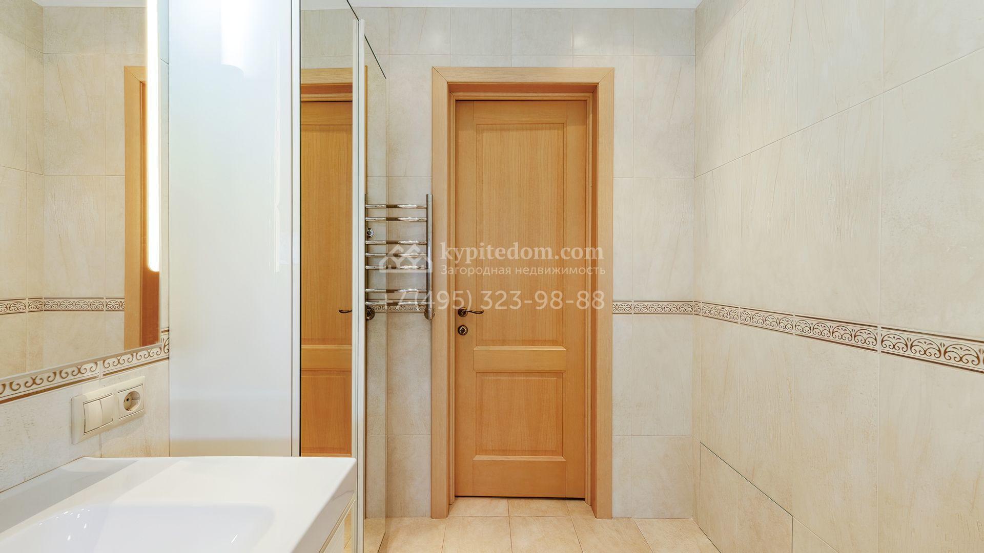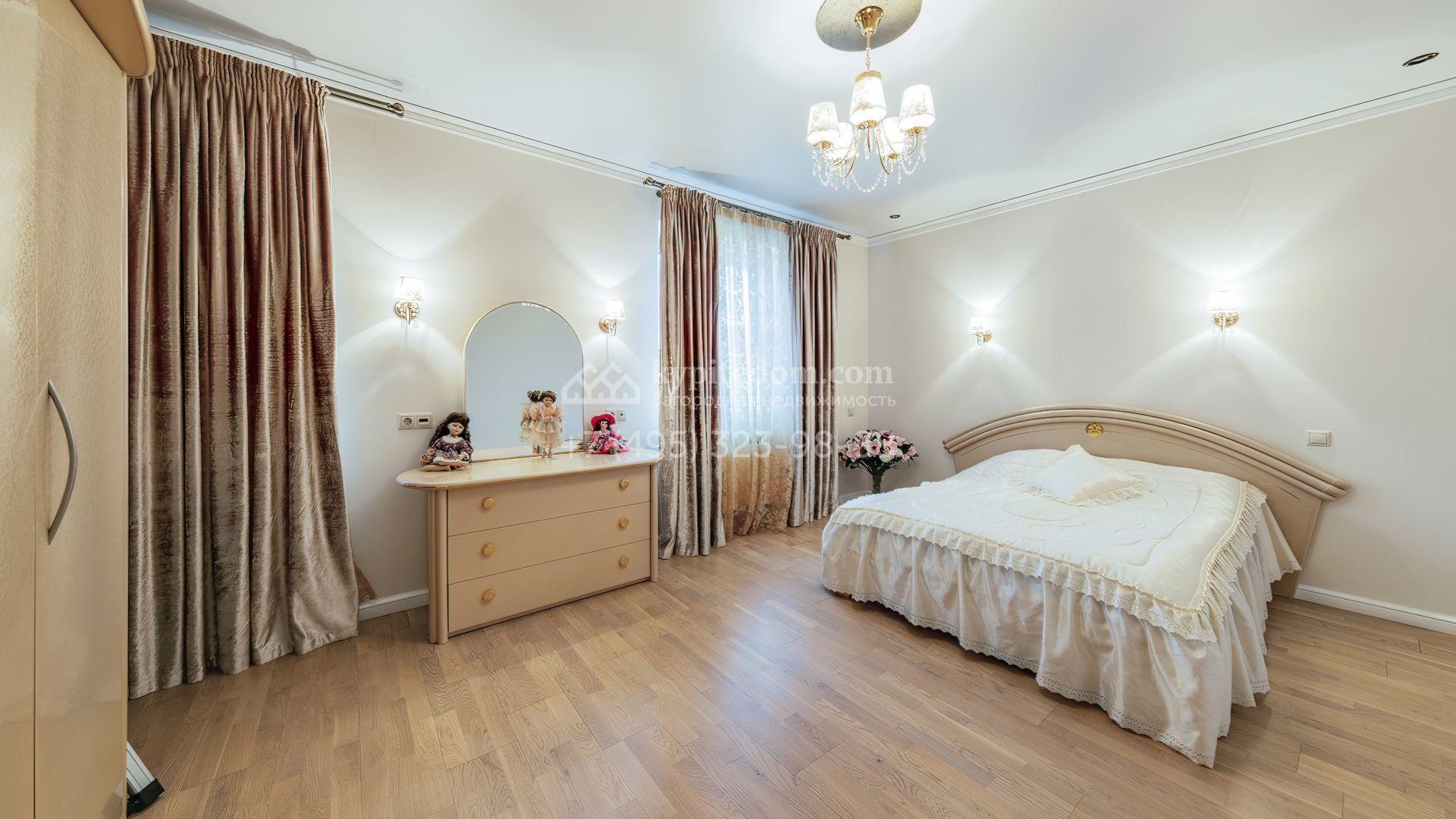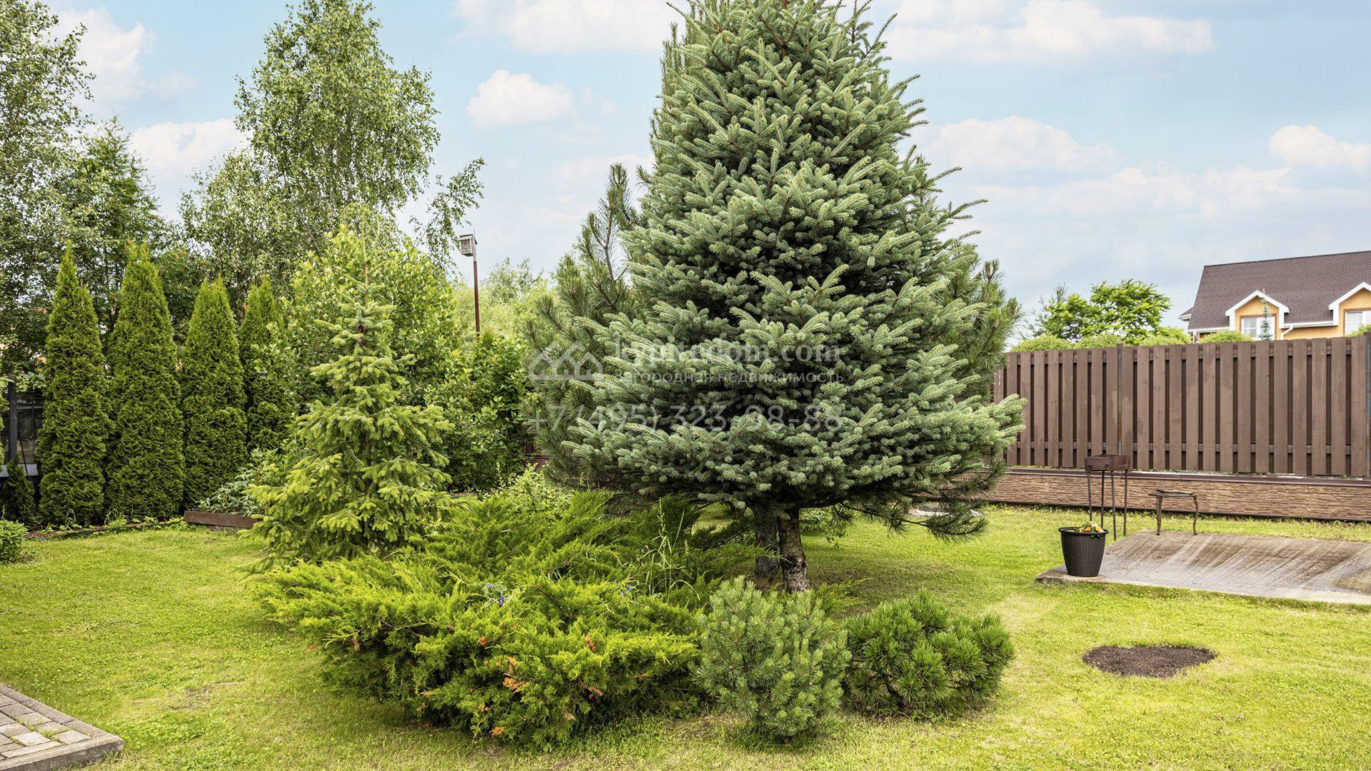 Загородный дом площадью 420 м² расположен на полевом участке 15 соток. Фасад здания облицован бежевым и красным клинкерным кирпичом. В резиденции с отделкой «под ключ» спланировали 4 спальни, кухню-столовую-гостиную, кабинет, зимний сад и террасу, на которой можно обустроить зону барбекю. Рядом расположен гостевой дом с 2-мя спальнями и финской сауной. На участке засеян газон и высажены хвойные деревья.