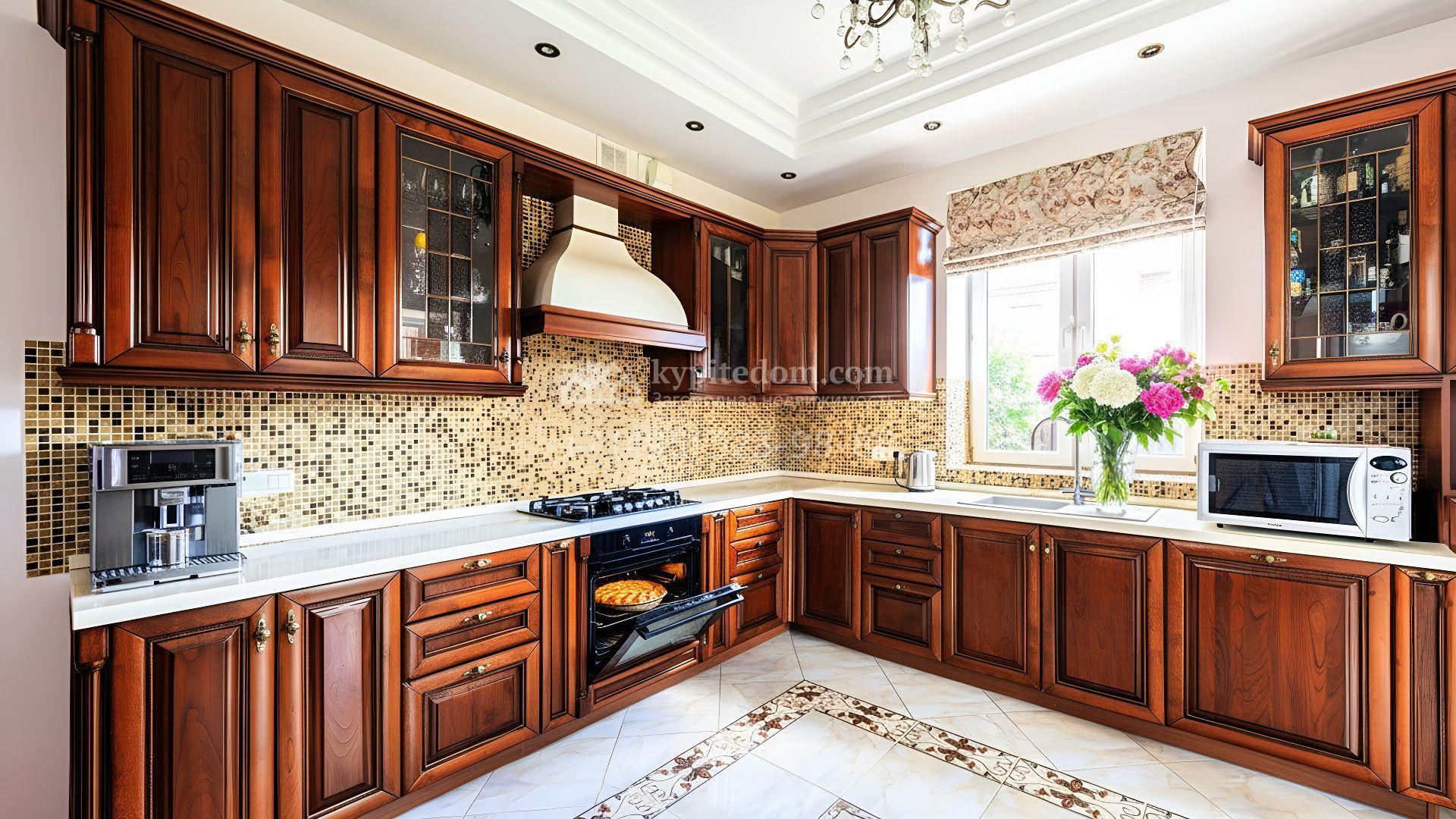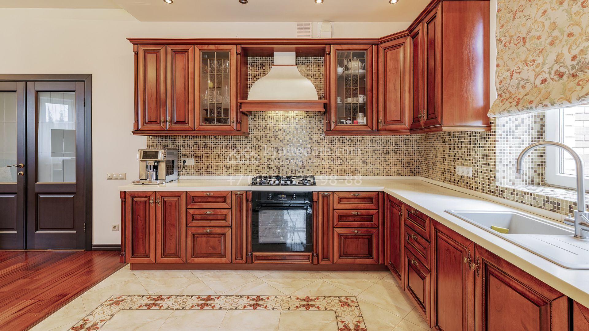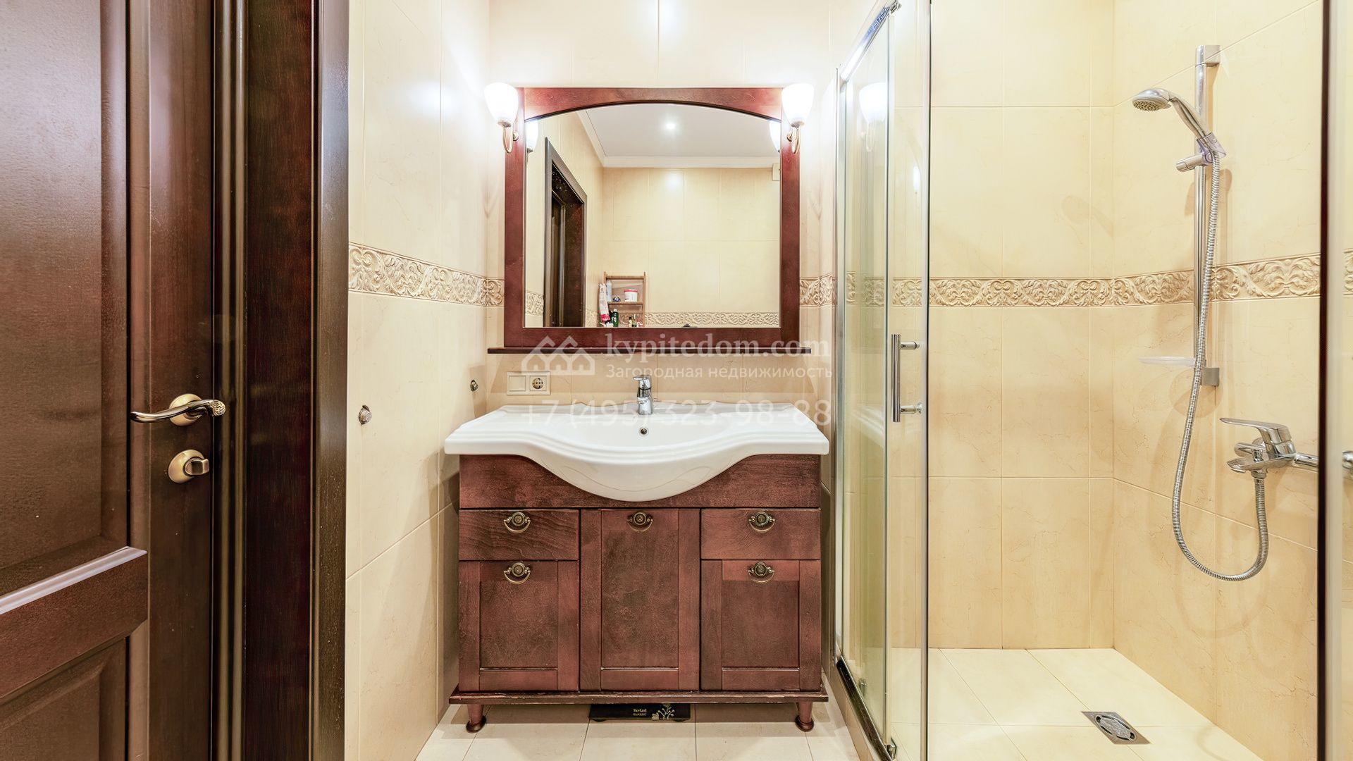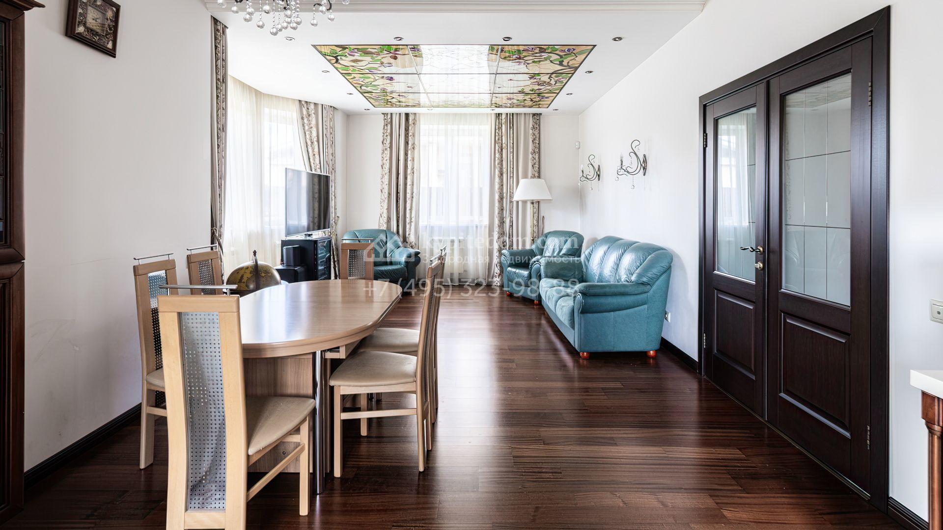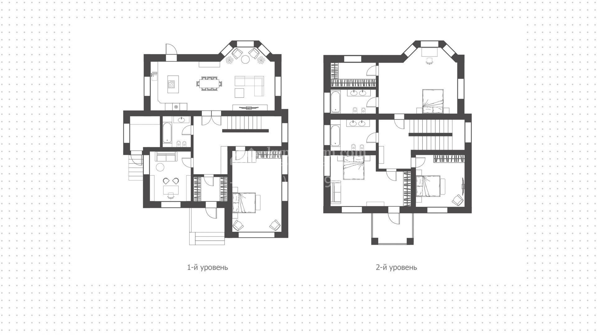 Загородный дом площадью 420 м² расположен на полевом участке 15 соток. Фасад здания облицован бежевым и красным клинкерным кирпичом. В резиденции с отделкой «под ключ» спланировали 4 спальни, кухню-столовую-гостиную, кабинет, зимний сад и террасу, на которой можно обустроить зону барбекю. Рядом расположен гостевой дом с 2-мя спальнями и финской сауной. На участке засеян газон и высажены хвойные деревья.