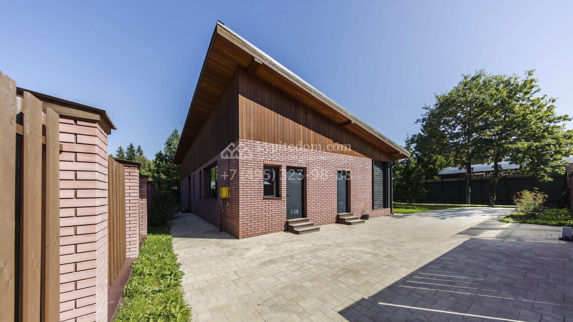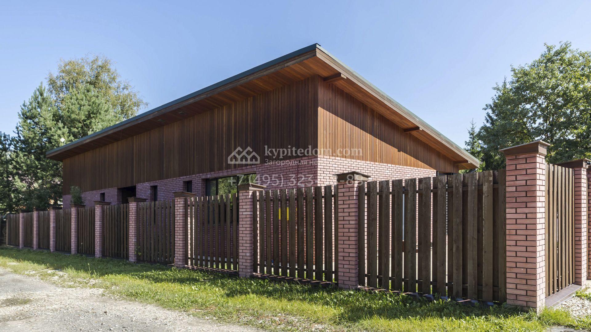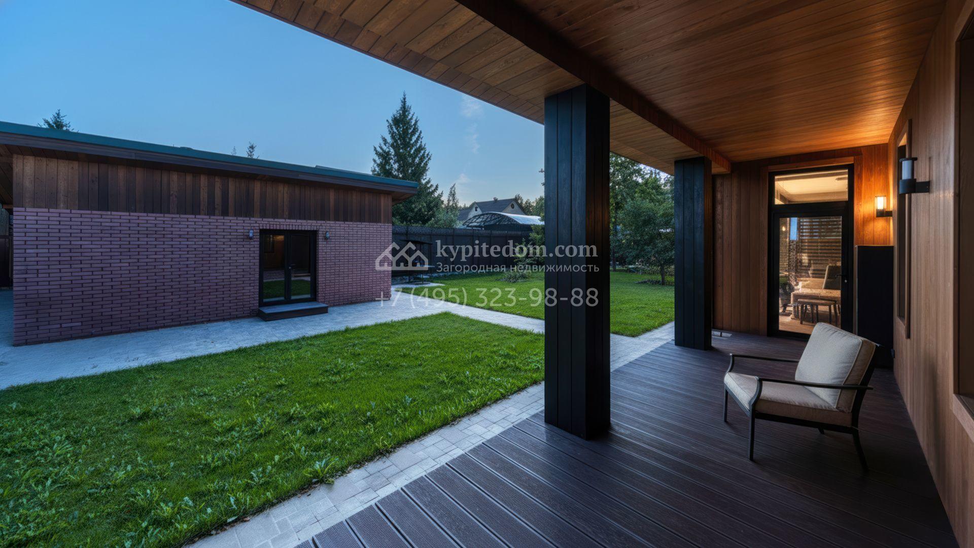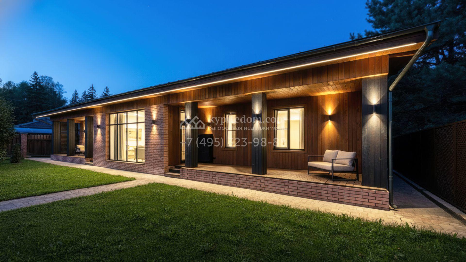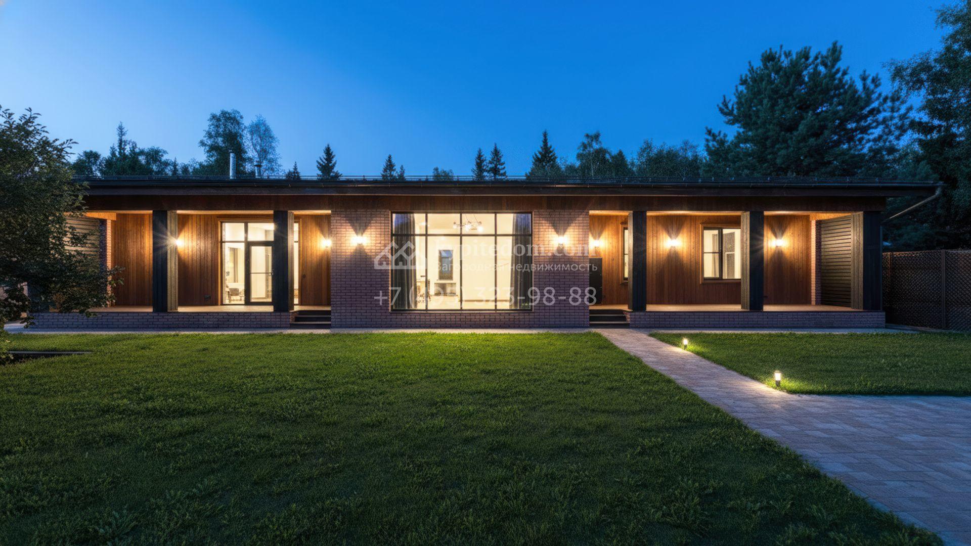 Загородный дом площадью 167 м² построен на уютном полевом участке 8 соток. Одноэтажный фасад здания выполнен в современном стиле, облицован красным клинкерным кирпичом и деревом, а также декорирован подсветкой. Благодаря панорамным окнам пространство наполнено воздухом и светом. В отделке лаконичного интерьера сочетаются молочные оттенки с фактурой темного дерева. Планировка дома включает 4 спальни, кухню-гостиную, укомплектованную встроенными гарнитуром и бытовой техникой премиум-класса, и просторную террасу, разделенную на 2 части. На участке расположена отдельностоящая баня с комнатой отдыха и оборудован паркинг на 4 машины, вымощенный брусчаткой.