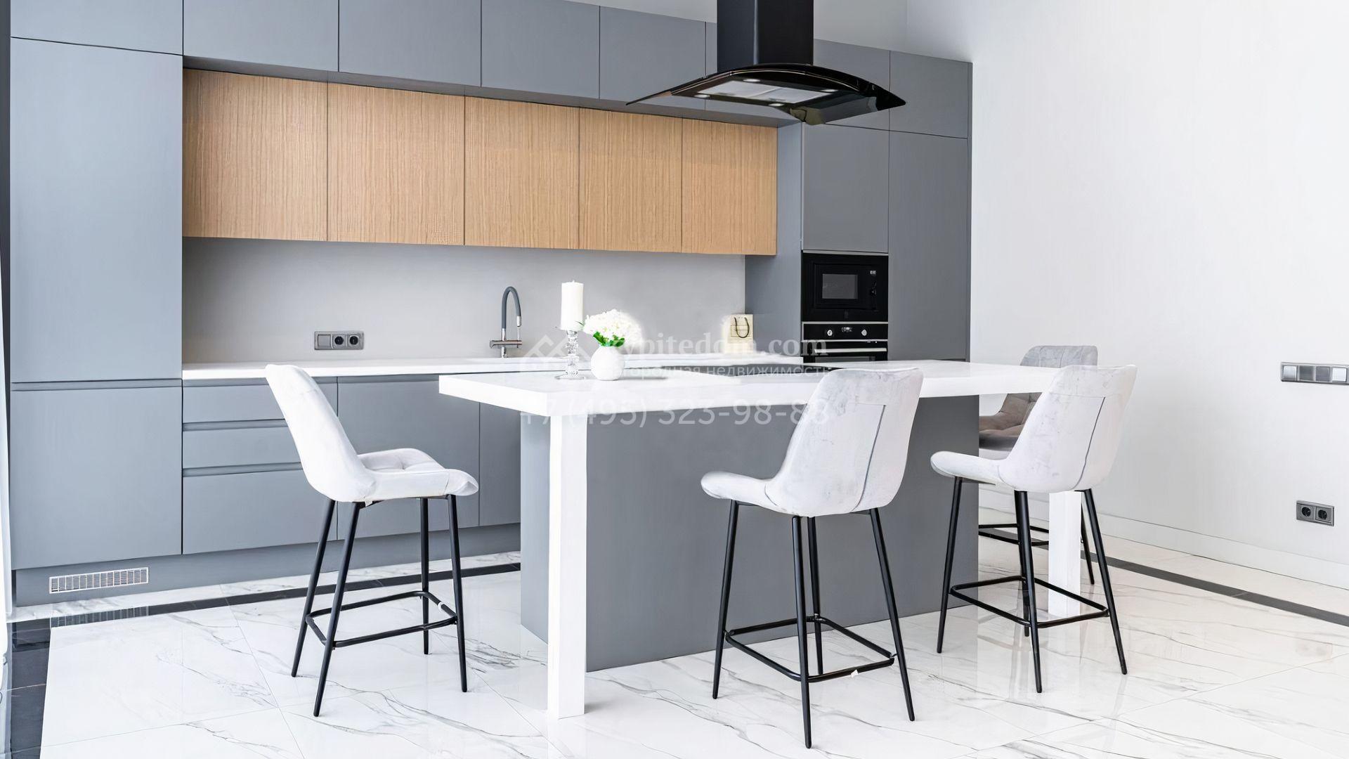 Загородный дом площадью 300 м² построен на уютном полевом участке 6 соток. Благодаря большим панорамным окнам и высоким потолкам внутреннее пространство наполнено воздухом и светом. Интерьер выдержан в современном стиле с использованием белых и серых оттенков в сочетании с фактурой камня и дерева. В коттедже разместили 4 спальни, просторную кухню-столовую-гостиную и кабинет. На участке можно обустроить беседку с зоной барбекю, а также организовать навес для машины на въезде.