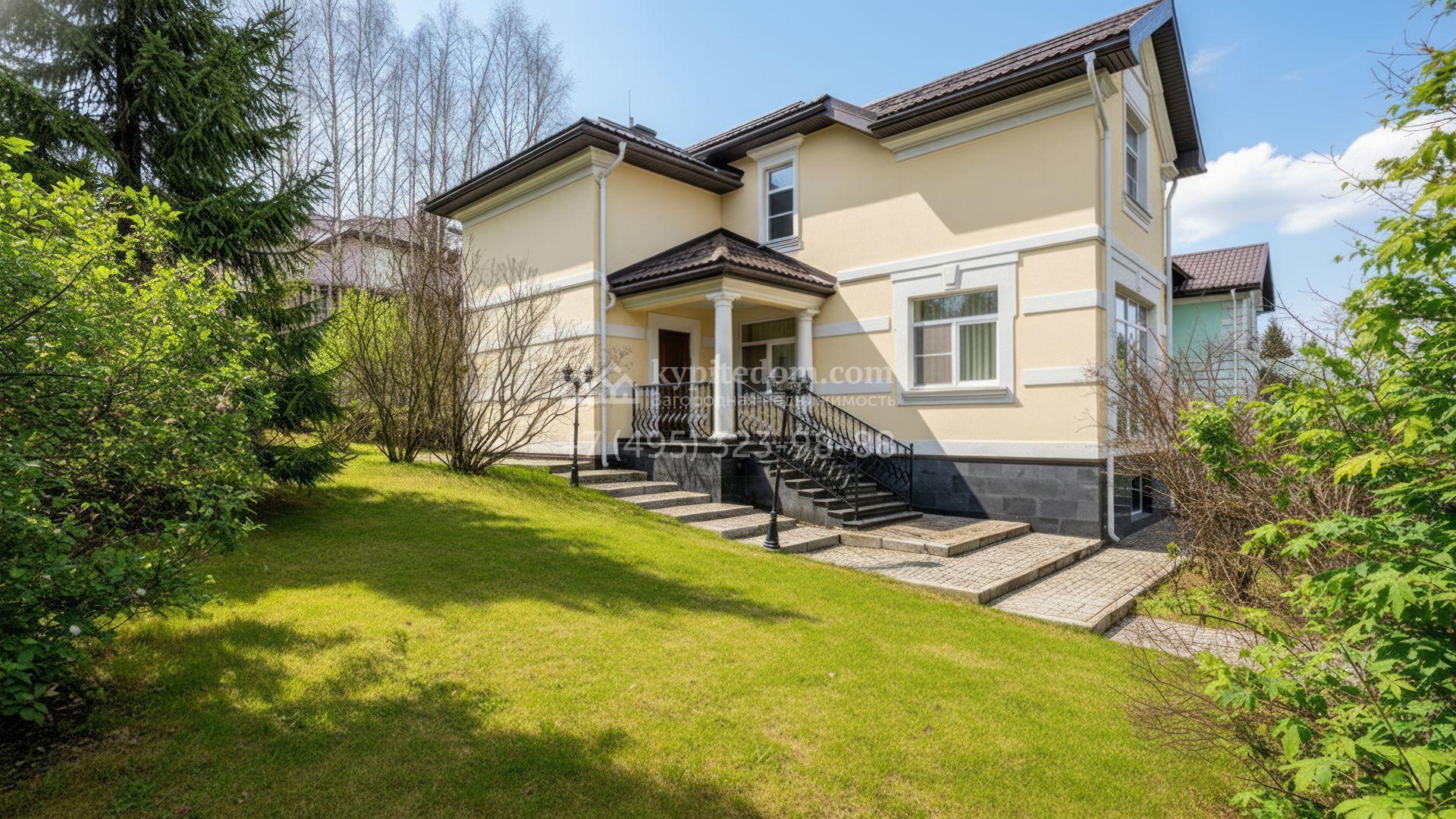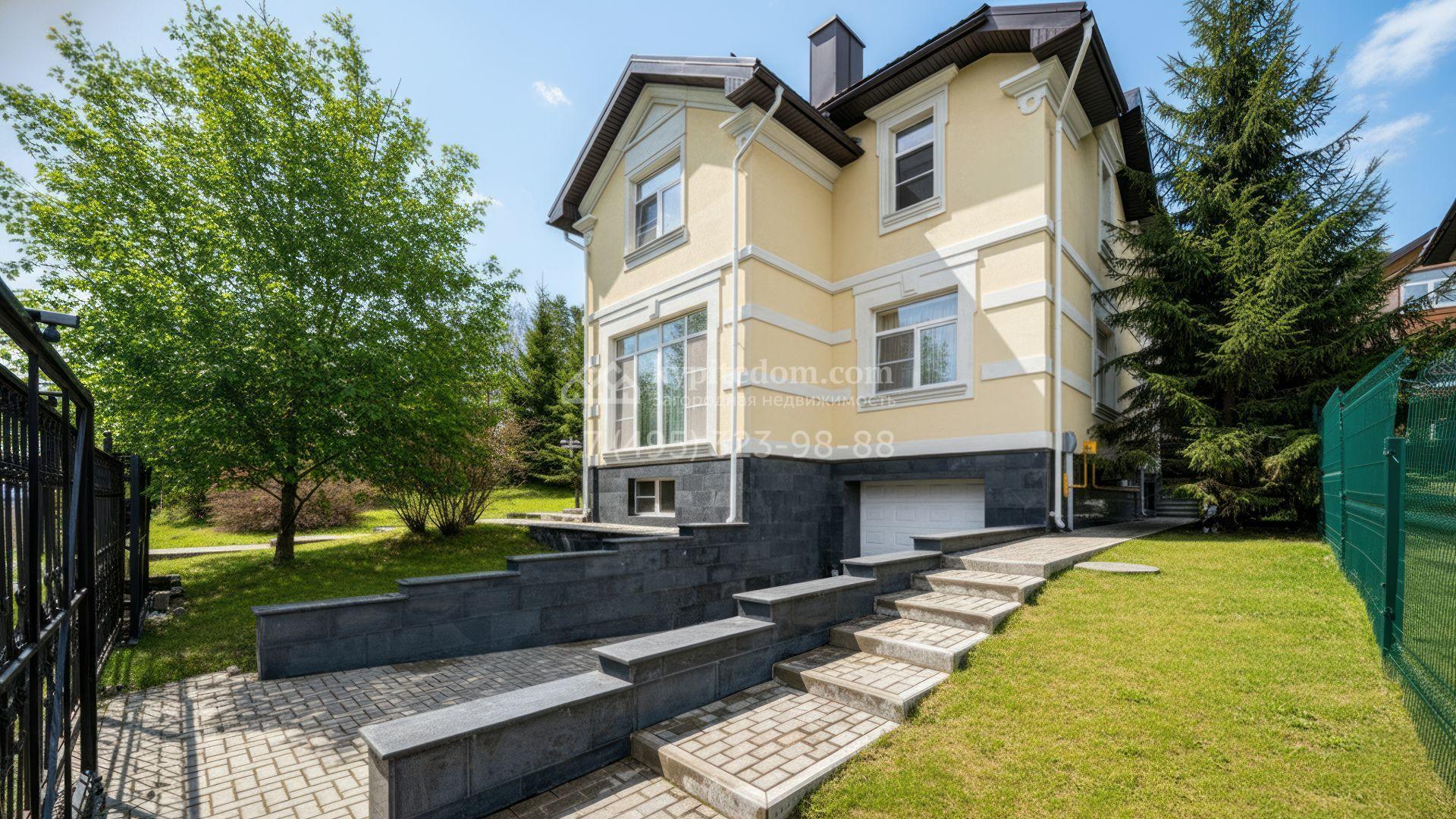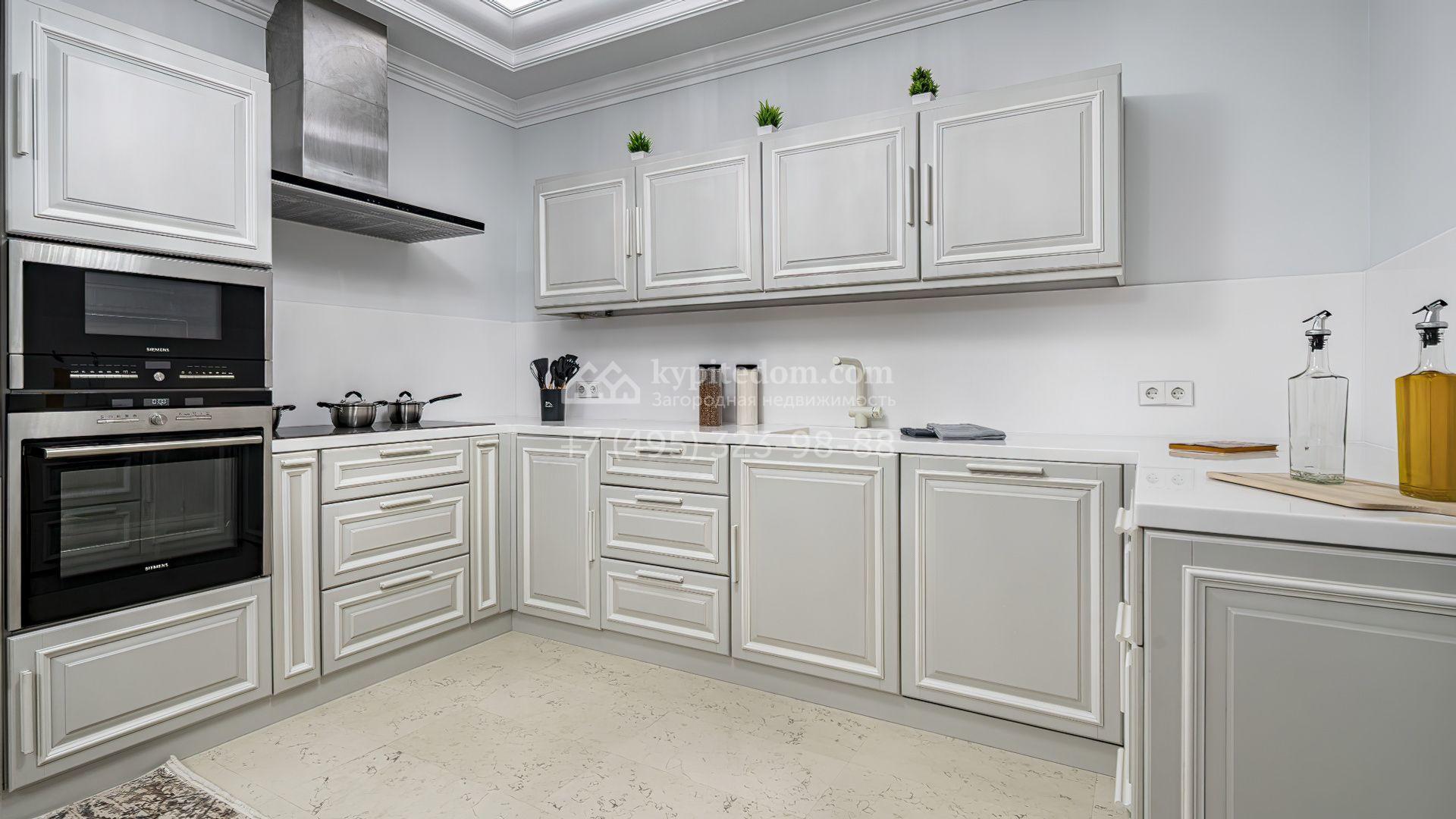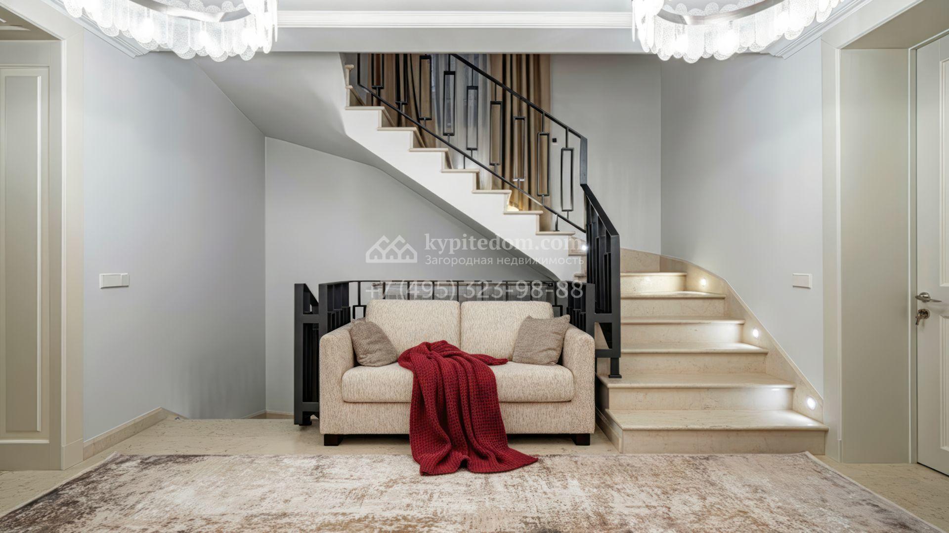 Загородный дом площадью 300 м² расположен на полевом участке 8 соток. Фасад выполнен в неоклассическом стиле и облицован кремовой штукатуркой и плиткой с фактурой камня по цоколю. Светлый интерьер выполнен по дизайн-проекту с использованием премиальных материалов, дополнен мебелью, бытовой техникой и сантехникой.