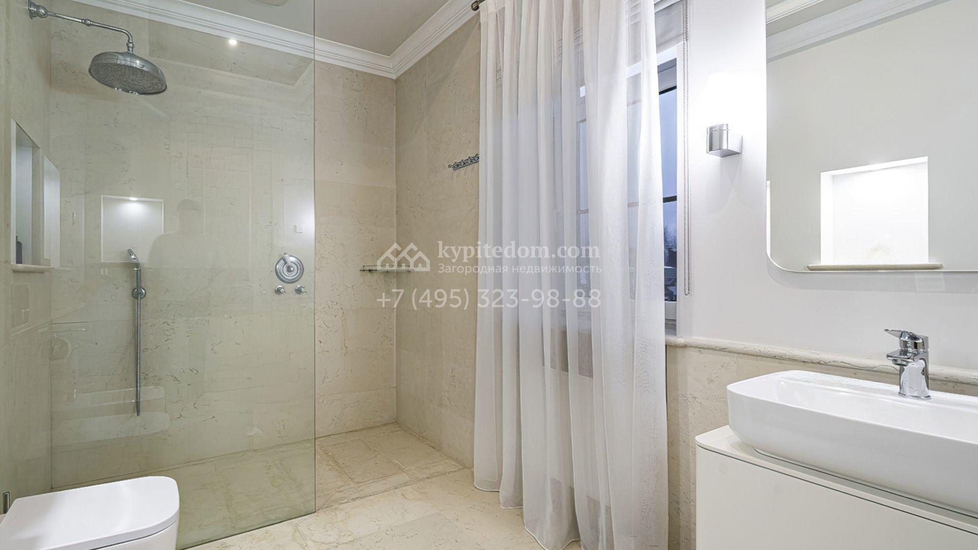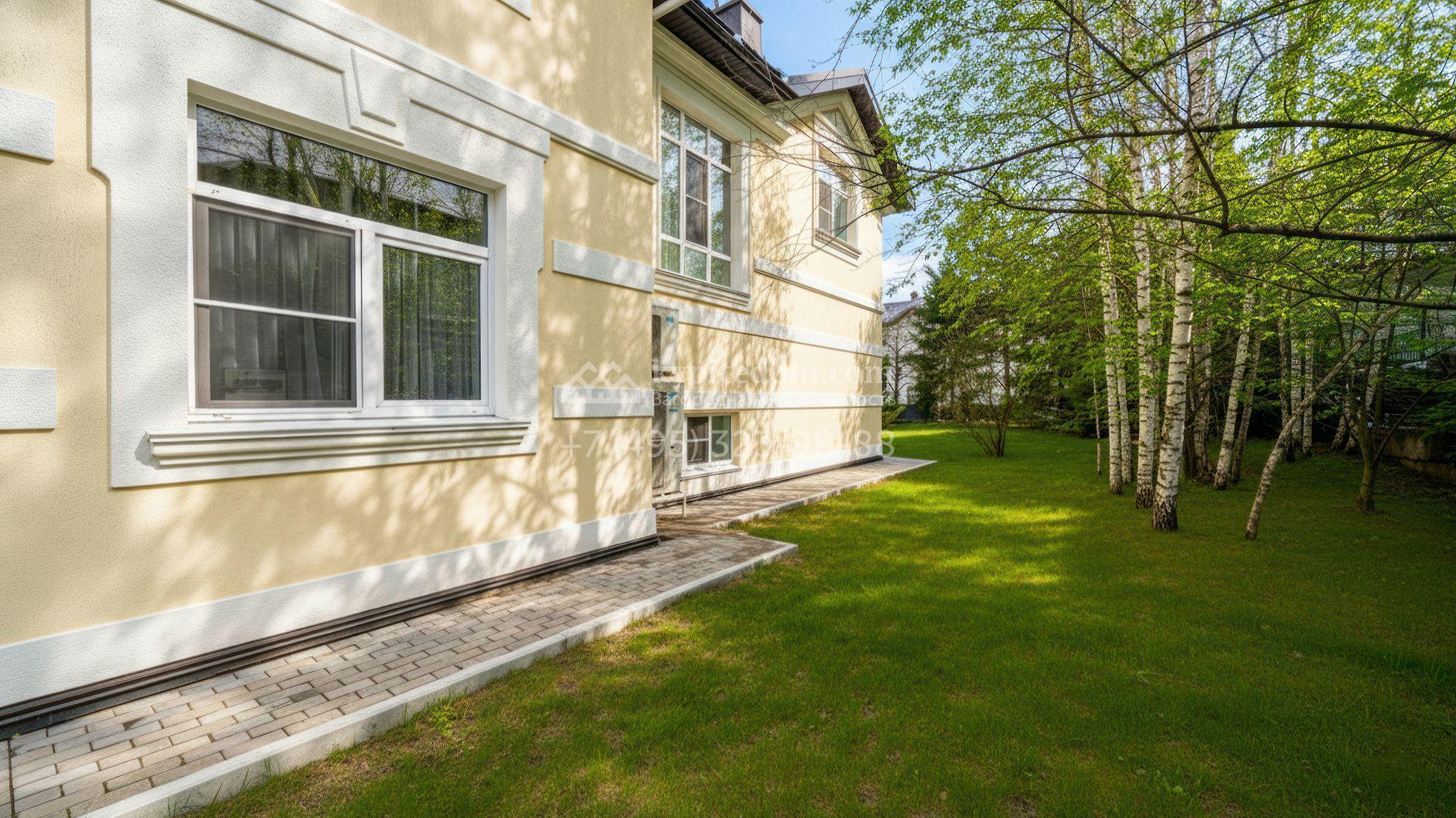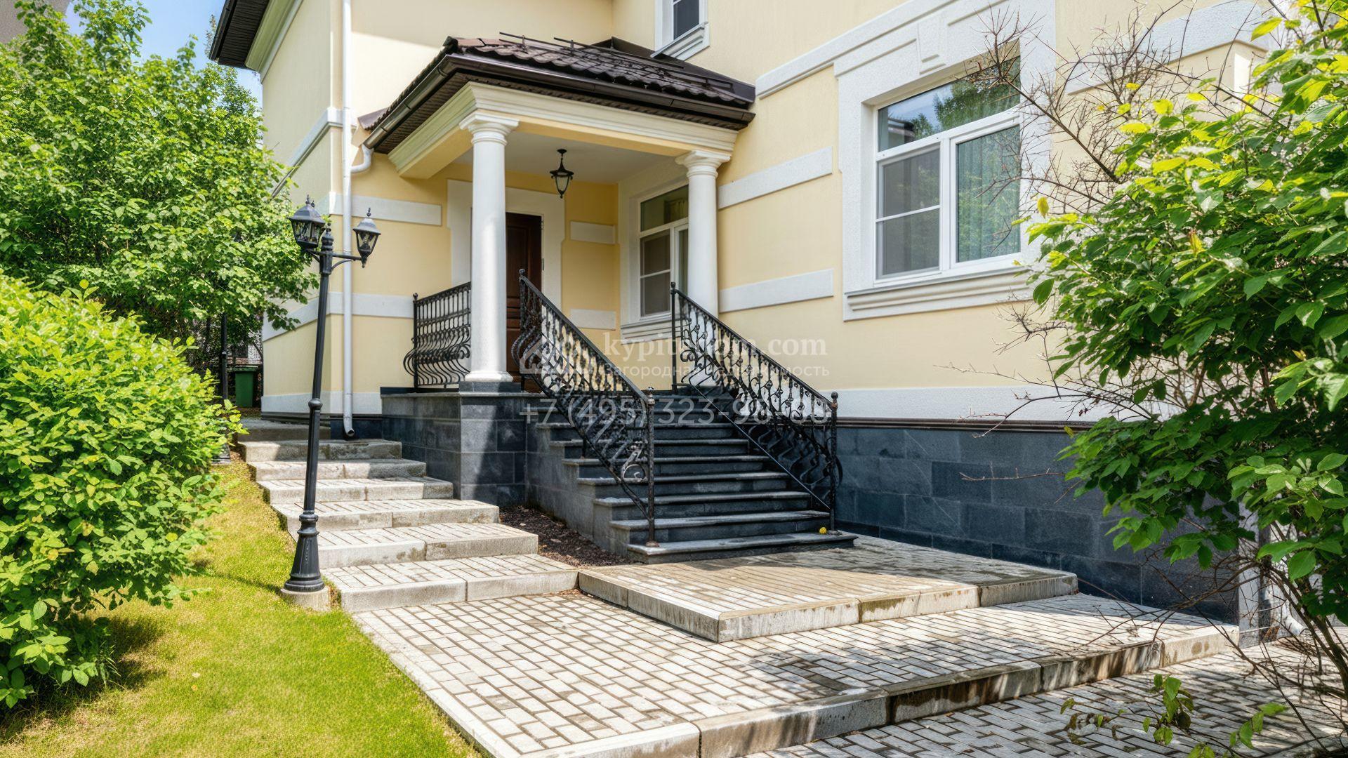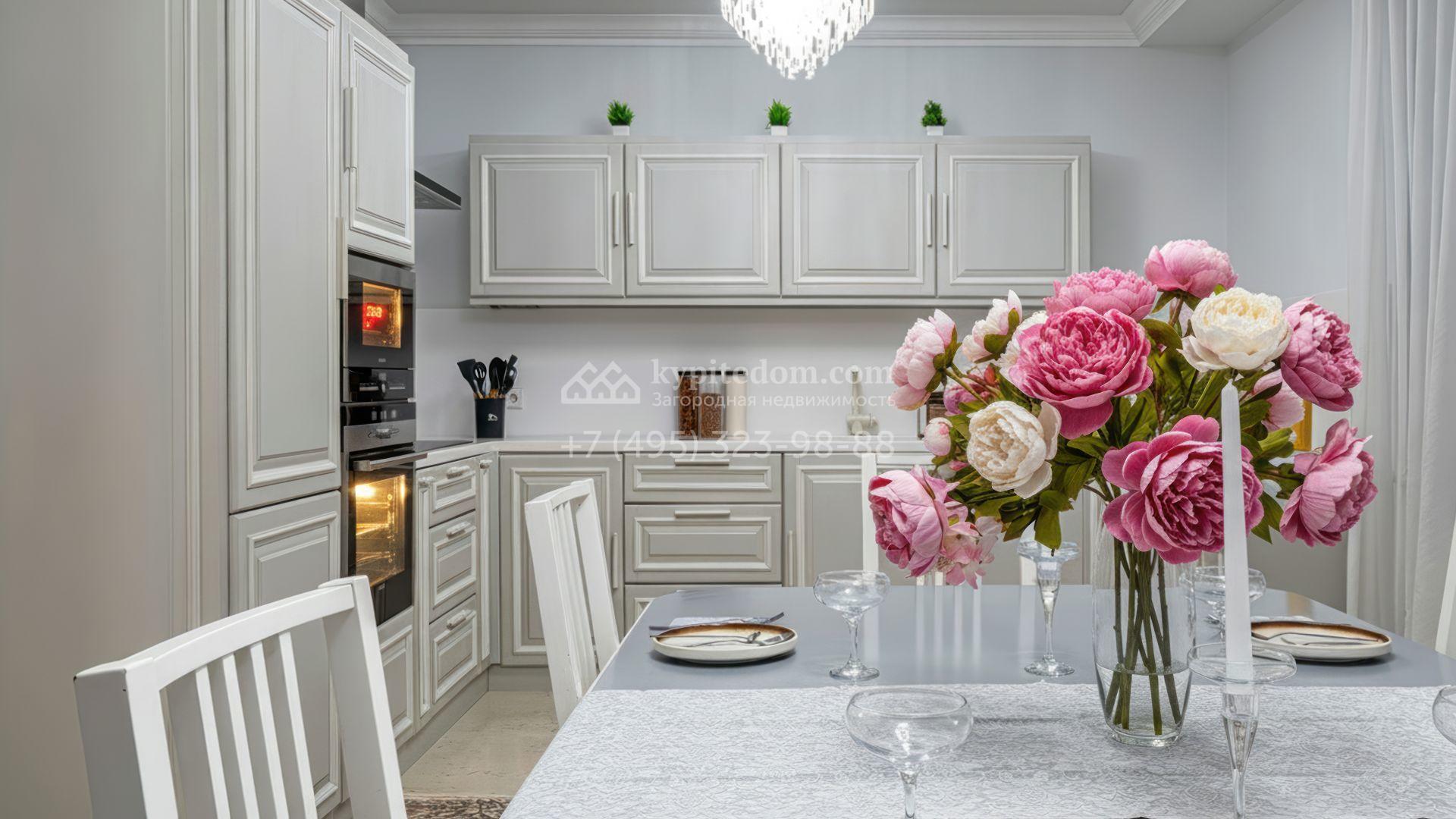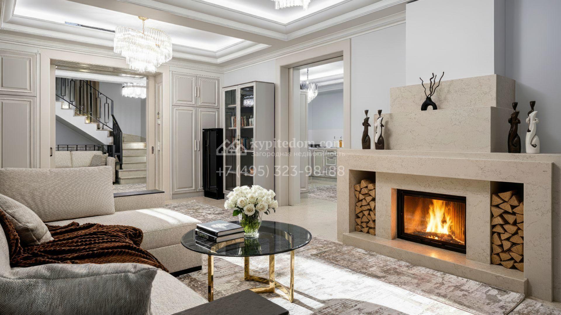 Загородный дом площадью 300 м² расположен на полевом участке 8 соток. Фасад выполнен в неоклассическом стиле и облицован кремовой штукатуркой и плиткой с фактурой камня по цоколю. Светлый интерьер выполнен по дизайн-проекту с использованием премиальных материалов, дополнен мебелью, бытовой техникой и сантехникой.