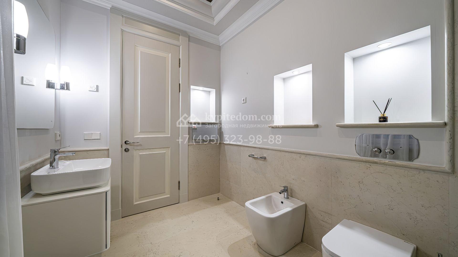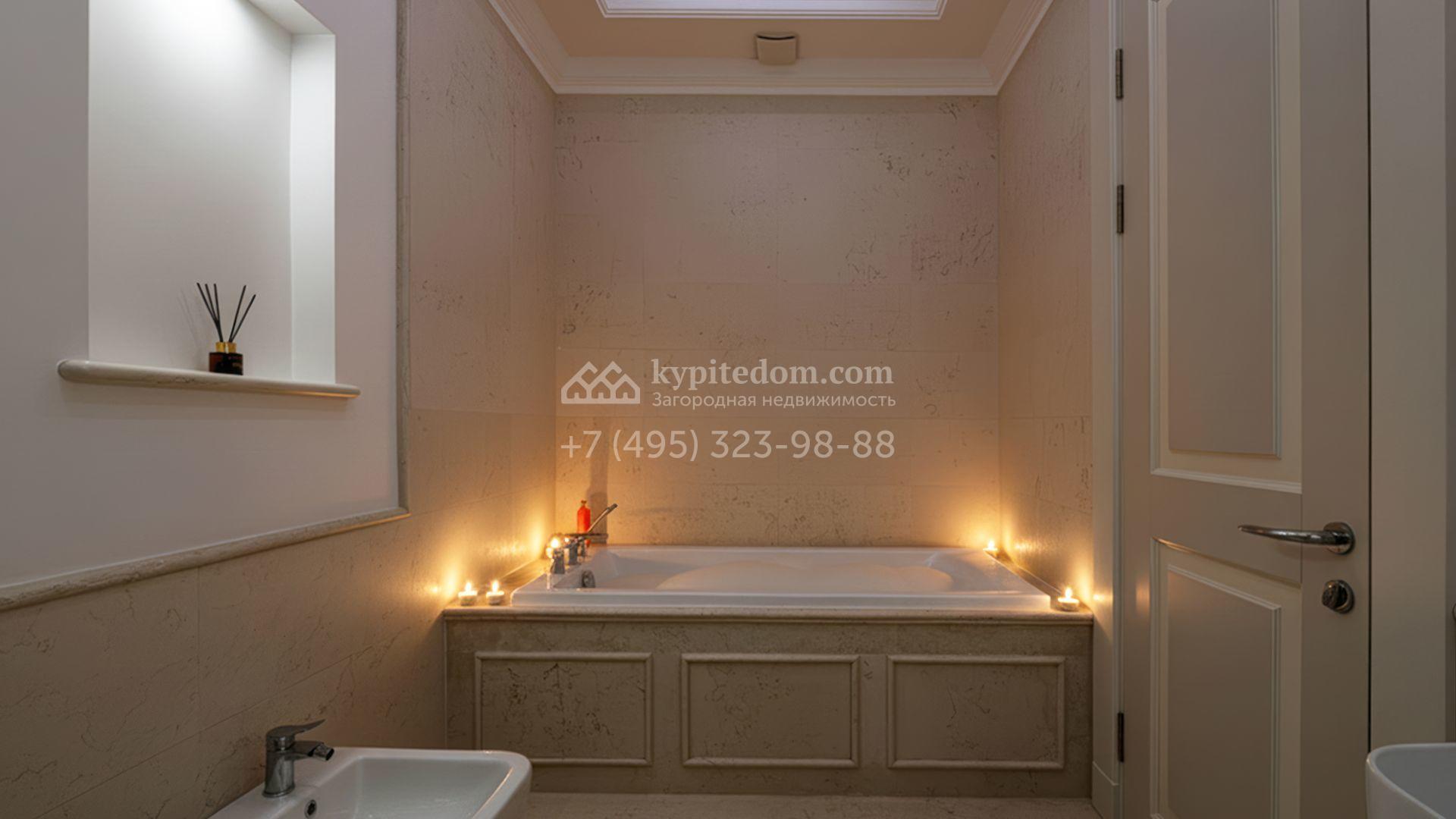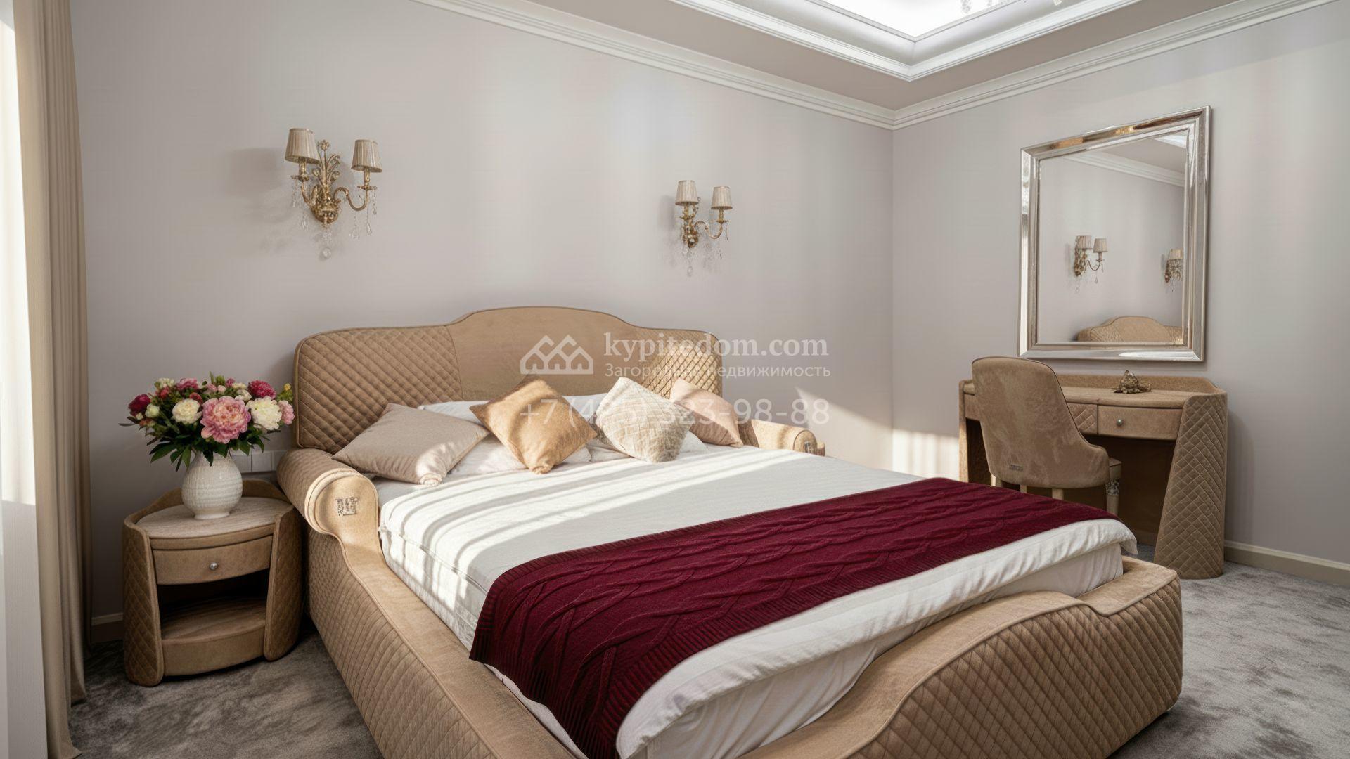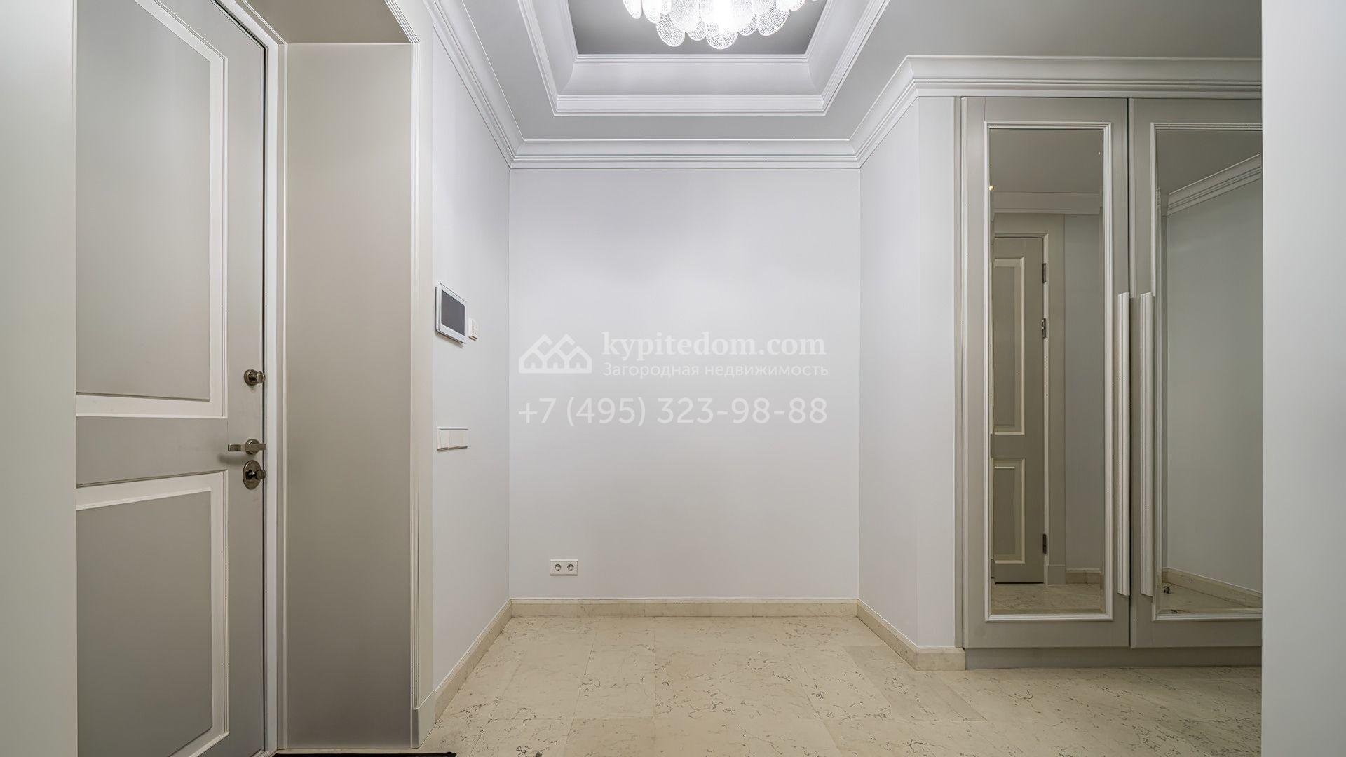 Загородный дом площадью 300 м² расположен на полевом участке 8 соток. Фасад выполнен в неоклассическом стиле и облицован кремовой штукатуркой и плиткой с фактурой камня по цоколю. Светлый интерьер выполнен по дизайн-проекту с использованием премиальных материалов, дополнен мебелью, бытовой техникой и сантехникой.