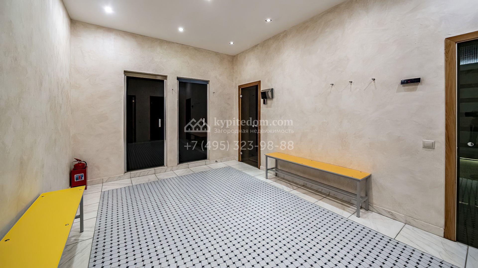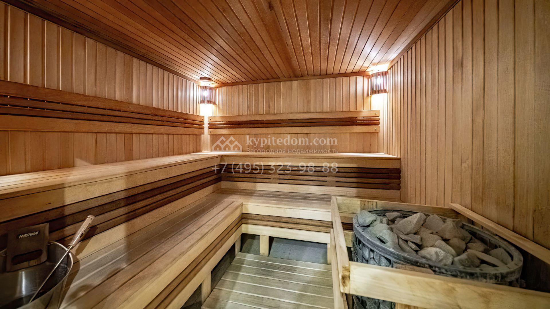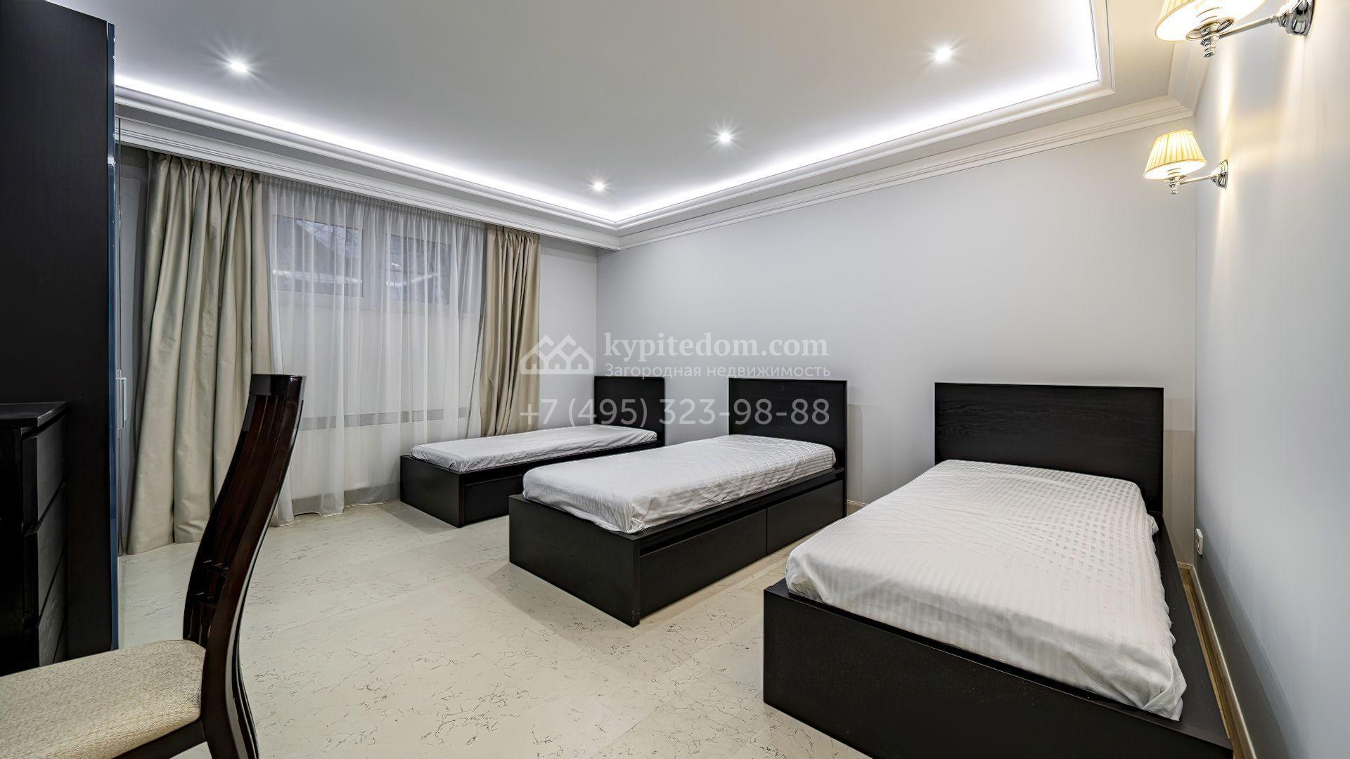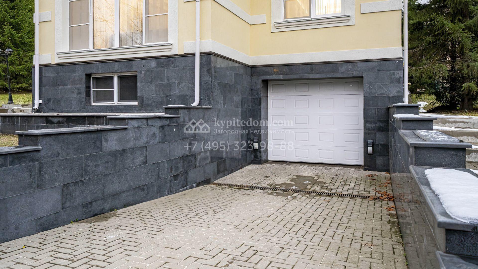В трехуровневом коттедже спланировали просторную гостиную, кухню-столовую, 4 спальни, хаммам, баню и комнату для персонала. Также в контуре дома предусмотрен гараж, всего на территории 3 машиноместа. На огороженном участке засеян газон, растут лесные деревья и кустарники, вдоль вымощенных дорожек оборудовано уличное освещение.