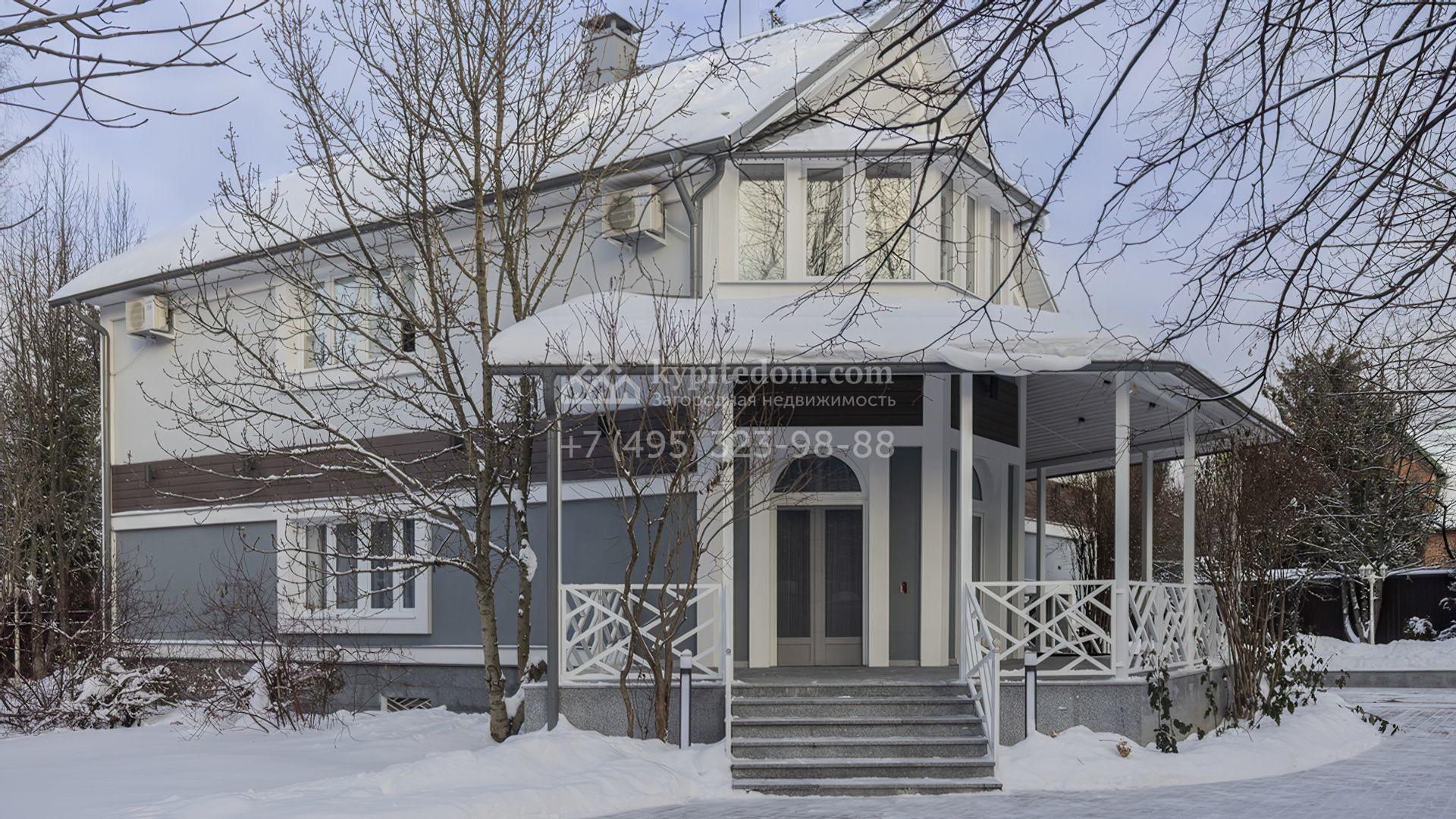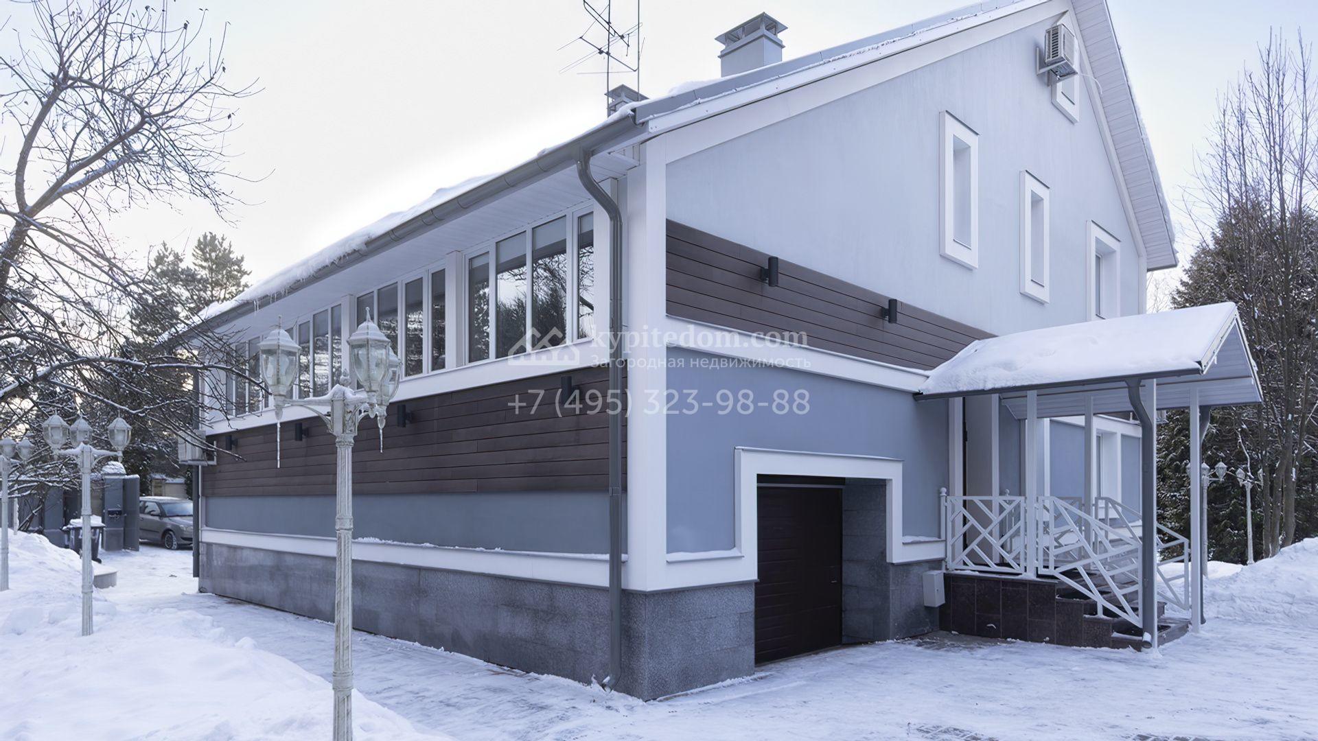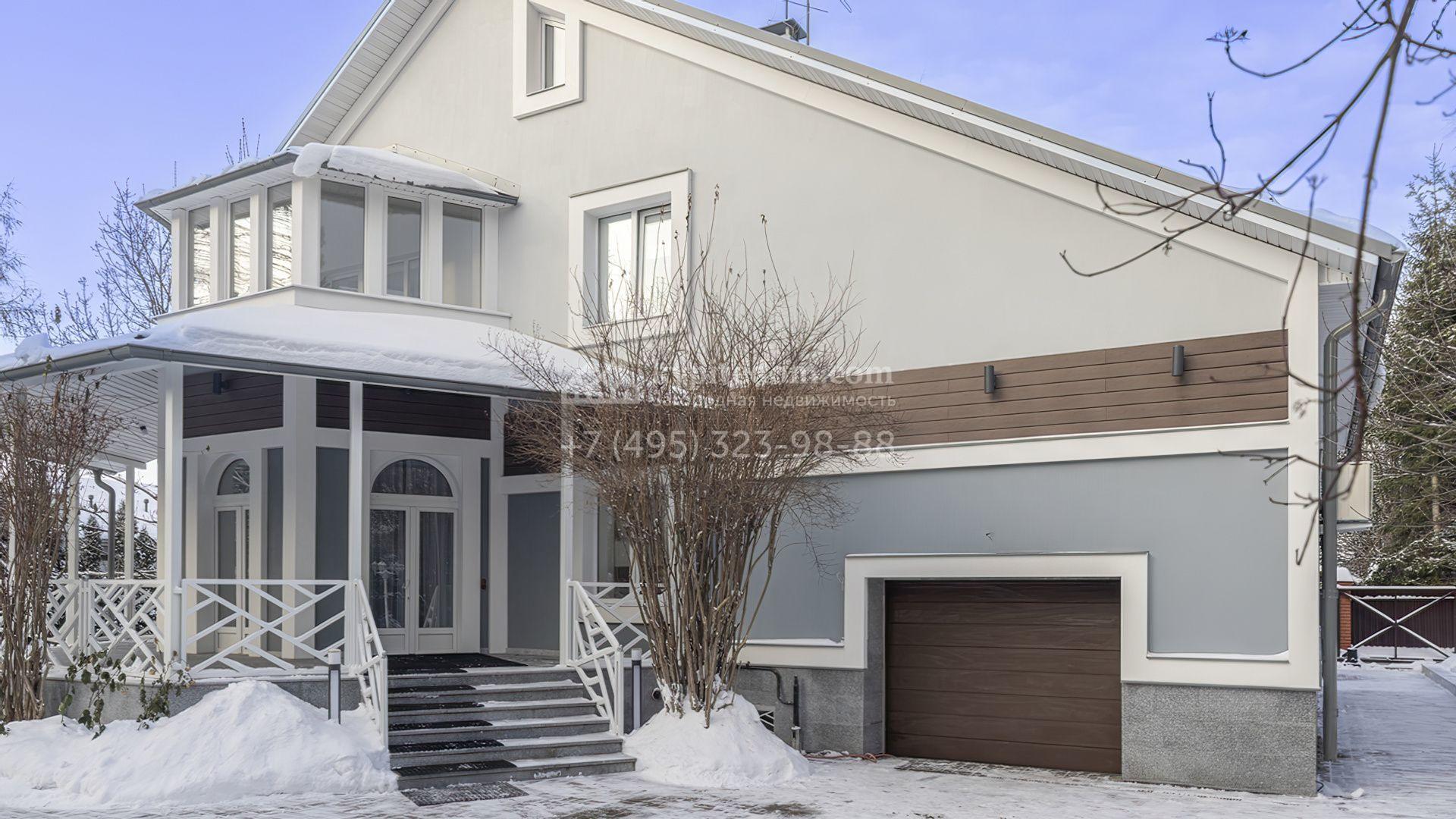 Коттедж площадью 450 м² расположен на полевом участке 15 соток. Архитектура здания отличается лаконичностью и отражает европейский стиль с элементами фахверка. Фасад выполнен в серо-белых тонах и декорирован деревянными элементами. У входа расположены ступени, ведущие в парадную зону с белыми колоннами и ограждениями с геометрическим рисунком. Завершает композицию многоскатная крыша с карнизами, которая вносит структурную динамику.