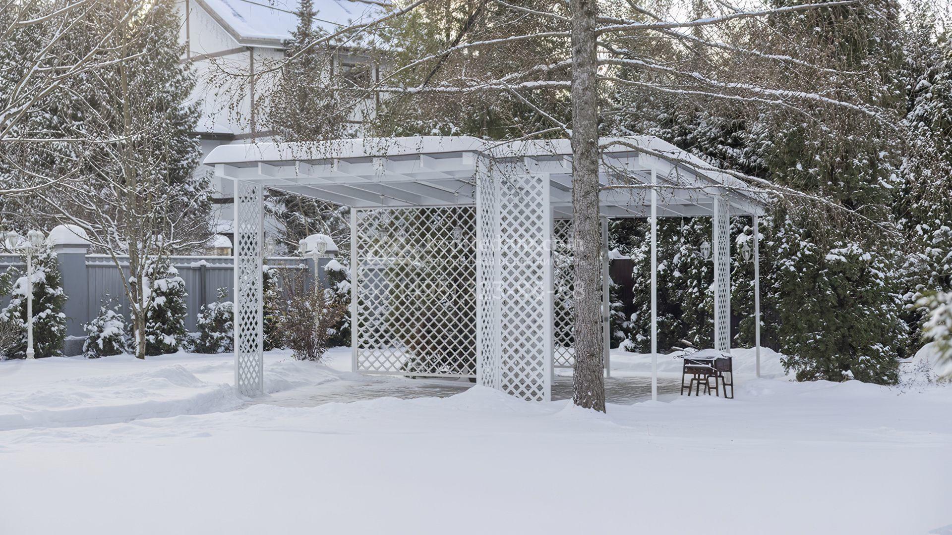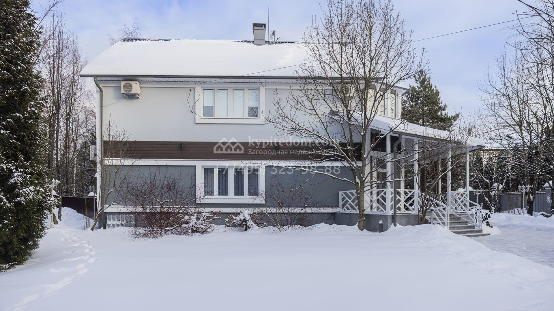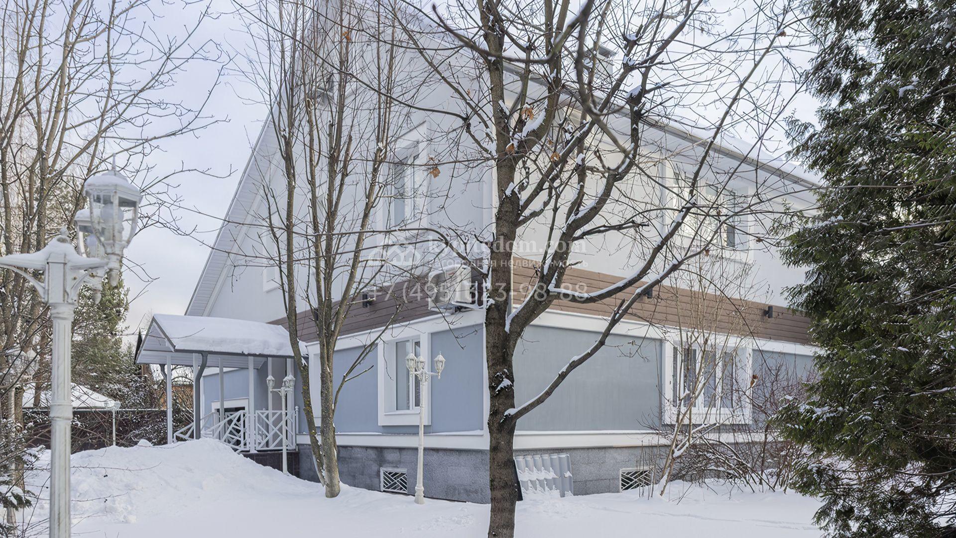 Коттедж площадью 450 м² расположен на полевом участке 15 соток. Архитектура здания отличается лаконичностью и отражает европейский стиль с элементами фахверка. Фасад выполнен в серо-белых тонах и декорирован деревянными элементами. У входа расположены ступени, ведущие в парадную зону с белыми колоннами и ограждениями с геометрическим рисунком. Завершает композицию многоскатная крыша с карнизами, которая вносит структурную динамику.
