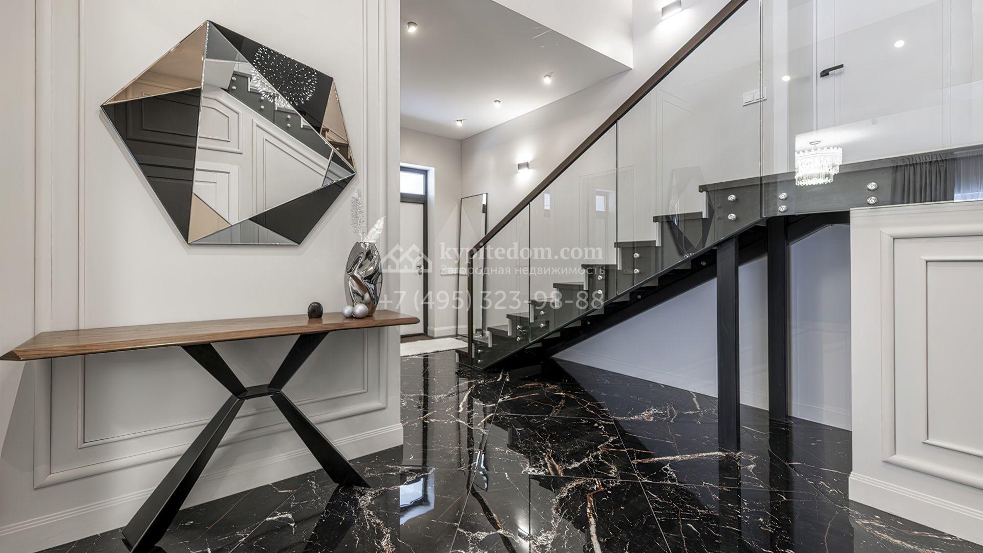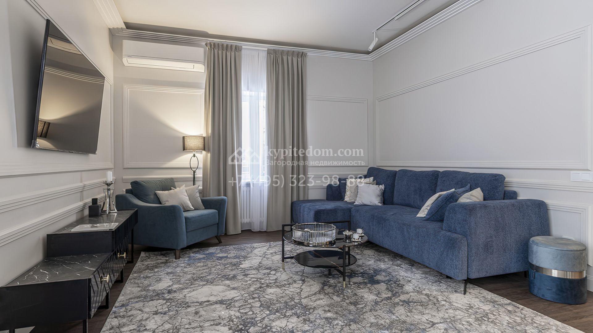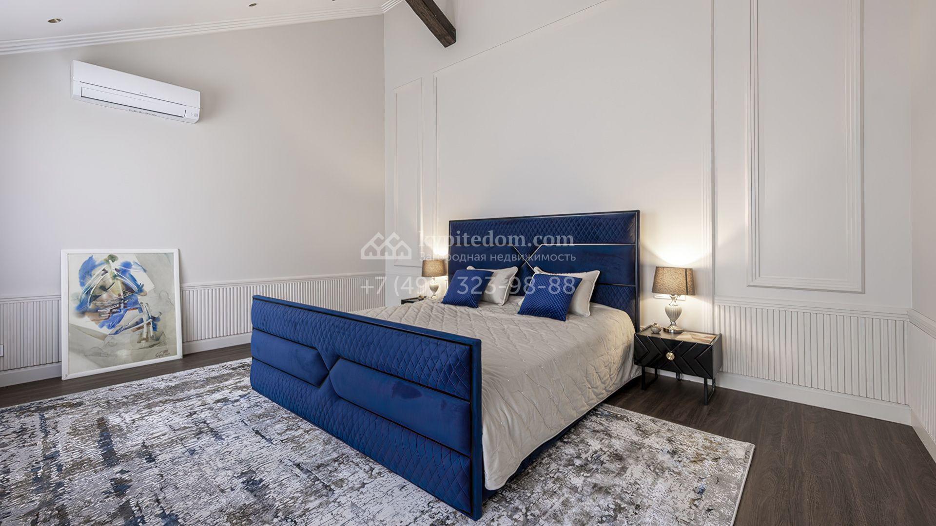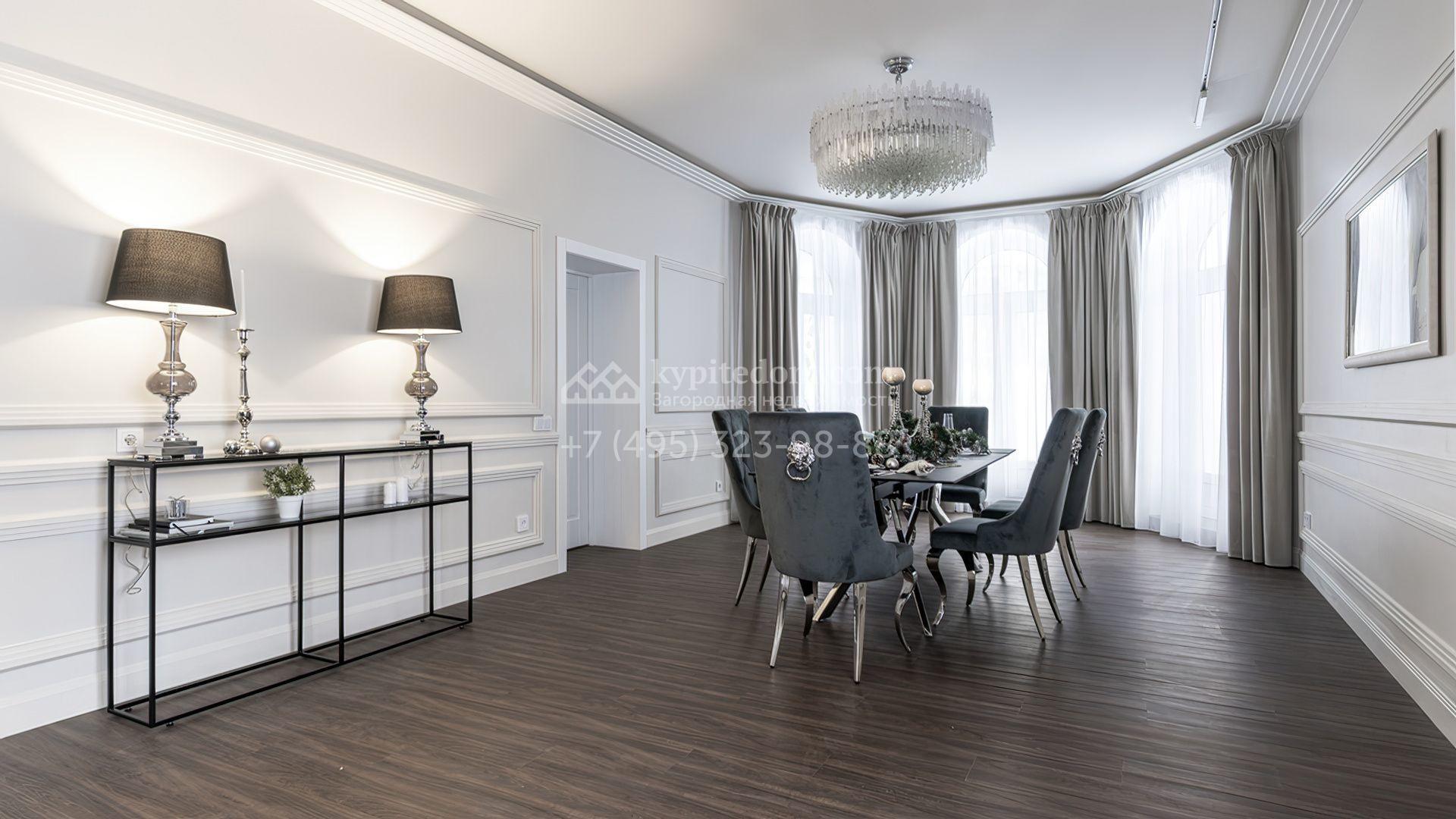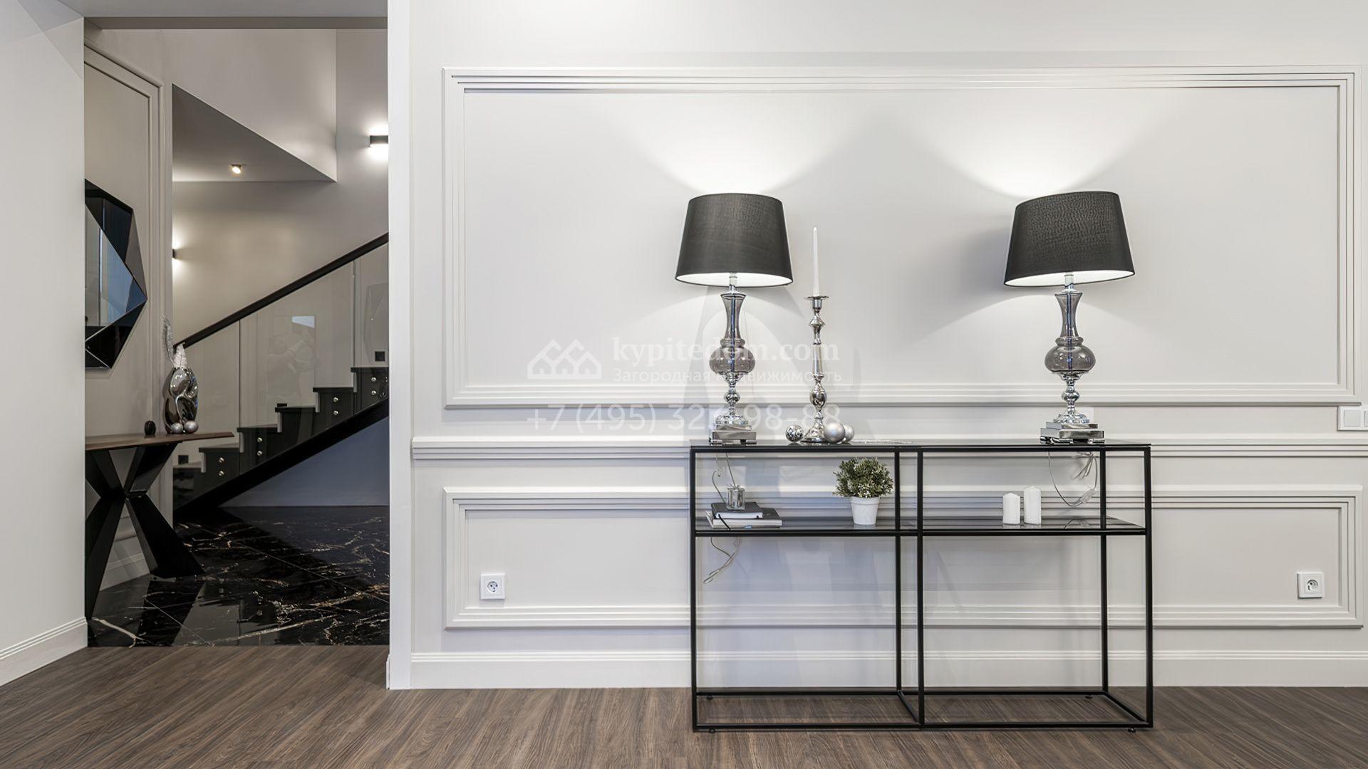 Внутри выполнен дизайнерский ремонт в светлых тонах с яркими темными акцентами. Интерьер сочетает классику и современность, выраженные в строгих линиях стеновых панелей и минималистичной мебели. Натуральные текстуры дерева и мрамора органично дополняются текстильными деталями, создавая уютную обстановку. Светильники с изысканным дизайном и зеркальные поверхности добавляют глубины и элегантности. Широкие окна с лёгкими шторами наполняют комнаты светом, визуально увеличивая пространство.