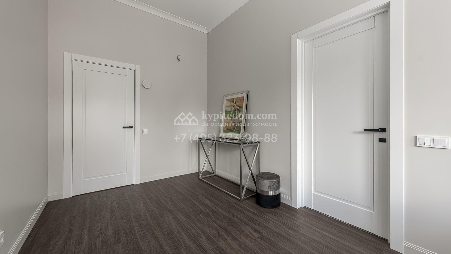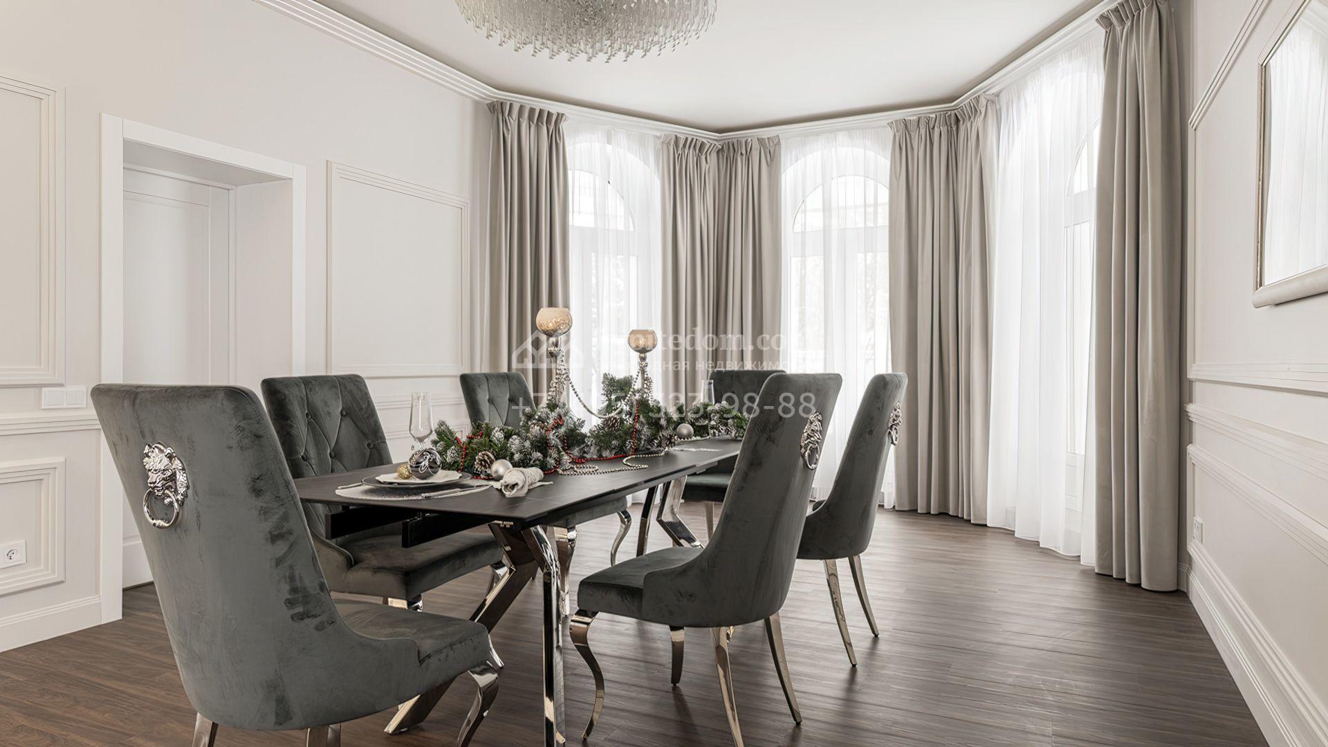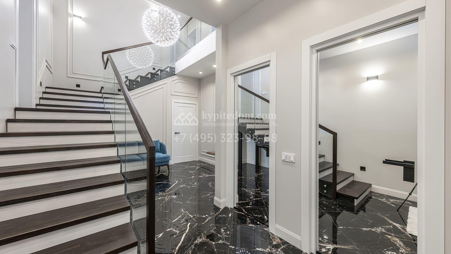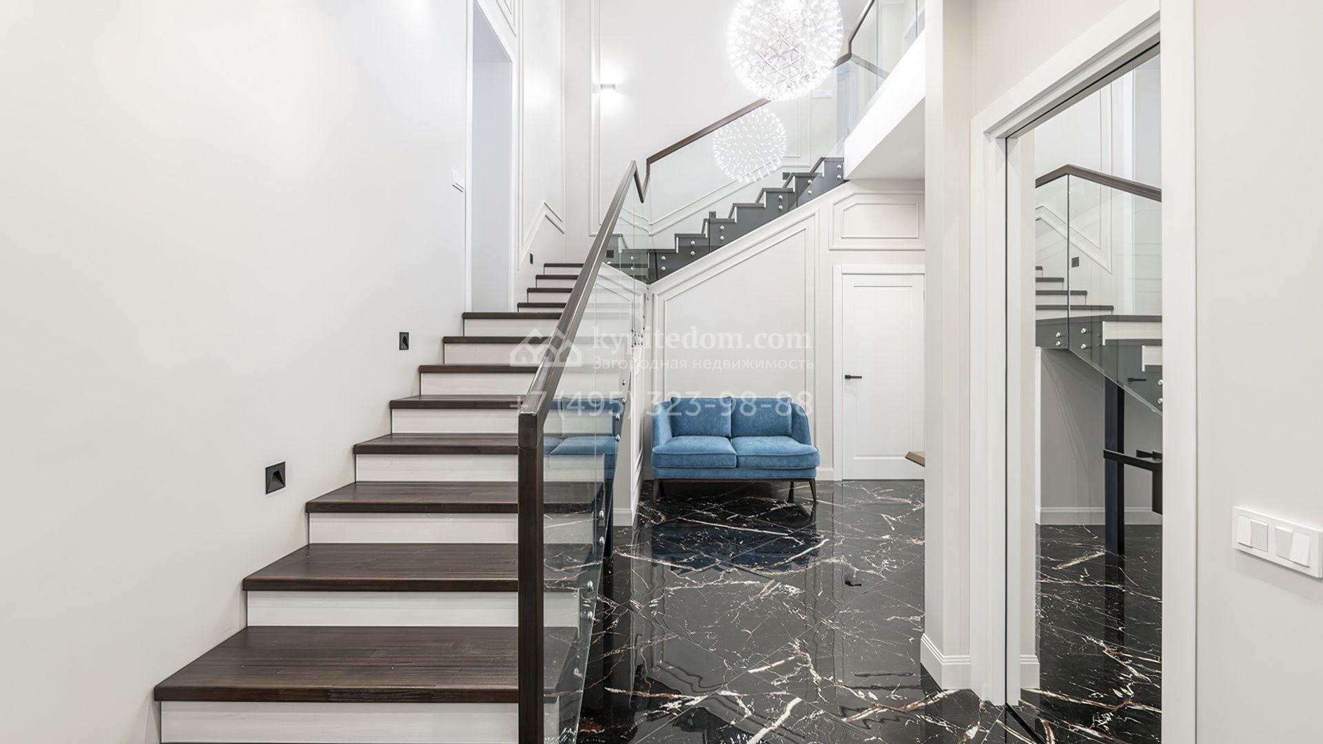 Внутри выполнен дизайнерский ремонт в светлых тонах с яркими темными акцентами. Интерьер сочетает классику и современность, выраженные в строгих линиях стеновых панелей и минималистичной мебели. Натуральные текстуры дерева и мрамора органично дополняются текстильными деталями, создавая уютную обстановку. Светильники с изысканным дизайном и зеркальные поверхности добавляют глубины и элегантности. Широкие окна с лёгкими шторами наполняют комнаты светом, визуально увеличивая пространство.