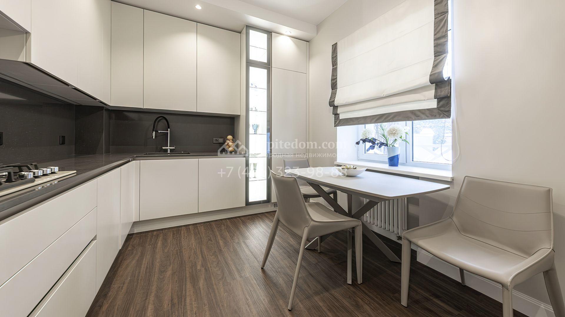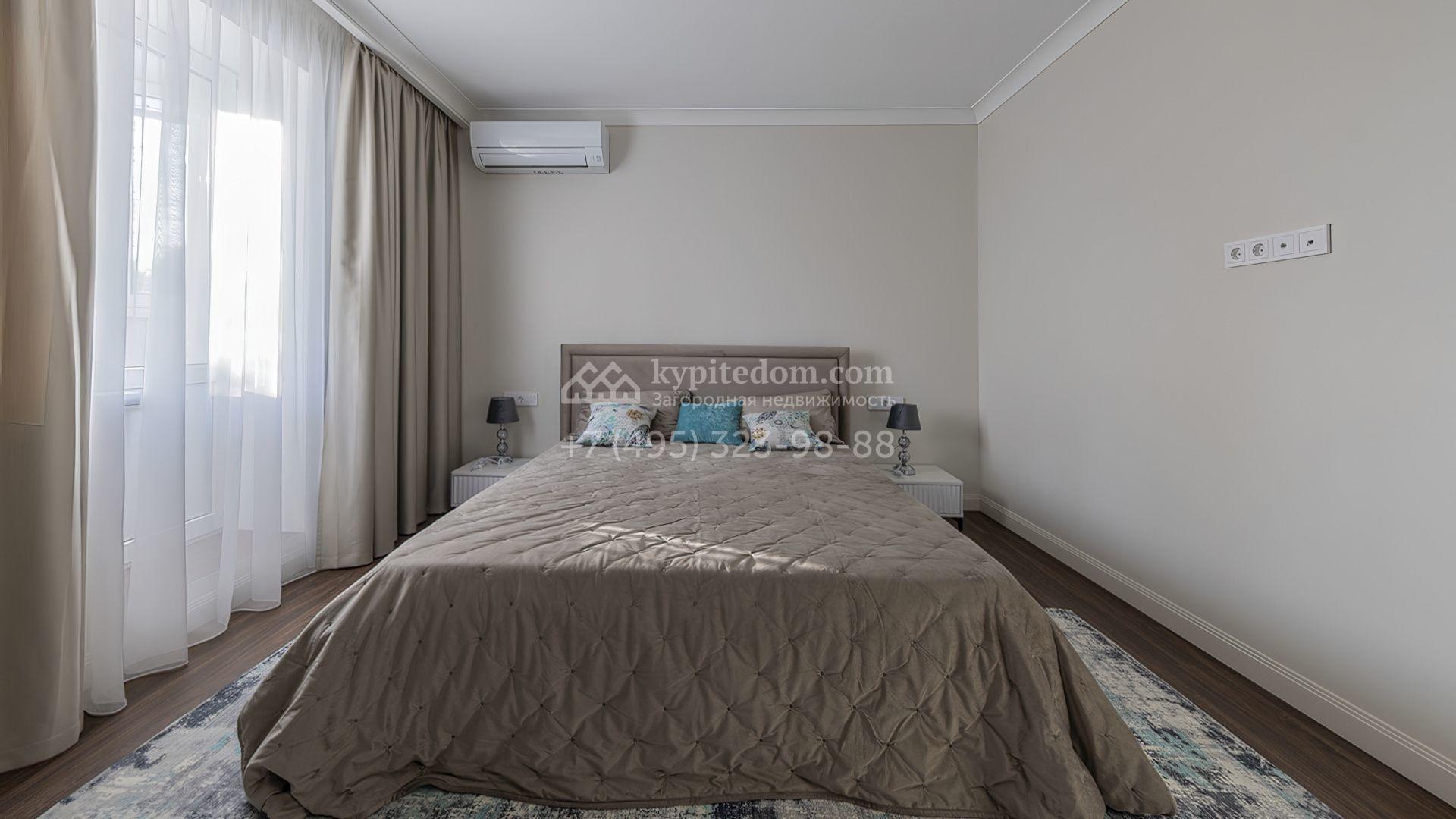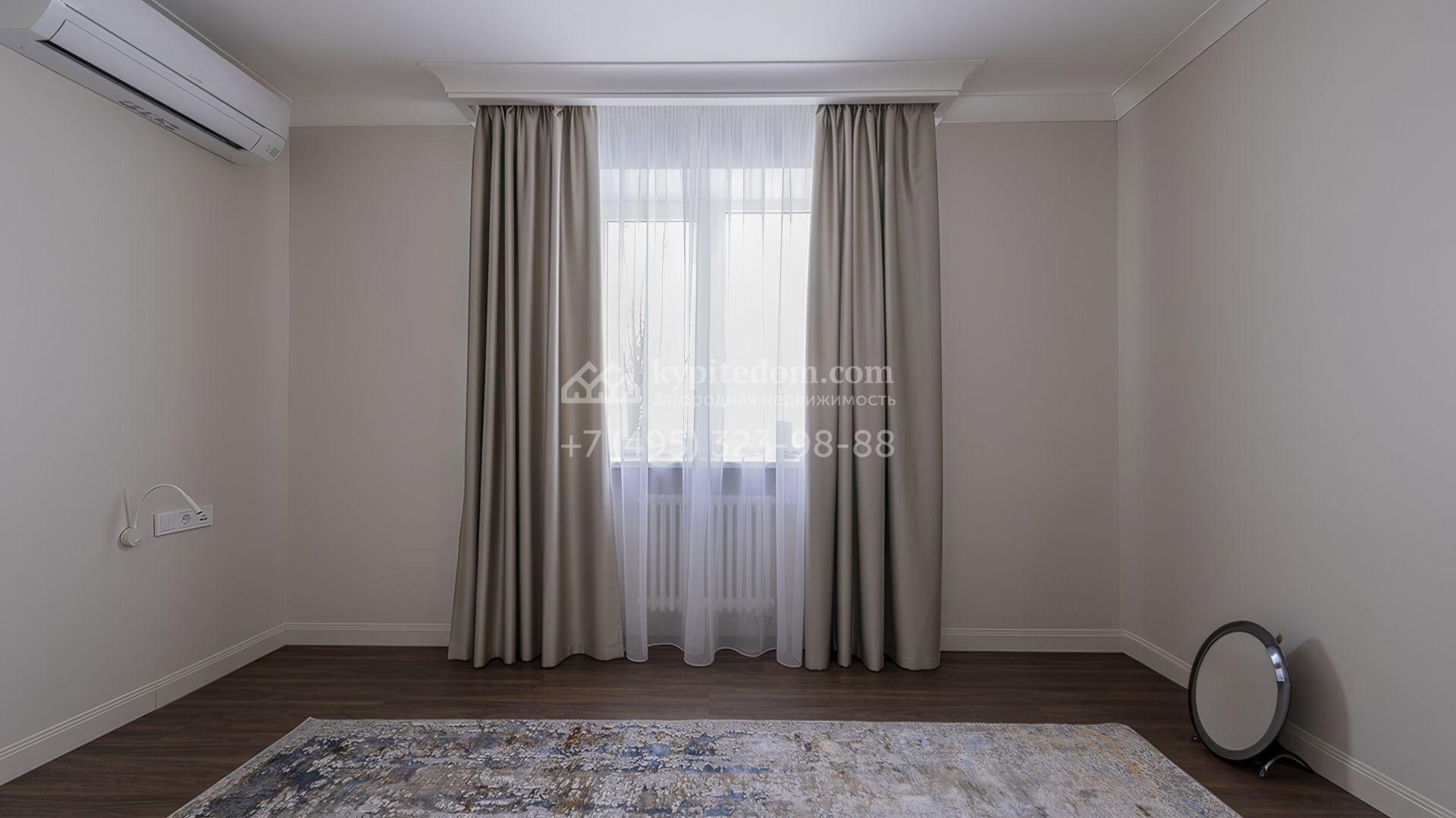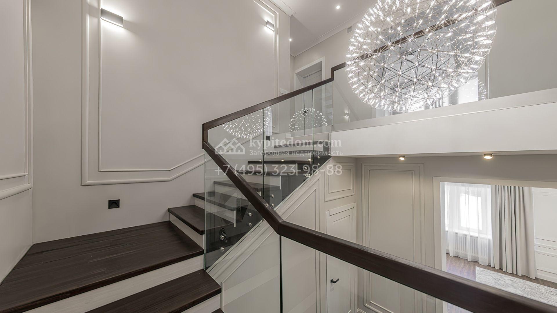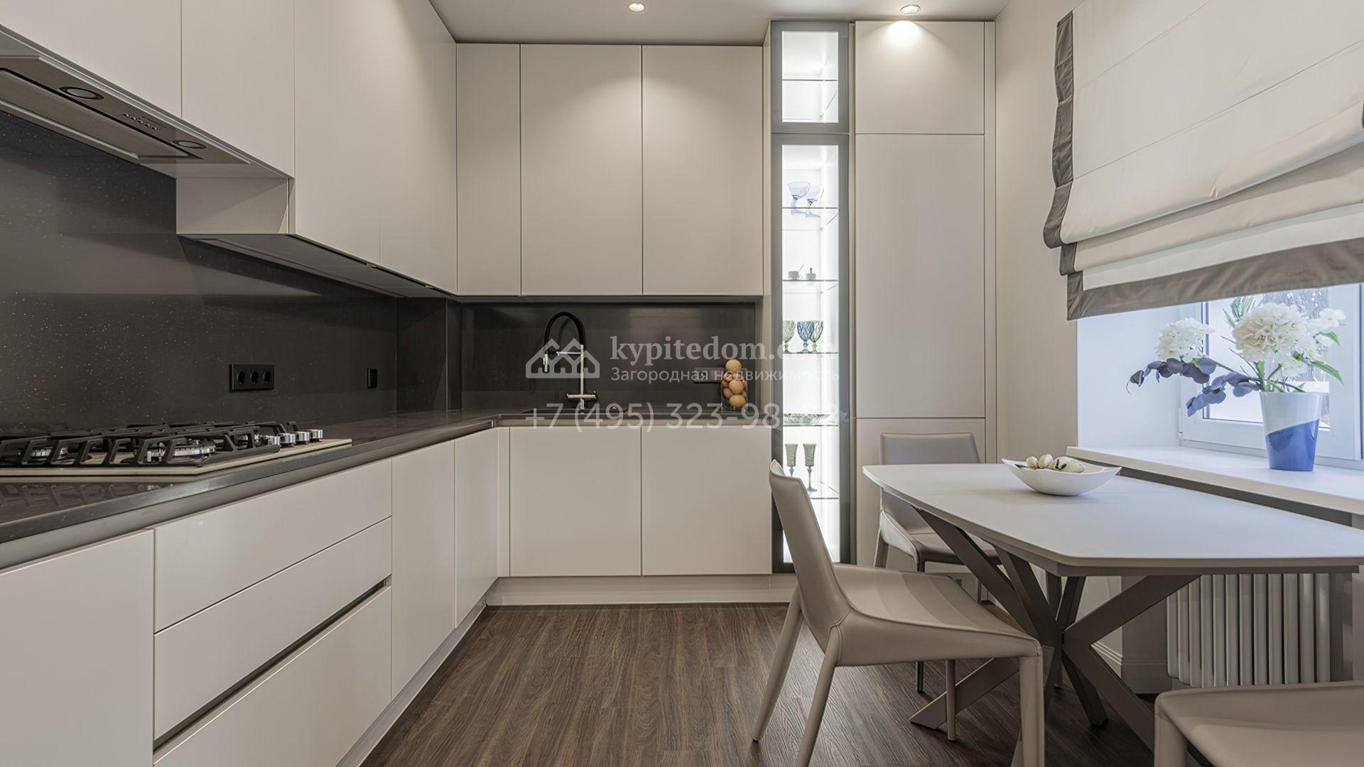 Внутри выполнен дизайнерский ремонт в светлых тонах с яркими темными акцентами. Интерьер сочетает классику и современность, выраженные в строгих линиях стеновых панелей и минималистичной мебели. Натуральные текстуры дерева и мрамора органично дополняются текстильными деталями, создавая уютную обстановку. Светильники с изысканным дизайном и зеркальные поверхности добавляют глубины и элегантности. Широкие окна с лёгкими шторами наполняют комнаты светом, визуально увеличивая пространство.