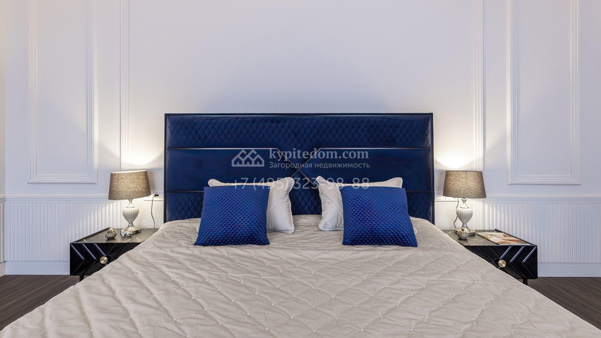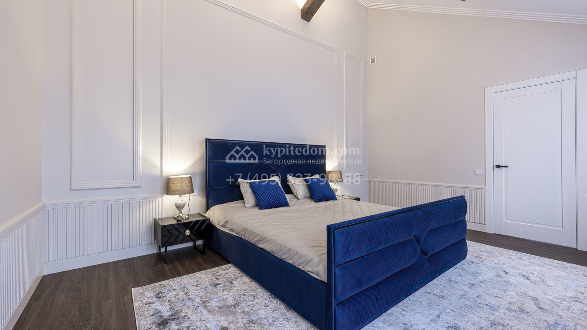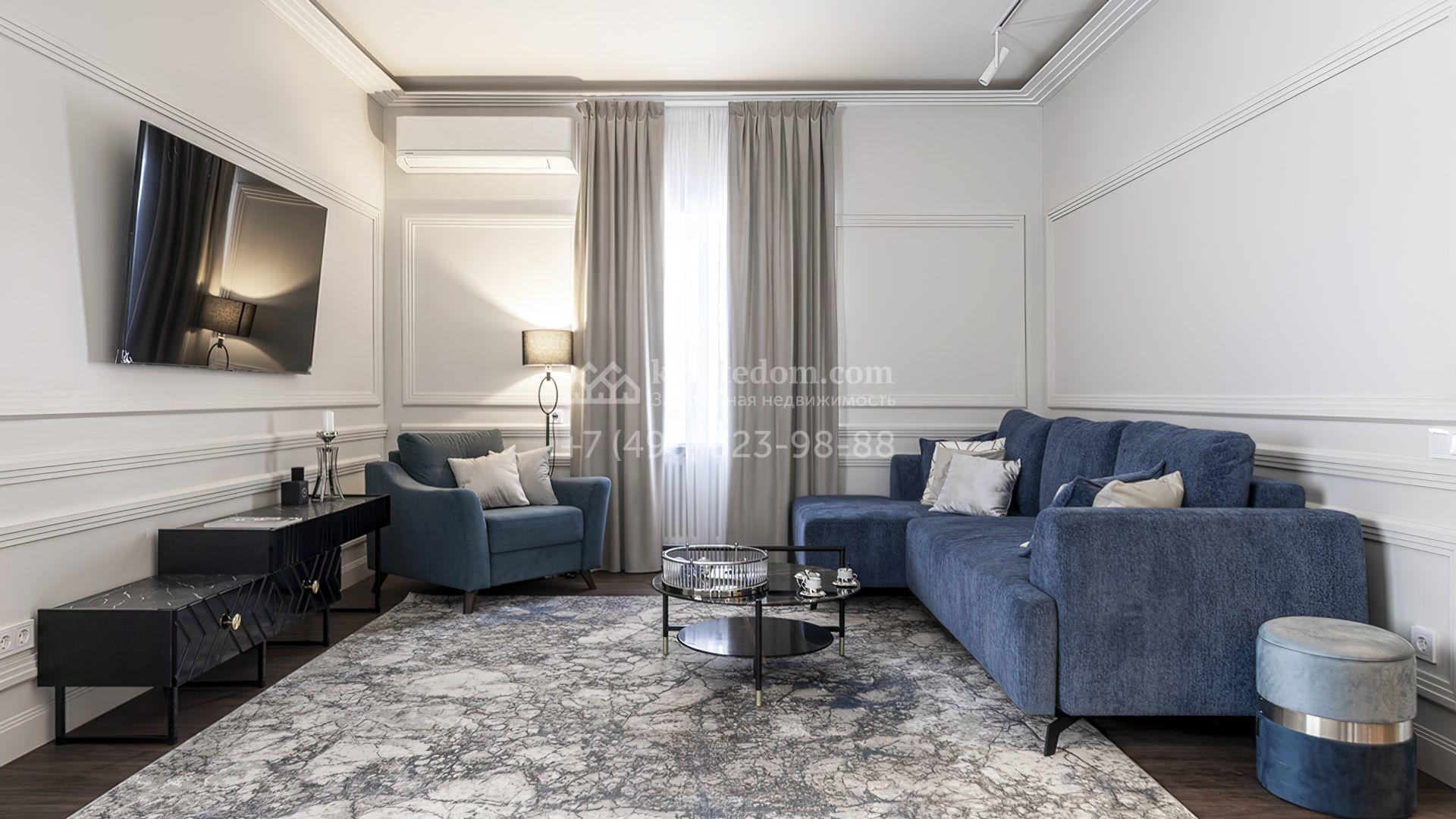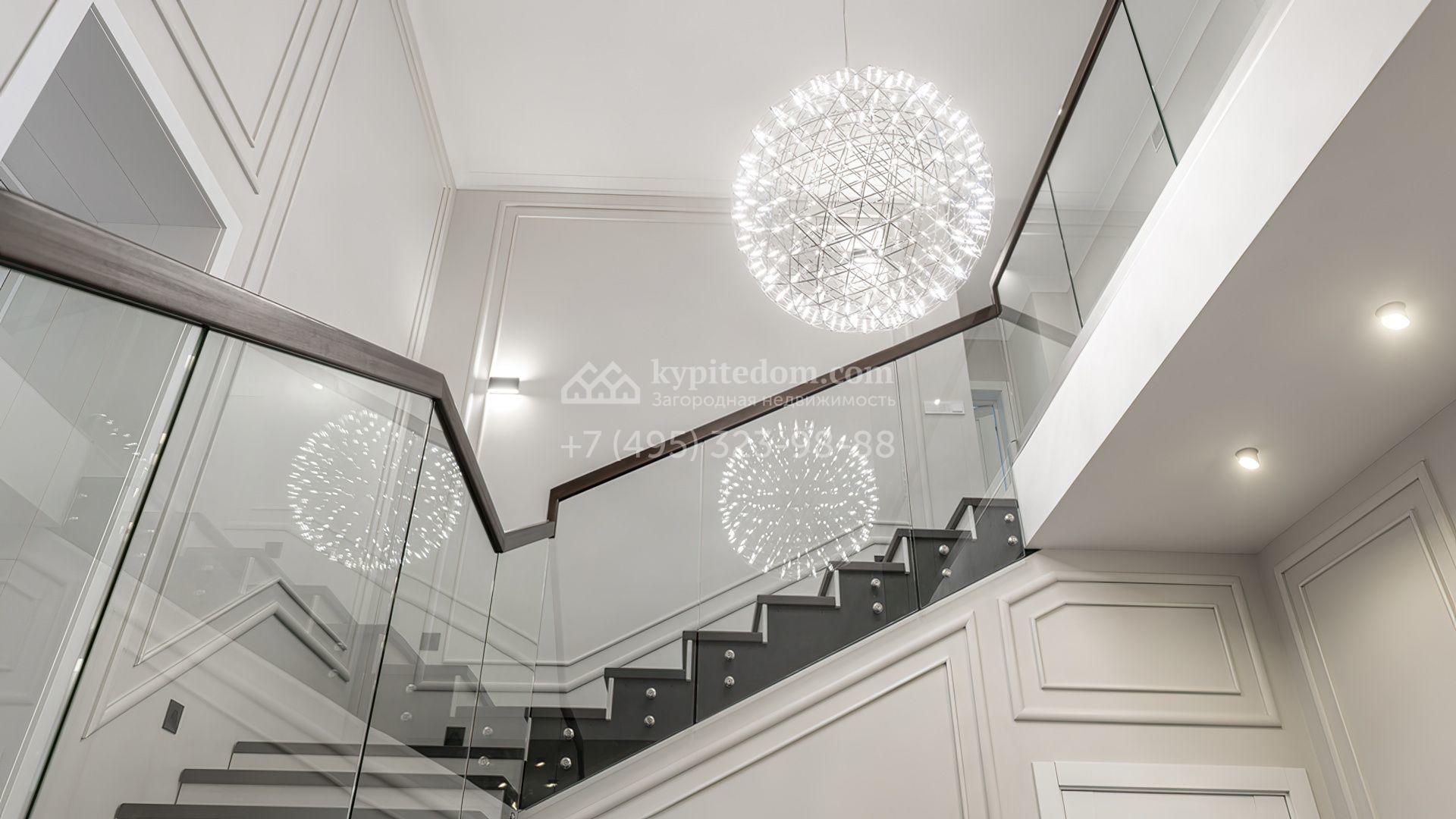 Внутри выполнен дизайнерский ремонт в светлых тонах с яркими темными акцентами. Интерьер сочетает классику и современность, выраженные в строгих линиях стеновых панелей и минималистичной мебели. Натуральные текстуры дерева и мрамора органично дополняются текстильными деталями, создавая уютную обстановку. Светильники с изысканным дизайном и зеркальные поверхности добавляют глубины и элегантности. Широкие окна с лёгкими шторами наполняют комнаты светом, визуально увеличивая пространство.