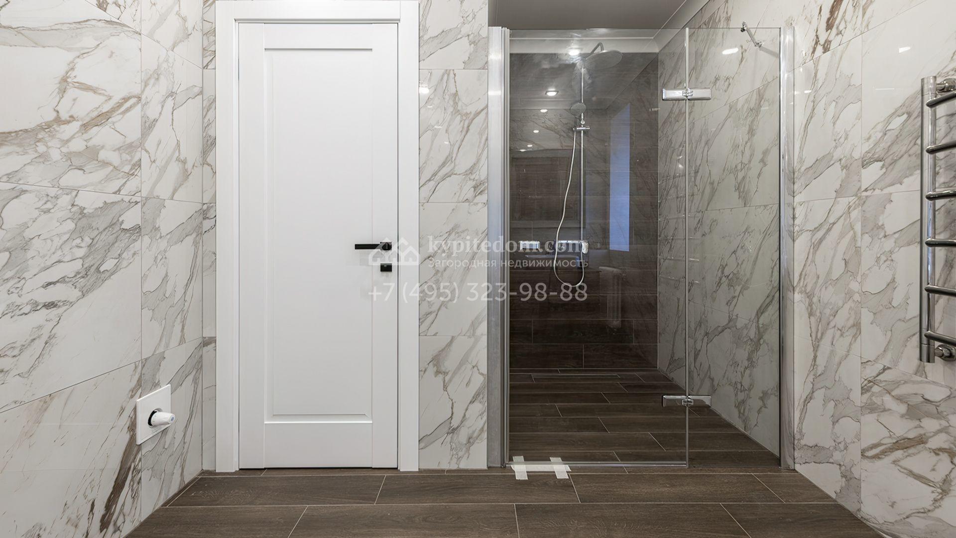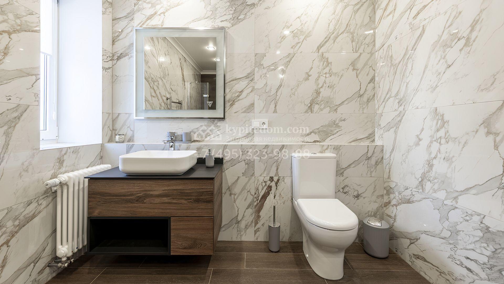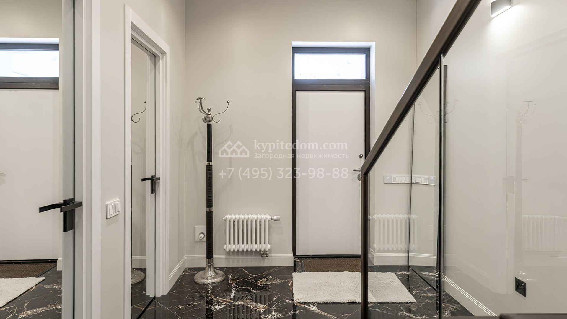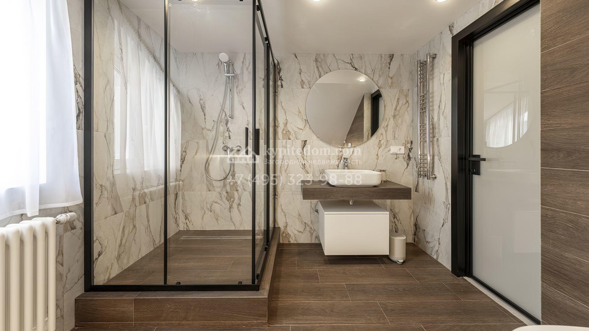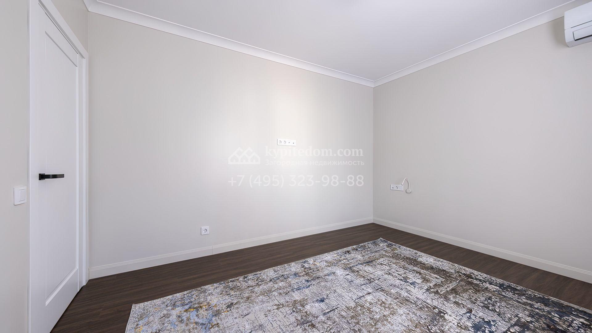 Внутри выполнен дизайнерский ремонт в светлых тонах с яркими темными акцентами. Интерьер сочетает классику и современность, выраженные в строгих линиях стеновых панелей и минималистичной мебели. Натуральные текстуры дерева и мрамора органично дополняются текстильными деталями, создавая уютную обстановку. Светильники с изысканным дизайном и зеркальные поверхности добавляют глубины и элегантности. Широкие окна с лёгкими шторами наполняют комнаты светом, визуально увеличивая пространство.